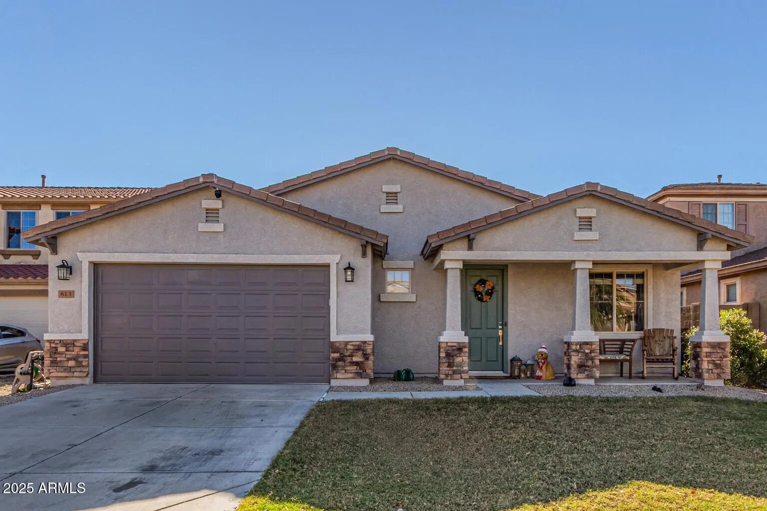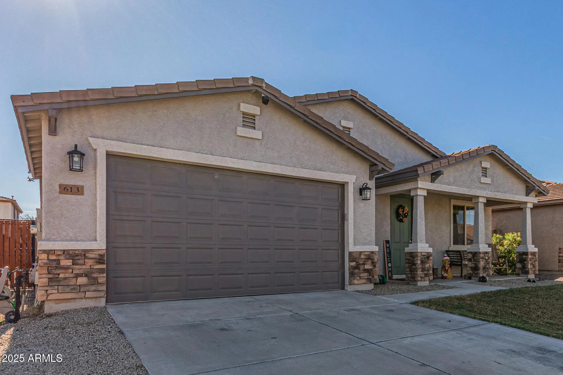 Beautiful home with POOL in Johnson Ranch w/ an ASSUMABLE Loan 3-car tandem garage, stone accent details, front porch, & a grassy area. The fabulous interior showcases tons of natural light, tall ceilings, and tile & wood-look flooring in all the right places. You'll love the desirable great room with surround sound! The kitchen features built-in appliances, granite counters, ample wood cabinets, recessed lighting, and an island w/breakfast bar. Double-door den for an office or extra bedroom! Main bedroom has a spa-like ensuite that boasts dual sinks, a walk-in closet, and a tiled shower w/dual rainfall showerheads & multiple body-spray jets. Secondary bedrooms with carpet. Enjoy the backyard oasis with a covered patio, built-in BBQ grill & seating bar, and well-laid pavers throughout! WO Assumable loan is 3.375. Located in Johnson Ranch with community pools heated spas playgrounds and a great golf course. This home looks like a model. Great for Entertaining and FUN! Totally TURN KEY!