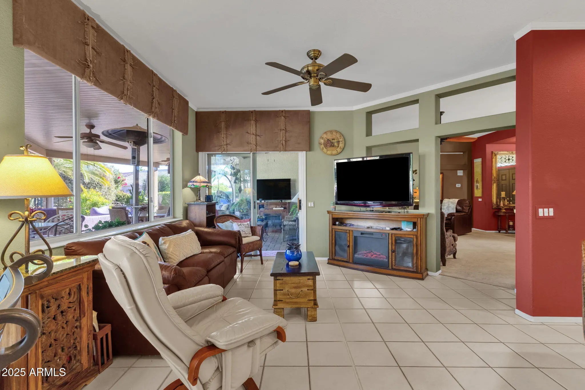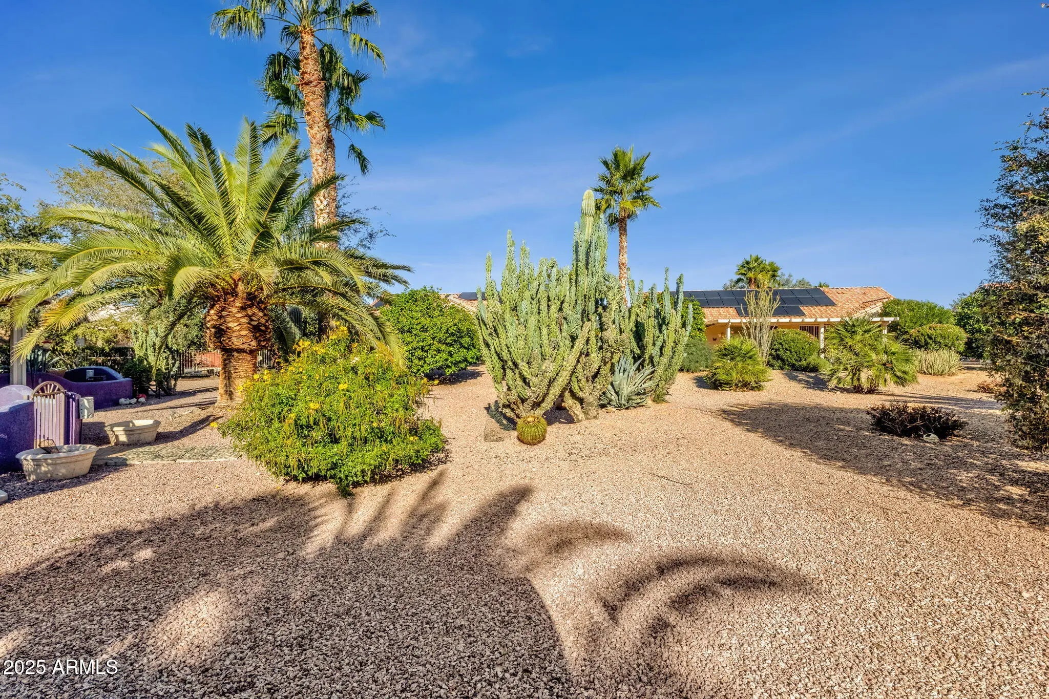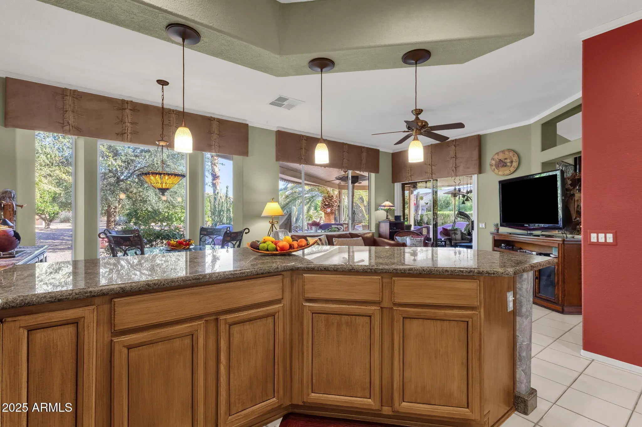 Located in the heart of Sun City West, this beautifully maintained 1,717 sq ft home sits on an expansive 0.23-acre lot and welcomes you with desert landscaping, towering palms, and a gated front courtyard leading into bright, open living spaces with high ceilings and plantation shutters. The kitchen is a cook's delight, featuring warm wood cabinetry, wraparound granite counters, a breakfast bar, and a sunny nook overlooking the backyard, all open to a comfortable family room with patio access. A versatile mudroom/pantry off the kitchen adds extra storage or a workspace, but the true standout is the rare third-car garage, currently transformed into an artist studio with cabinetry, workbench, and specialty lighting—perfect for painters, crafters, or woodworkers, or easily converted back into a golf-cart garage. The primary suite feels like a retreat, offering a bay window with plantation shutters, a generous en-suite bath with dual vanities, a walk-in shower & a large closet. A secondary bedroom is roomy with high ceilings and neutral carpet and there's an additional guest bath with granite counters and bathtub/shower combo. The backyard is an entertainer's paradise, with a gated and covered patio featuring ceiling fans and built-in seating creating an ideal space for entertaining, surrounded by low-maintenance desert landscaping. With energy saving solar panels, mature citrus plantings, and close proximity to the Golf Course and Sun City West's renowned recreation amenities, this home offers the perfect blend of creativity, comfort, and active-adult living (55+).