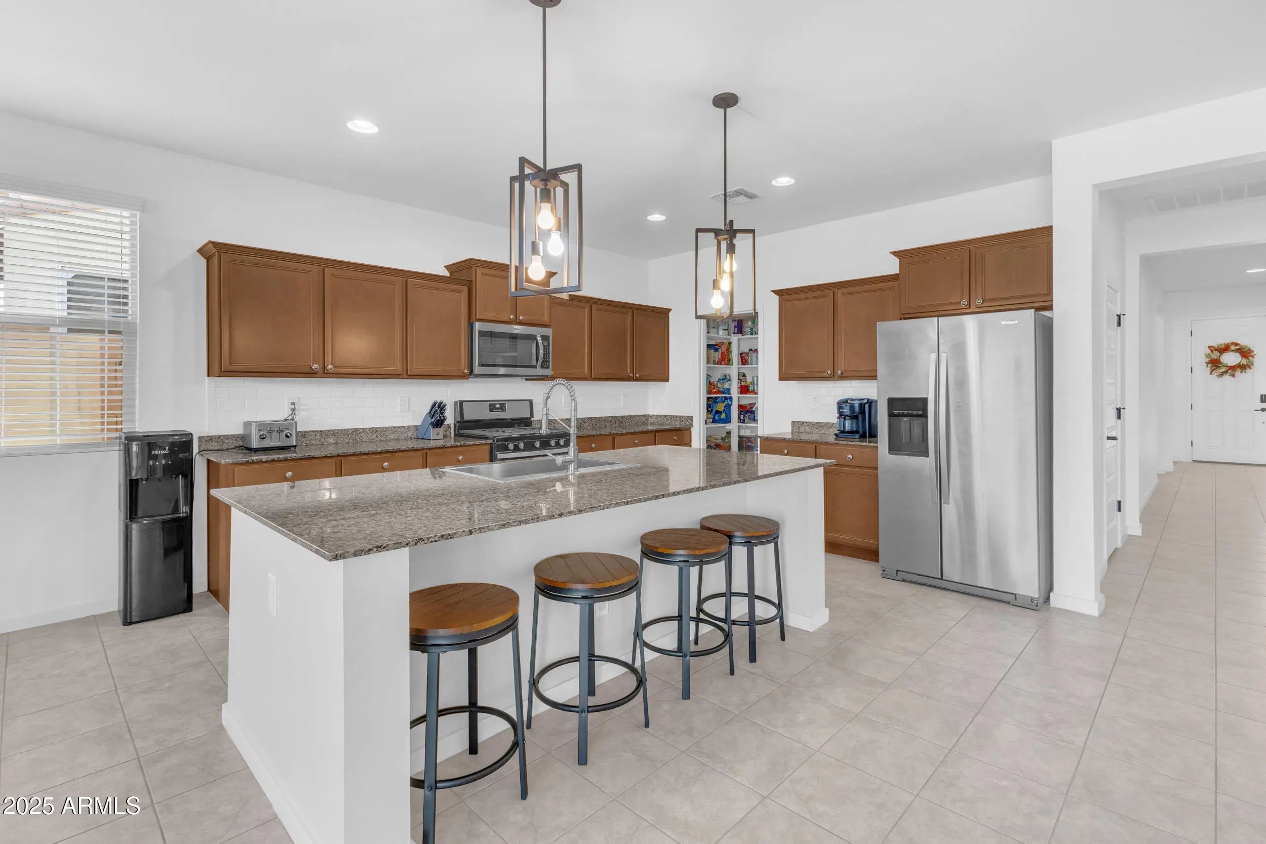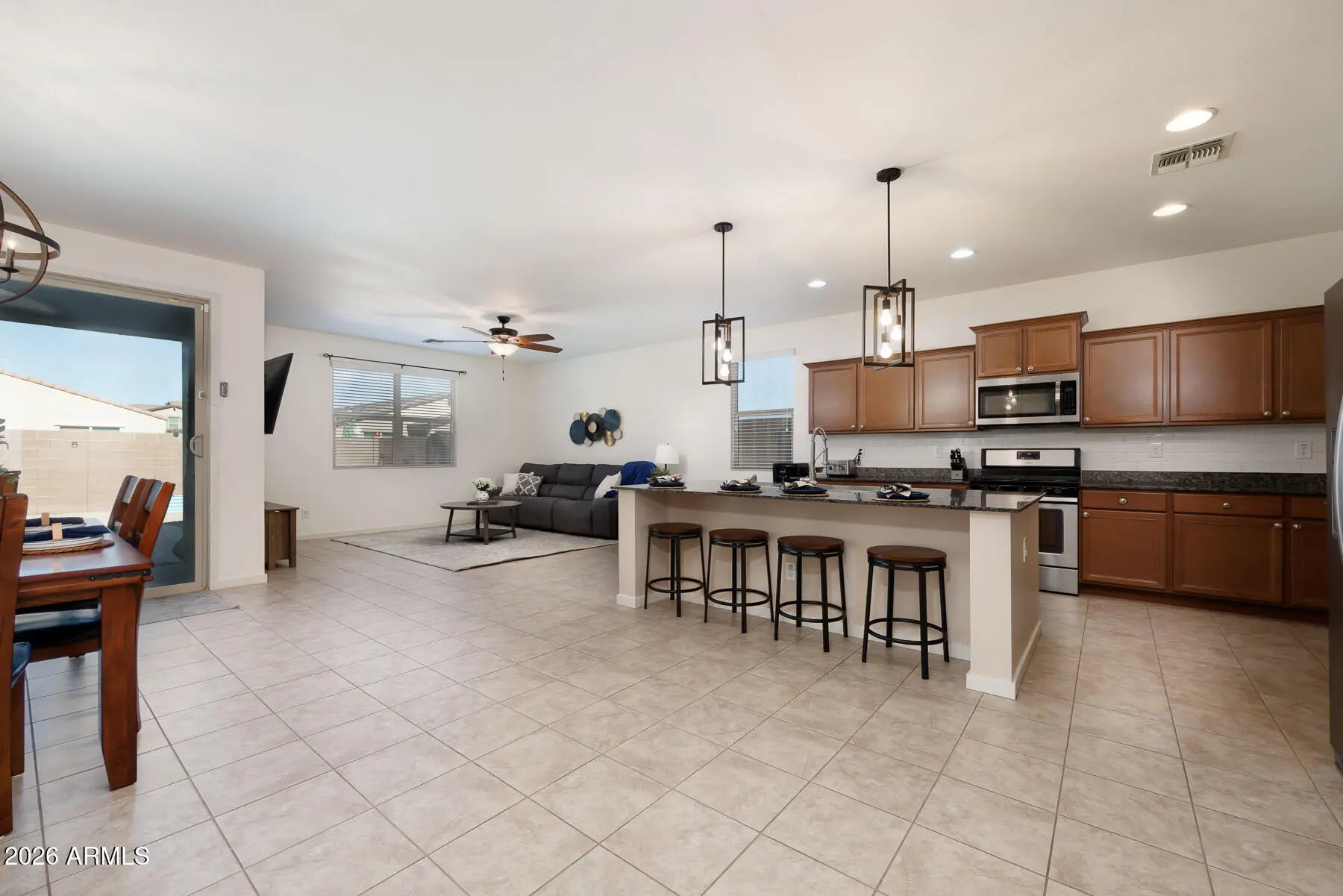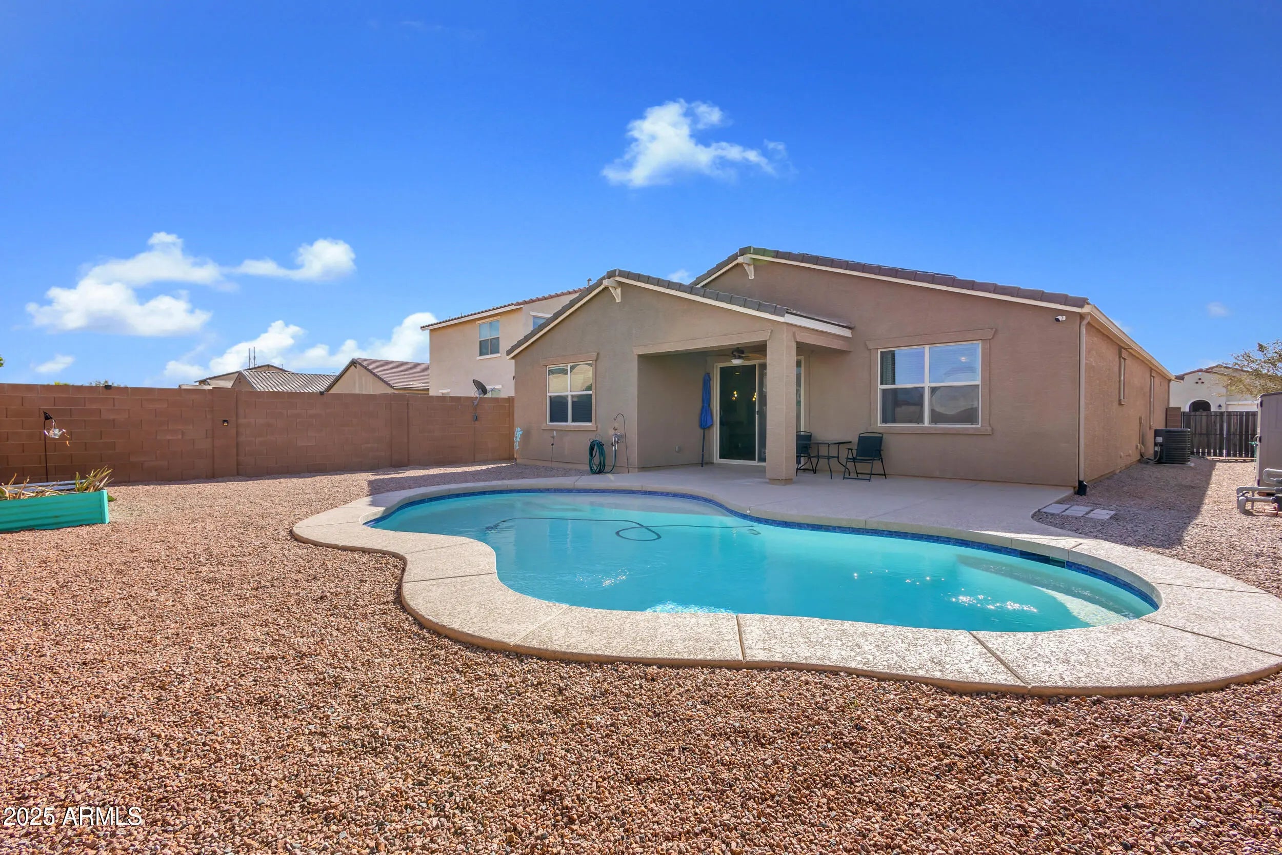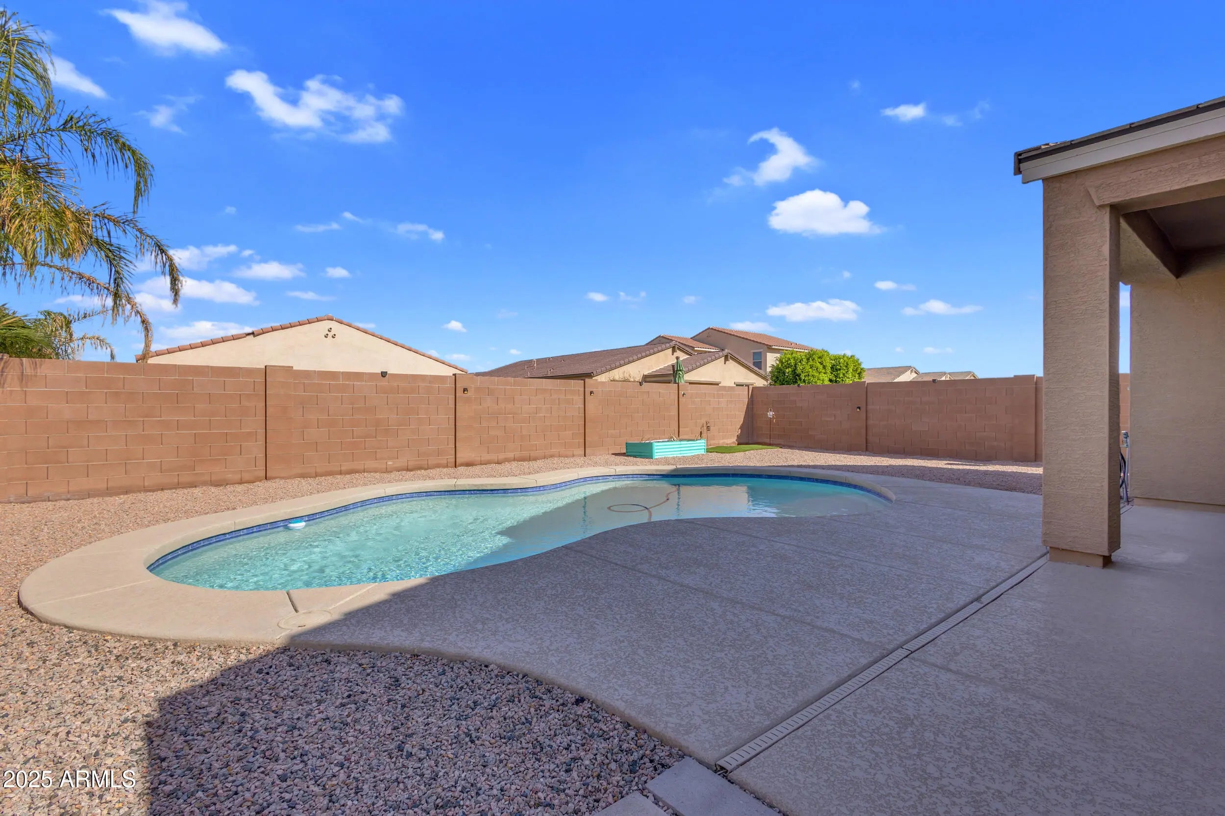 If a home with a PRIVATE POOL is at the top of your list, this one is a must see. This SINGLE STORY home offers 4 bedrooms, 3 bathrooms, and over 2,200 square feet of living space, built in 2018 with a modern and functional design. As you step inside, you'll appreciate the 9+ FOOT CEILINGS, oversized tile in all the right areas, and an OPEN CONCEPT FLOOR PLAN that's perfect for entertaining. The kitchen features GRANITE COUNTERTOPS, stainless steel appliances, a tile backsplash, and an OVERSIZED ISLAND that anchors the space beautifully. The home sits on a desirable lot with a SPARKLING POOL and COVERED PATIO, creating the ideal backyard for relaxing or hosting guests. Located in the highly sought after City of Maricopa, one of the FASTEST GROWING communities in the Greater Phoenix. area, you'll enjoy easy access to great restaurants, shopping, and healthcare, all just 35 minutes from downtown Phoenix.