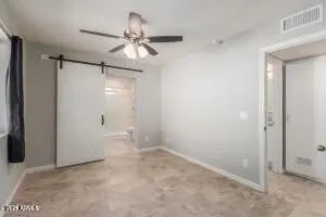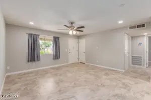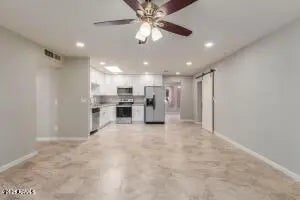 Introducing a tastefully remodeled single-level home that seamlessly blends modern design and comforts! The fresh interior palette creates an inviting atmosphere, enhanced by the recessed lighting, upscale ceiling fans and an open floor plan perfect for entertaining. The renewed open kitchen boasts a skylight, crisp white cabinets, built-in appliances, and elegant granite counters. The family room is just off the kitchen, offering a cozy place to gather. The main bedroom comes with a walk-in closet and a functional barn door ensuite. Designer tile flooring running t/out the home for ez maintenance. French doors lead to a relaxing covered patio. Located in the beautiful community of Sun City, offering tons of recreational amenities. This house has it all. Welcome Home!