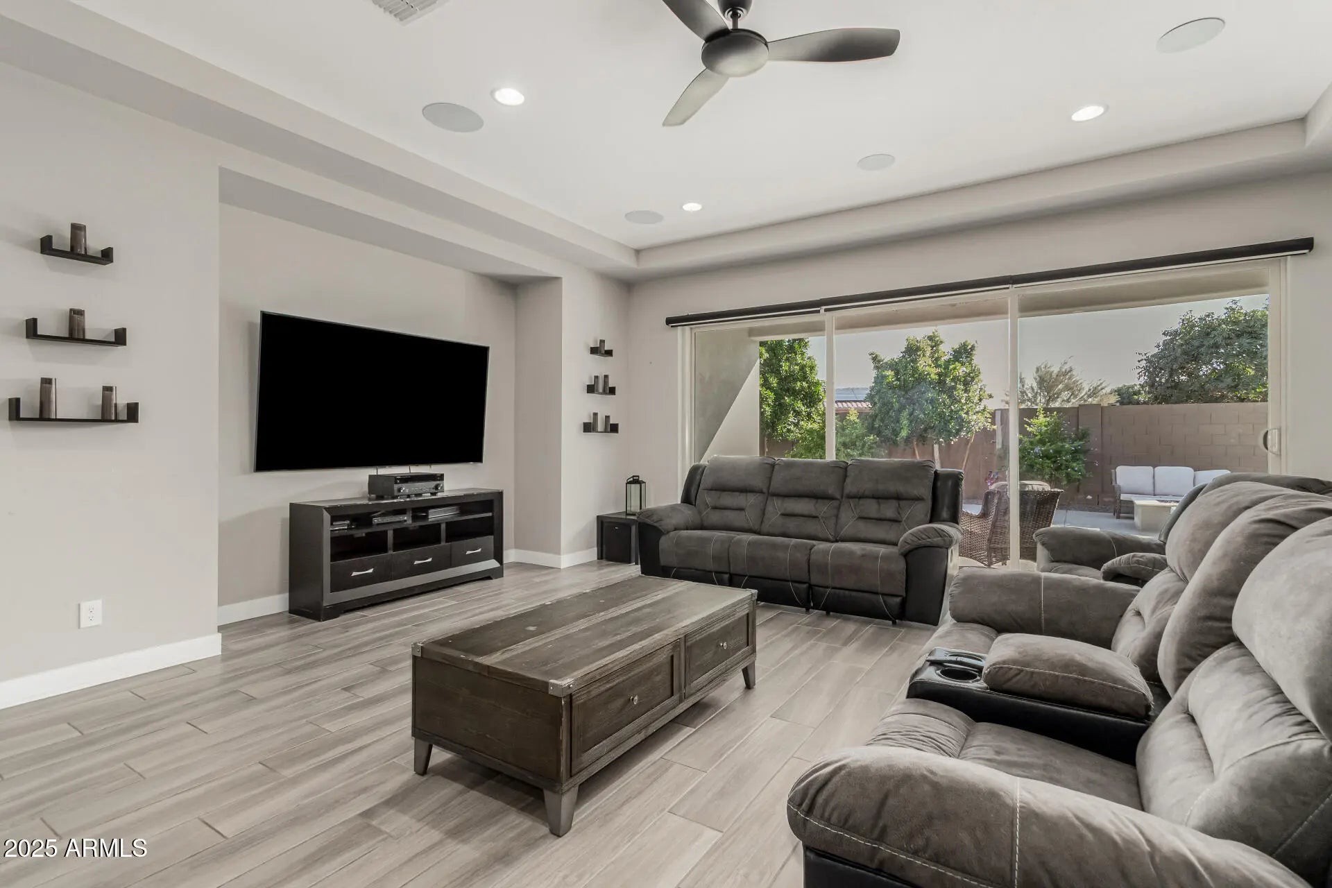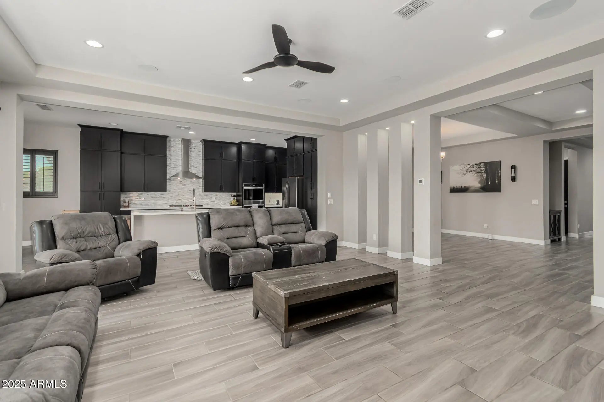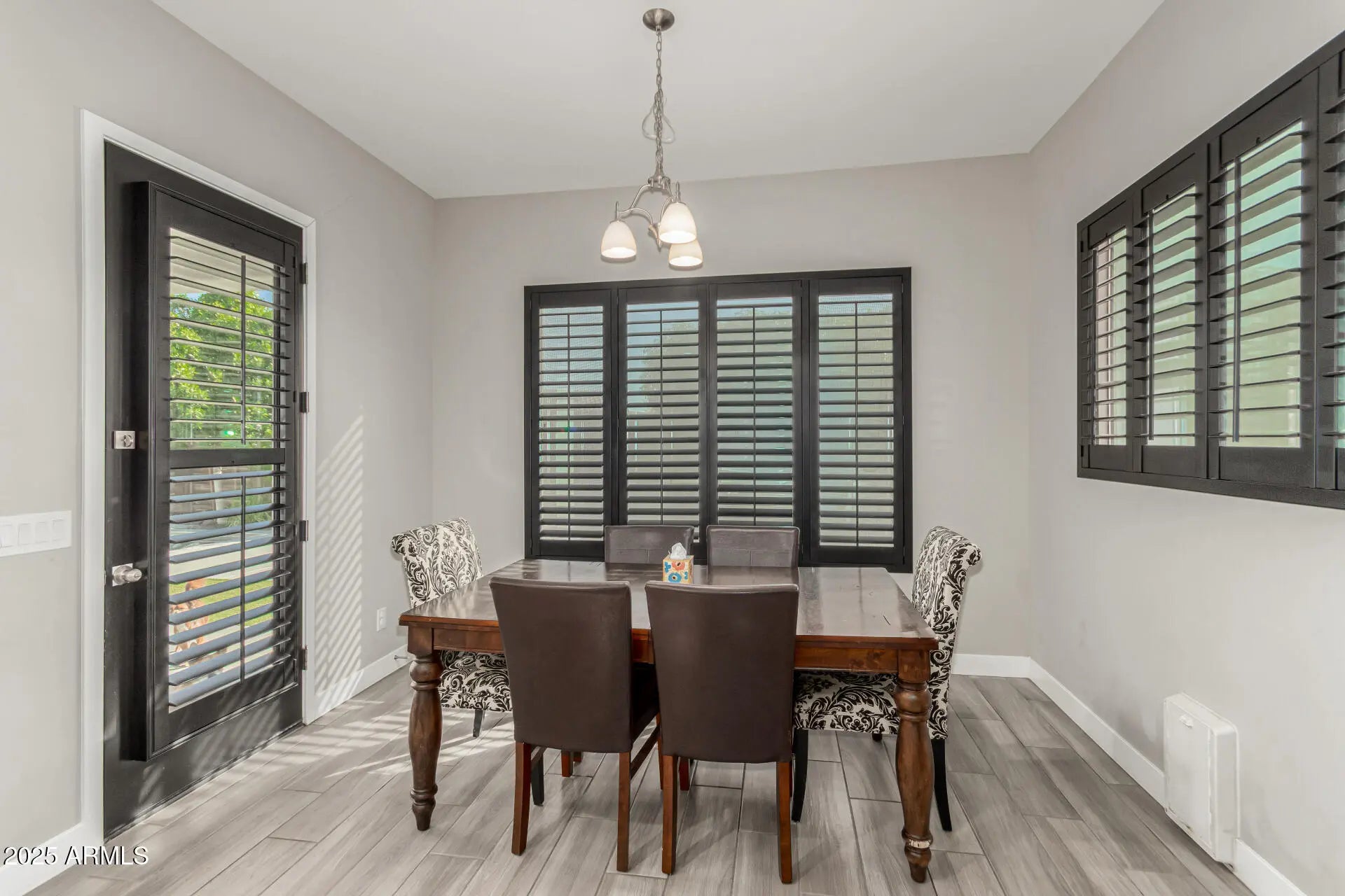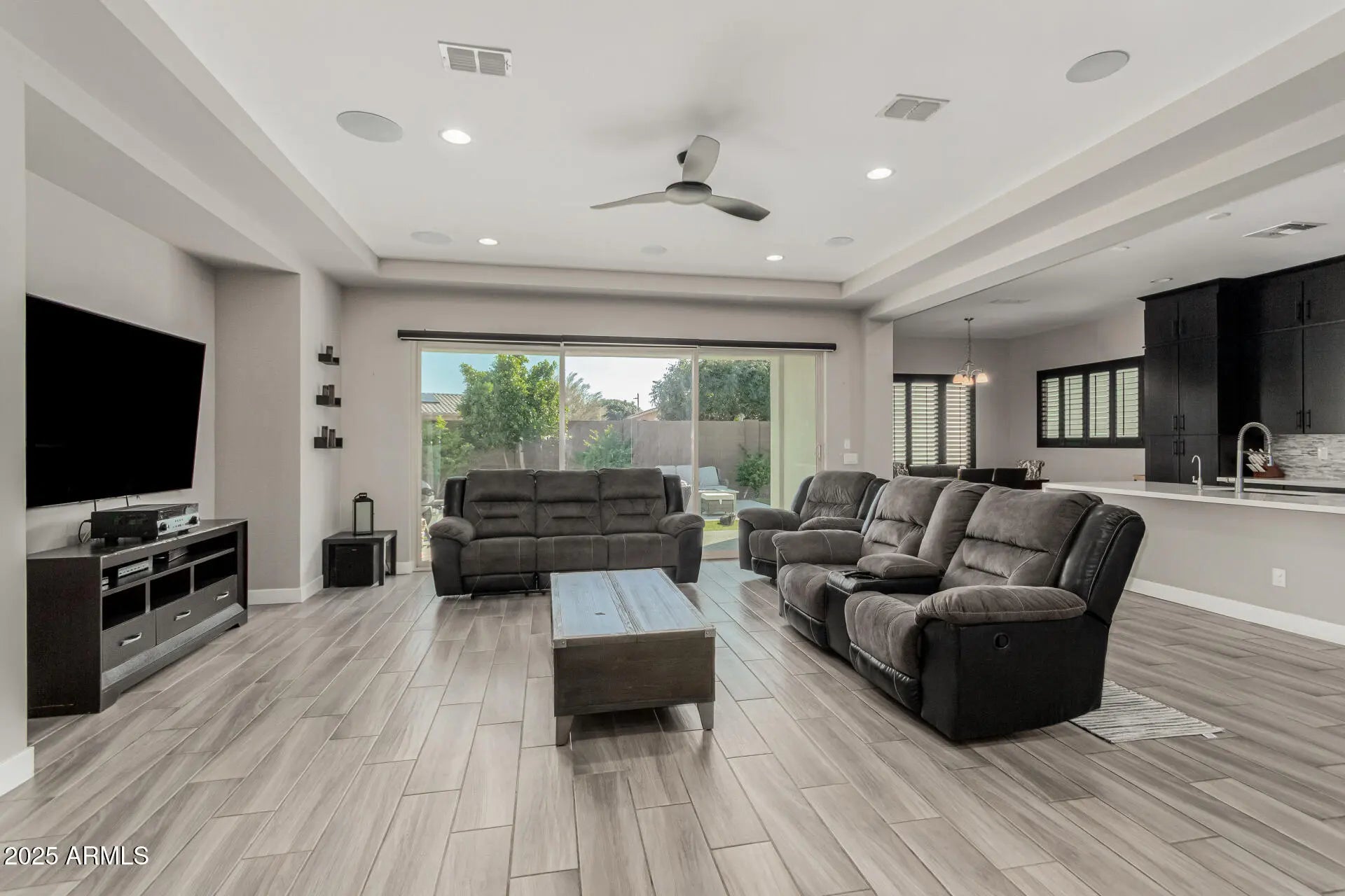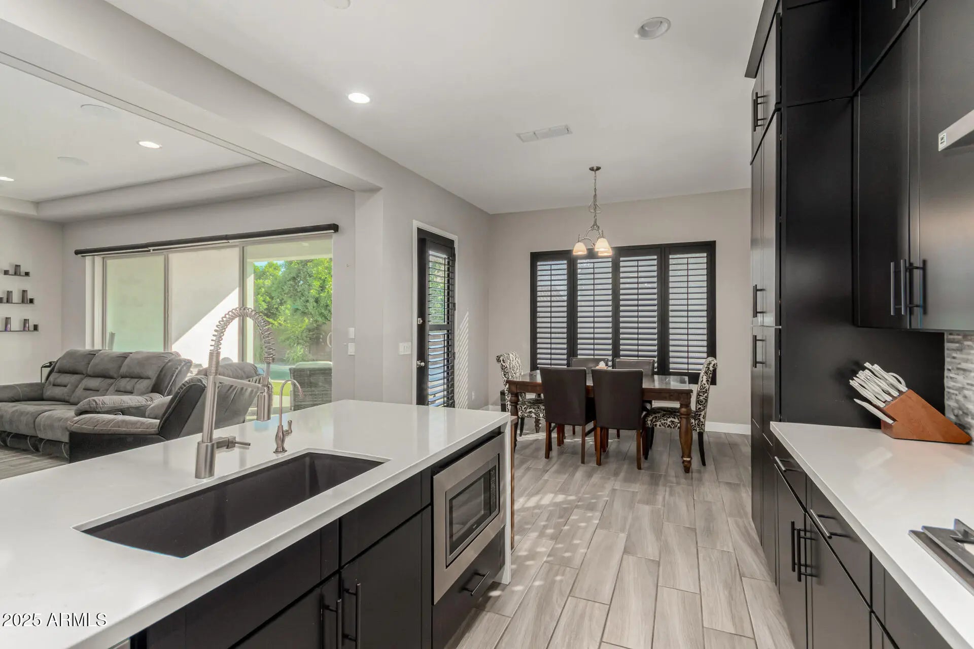 Welcome to your dream home! Introducing this stunning one-story gem offering exceptional living with modern features throughout. Sleek interior impresses with wood-look tile flooring, pre-wired surround sound, ceiling fans, plantation shutters, and abundant natural light that enhances every space. You'll love the versatility of the multiple living areas, including an inviting living room, a formal dining room, and a flexible bonus room. Spacious great room promotes a contemporary and effortless flow, perfect for everyday living and entertaining. Gourmet kitchen is a true showstopper, boasting recessed lighting, a plethora of cabinetry topped with crown moulding, quartz counters, stainless steel appliances, mosaic tile backsplash, a prep island with a breakfast bar, and a breakfast nook. Double doors open to the large primary retreat, offering an elegant ensuite with two vanities, a garden tub, a floor-to-ceiling tiled shower, and a walk-in closet. The 2nd main bedroom is equally impressive, complete with its own sitting room and private bathroom, ideal for guests or multigenerational living. Enjoy year-round fun in the wonderful backyard, complete with a covered patio, built-in BBQ, fire pit, and a swimming pool. Amazing Community amenities await. Don't let this rare find slip by!