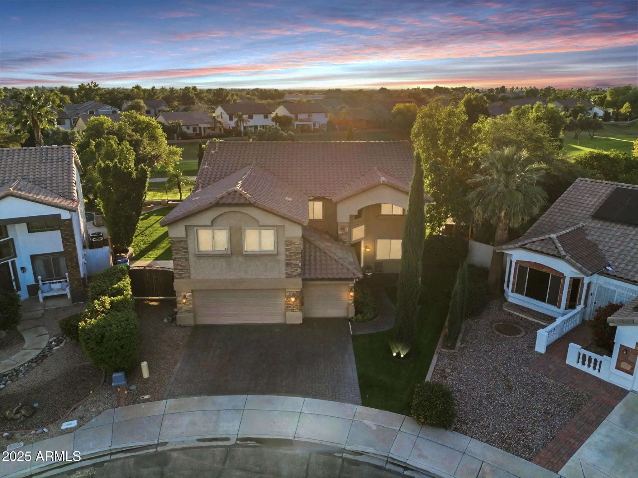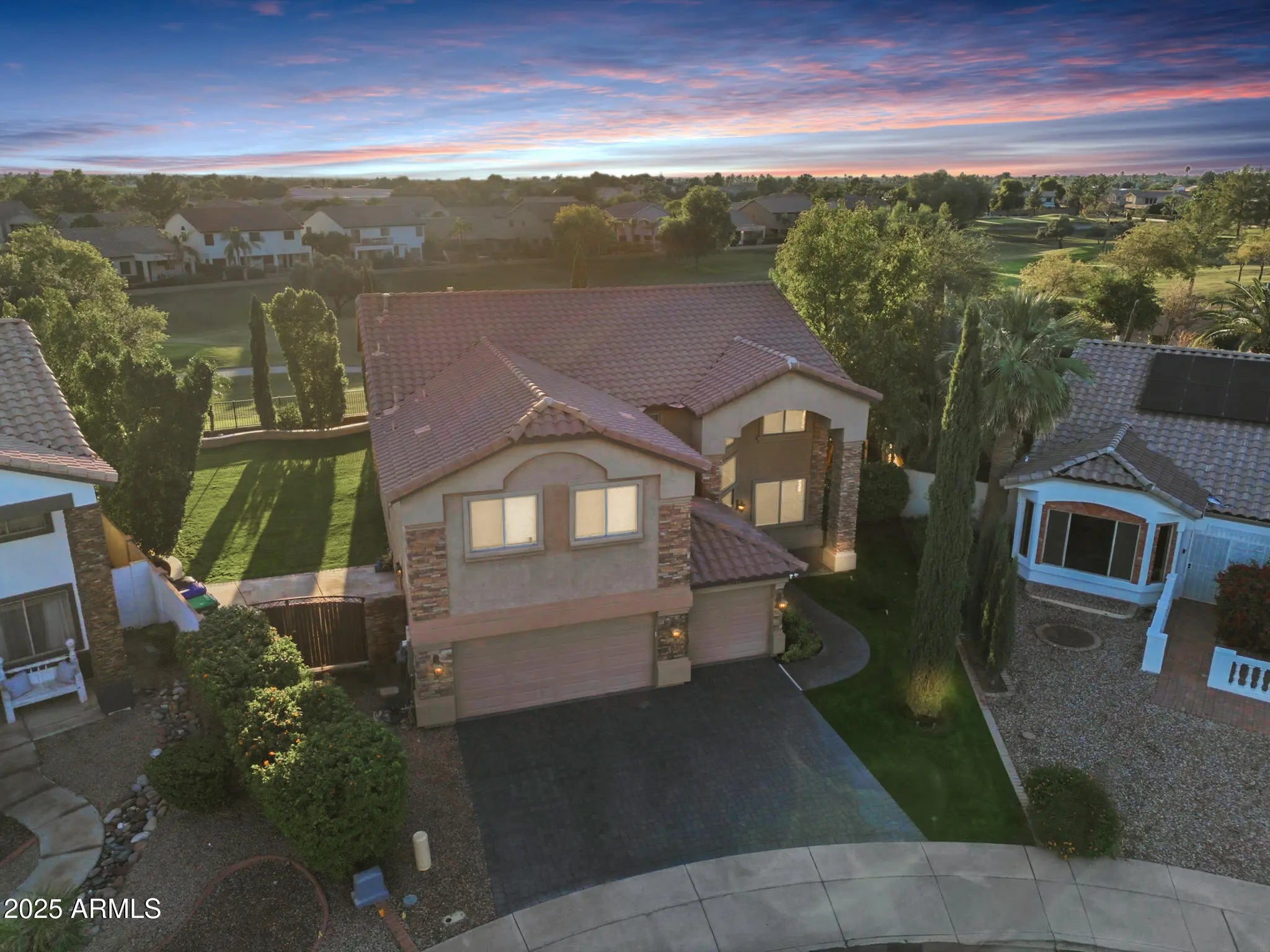 Welcome to luxury living in the highly desirable Augusta Ranch community, home to Arizona's #1 executive golf course. Proudly offered by the original owners, this impeccably maintained residence showcases thoughtful upgrades, timeless finishes, and an unmatched setting overlooking the 7th hole. From the moment you arrive, the curb appeal is exceptional: lush, manicured landscaping, an RV gate, a 3-car garage paired with beautiful pavered parking for 3 additional vehicles, and an oversized lot that truly sets the tone for what's inside. Step into 4 bedrooms, 2.5 baths, and a beautifully designed floor plan featuring neutral paint, soaring ceilings, 5-inch wood baseboards, wooden doors, and gorgeous tile throughout. A rare dual-sided staircase enhances flow and accessibility. The chef's kitchen is a chef's dream with stainless steel appliances, abundant cabinetry, a walk-in pantry, and direct access to the backyard for seamless indoor-outdoor living. A dedicated downstairs office, with private backyard access, plus a convenient half bath offers the perfect work-from-home setup. Upstairs, oversized guest bedrooms provide comfort for all, including one with its own private balcony overlooking the pristine yard and golf course, complete with a spiral staircase for easy access. The owners suite is a true retreat showcasing a dual-headed walk-in shower, jetted soaking tub, large dual vanities, private water closet, and an expansive walk-in closet. A standout highlight of the home is the bonus game room, enclosed by elegant glass French doors and featuring a wet bar for drinks, snacks, and entertaining. The backyard feels like your own private resort: a sparkling pool with water feature, relaxing jacuzzi, built-in BBQ, fire pit with seating, and fresh, vibrant grass surrounded by immaculate landscaping. Whether you're hosting gatherings or enjoying peaceful evenings under the Arizona sky, the possibilities for memories here are endless. Living in Augusta Ranch means more than just a beautiful home, it's a lifestyle. The community offers state-of-the-art Toptracer technology, glow-in-the-dark golf, fun family nights, an on-site restaurant and bar, corn hole tournaments, and so much more. There's always something to enjoy right in your own neighborhood. All of this sits minutes from the Salt River, Canyon Lake, and the East Valley's best hiking and riding trails. Augusta Ranch remains one of East Mesa's most prestigious neighborhoods, known for its convenience, community lifestyle, and unbeatable outdoor recreation. A rare opportunity to own a premier home in a premier location come make it yours today.