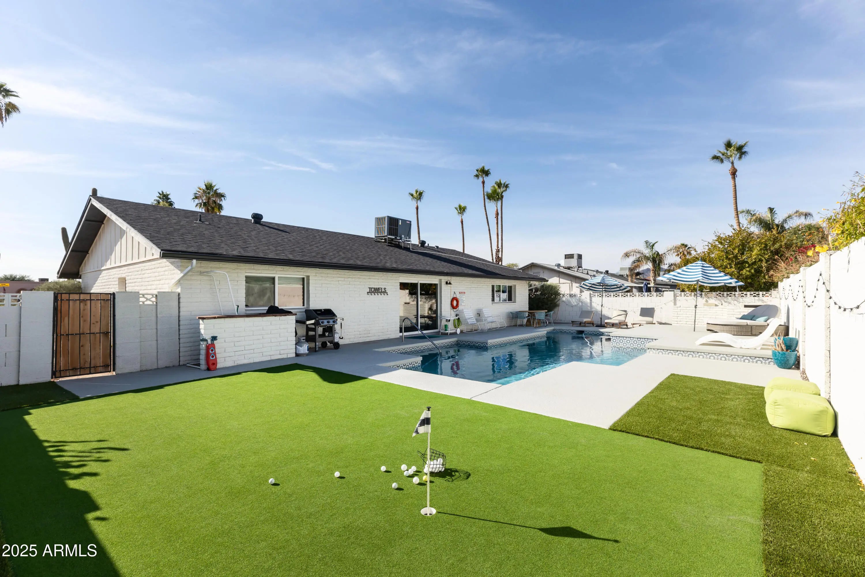 Welcome to this beautifully updated CORNER LOT 3BD, 2BA home in the heart of Scottsdale with NO HOA. This home was fully remodeled in 2022! Throughout this bright open floor plan, you'll love the wood-like tile flooring, custom window shades, and modern finishes. The chef's kitchen features an expansive island with bar seating, an eat-in dining area, gas cooktop, quartz countertops, apron sink, and matching stainless steel appliances. Both bathrooms offer dual vanities and floor-to-ceiling tile showers. Major system upgrades add exceptional value, including an HVAC replaced in 2023, roof replaced in 2023, sewer lines replaced in 2022, a new heated PebbleTec pool in 2022, new electrical ran to the pool systems, and new water heated in 2022. The resort-style backyard retreat offers putt-putt golf and a generous pool deck designed for outdoor enjoyment and entertaining. The front yard offers maintenance desert curb appeal and new front patio and lighting to enjoy year round. Plus, new gutters in front and back! Perfect rental or Airbnb! Available furnished separate Bill of Sale.