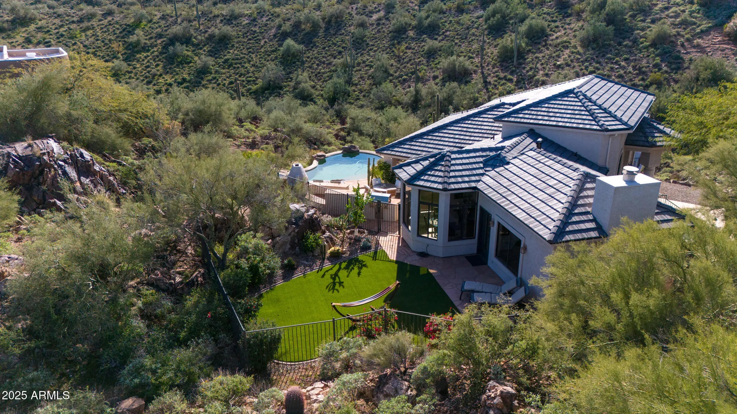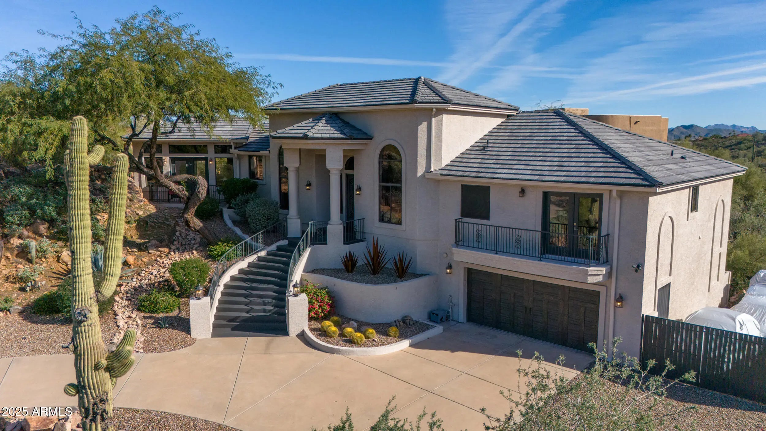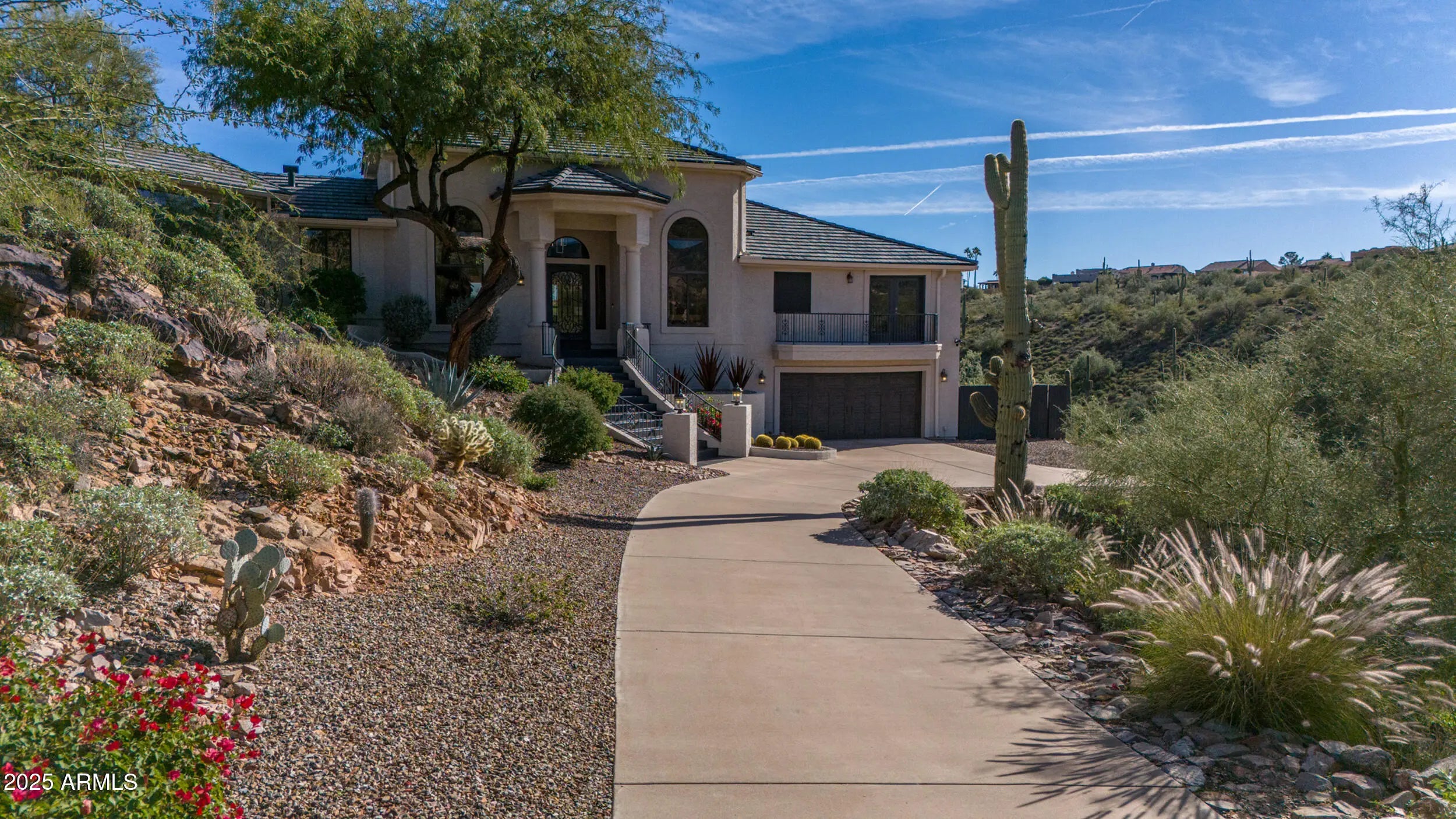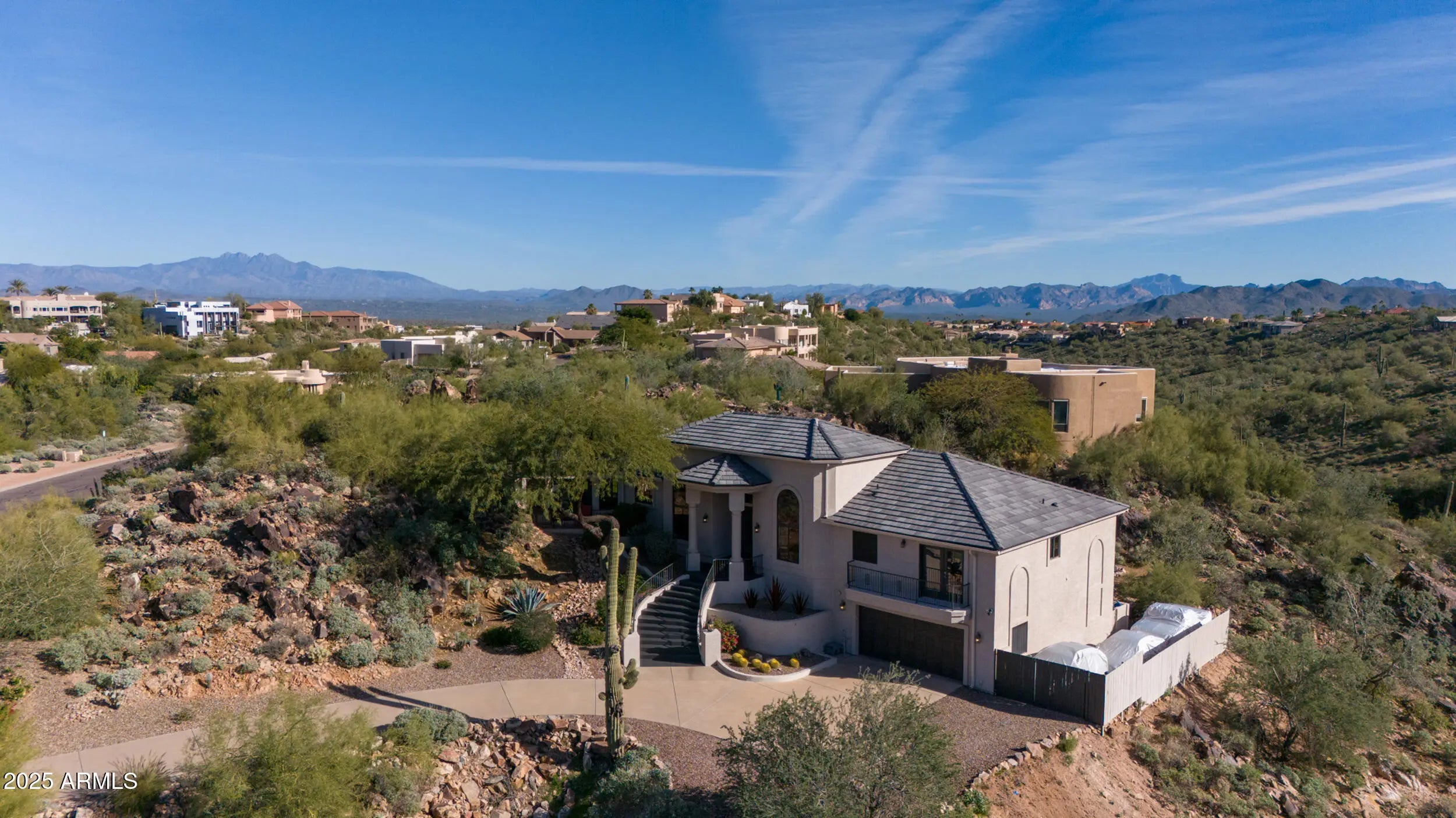 A home that feels like it was discovered, not built. Perched amid massive rock outcroppings, this one-of-a-kind home located on the prestigious street of Sunburst Drive rises naturally with the desert unfolding around it like a private sanctuary. From the moment you arrive, the setting feels cinematic: sun-warmed boulders, endless mountain silhouettes, and the kind of quiet you can feel. Step inside and the views follow you—framed in the plethora of windows are mountain views, open desert, and majestic sunsets. This fully remodeled home boasts soaring ceilings, and plenty of room to share its beauty with family and friends with 4 bedrooms and 2.5 baths along with a formal dining room, living room, eat-in kitchen, huge granite kitchen island with waterfall that seats 6, a family room with fireplace, hardwood flooring throughout (no carpet), and beautiful marble slab shower and marble counters in all the bathrooms. Choose your view from the multiple balconies and patios, watch the sunset over the McDowell Mountains, or gaze at the iconic Red Mountain out your bedroom window. The beautiful finishes are just the start, this home also has a brand new roof including new tiles, fresh paint and much more (check out the updates list in the documents tab). The acre lot gives you endless room to breathe and relax. And with this much space, you can expand the home or choose to build an additional dwelling unit, the possibilities are endless. Enjoy the rare privacy that comes from having nature as your closest neighbor, but still so close to Scottsdale. A retreat, a statement, and a piece of the desert's quiet majesty, all wrapped into one unforgettable Stoneridge property. View it today before this one of a kind home is sold.