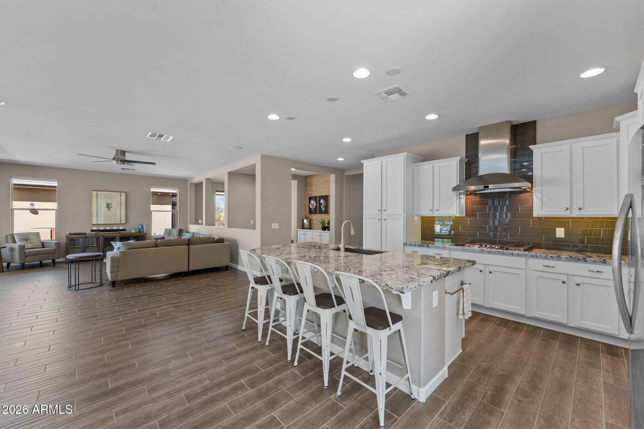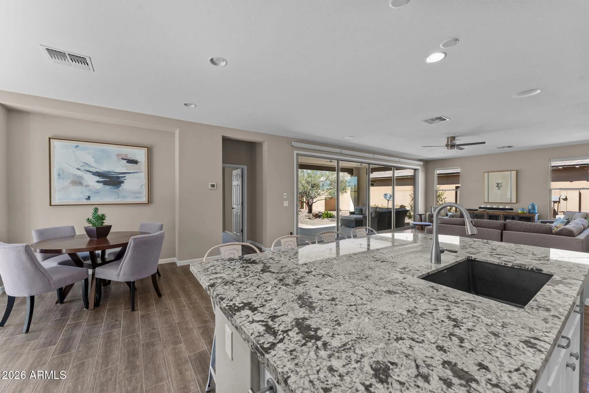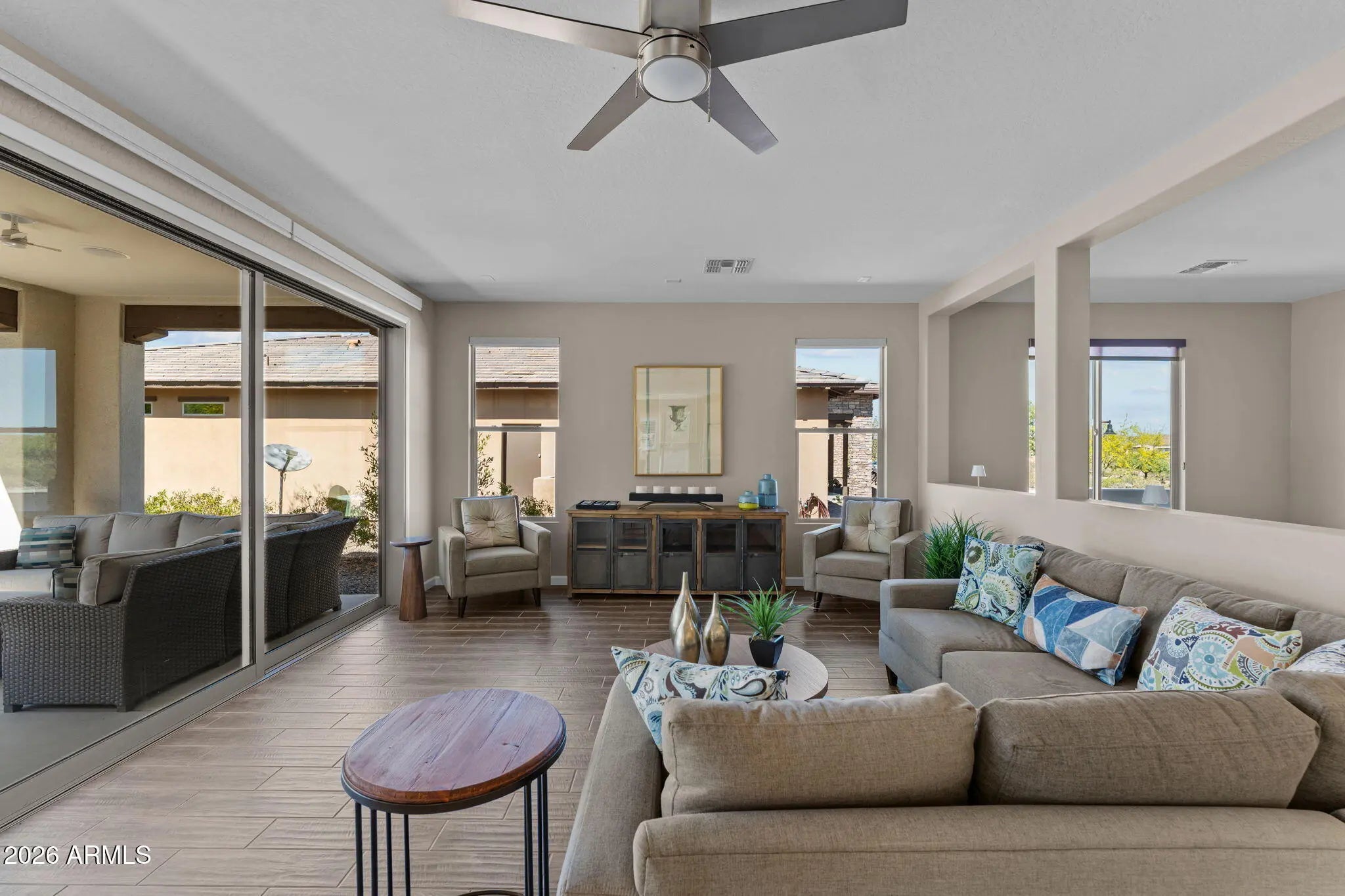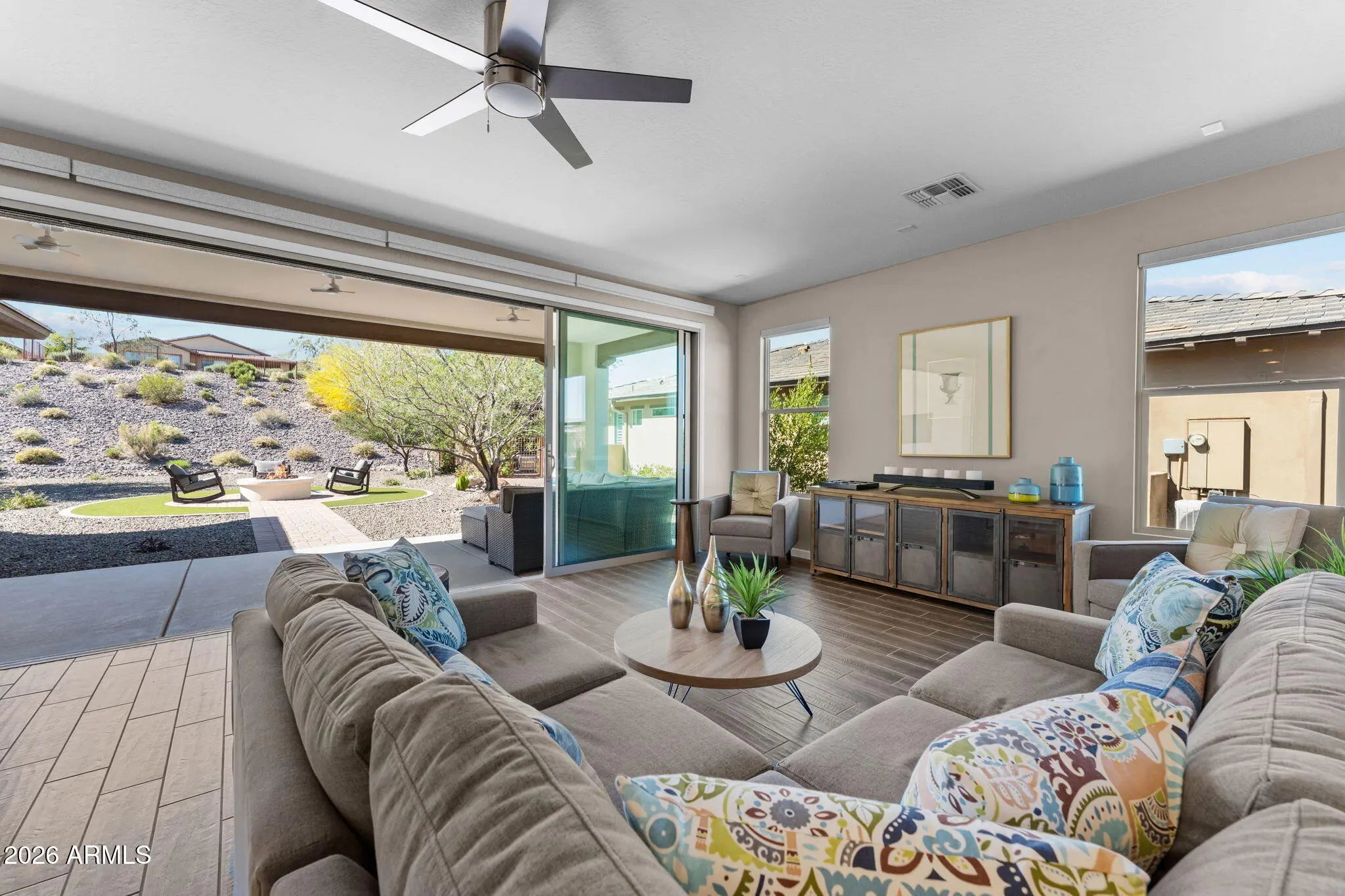Experience effortless desert living in this beautifully designed 2-bedroom, 2-bathroom home located on a very quiet street in the highly desirable community of Wickenburg Ranch. This thoughtfully maintained residence, offered fully furnished inside and out, feels fresh and inviting with new carpet, new paint, new wall coverings, new ceiling fans, and new automated linen blinds, all professionally updated and decorated. As an owner's second home, it has been barely lived in. An open floor plan and great natural light create a warm, airy feel, enhanced by wood-look tile flooring in the living room, kitchen, and bathrooms. The spacious kitchen features a large island, white cabinetry, upgraded appliances, a new dishwasher and refrigerator, and a gas cooktop, perfect for cooking and entertaining. A stunning wall of retractable sliding glass doors allows for seamless indoor/outdoor living. Step outside to a large covered patio overlooking a gas firepit surrounded by low-maintenance turf, ideal for relaxing year-round. Additional highlights include an extended garage with a 240-volt EV charge connection and whole-home generator backup connection and the peace of a location with no road noise. Come discover the perfect blend of comfort, style, and resort-style living that makes Wickenburg Ranch one of Arizona's premier destinations.