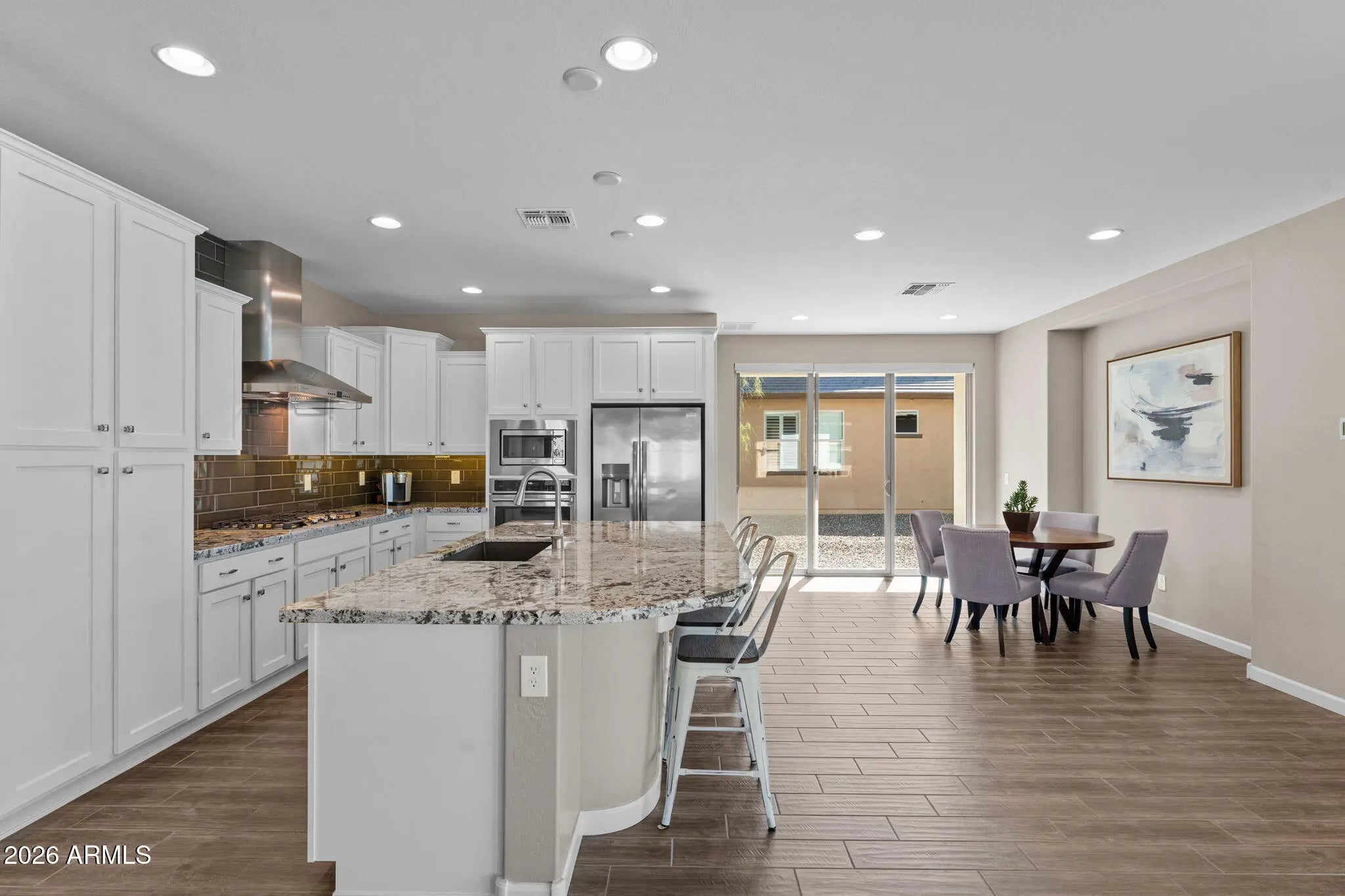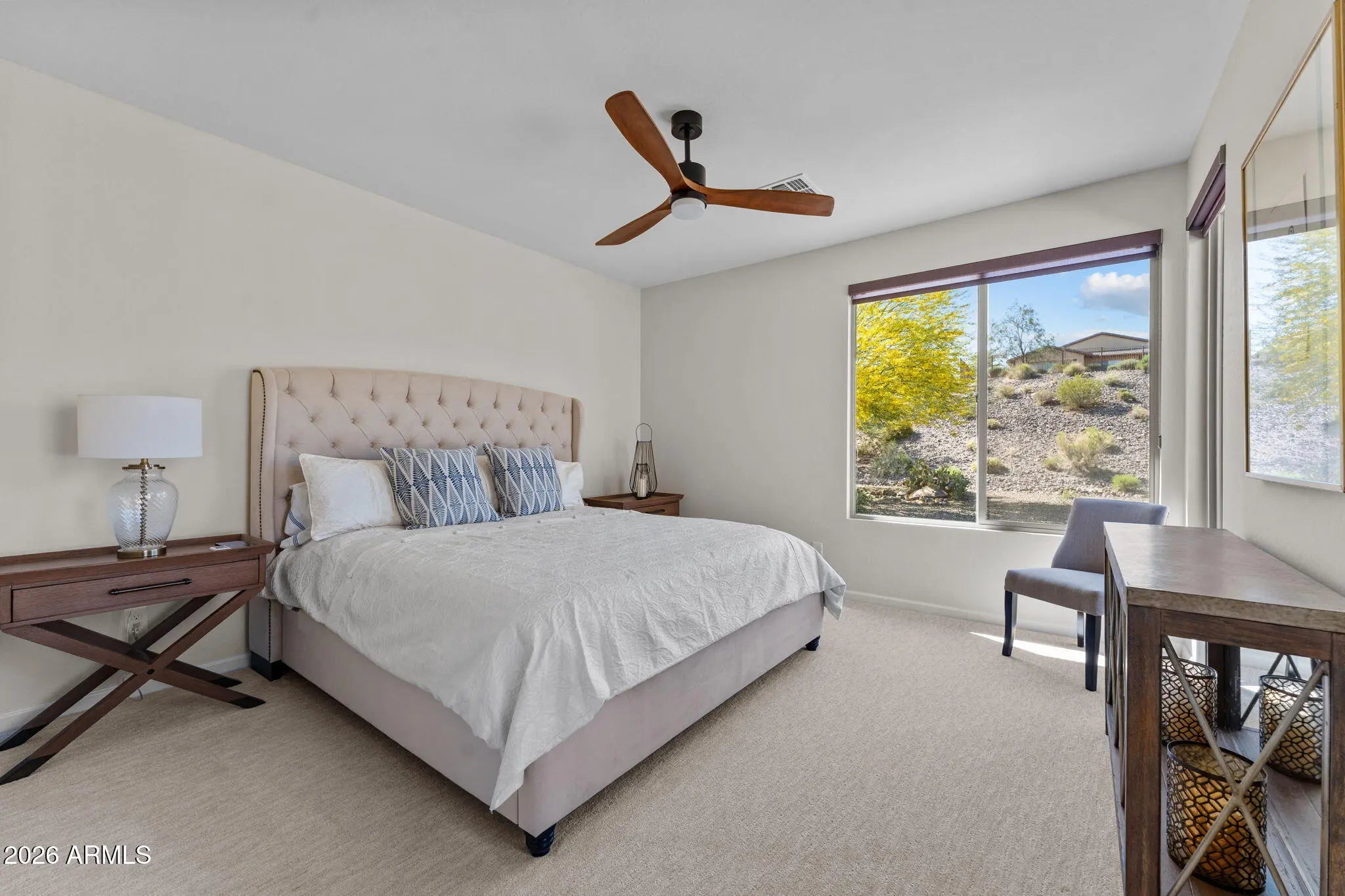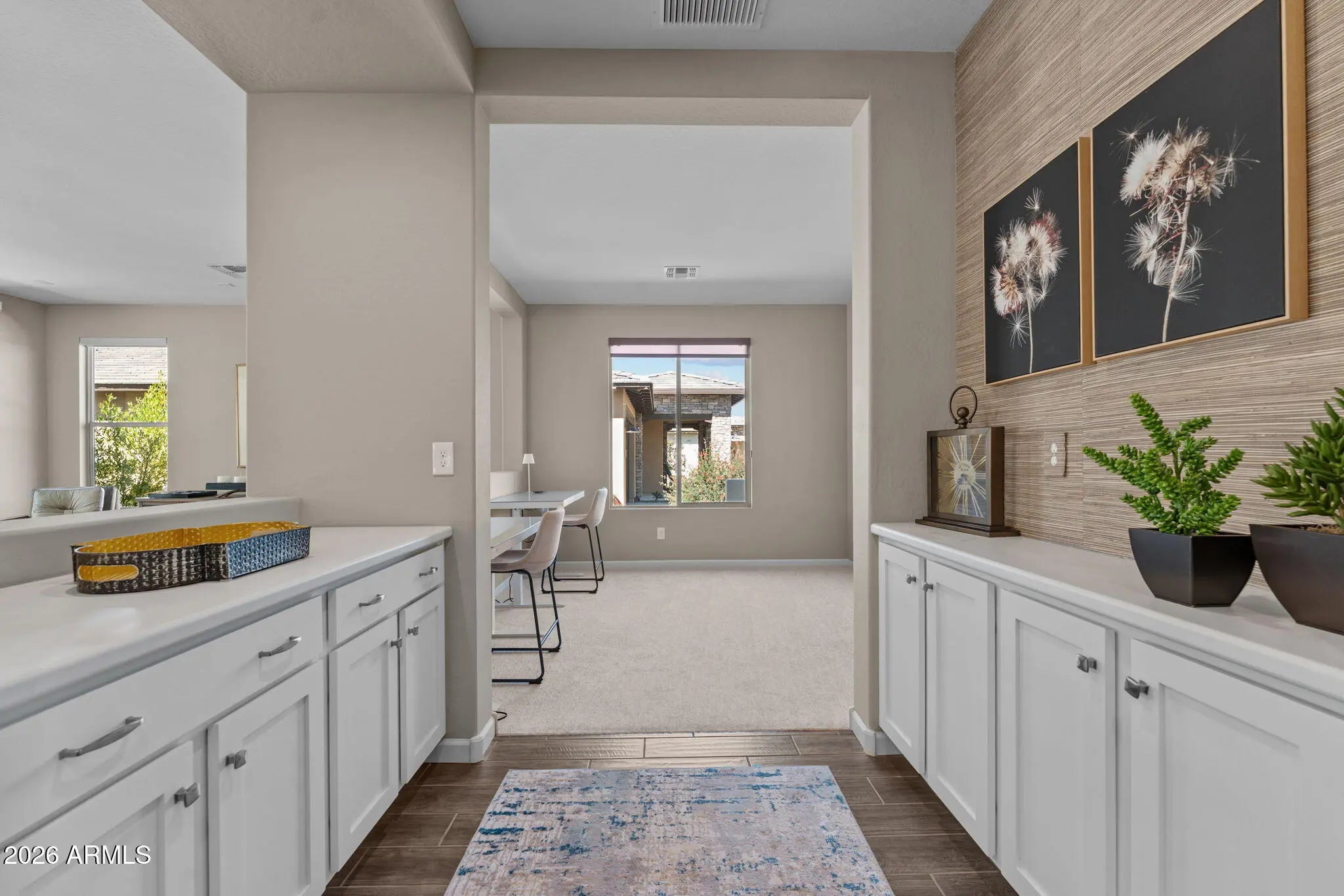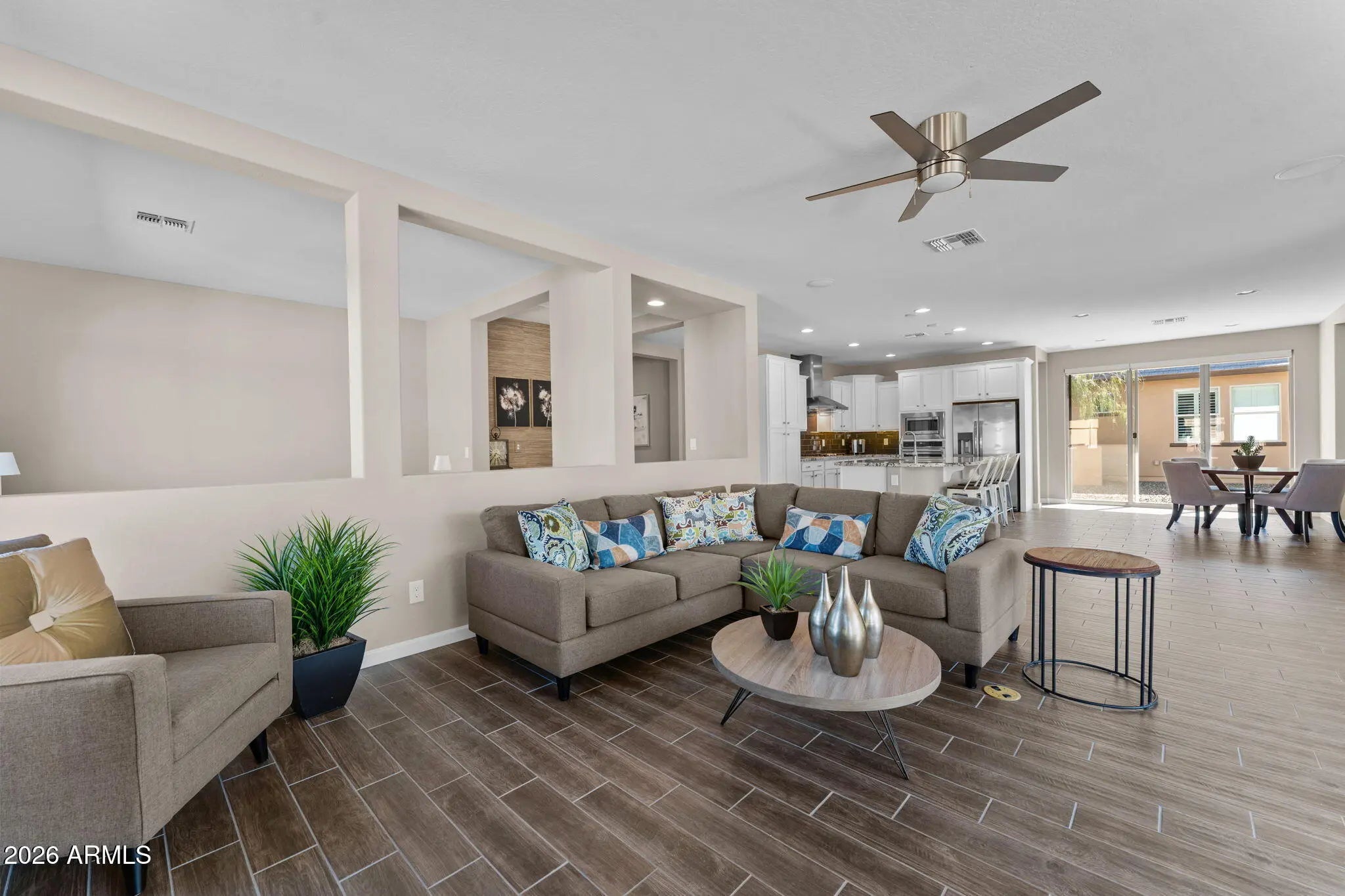 Experience effortless desert living in this beautifully designed 2-bedroom, 2-bathroom home located on a very quiet street in the highly desirable community of Wickenburg Ranch. This thoughtfully maintained residence, offered fully furnished inside and out, feels fresh and inviting with new carpet, new paint, new wall coverings, new ceiling fans, and new automated linen blinds, all professionally updated and decorated. As an owner's second home, it has been barely lived in. An open floor plan and great natural light create a warm, airy feel, enhanced by wood-look tile flooring in the living room, kitchen, and bathrooms. The spacious kitchen features a large island, white cabinetry, upgraded appliances, a new dishwasher and refrigerator, and a gas cooktop, perfect for cooking and entertaining. A stunning wall of retractable sliding glass doors allows for seamless indoor/outdoor living. Step outside to a large covered patio overlooking a gas firepit surrounded by low-maintenance turf, ideal for relaxing year-round. Additional highlights include an extended garage with a 240-volt EV charge connection and whole-home generator backup connection and the peace of a location with no road noise. Come discover the perfect blend of comfort, style, and resort-style living that makes Wickenburg Ranch one of Arizona's premier destinations.