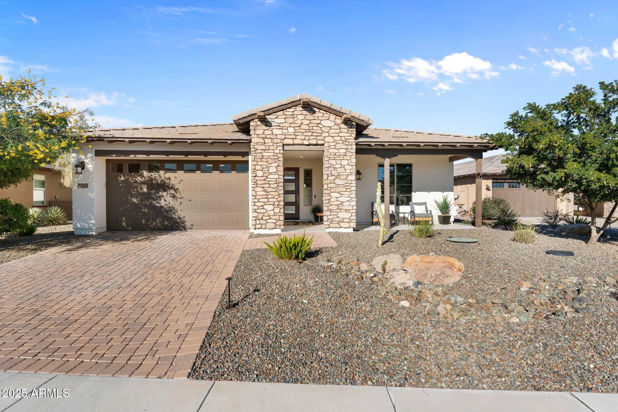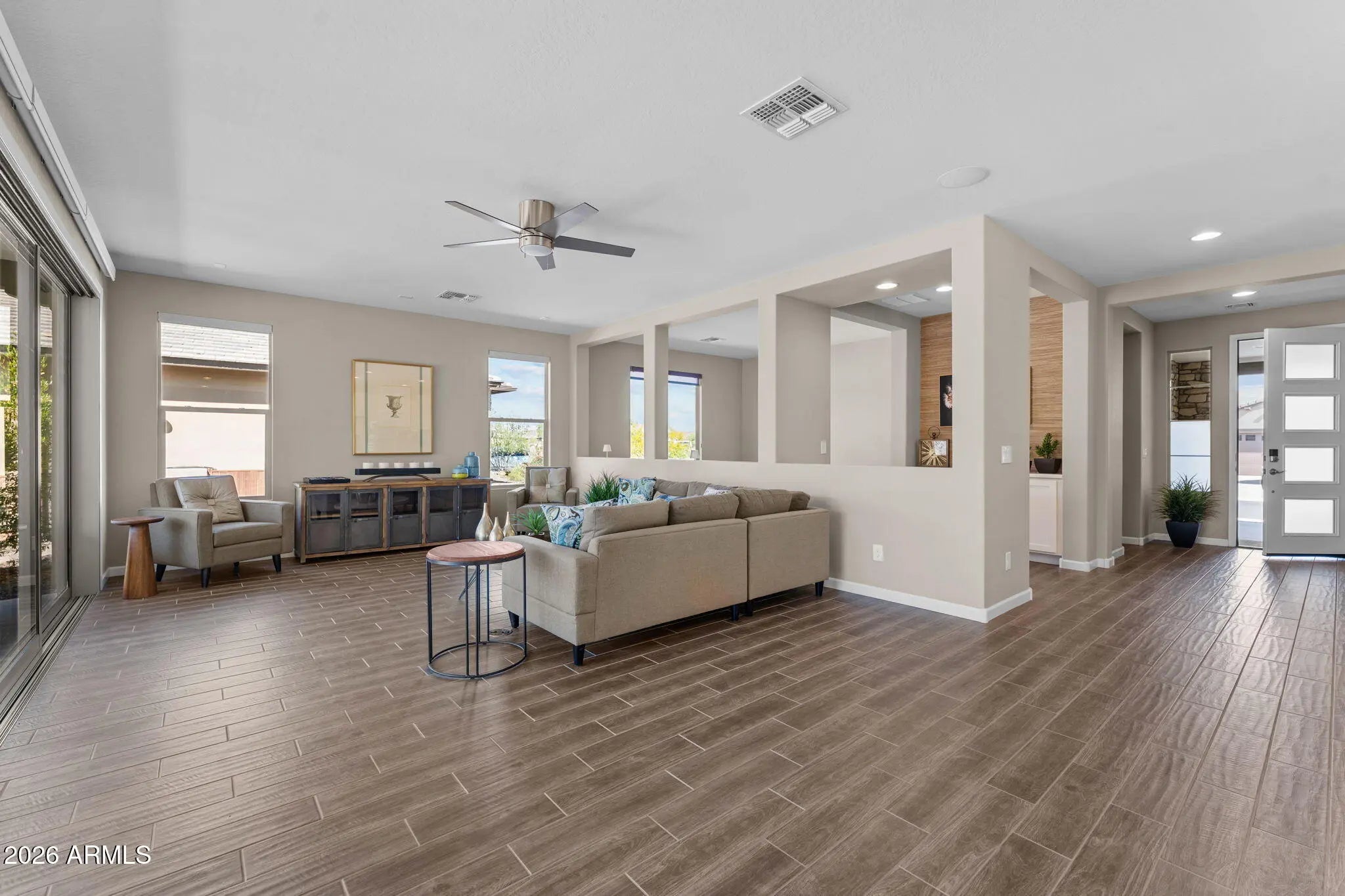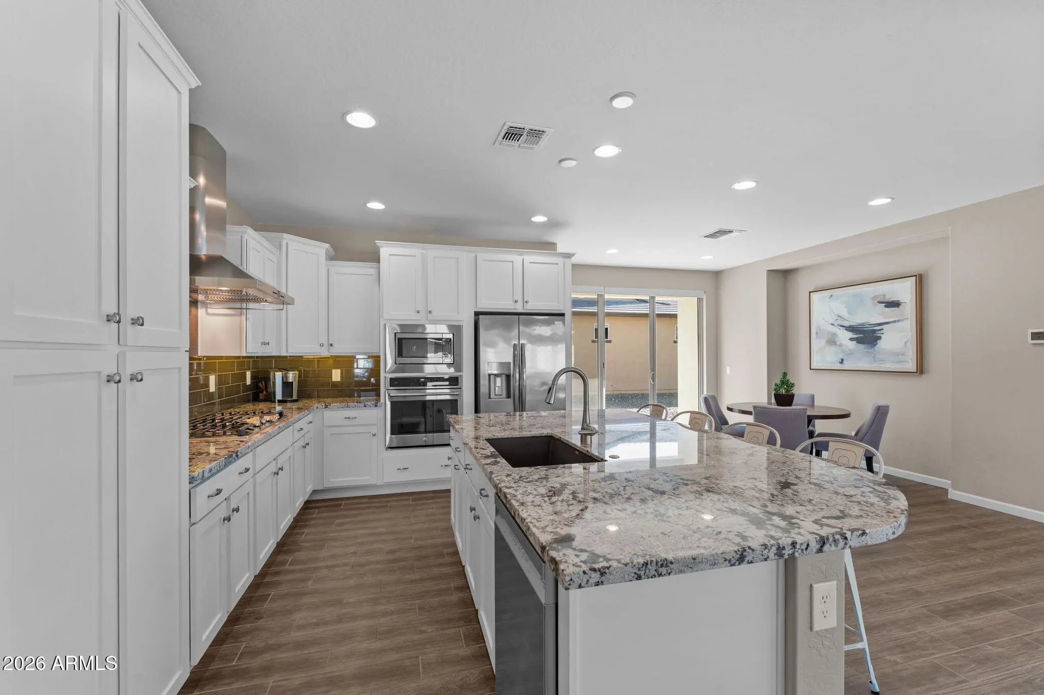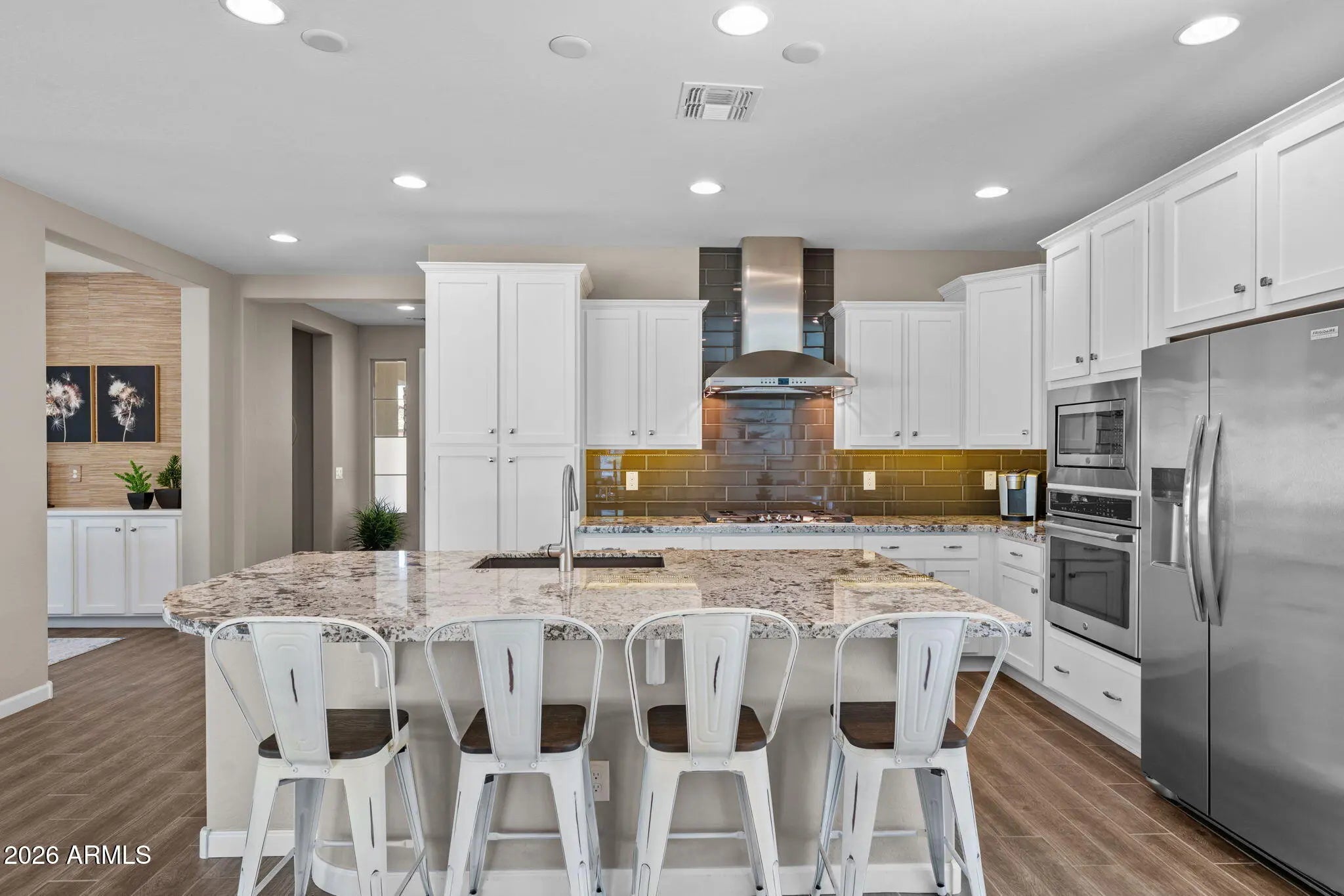 Experience effortless desert living in this beautifully designed 2-bedroom, 2-bathroom home located on a very quiet street in the highly desirable community of Wickenburg Ranch. This thoughtfully maintained residence, offered fully furnished inside and out, feels fresh and inviting with new carpet, new paint, new wall coverings, new ceiling fans, and new automated linen blinds, all professionally updated and decorated. As an owner's second home, it has been barely lived in. An open floor plan and great natural light create a warm, airy feel, enhanced by wood-look tile flooring in the living room, kitchen, and bathrooms. The spacious kitchen features a large island, white cabinetry, upgraded appliances, a new dishwasher and refrigerator, and a gas cooktop, perfect for cooking and entertaining. A stunning wall of retractable sliding glass doors allows for seamless indoor/outdoor living. Step outside to a large covered patio overlooking a gas firepit surrounded by low-maintenance turf, ideal for relaxing year-round. Additional highlights include an extended garage with a 240-volt EV charge connection and whole-home generator backup connection and the peace of a location with no road noise. Come discover the perfect blend of comfort, style, and resort-style living that makes Wickenburg Ranch one of Arizona's premier destinations.