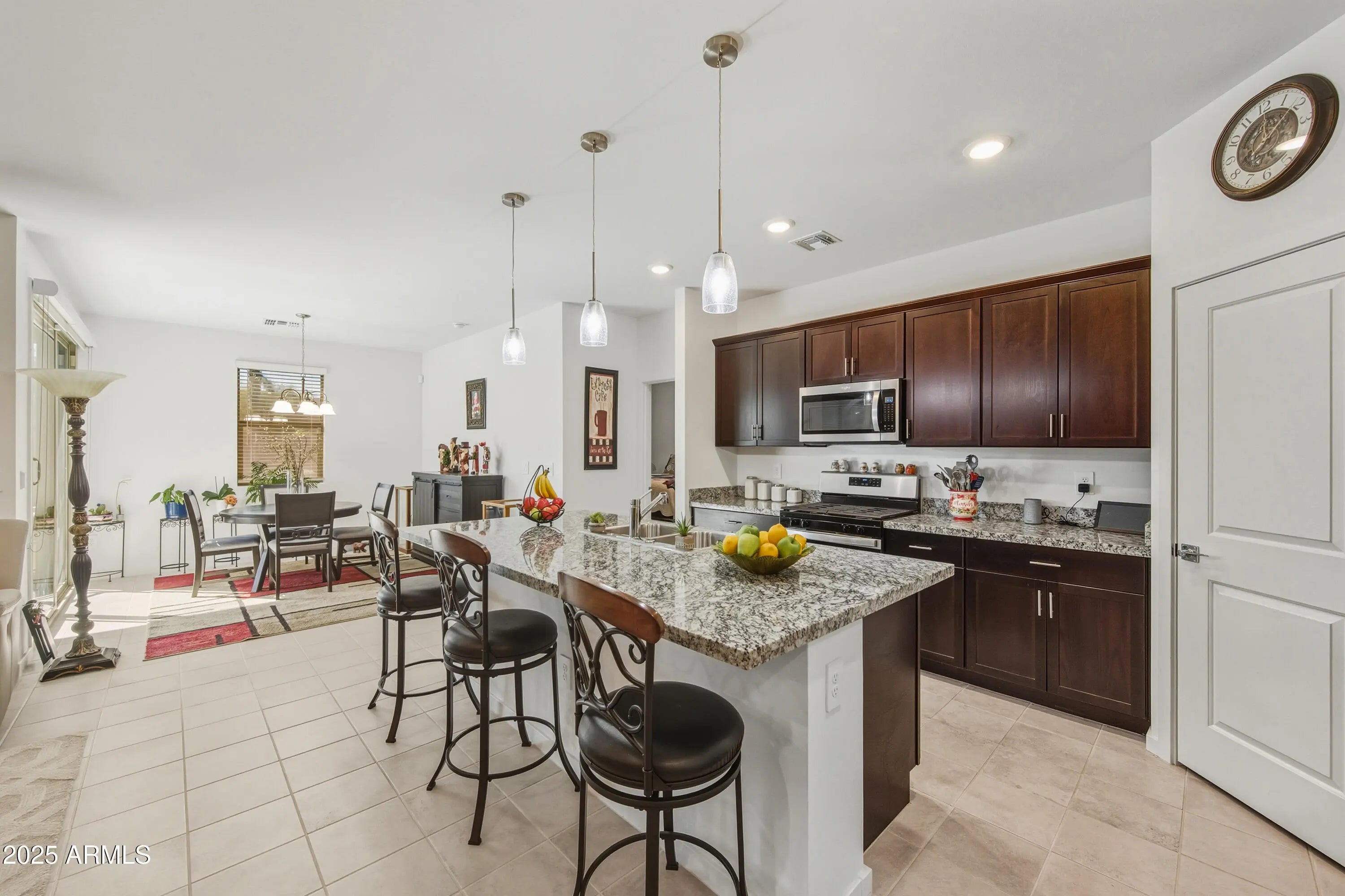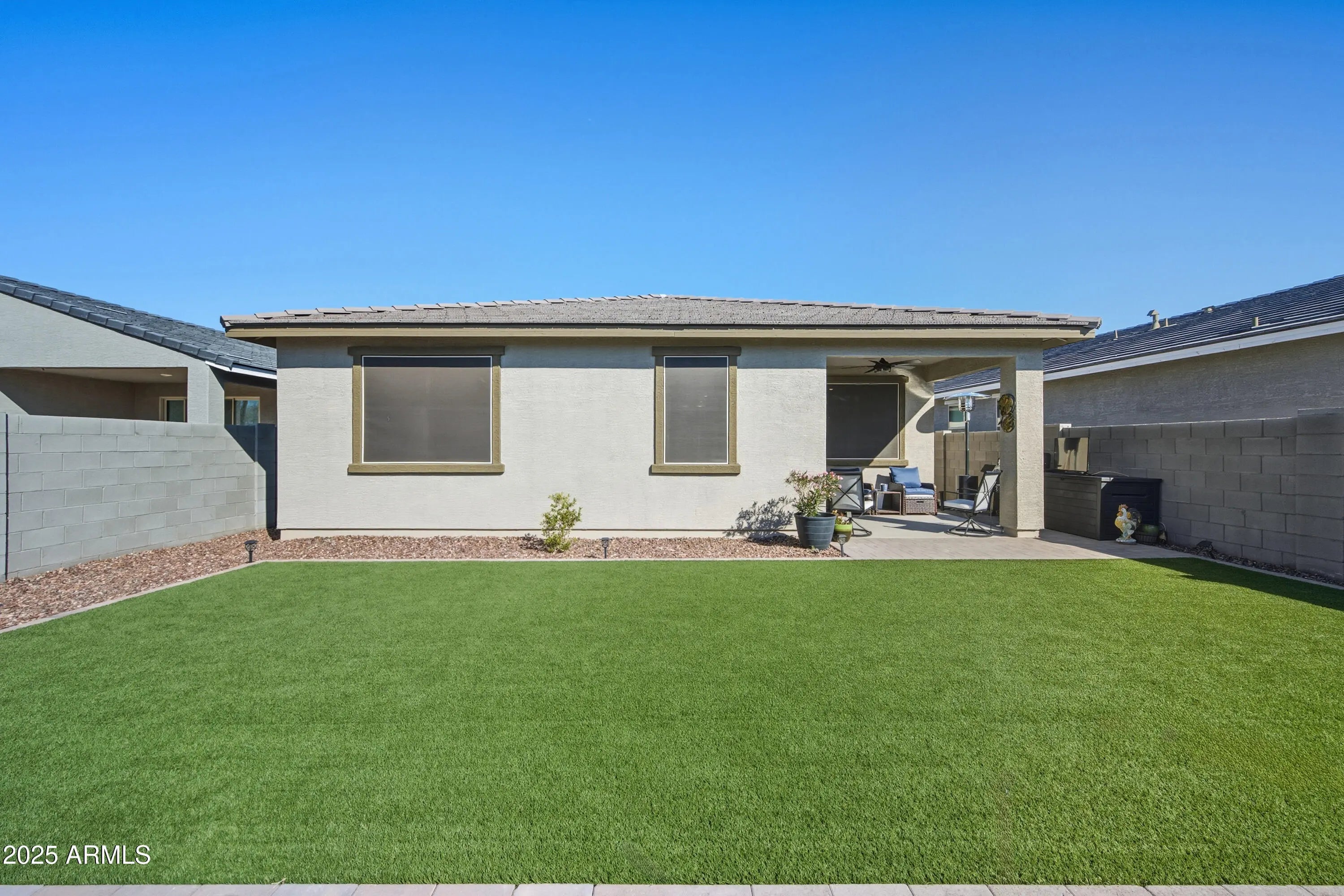 Why wait on new construction when you can move right into this nearly new 4 bed, 2 bath home is available right now!? Step into instant relaxation with a fully landscaped, low-maintenance backyard. It's already lush, private and fully fenced with no neighbors behind you. It's your own desert oasis perfect for morning coffee or evening cocktails under the stars. Inside, the bright open-concept layout welcomes you with spacious living and dining areas that flow seamlessly into a gorgeous chef's kitchen. You'll love the granite counters, oversized breakfast bar, pendant lighting and stainless steel appliances including a gas range. Beautiful tile flooring throughout keeps everything cool and easy to care for. The roomy master suite is your private retreat with a large walk-in closet, dual vanities and a luxurious walk-in shower. 3 additional bedrooms give you plenty of space for guests or a home office. Live the resort lifestyle all year (or just the seasons you want) with the community pool, pickleball courts, playground, walking trails, and more, all just steps from your door. No waiting, no dust or construction next door and no decisions left to make. This home is turnkey and waiting for you to start enjoying Arizona living immediately. So come discover the allure of desert living in the welcoming city of Maricopa with plenty of shops and eateries, golf courses, exciting casino entertainment, and much more. Nestled in a small-town setting away from the frenzy of metropolitan life while only 30 minutes from Chandler! Enjoy the perfect balance of serene desert escape and easy access to everything the Valley has to offer.