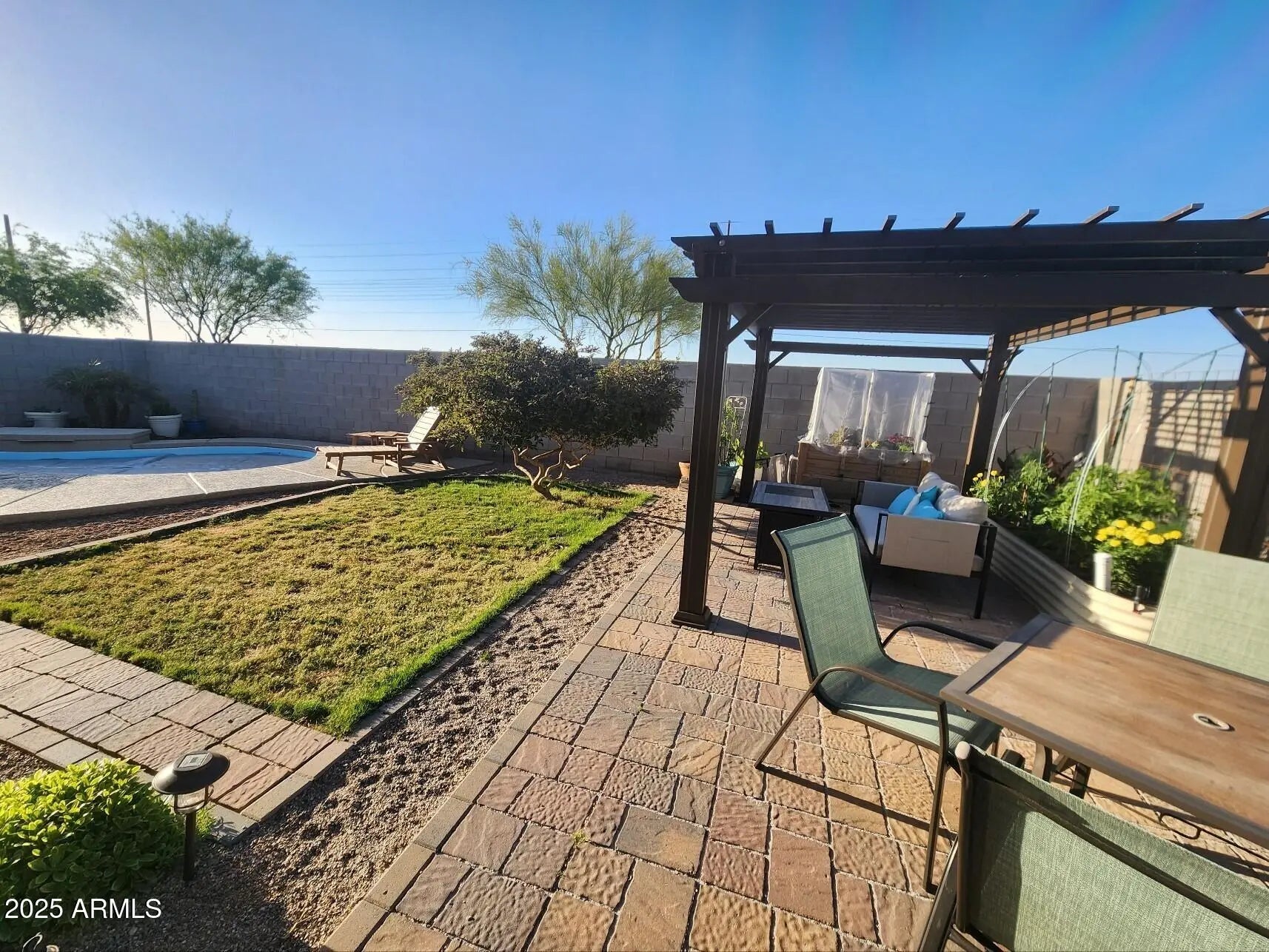 Welcome to this meticulously maintained 2018 Meritage build retreat, nestled on a quiet cul-de-sac with serene mountain views & N/S Exposure. The interior is warm & inviting with a designer-curated palette and the maintenance ease of zero carpeting throughout. A sophisticated culinary centerpiece, the kitchen features an expansive island with dramatic veined granite, white shaker cabinetry, backsplash and a natural gas stove. All appliances, including the refrigerator and laundry (W/D), convey for a seamless transition. Laundry room is fitted with a sink and storage cabinets. The primary suite is a private haven, offering a walk-in closet enhanced with a ceiling fan with dedicated space for storage or specialized gear. The backyard, a resort-style escape is anchored by a 2022 San Juan fiberglass pool, celebrated for its permanent finish and low-maintenance care. This finished outdoor living space includes a shady pergola, storage shed w/ all tools and self-watering planters. Avoid the 8-month builder delay and $50k cost of adding a pool! The 2.5-car garage includes a workshop and 20-amp circuit, all encased in Meritage's famous energy efficient spray foam insulation. Also includes a reverse osmosis water purification system. Truly a turnkey treasure. Enjoy a peaceful, private location that is just 7 minutes from shopping, and many other amenities!