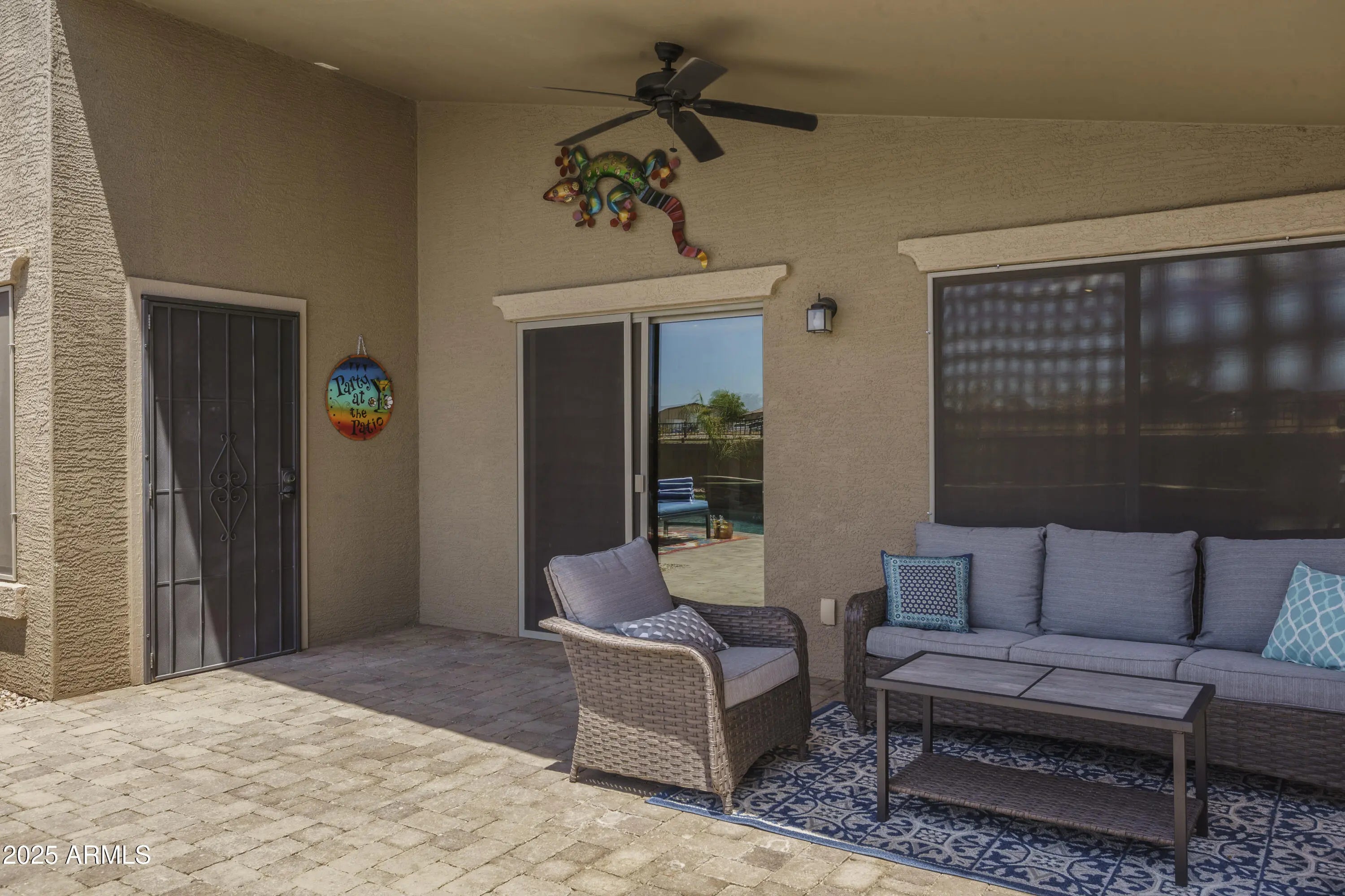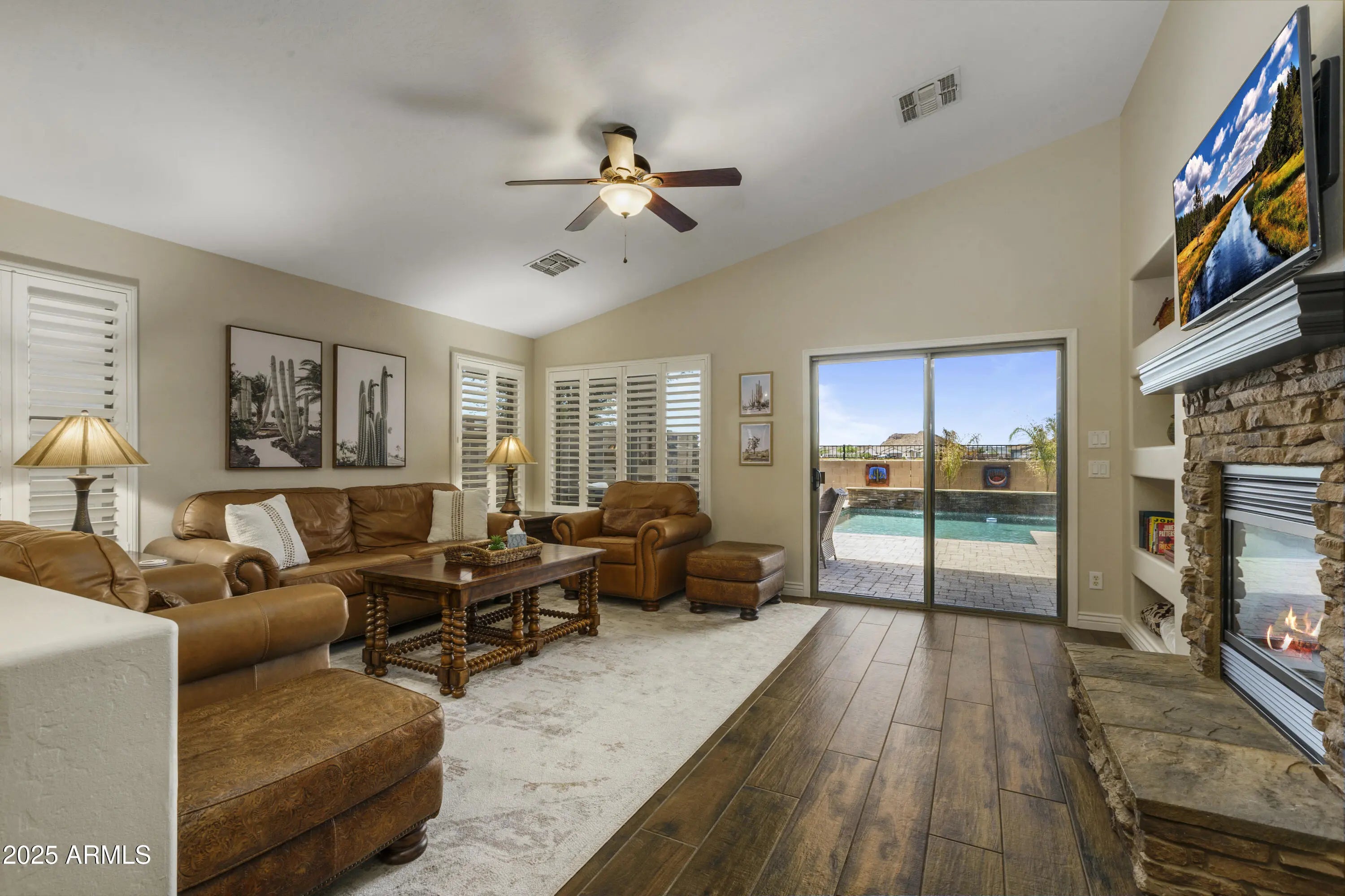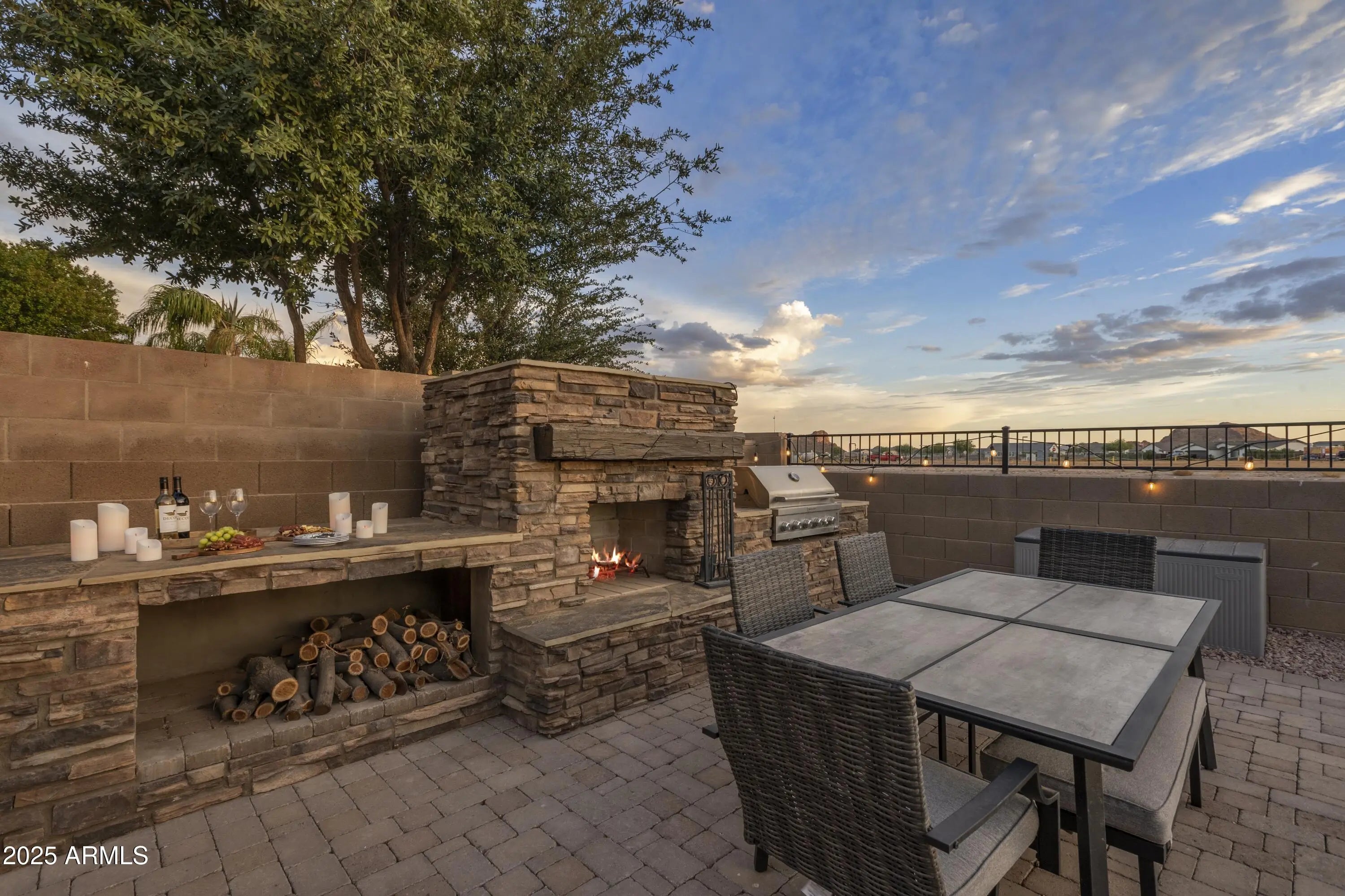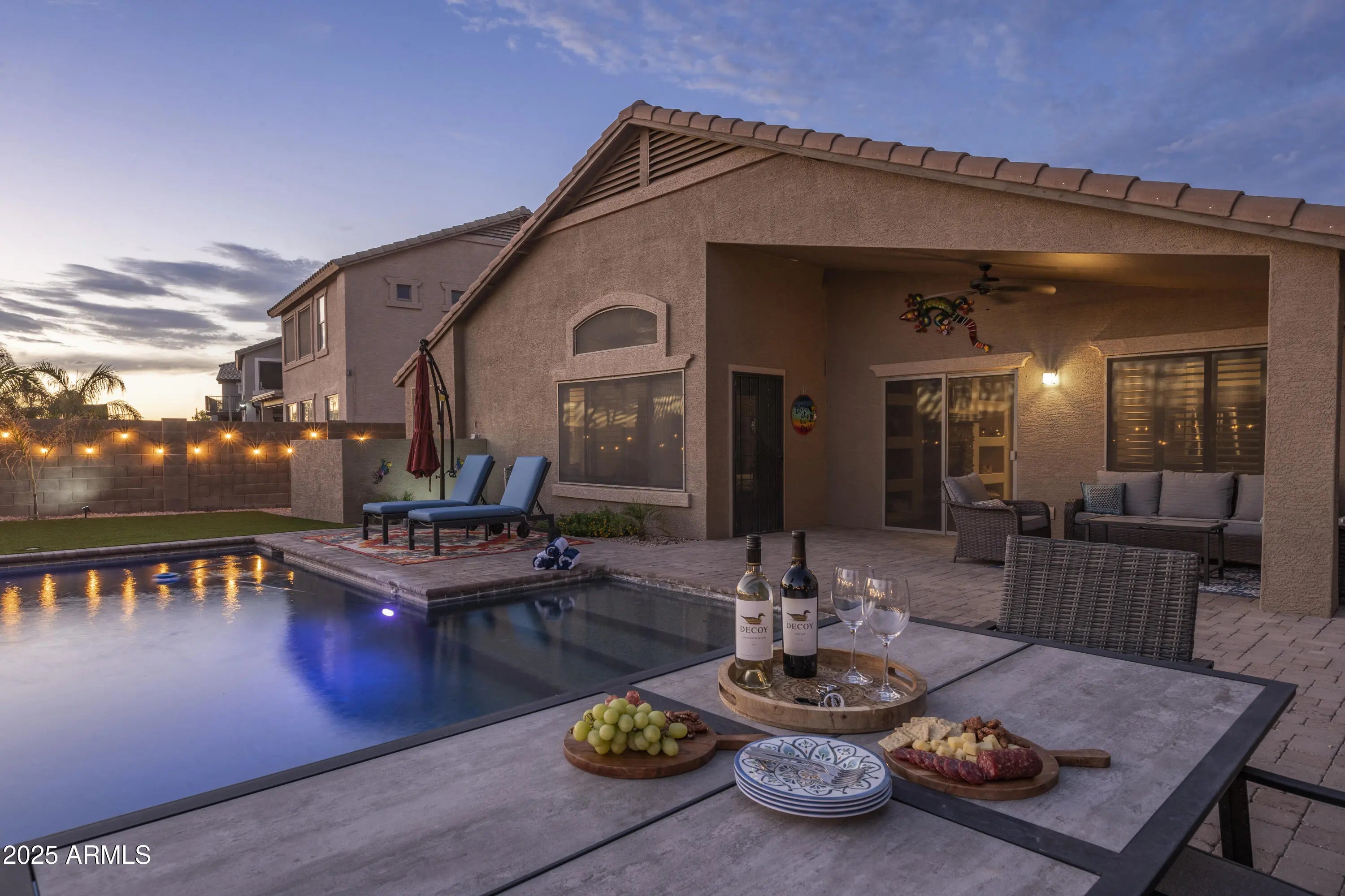 This stunning residence delivers an exceptional outdoor living experience, complete with a sparkling pool, built-in BBQ, and a cozy outdoor fireplace—ideal for both relaxation and entertaining. Currently operating as a turnkey Airbnb, the home offers a seamless opportunity for future hosts, with all furnishings available to purchase. Inside, the open and spacious floorplan includes 4 bedrooms and 2 bathrooms. With no neighbors behind the property, you'll enjoy outstanding privacy and spectacular sunset views. Plantation shutters and elegant wood-look tile flooring extend throughout the home, enhancing its charm and style. The impressive kitchen boasts abundant cabinetry, a large walk-in pantry, granite countertops, a tile backsplash, stainless steel appliances—including a wall oven— a stylish island with a breakfast bar. Additional storage is provided with convenient garage cabinetry. The expansive primary suite features a private exit to the backyard, a full bathroom with dual sinks, an updated walk-in shower, and a generous walk-in closet. Experience unmatched privacy and unforgettable sunsets in this exceptional property.