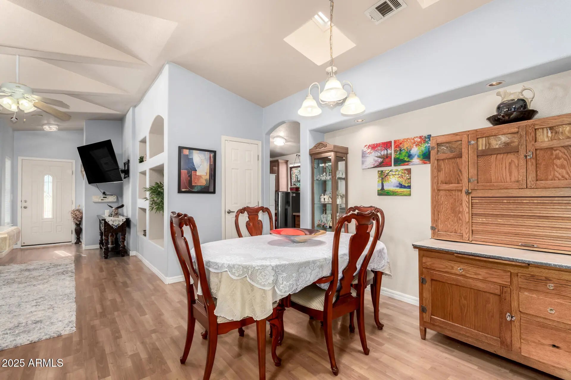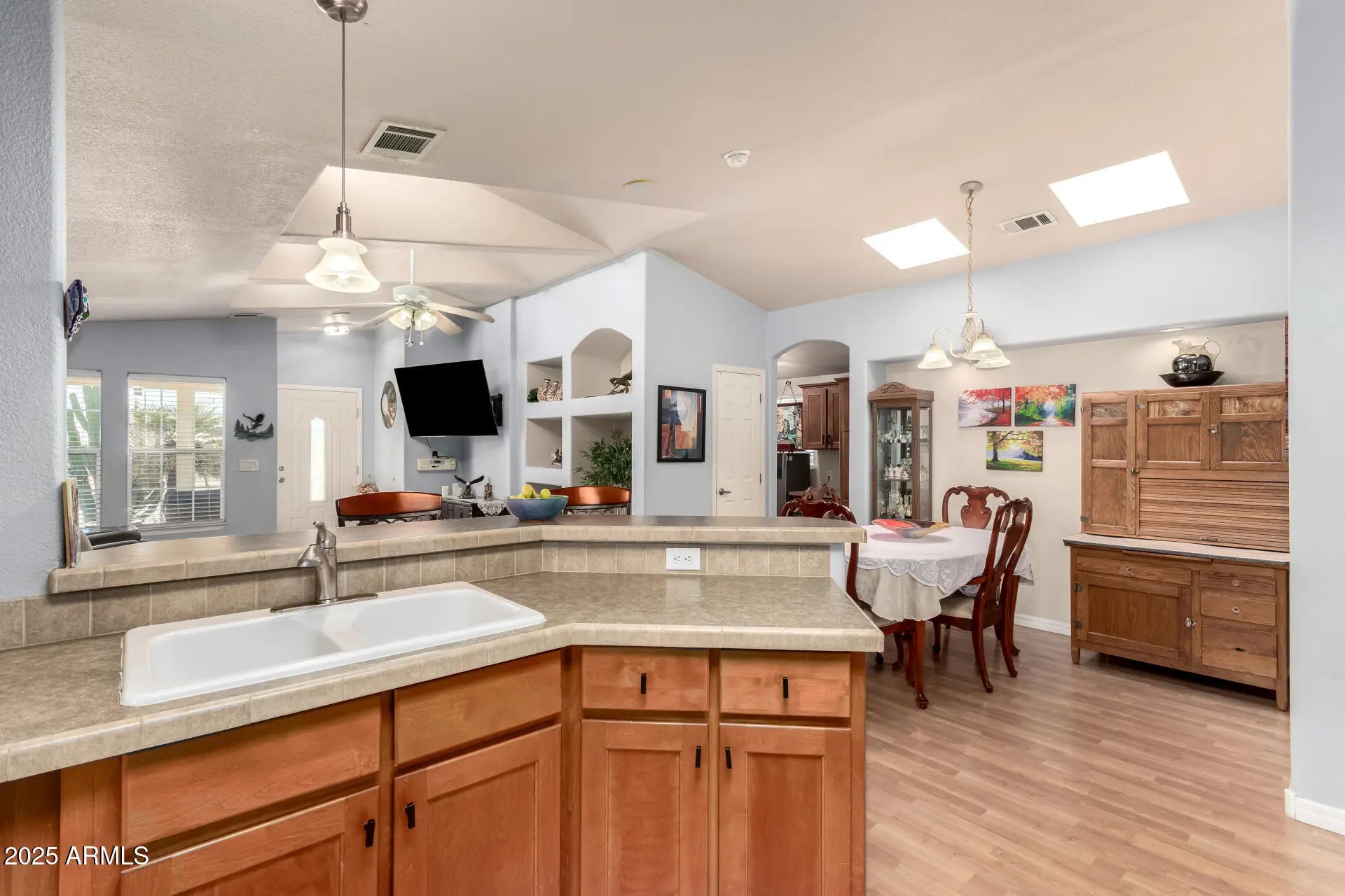The moment you step inside this home you'll immediately notice the light, openness, & thoughtful design. Skylights fill the space w/natural light, highlighting the tall, modern ceilings & low-maintenance wood look flooring. The open floor plan creates an inviting great room layout that feels even larger than it is, & the formal dining area offers plenty of room for entertaining. A major bonus is the extensive built-in cabinetry in the hall--perfect for storage, hobbies, or a quiet workspace. The large screened-in patio extends your living area outdoors, while the corner-lot location ensures added privacy w/no home directly beside you. generous walk-in closet. Additional highlights include interior laundry, a 2-car garage, and important updates such as a 1-year-old roof and new A/C in 2023. RV owners will love the ability to park your RV for free within the community. Resort-style living awaits in the prestigious 55+ community of Dolce Vita, named one of the "50 Best Active Adult Communities" by Where to Retire magazine. This guard-gated community offers a 33,000 sq. ft. Mediterranean-inspired clubhouse featuring a ballroom, library, fitness center, craft room with kiln, billiards, card room, computer center, and theater. Outdoor recreation spans seven acres and includes a heated pool, two spas, pickleball and shuffleboard courts, bocce ball, horseshoes, and a putting green. This home combines modern upgrades, privacy, and an unmatched active-adult lifestyleperfect for anyone seeking comfort, community, and resort-style living in one of Arizona's most desirable 55+ destinations. Don't miss it!