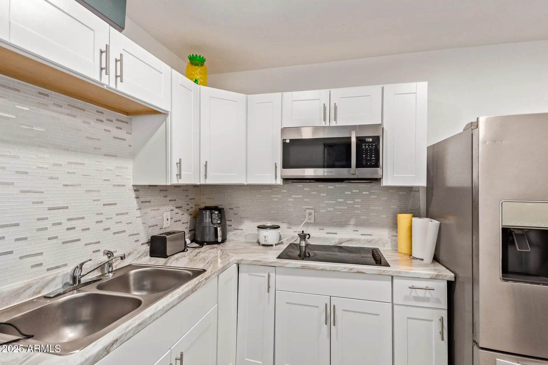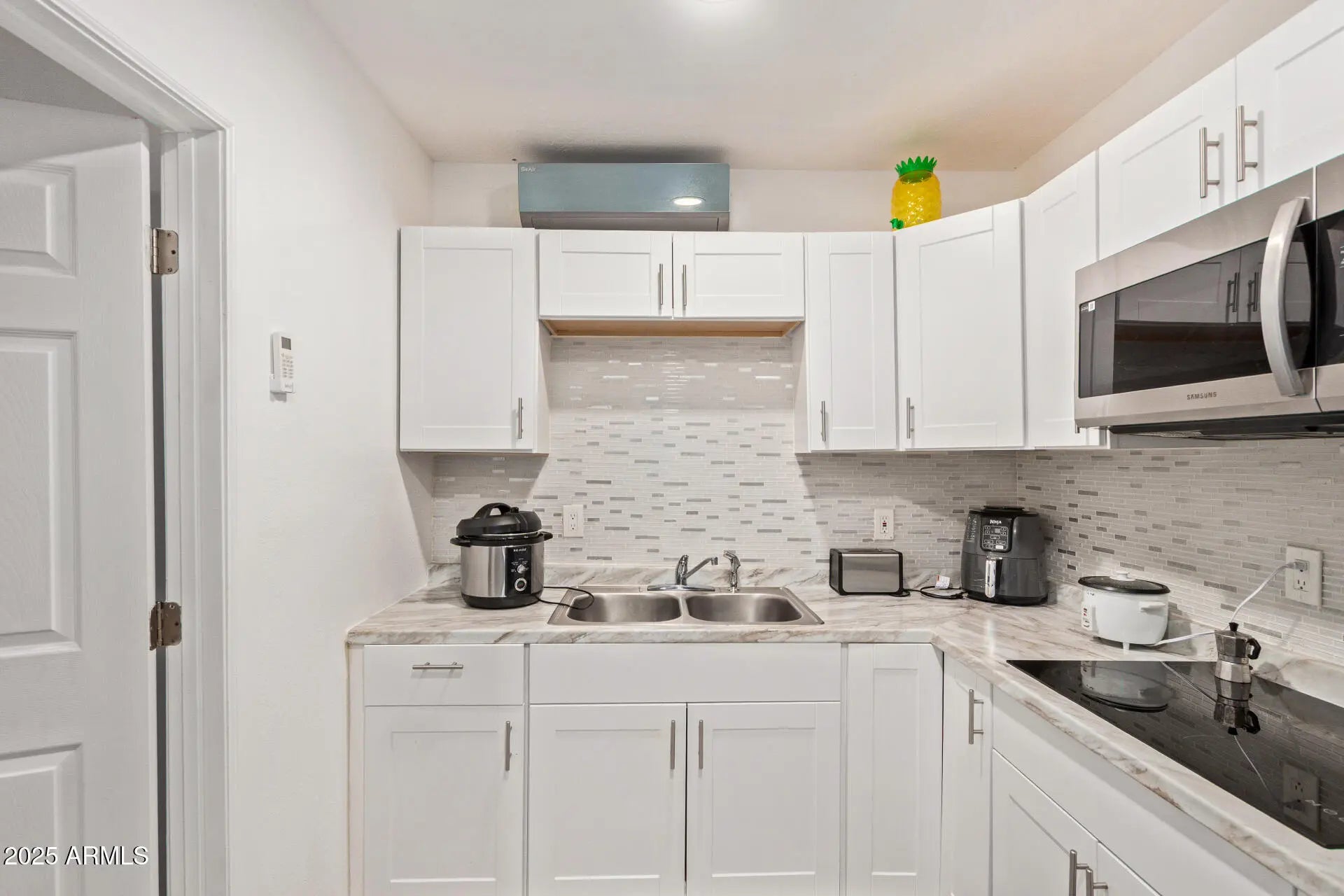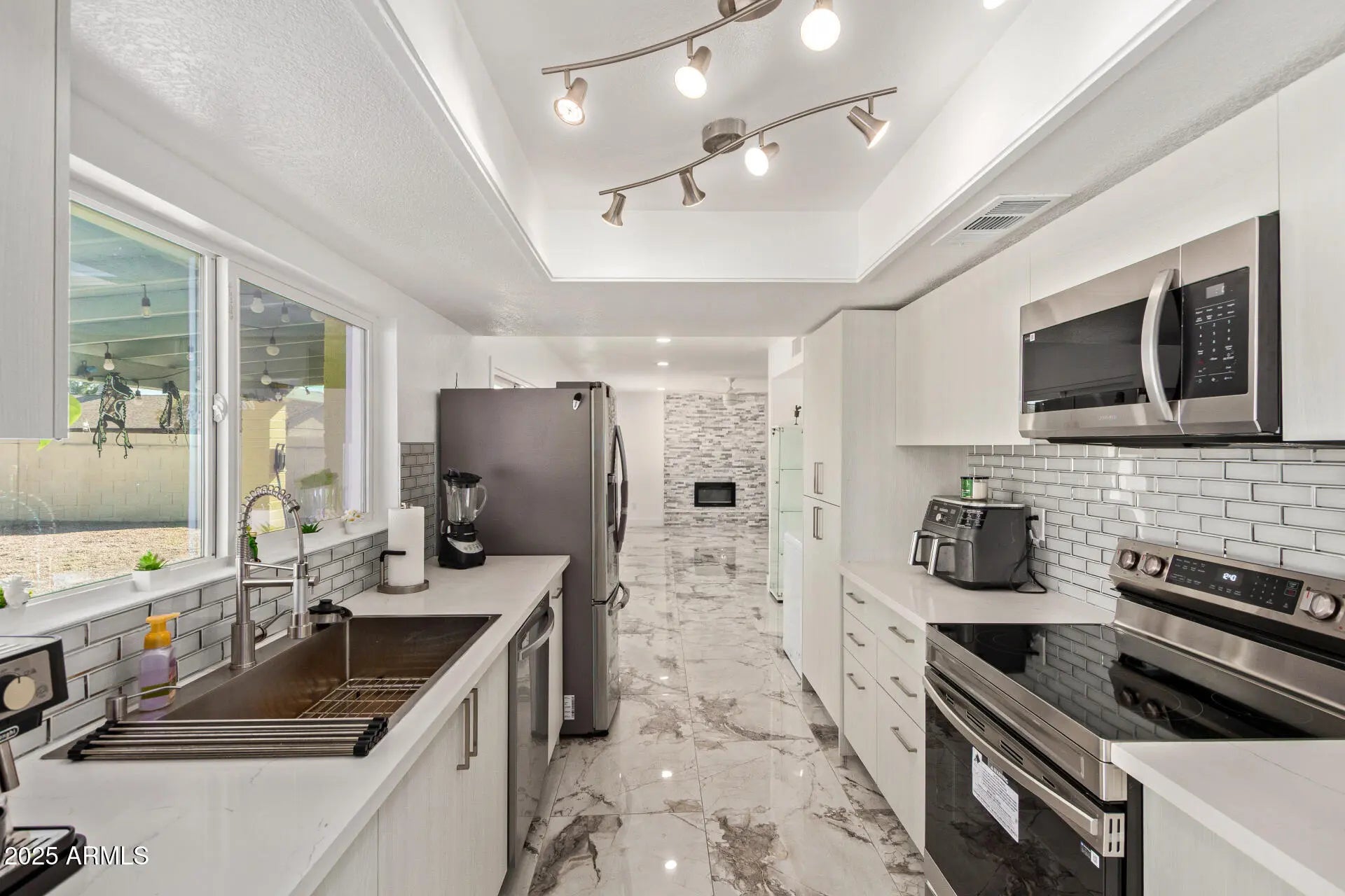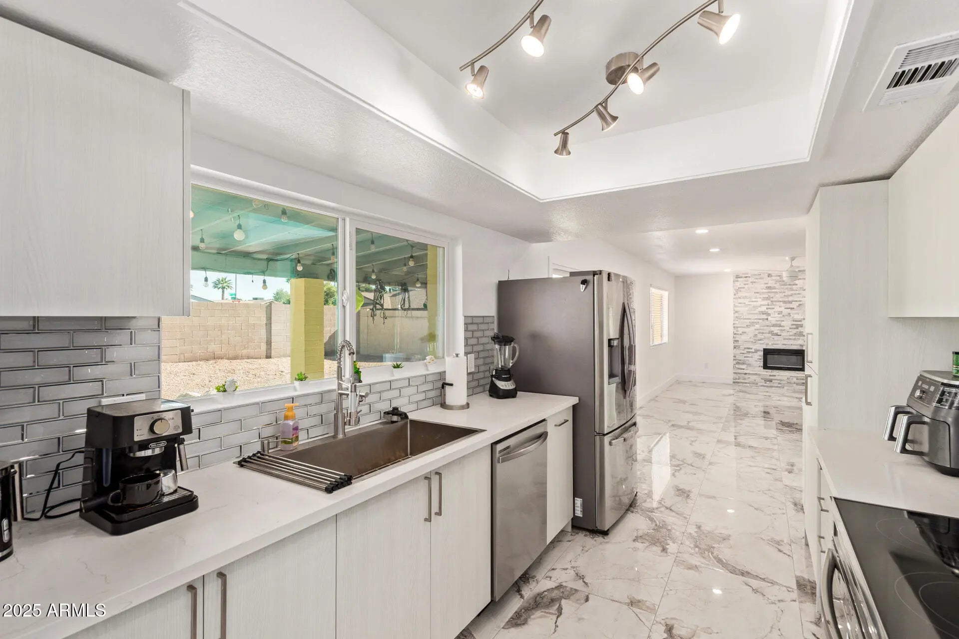 Beautifully updated 4-bedroom home, w/separate mother-in-law suite, on a corner lot! No carpet. Remodeled in 2025. Enter through the updated door to see stunning new Marble flooring throughout the home. Large bright living room, All fixtures new. Hanging and Canned lighting. Floor-to-ceiling stone fireplace. The new Kitchen has a deep stainless sink, directional sprayer, ample cabinetry, quartz countertops and subway glass backsplash tile. New stainless-steel appliances. The refrigerator stays with the home. New exterior sliding glass door and kitchen window. Separate dining area for enjoyable meals, Hall bathroom has marble everywhere, glass sliding shower door, dual flush toilet and deep ceramic sink. All bedrooms are just the right size. The primary bathroom is is covered in beautiful marble everywhere. Check out the extra-deep custom shower with rain feature, glass shower door, dual flush toilet and deep ceramic sink. The laundry room offers a new stainless washer and dryer that stay with the home. New water heater. The entire Garage with a separate entrance was converted into a 470 square foot ensuite. The kitchenette has ample cabinetry, glass insert backsplash, stainless steel appliances and glass flat top range. The Stainless steel refrigerator stays with the home. The large bedroom connects to a complete bathroom. The stackable washer and dryer are also included. Head to the backyard to encounter a long covered porch with lighting. There is a separate work shed with AC. Plenty of room for poolside furniture on the raised platform and flat concrete. Dip into the cool pool for those hot summer nights! This is going to be a great home to enjoy inside and out, don't let this slip by!
