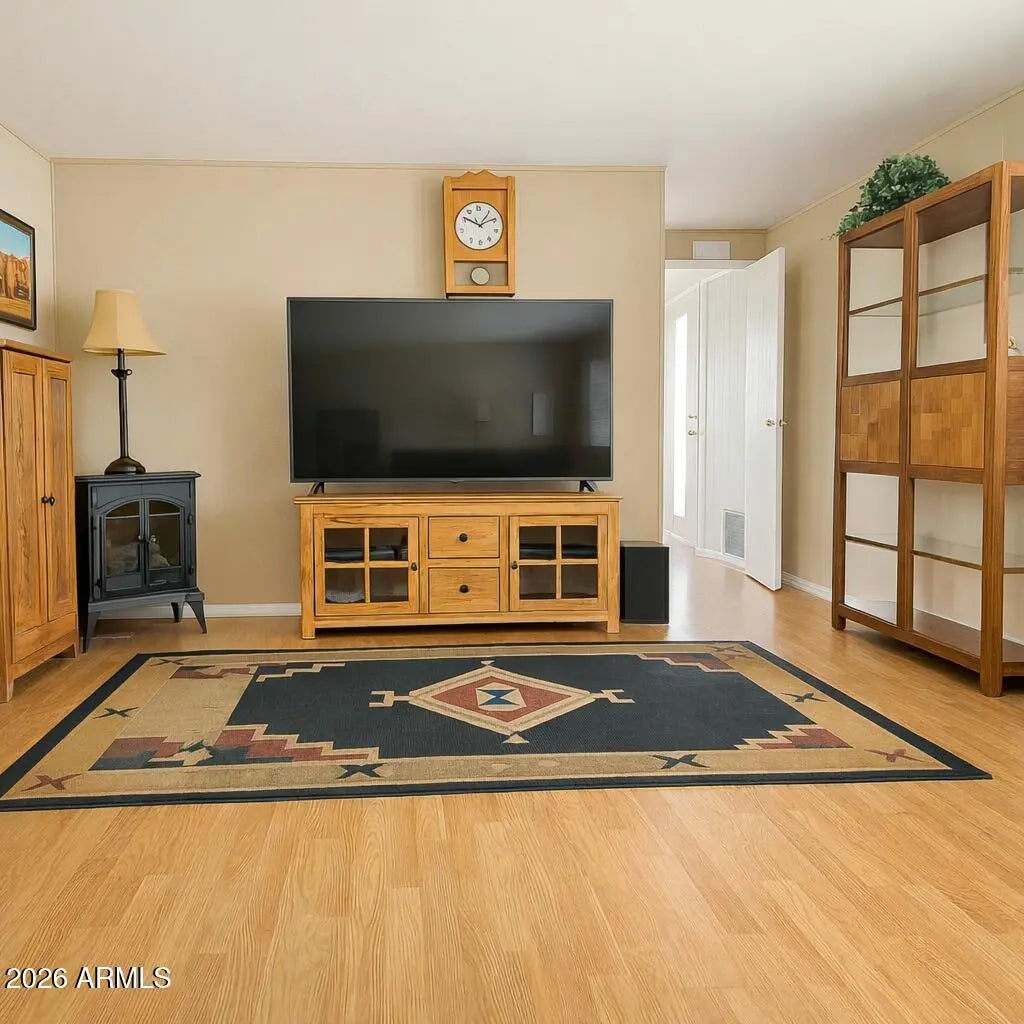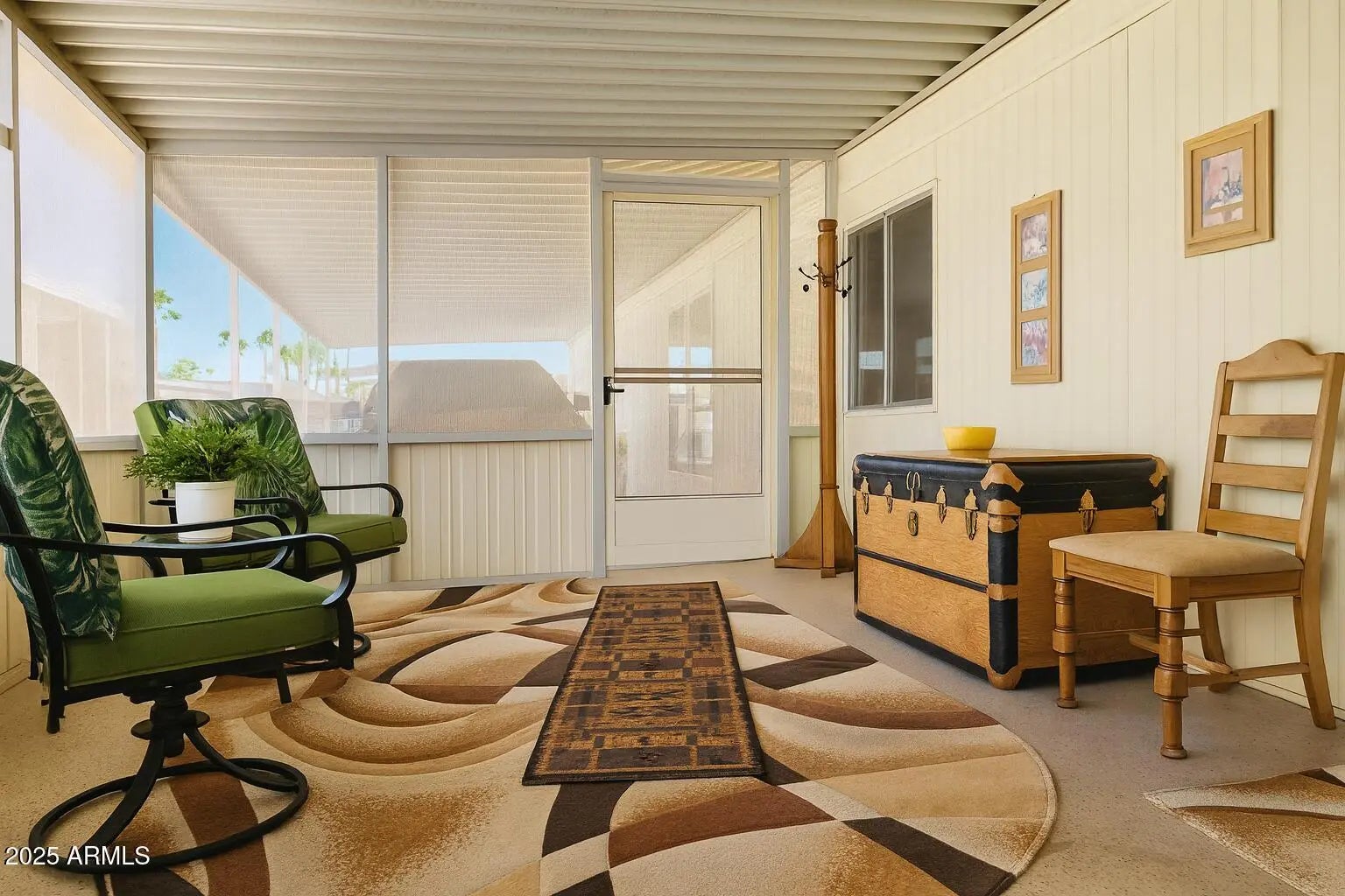 Discover comfort, style, and easy living in this well-maintained 2 bedroom, 2 bath home located in the desirable 55+ community of Holiday Palms. This inviting home offers a bright, open layout with updated touches throughout and excellent indoor/outdoor flow. Enjoy morning coffee or evening relaxation in the spacious screened-in porch — a perfect extension of your living space. The private back patio offers another peaceful area to unwind, dine outdoors, or host friends under the Arizona sky. Inside, you'll find a cozy living room, an efficient kitchen with ample cabinet space, a dining area, and two well-sized bedrooms. The outdoor storage room provides extra space for tools, hobbies, or seasonal items. Holiday Palms provides a quiet, park-like setting with community amenities.