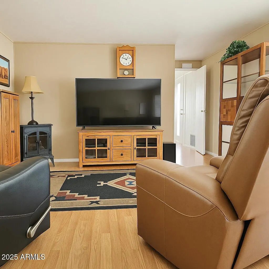 Discover comfort, style, and easy living in this well-maintained 2 bedroom, 2 bath home located in the desirable 55+ community of Holiday Palms. This inviting home offers a bright, open layout with updated touches throughout and excellent indoor/outdoor flow. Enjoy morning coffee or evening relaxation in the spacious screened-in porch — a perfect extension of your living space. The private back patio offers another peaceful area to unwind, dine outdoors, or host friends under the Arizona sky. Inside, you'll find a cozy living room, an efficient kitchen with ample cabinet space, a dining area, and two well-sized bedrooms. The outdoor storage room provides extra space for tools, hobbies, or seasonal items. Holiday Palms provides a quiet, park-like setting with community amenities and co