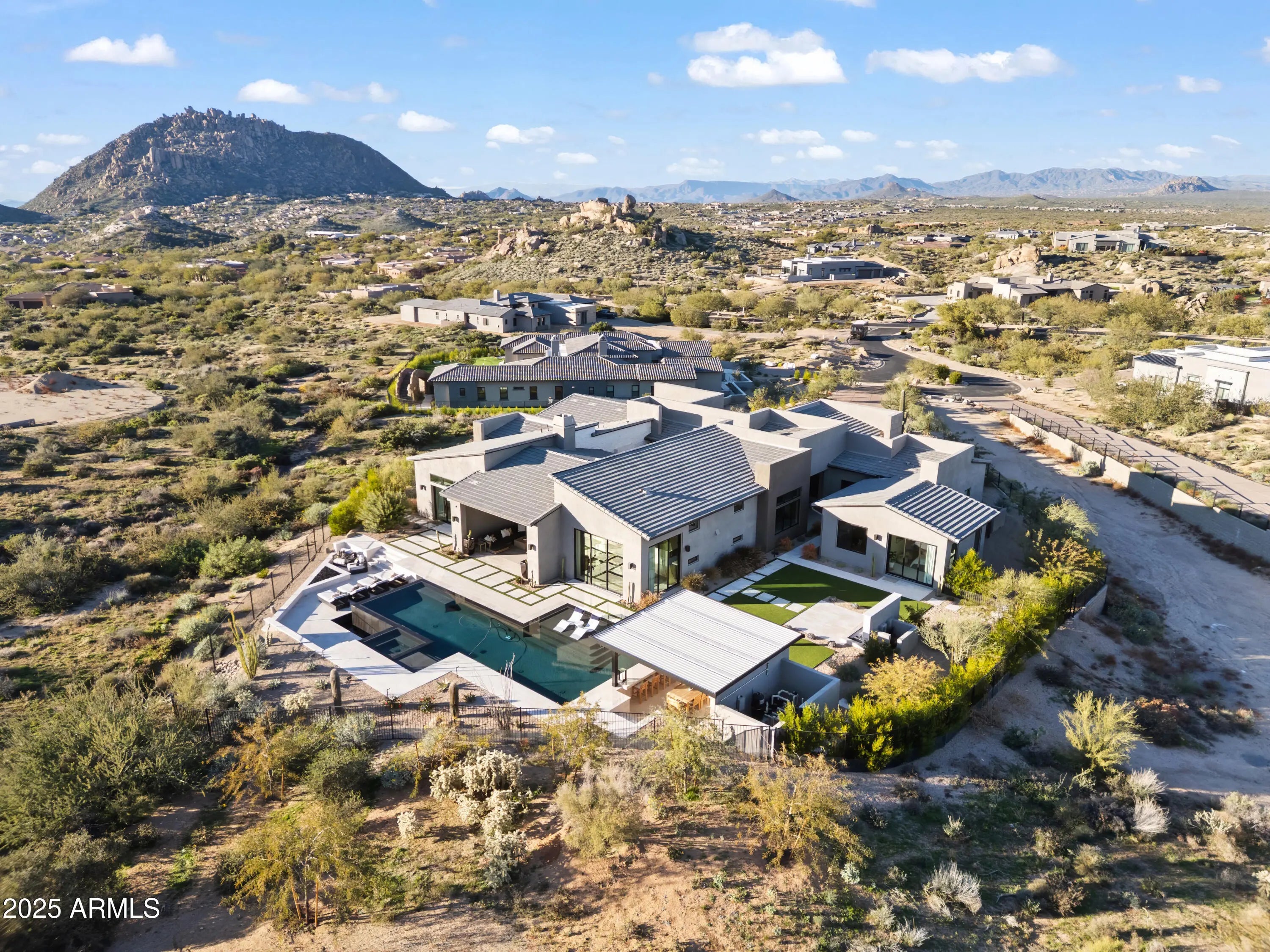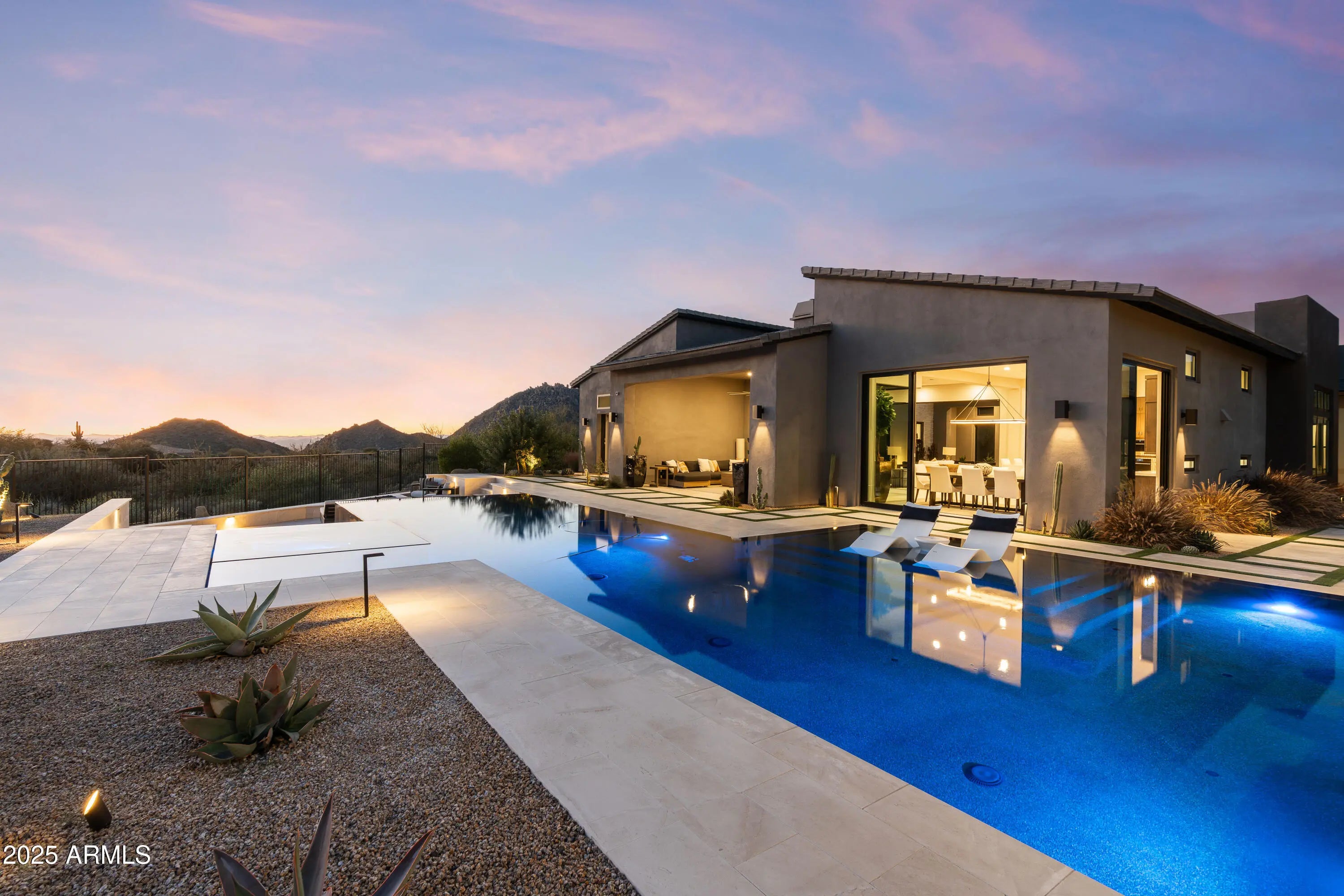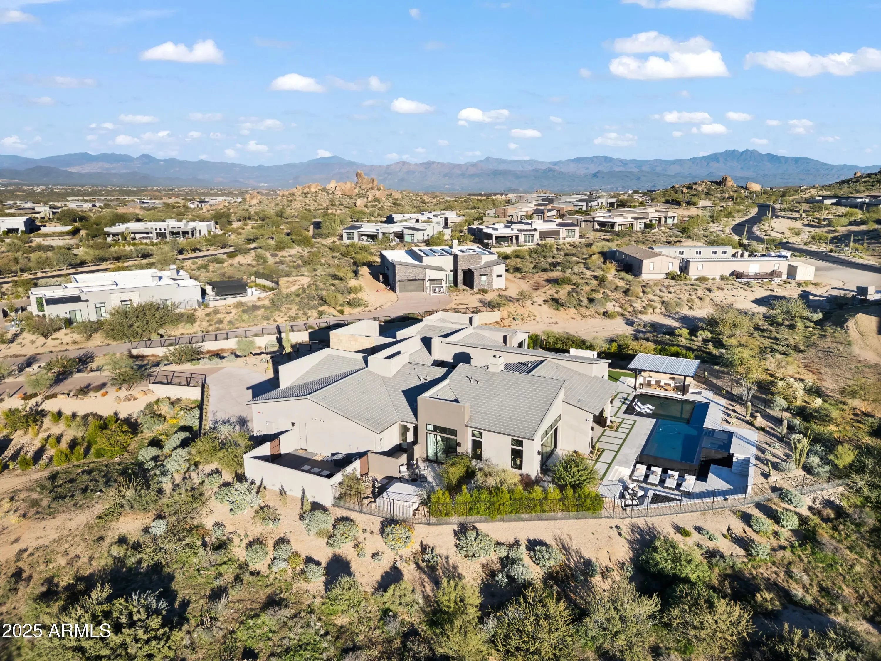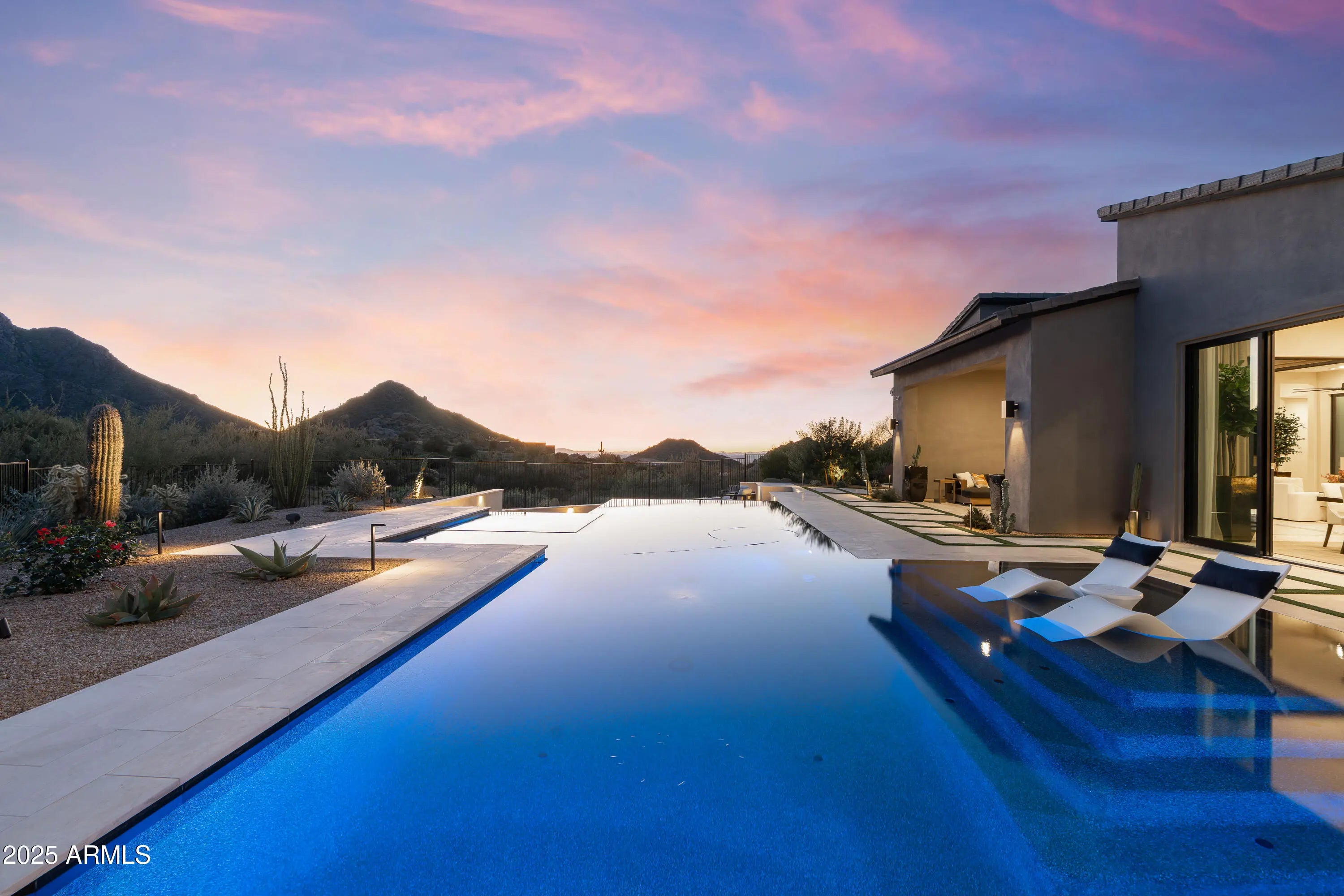 Welcome to your very own desert-resort sanctuary at 23962 N. 123rd Place, a nearly new 2024 estate in the guard-gated community of Sereno Canyon -- where breathtaking mountain vistas meet cutting-edge contemporary design for a lifestyle unlike any other in North Scottsdale. Set on a south-facing cul-de-sac, this 4,603-square-foot home offers four sumptuous ensuite bedrooms, a game room/office, a full guest home, and an expansive four-car garage -- ideal for the car enthusiast or multi-generational living. Enter through a dramatic courtyard into a residence defined by sun-soaked open spaces, 12' high ceilings, and floor to ceiling windows framing sweeping views of McDowell Mountains, Tom's Thumb, and the glittering cityscape beyond. Seamless indoor-outdoor flow is delivered via six, 10' pocketing doors between the great room and master suite, perfect for Arizona living and desert sunsets. Inside, refined finishes abound: quartzite countertops, top-of-the-line Wolf and Sub-Zero appliances, premium tile and stonework, and tasteful modern touches throughout ensure form meets function with elegance. The primary suite has been fully upgraded with limestone tile throughout, a separate sitting area w/access to a second spa, built-in cabinetry, & gorgeous tub/shower area w/multiple shower heads. But the soul of this home lies in the resort-style backyard that is a $1 million private oasis. Imagine mornings in the above-ground spa, afternoons cooling off in a zero-edge/negative-edge pool, and evenings entertaining friends at the swim-up bar. That OR you can cook with the built-in BBQ under a shaded pergola while watching the beautiful Arizona sunset, your choice! Water features, jacuzzi-style spa, firepits, outdoor shower, and sleek landscaping create a serene retreat that rivals the finest resorts. Whether you're hosting lavish gatherings, enjoying quiet family time, or simply absorbing the desert panorama with a glass of wine in hand, this home delivers a lifestyle of effortless luxury, privacy, and natural beauty. And as a resident of Sereno Canyon, you'll have access to the acclaimed Mountain House Lodge with fitness center, resort-style pools, spa services, dining and lounge facilities, and membership-style amenities that elevate everyday living into something extraordinary. This is not just a home, it's your private resort.(Furnishings are also available on separate bill of sale if you want a true turn-key property).