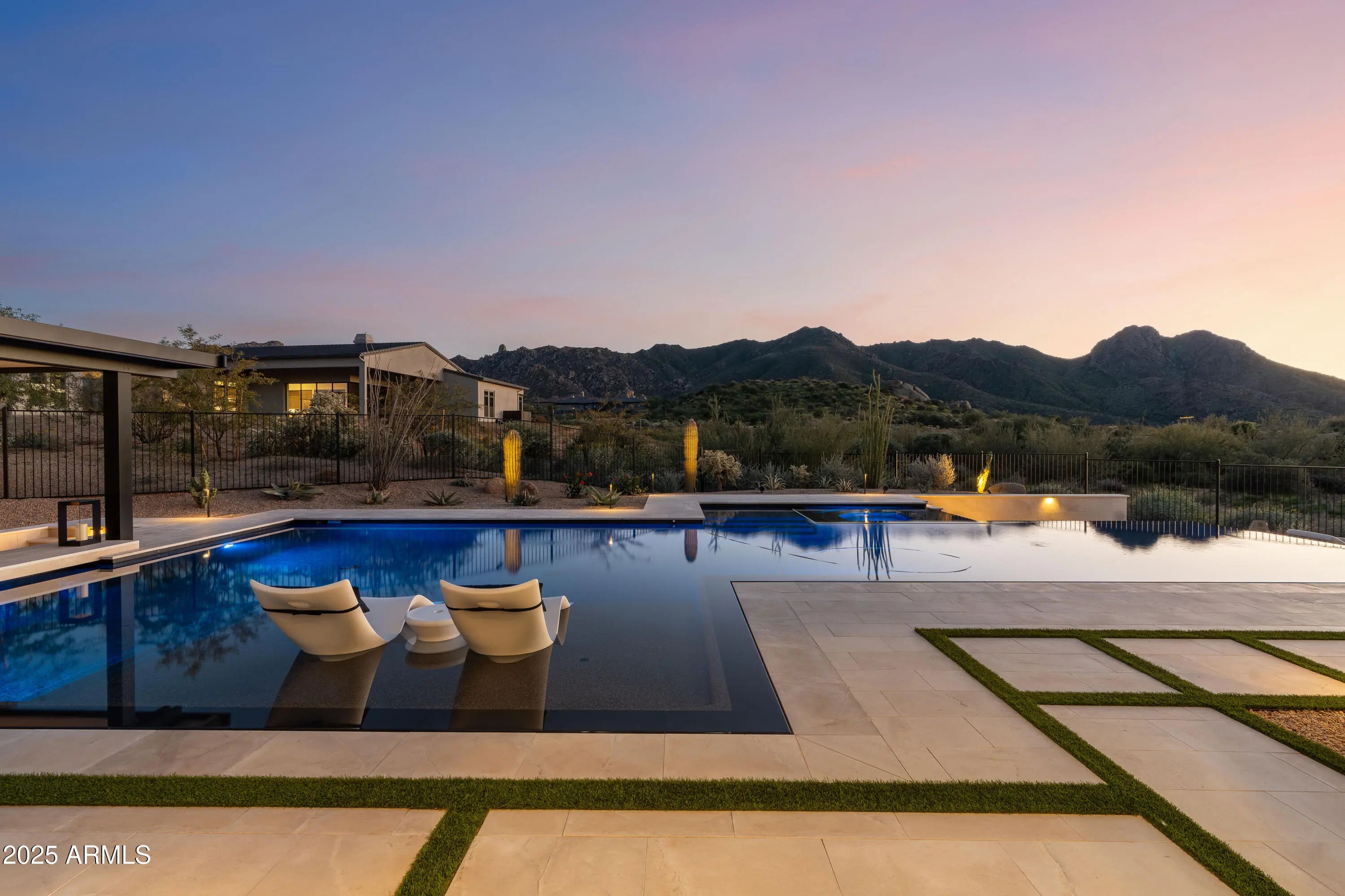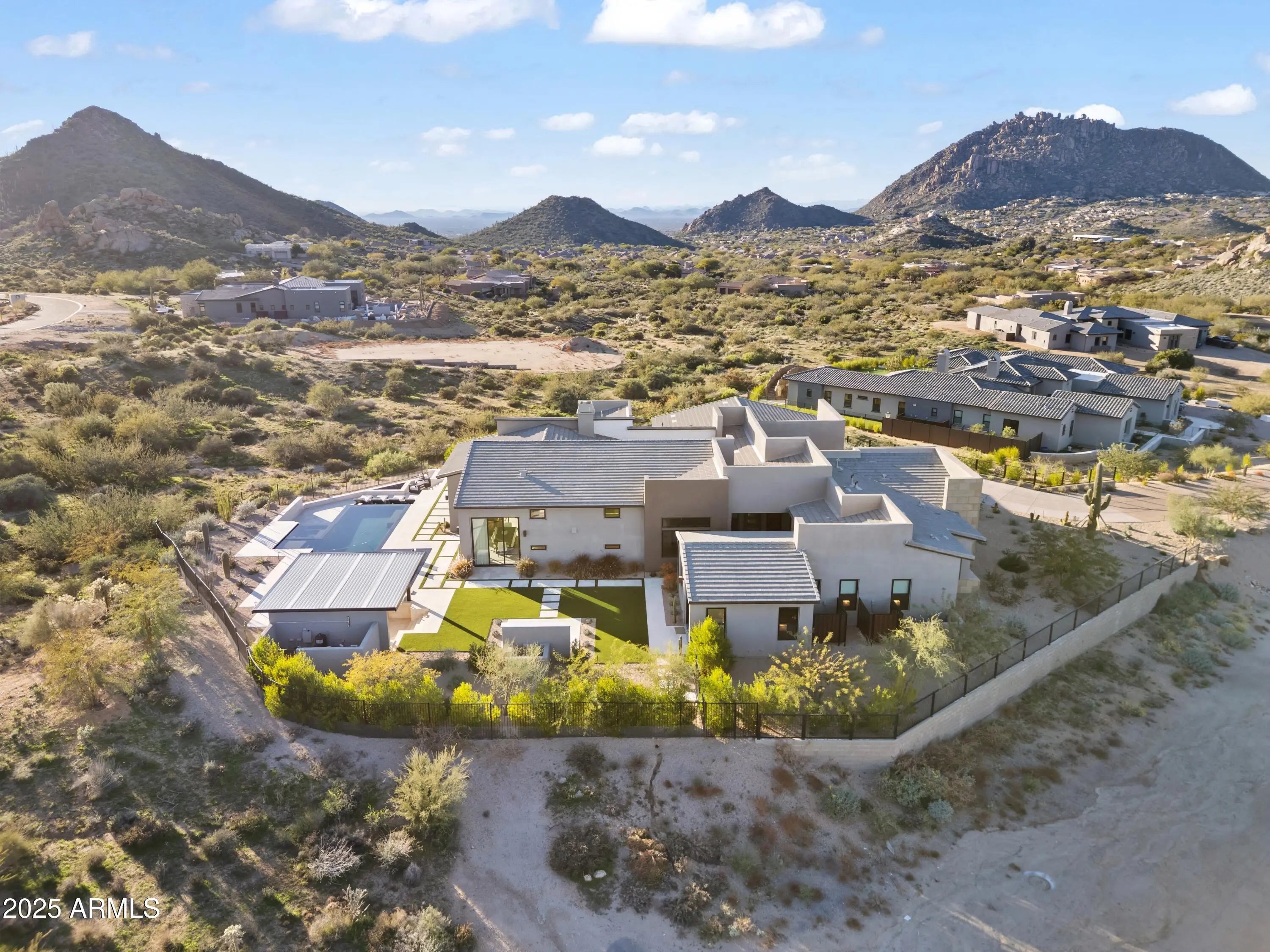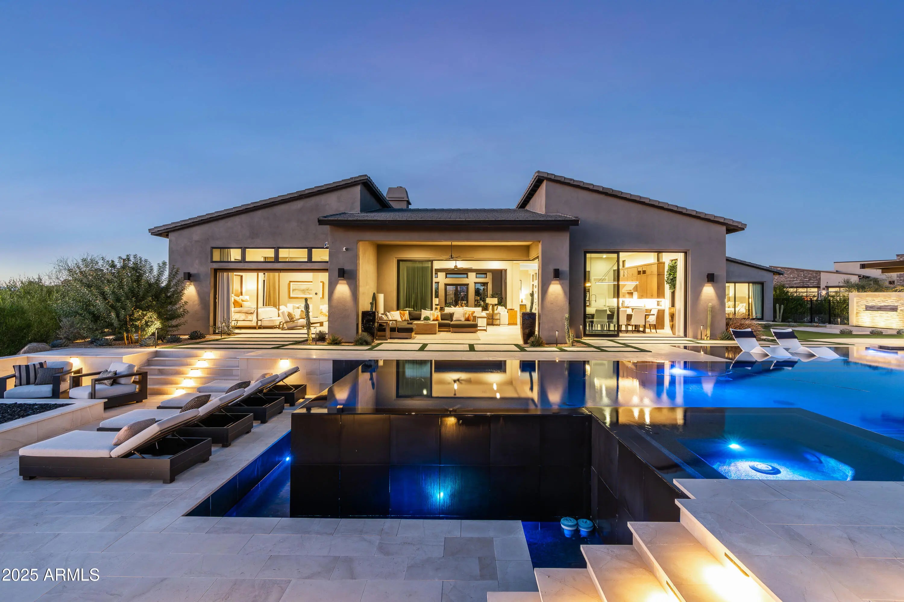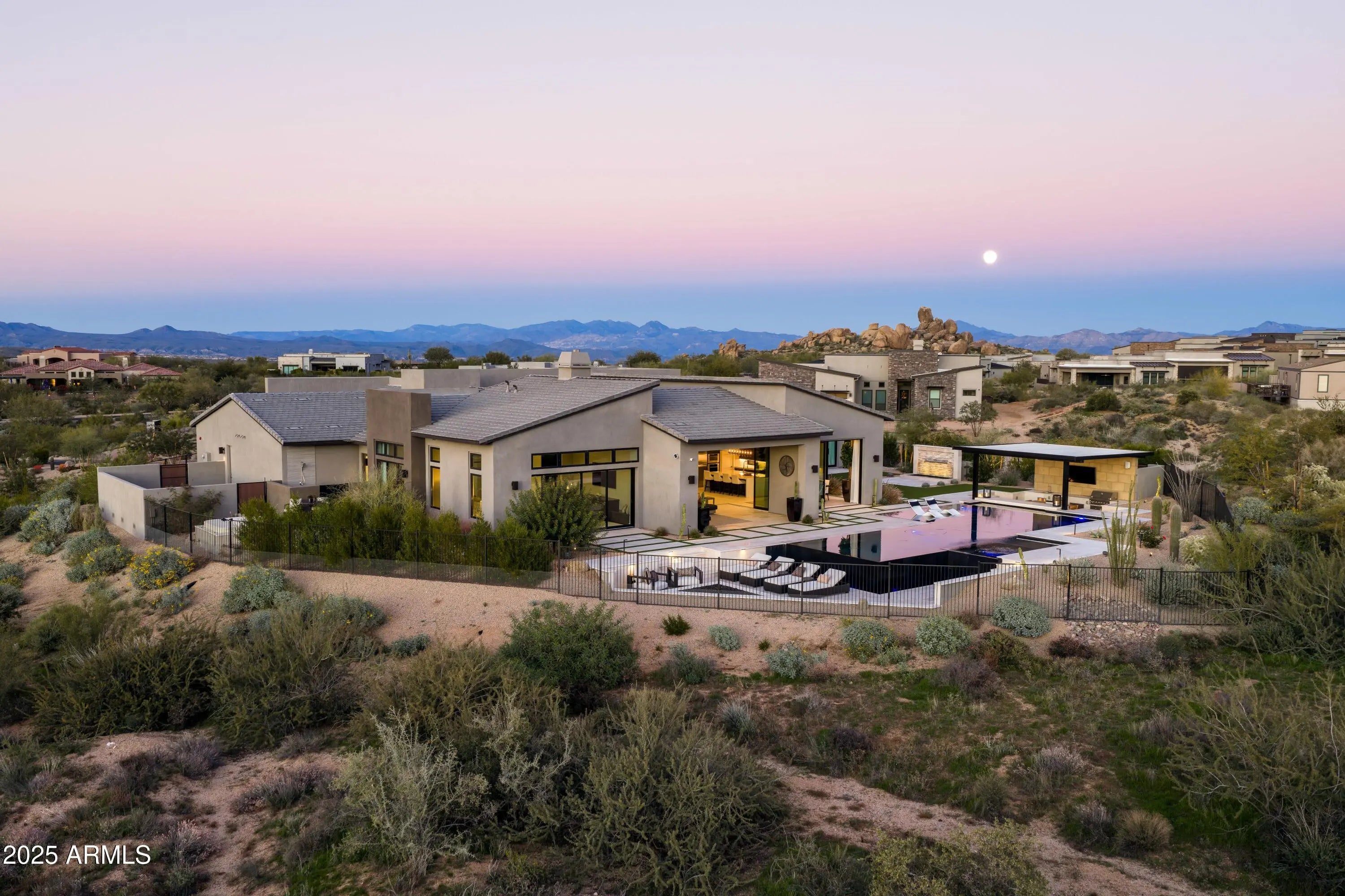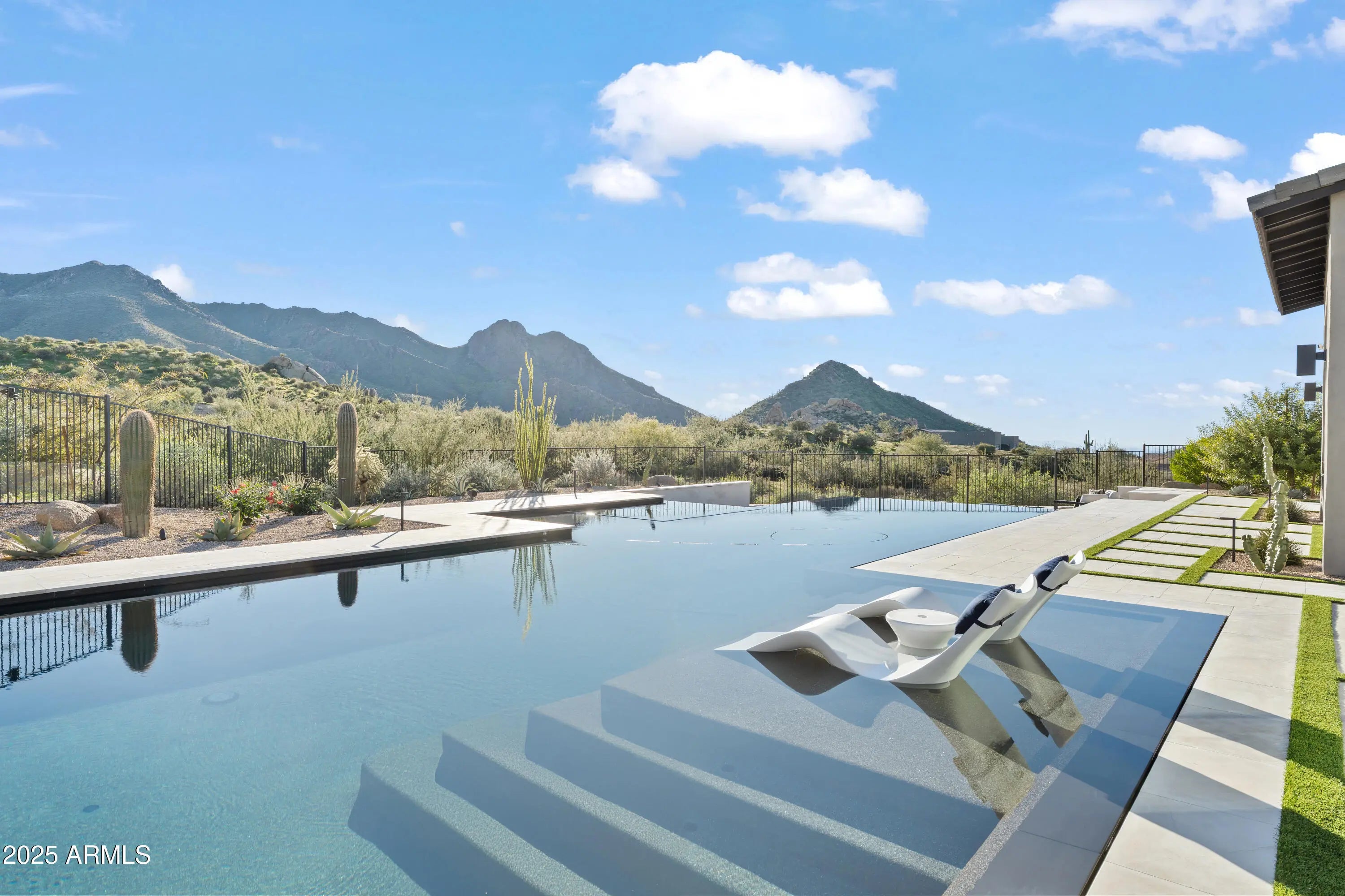 Welcome to your very own desert-resort sanctuary at 23962 N. 123rd Place, a nearly new 2024 estate in the guard-gated community of Sereno Canyon -- where breathtaking mountain vistas meet cutting-edge contemporary design for a lifestyle unlike any other in North Scottsdale. Set on a south-facing cul-de-sac, this 4,603-square-foot home offers four sumptuous ensuite bedrooms, a game room/office, a full guest home, and an expansive four-car garage -- ideal for the car enthusiast or multi-generational living. Enter through a dramatic courtyard into a residence defined by sun-soaked open spaces, 12' high ceilings, and floor to ceiling windows framing sweeping views of McDowell Mountains, Tom's Thumb, and the glittering cityscape beyond. Seamless indoor-outdoor flow is delivered via six, 10' pocketing doors between the great room and master suite, perfect for Arizona living and desert sunsets. Inside, refined finishes abound: quartzite countertops, top-of-the-line Wolf and Sub-Zero appliances, premium tile and stonework, and tasteful modern touches throughout ensure form meets function with elegance. The primary suite has been fully upgraded with limestone tile throughout, a separate sitting area w/access to a second spa, built-in cabinetry, & gorgeous tub/shower area w/multiple shower heads. But the soul of this home lies in the resort-style backyard that is a $1 million private oasis. Imagine mornings in the above-ground spa, afternoons cooling off in a zero-edge/negative-edge pool, and evenings entertaining friends at the swim-up bar. That OR you can cook with the built-in BBQ under a shaded pergola while watching the beautiful Arizona sunset, your choice! Water features, jacuzzi-style spa, firepits, outdoor shower, and sleek landscaping create a serene retreat that rivals the finest resorts. Whether you're hosting lavish gatherings, enjoying quiet family time, or simply absorbing the desert panorama with a glass of wine in hand, this home delivers a lifestyle of effortless luxury, privacy, and natural beauty. And as a resident of Sereno Canyon, you'll have access to the acclaimed Mountain House Lodge with fitness center, resort-style pools, spa services, dining and lounge facilities, and membership-style amenities that elevate everyday living into something extraordinary. This is not just a home, it's your private resort.(Furnishings are also available on separate bill of sale if you want a true turn-key property).