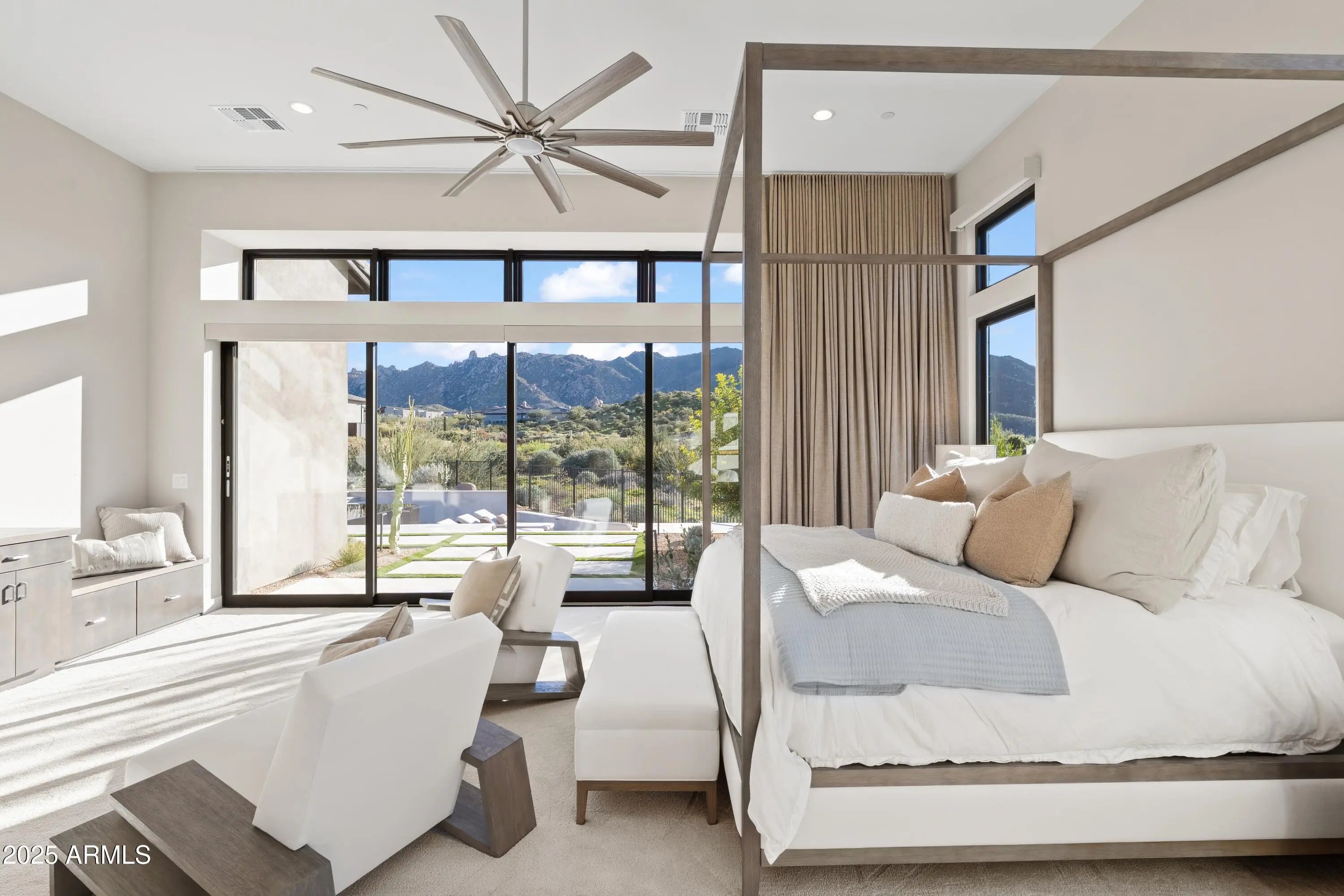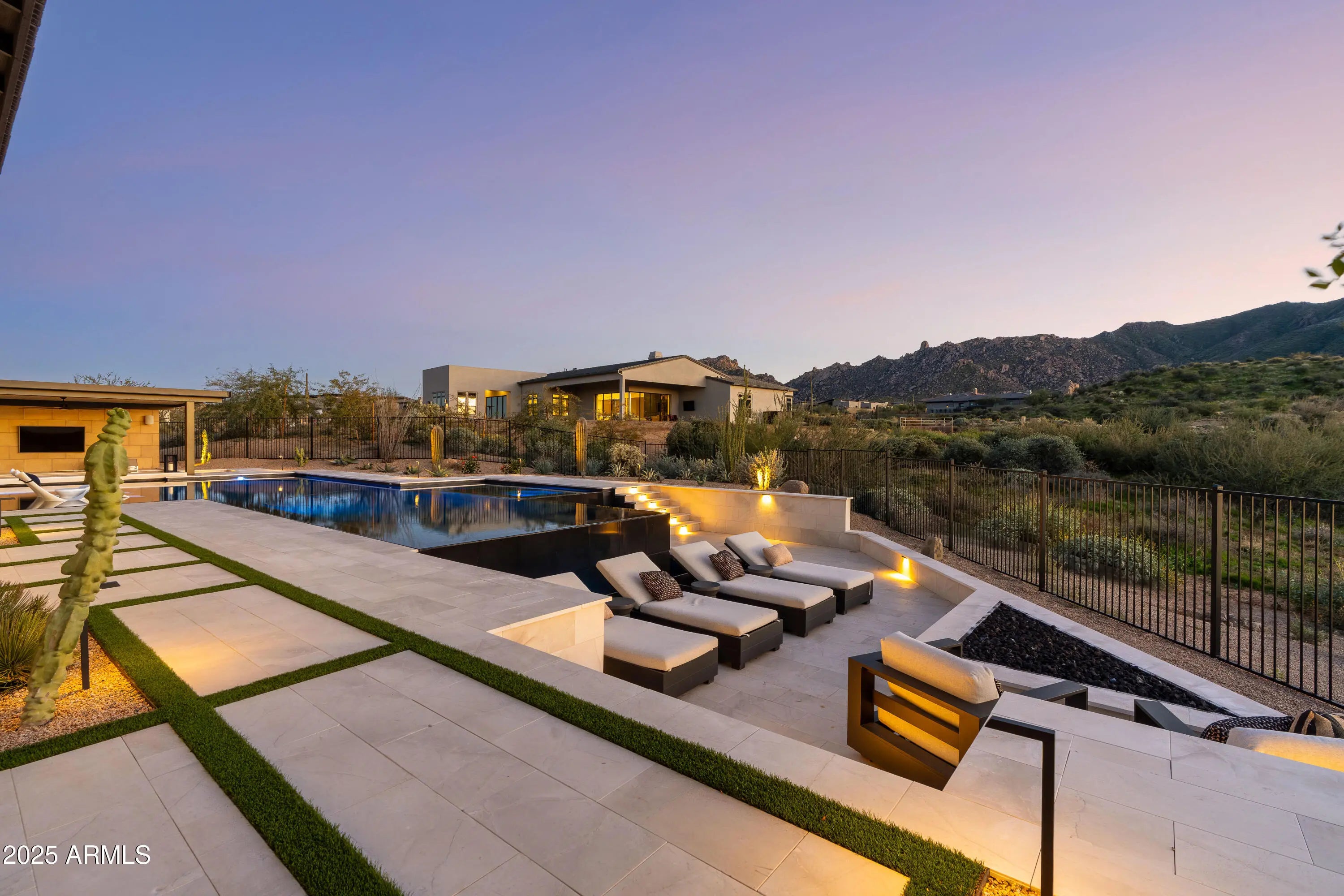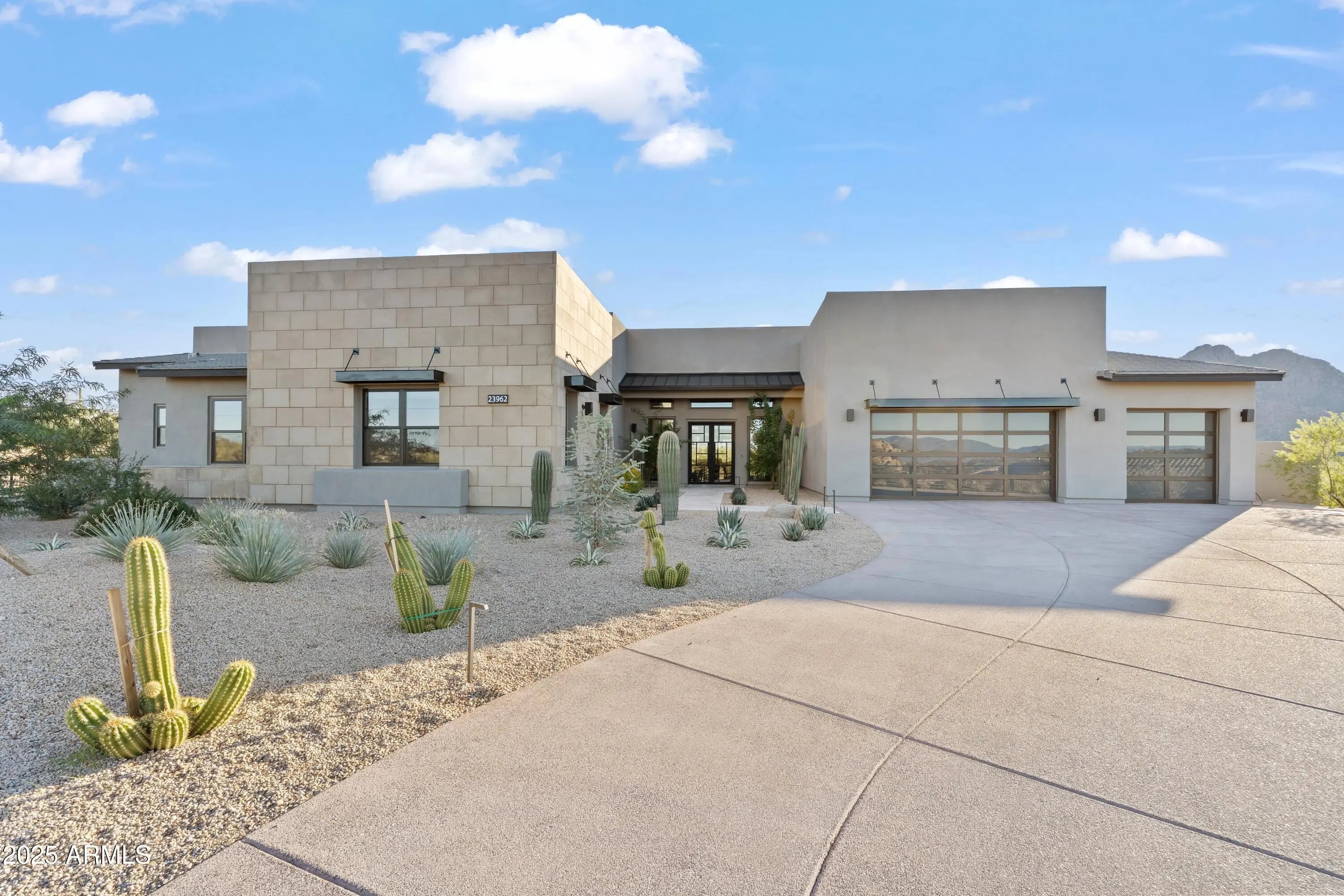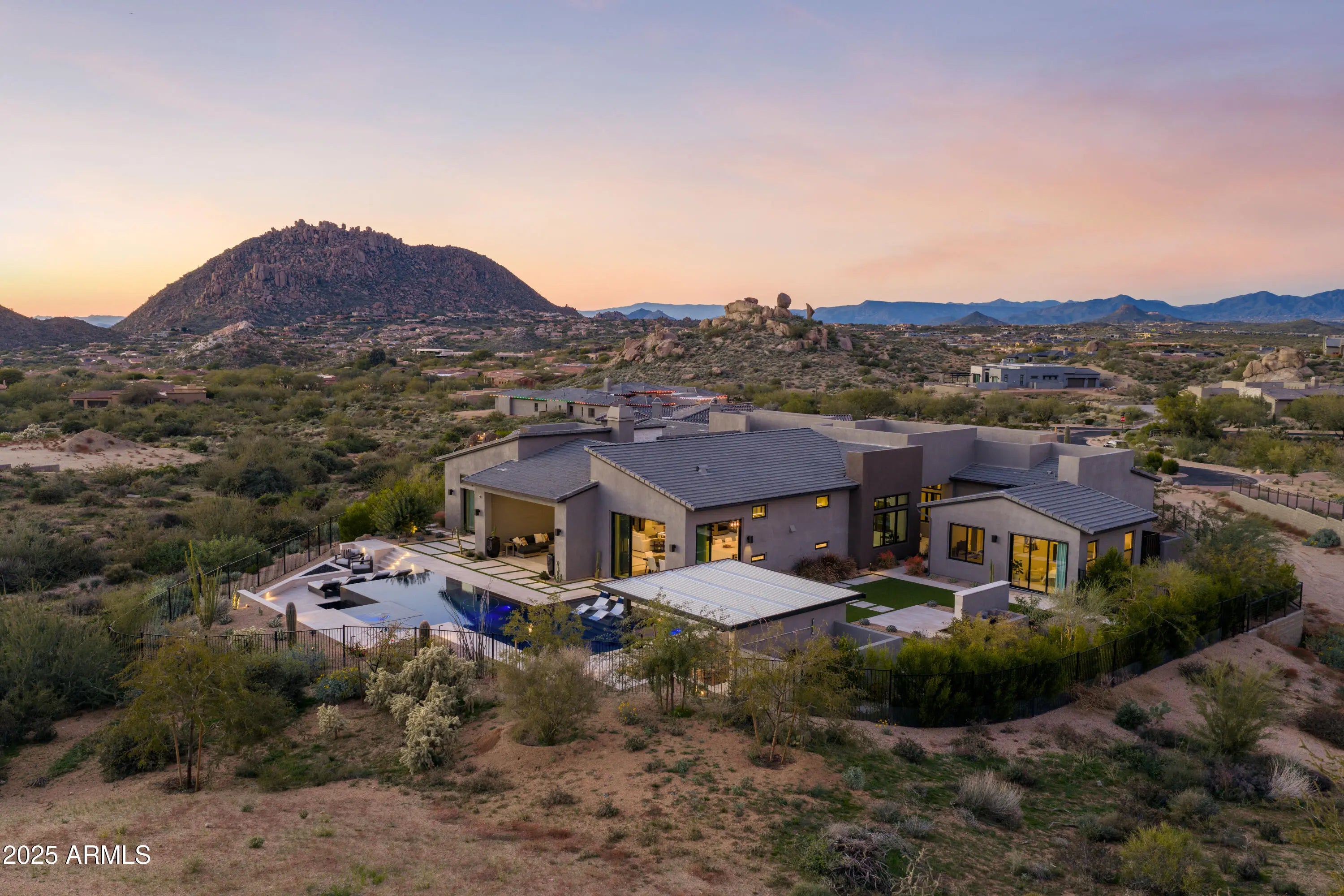 Welcome to your very own desert-resort sanctuary at 23962 N. 123rd Place, a nearly new 2024 estate in the guard-gated community of Sereno Canyon -- where breathtaking mountain vistas meet cutting-edge contemporary design for a lifestyle unlike any other in North Scottsdale. Set on a south-facing cul-de-sac, this 4,603-square-foot home offers four sumptuous ensuite bedrooms, a game room/office, a full guest home, and an expansive four-car garage -- ideal for the car enthusiast or multi-generational living. Enter through a dramatic courtyard into a residence defined by sun-soaked open spaces, 12' high ceilings, and floor to ceiling windows framing sweeping views of McDowell Mountains, Tom's Thumb, and the glittering cityscape beyond. Seamless indoor-outdoor flow is delivered via six, 10' pocketing doors between the great room and master suite, perfect for Arizona living and desert sunsets. Inside, refined finishes abound: quartzite countertops, top-of-the-line Wolf and Sub-Zero appliances, premium tile and stonework, and tasteful modern touches throughout ensure form meets function with elegance. The primary suite has been fully upgraded with limestone tile throughout, a separate sitting area w/access to a second spa, built-in cabinetry, & gorgeous tub/shower area w/multiple shower heads. But the soul of this home lies in the resort-style backyard that is a $1 million private oasis. Imagine mornings in the above-ground spa, afternoons cooling off in a zero-edge/negative-edge pool, and evenings entertaining friends at the swim-up bar. That OR you can cook with the built-in BBQ under a shaded pergola while watching the beautiful Arizona sunset, your choice! Water features, jacuzzi-style spa, firepits, outdoor shower, and sleek landscaping create a serene retreat that rivals the finest resorts. Whether you're hosting lavish gatherings, enjoying quiet family time, or simply absorbing the desert panorama with a glass of wine in hand, this home delivers a lifestyle of effortless luxury, privacy, and natural beauty. And as a resident of Sereno Canyon, you'll have access to the acclaimed Mountain House Lodge with fitness center, resort-style pools, spa services, dining and lounge facilities, and membership-style amenities that elevate everyday living into something extraordinary. This is not just a home, it's your private resort.(Furnishings are also available on separate bill of sale if you want a true turn-key property).