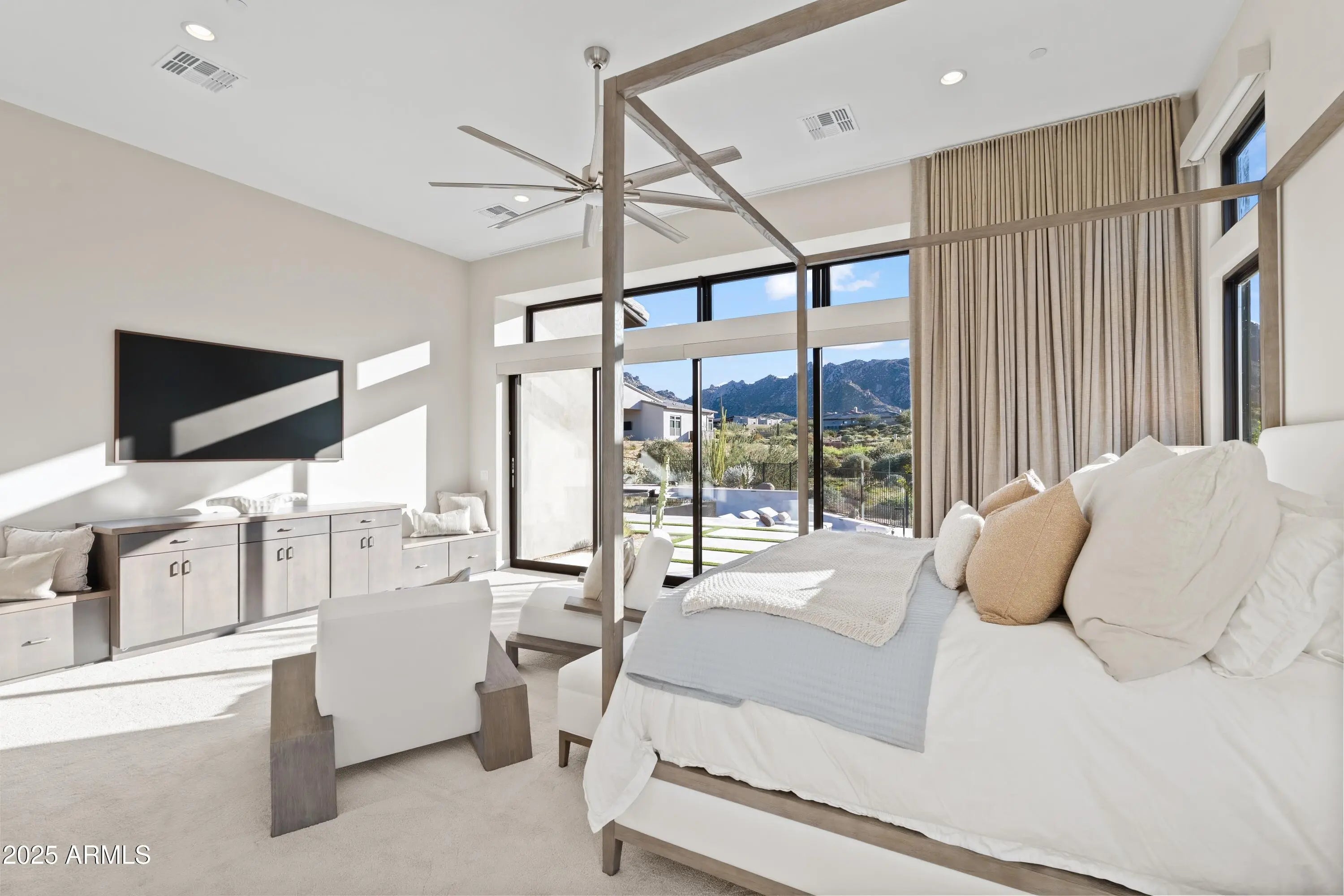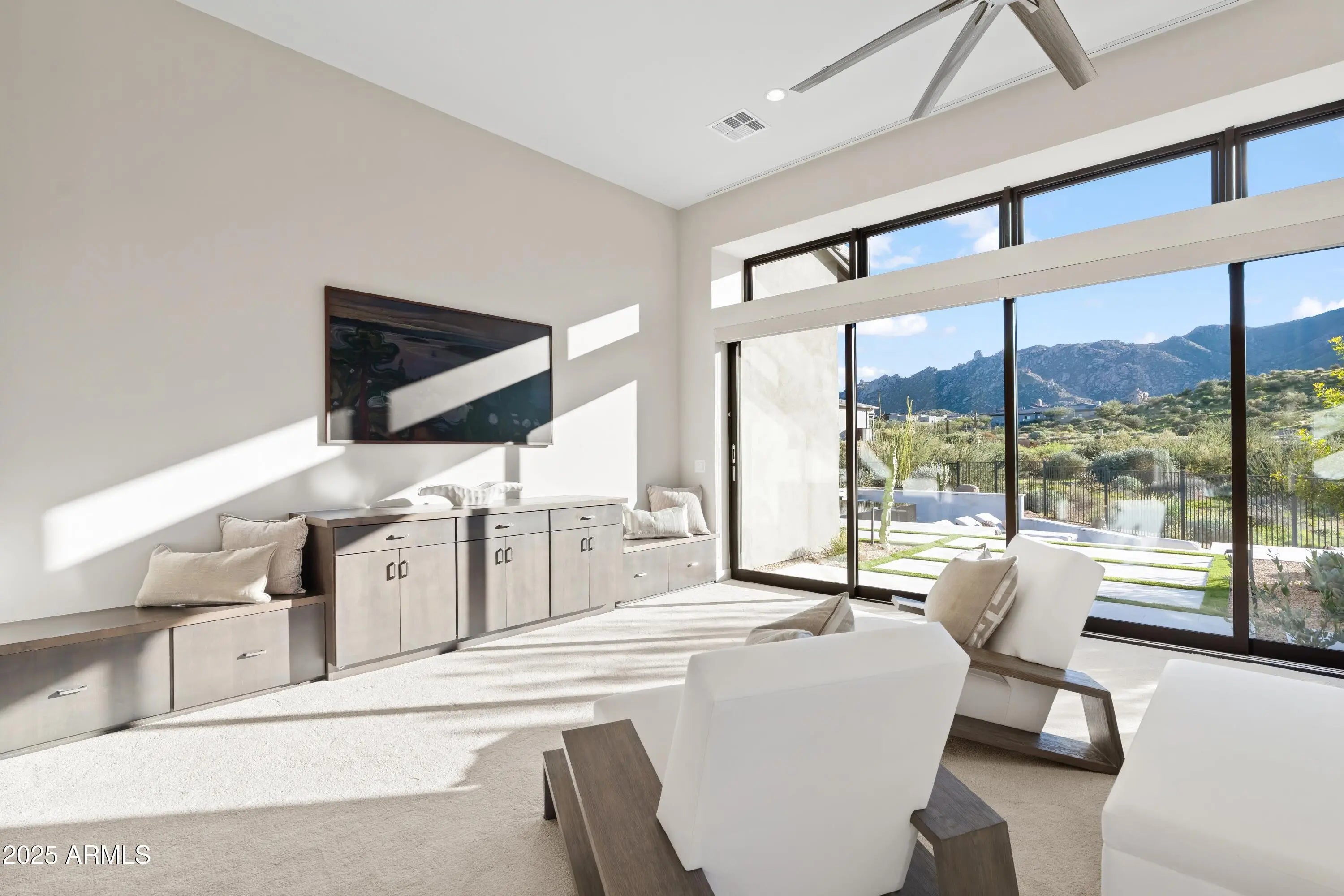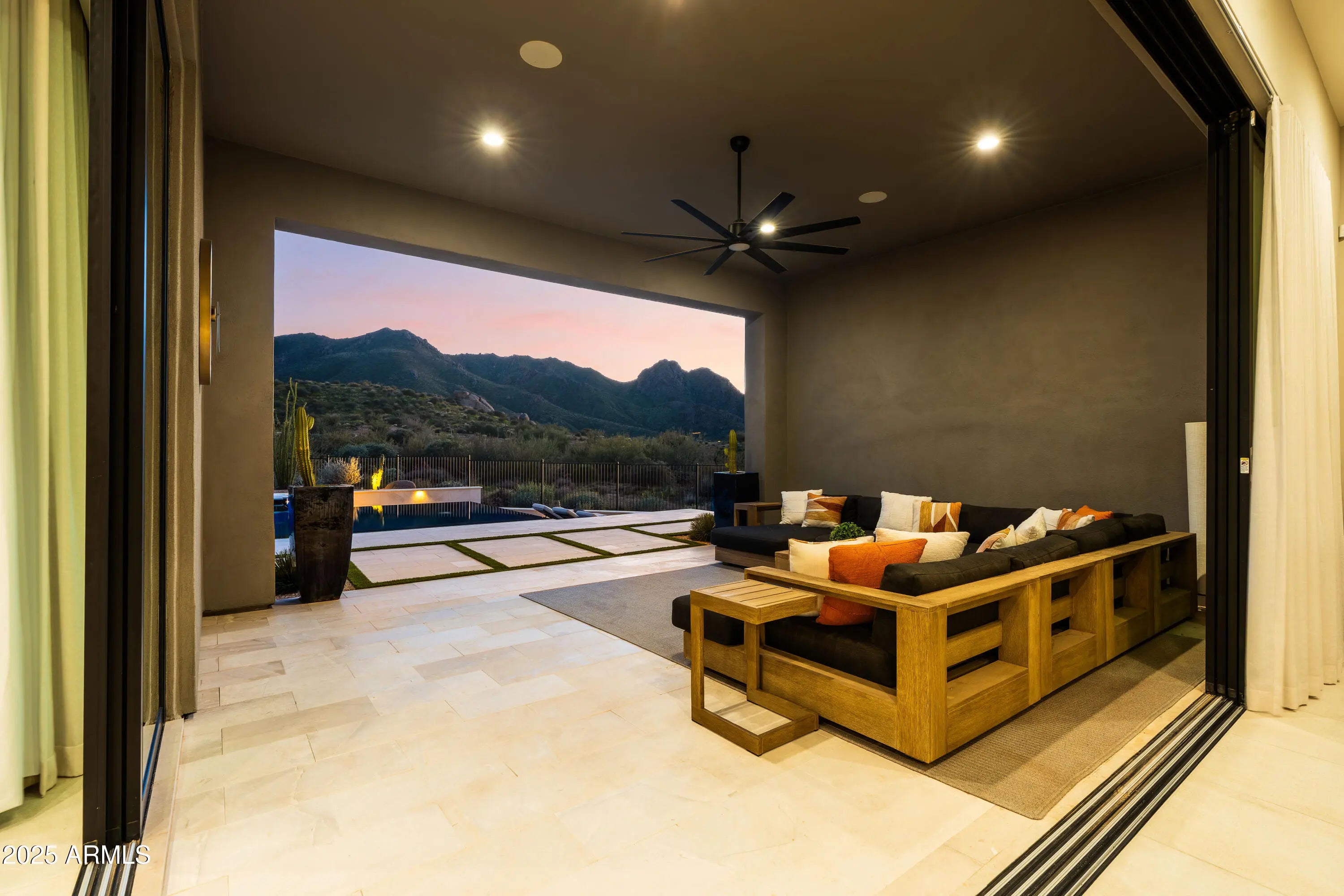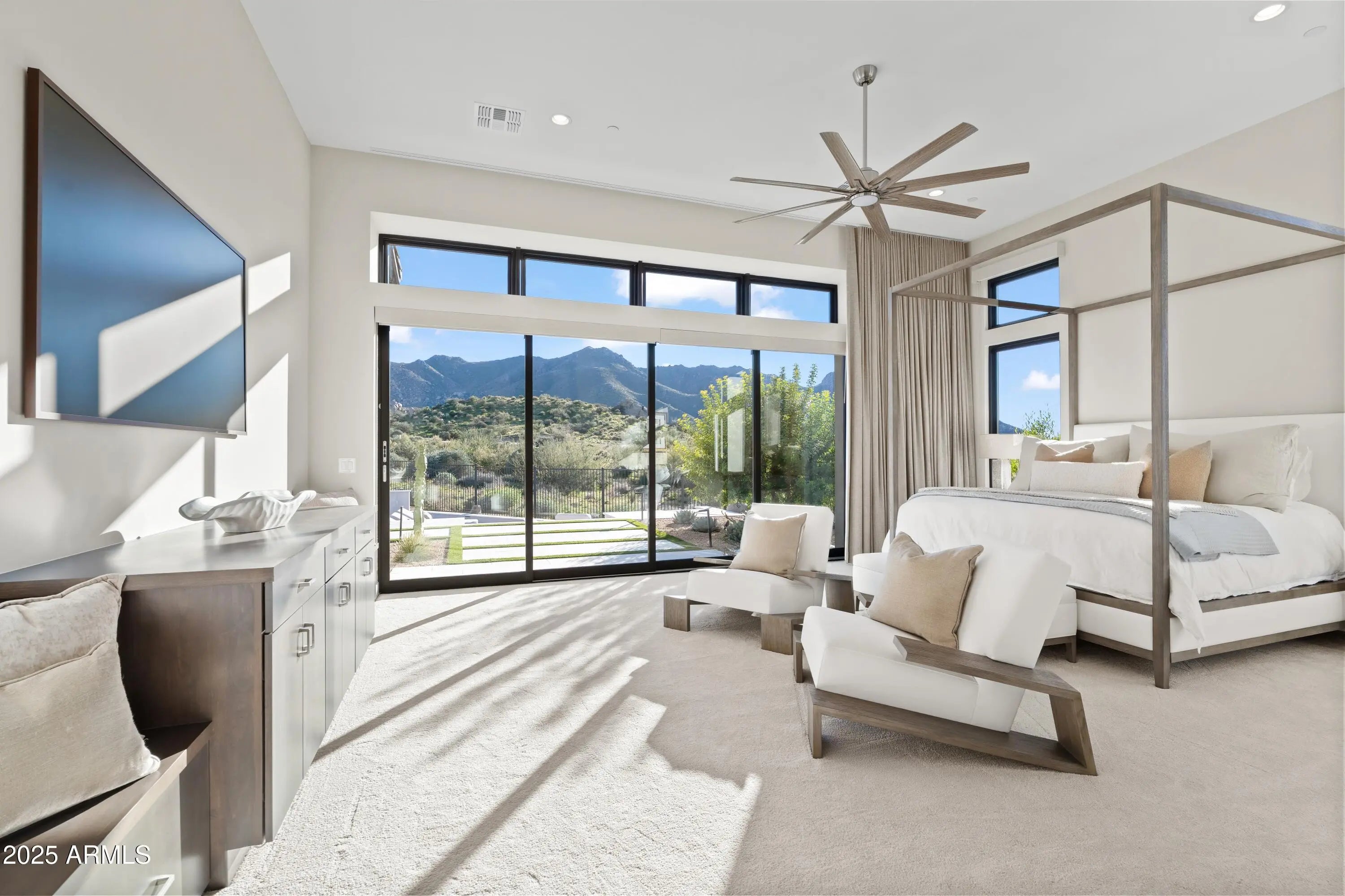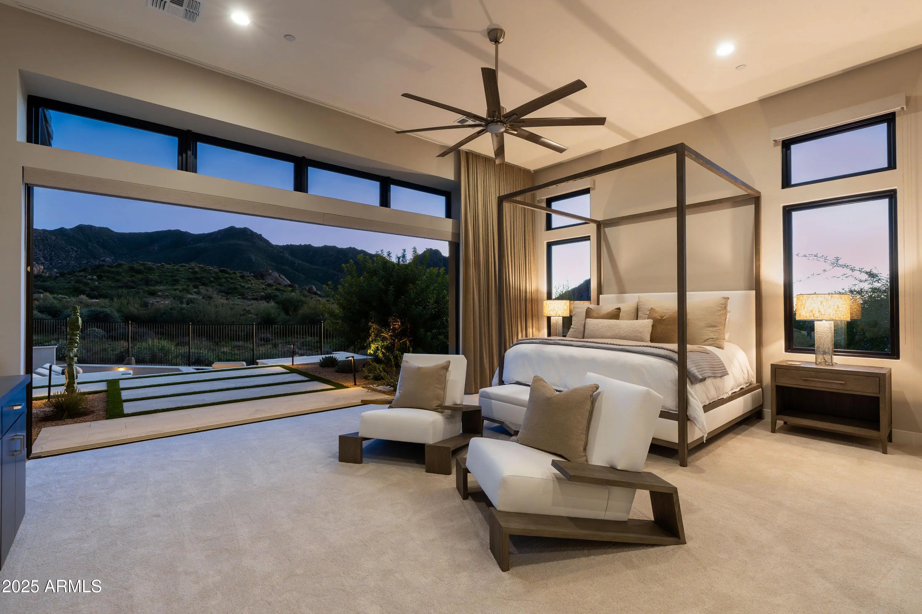 Welcome to your very own desert-resort sanctuary at 23962 N. 123rd Place, a nearly new 2024 estate in the guard-gated community of Sereno Canyon -- where breathtaking mountain vistas meet cutting-edge contemporary design for a lifestyle unlike any other in North Scottsdale. Set on a south-facing cul-de-sac, this 4,603-square-foot home offers four sumptuous ensuite bedrooms, a game room/office, a full guest home, and an expansive four-car garage -- ideal for the car enthusiast or multi-generational living. Enter through a dramatic courtyard into a residence defined by sun-soaked open spaces, 12' high ceilings, and floor to ceiling windows framing sweeping views of McDowell Mountains, Tom's Thumb, and the glittering cityscape beyond. Seamless indoor-outdoor flow is delivered via six, 10' pocketing doors between the great room and master suite, perfect for Arizona living and desert sunsets. Inside, refined finishes abound: quartzite countertops, top-of-the-line Wolf and Sub-Zero appliances, premium tile and stonework, and tasteful modern touches throughout ensure form meets function with elegance. The primary suite has been fully upgraded with limestone tile throughout, a separate sitting area w/access to a second spa, built-in cabinetry, & gorgeous tub/shower area w/multiple shower heads. But the soul of this home lies in the resort-style backyard that is a $1 million private oasis. Imagine mornings in the above-ground spa, afternoons cooling off in a zero-edge/negative-edge pool, and evenings entertaining friends at the swim-up bar. That OR you can cook with the built-in BBQ under a shaded pergola while watching the beautiful Arizona sunset, your choice! Water features, jacuzzi-style spa, firepits, outdoor shower, and sleek landscaping create a serene retreat that rivals the finest resorts. Whether you're hosting lavish gatherings, enjoying quiet family time, or simply absorbing the desert panorama with a glass of wine in hand, this home delivers a lifestyle of effortless luxury, privacy, and natural beauty. And as a resident of Sereno Canyon, you'll have access to the acclaimed Mountain House Lodge with fitness center, resort-style pools, spa services, dining and lounge facilities, and membership-style amenities that elevate everyday living into something extraordinary. This is not just a home, it's your private resort.(Furnishings are also available on separate bill of sale if you want a true turn-key property).