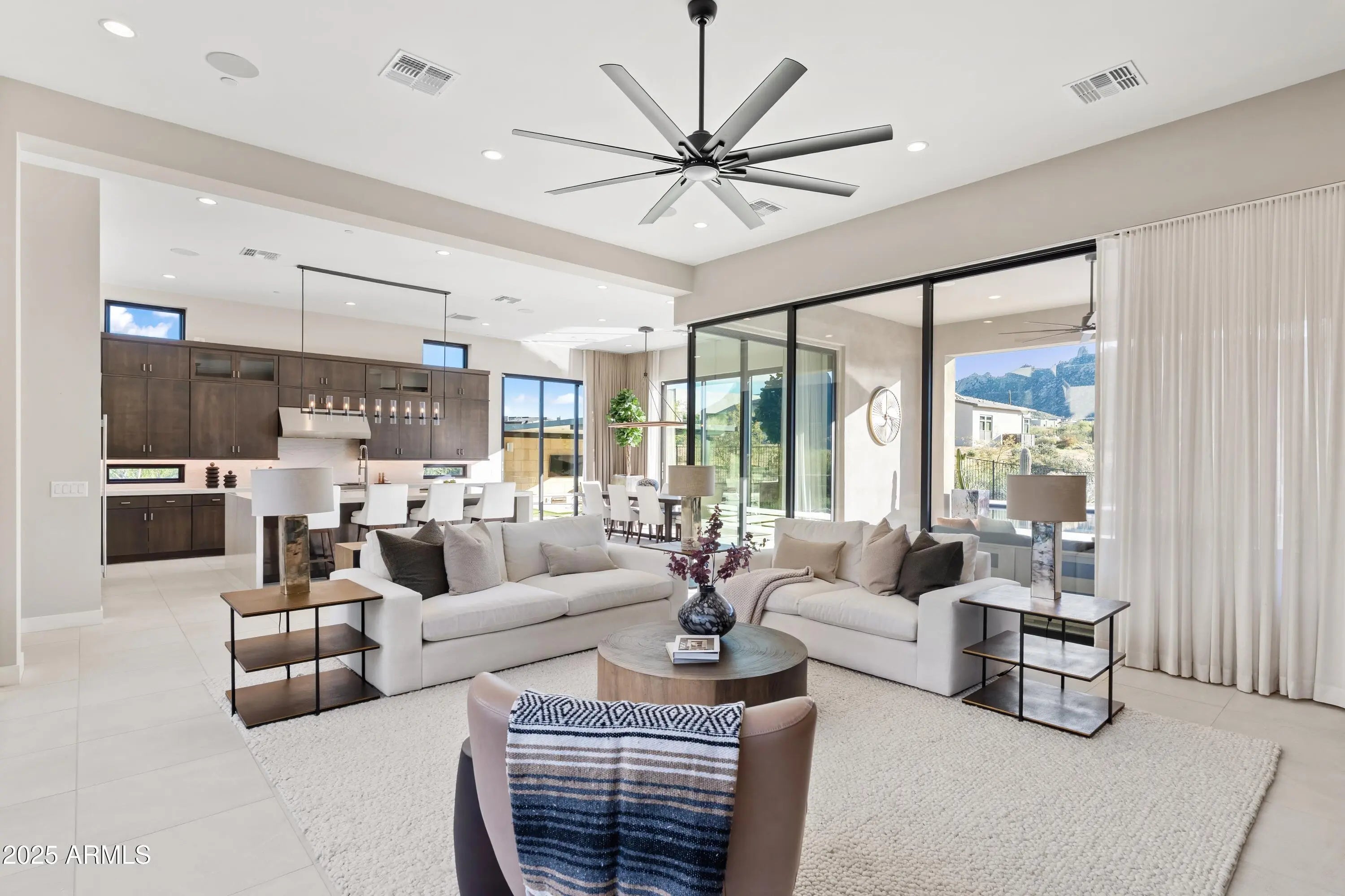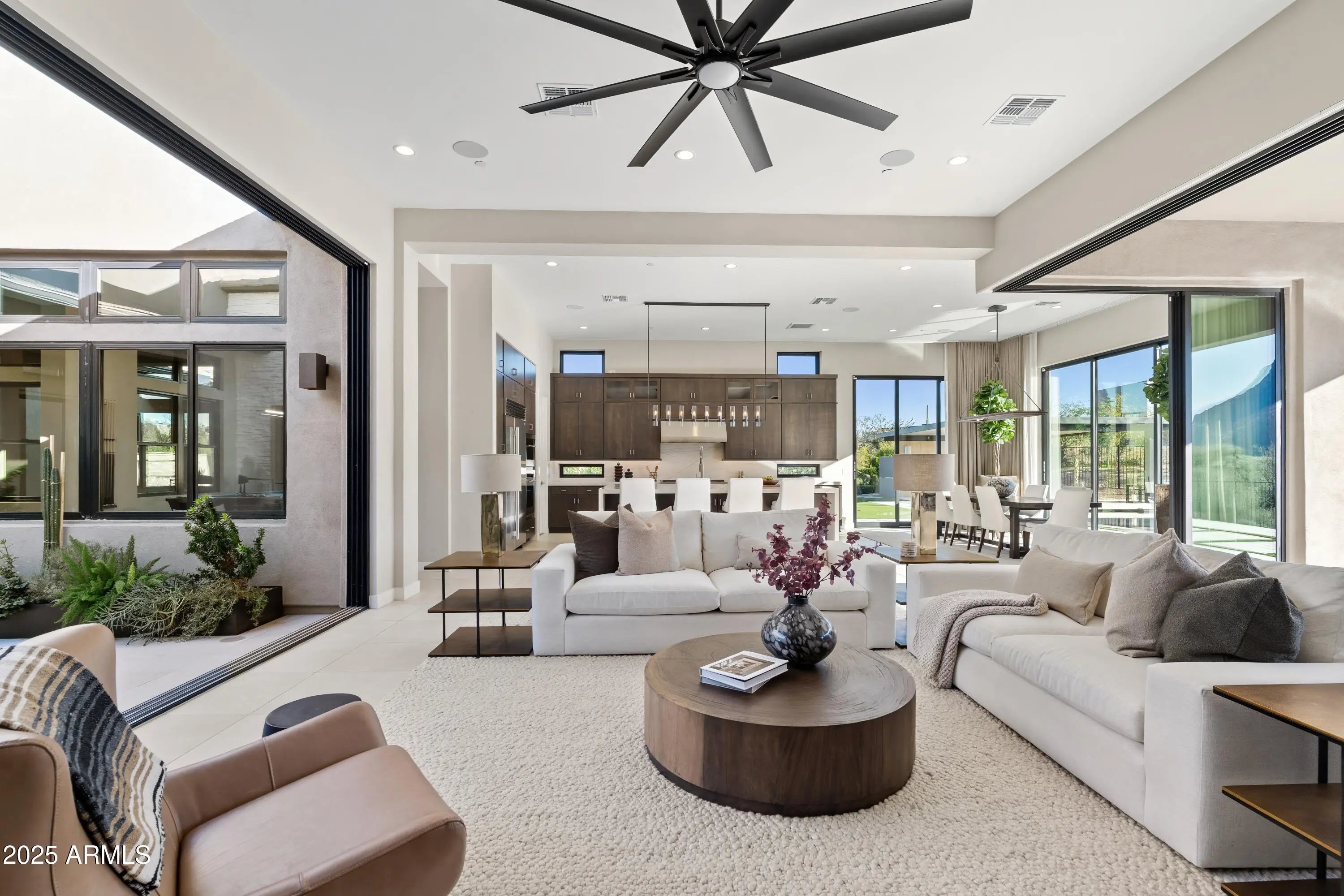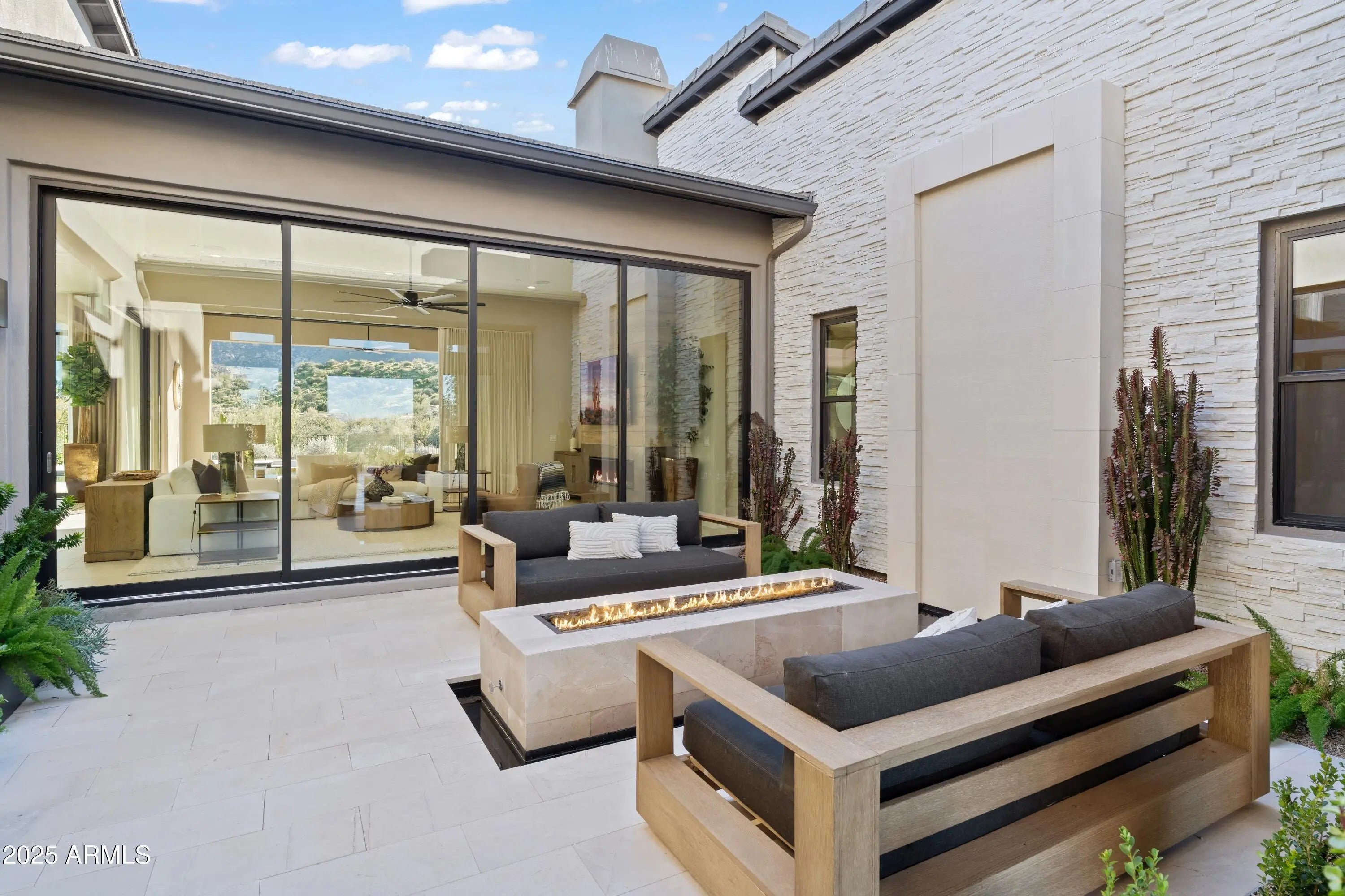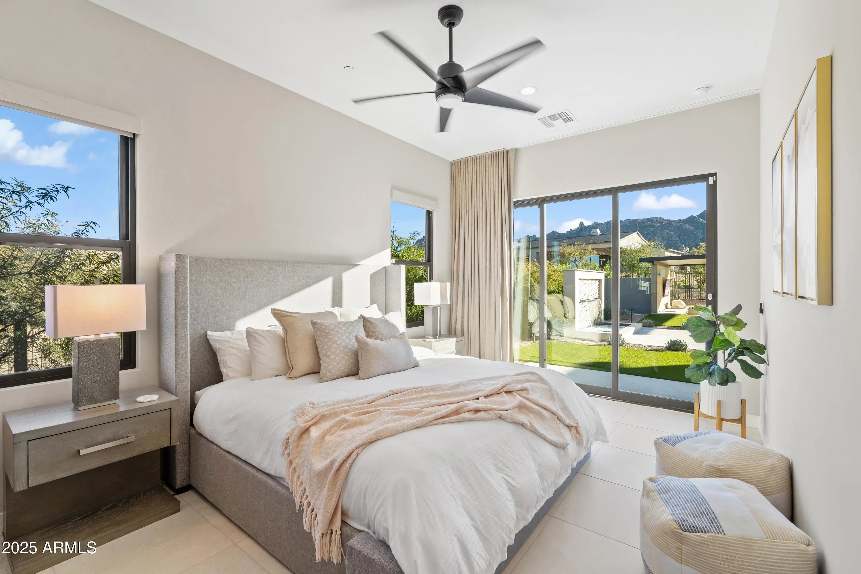 Welcome to your very own desert-resort sanctuary at 23962 N. 123rd Place, a nearly new 2024 estate in the guard-gated community of Sereno Canyon -- where breathtaking mountain vistas meet cutting-edge contemporary design for a lifestyle unlike any other in North Scottsdale. Set on a south-facing cul-de-sac, this 4,603-square-foot home offers four sumptuous ensuite bedrooms, a game room/office, a full guest home, and an expansive four-car garage -- ideal for the car enthusiast or multi-generational living. Enter through a dramatic courtyard into a residence defined by sun-soaked open spaces, 12' high ceilings, and floor to ceiling windows framing sweeping views of McDowell Mountains, Tom's Thumb, and the glittering cityscape beyond. Seamless indoor-outdoor flow is delivered via six, 10' pocketing doors between the great room and master suite, perfect for Arizona living and desert sunsets. Inside, refined finishes abound: quartzite countertops, top-of-the-line Wolf and Sub-Zero appliances, premium tile and stonework, and tasteful modern touches throughout ensure form meets function with elegance. The primary suite has been fully upgraded with limestone tile throughout, a separate sitting area w/access to a second spa, built-in cabinetry, & gorgeous tub/shower area w/multiple shower heads. But the soul of this home lies in the resort-style backyard that is a $1 million private oasis. Imagine mornings in the above-ground spa, afternoons cooling off in a zero-edge/negative-edge pool, and evenings entertaining friends at the swim-up bar. That OR you can cook with the built-in BBQ under a shaded pergola while watching the beautiful Arizona sunset, your choice! Water features, jacuzzi-style spa, firepits, outdoor shower, and sleek landscaping create a serene retreat that rivals the finest resorts. Whether you're hosting lavish gatherings, enjoying quiet family time, or simply absorbing the desert panorama with a glass of wine in hand, this home delivers a lifestyle of effortless luxury, privacy, and natural beauty. And as a resident of Sereno Canyon, you'll have access to the acclaimed Mountain House Lodge with fitness center, resort-style pools, spa services, dining and lounge facilities, and membership-style amenities that elevate everyday living into something extraordinary. This is not just a home, it's your private resort.(Furnishings are also available on separate bill of sale if you want a true turn-key property).