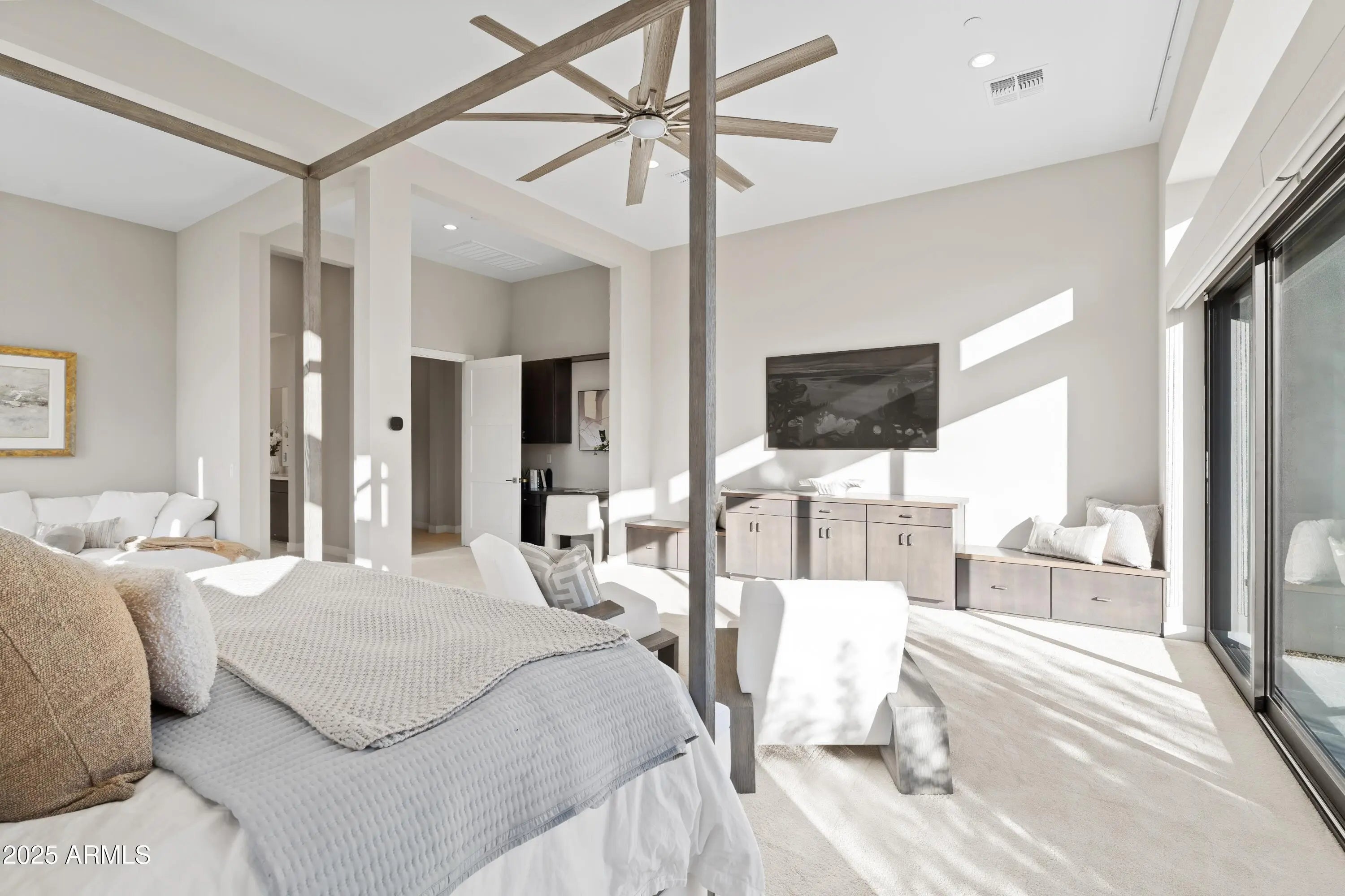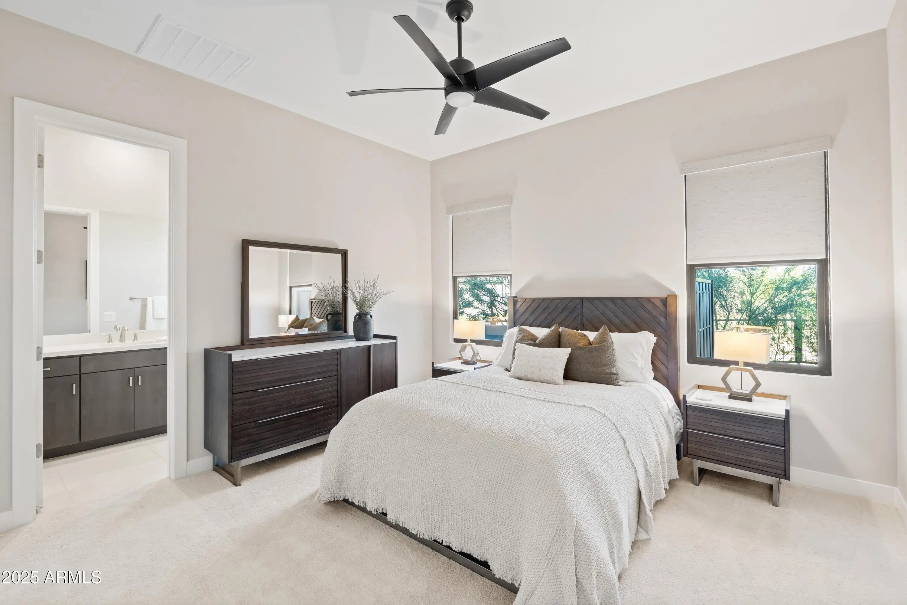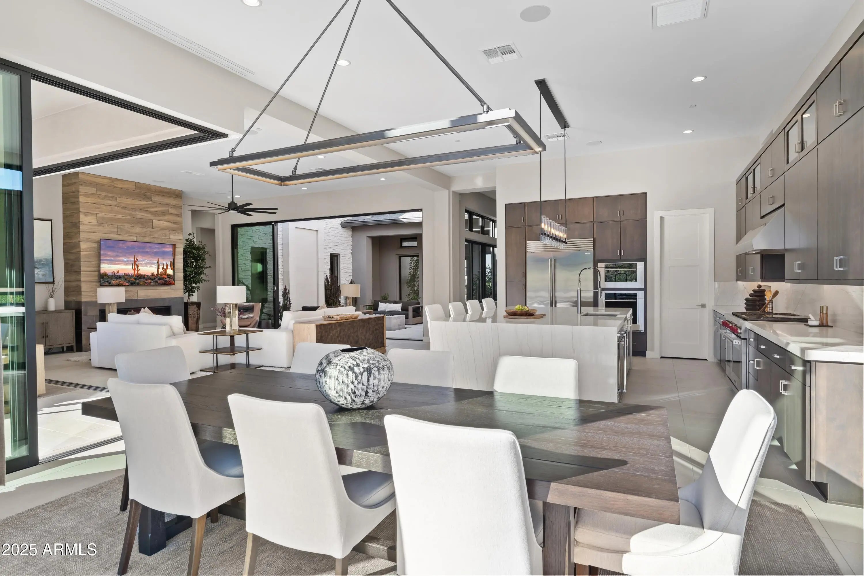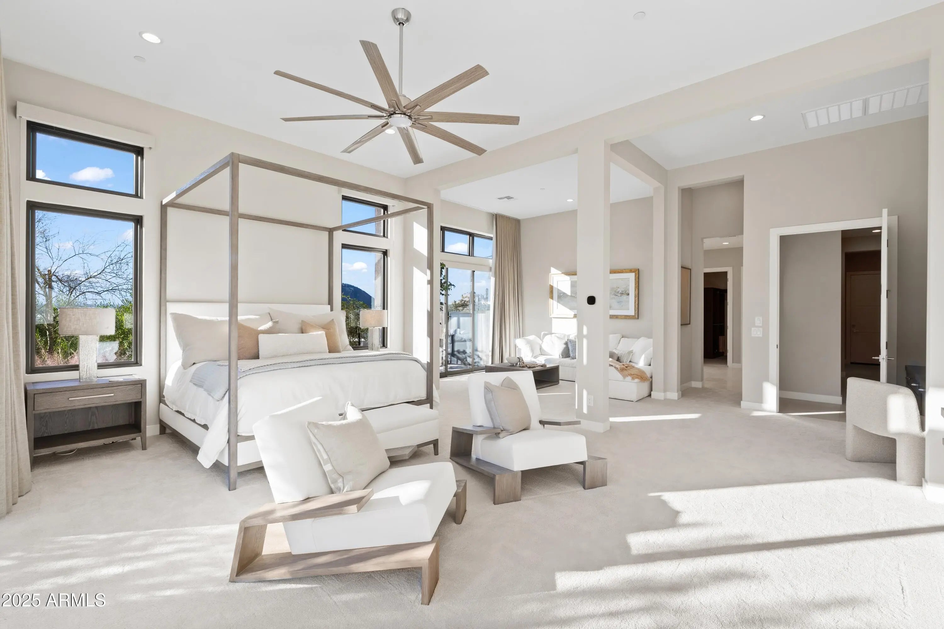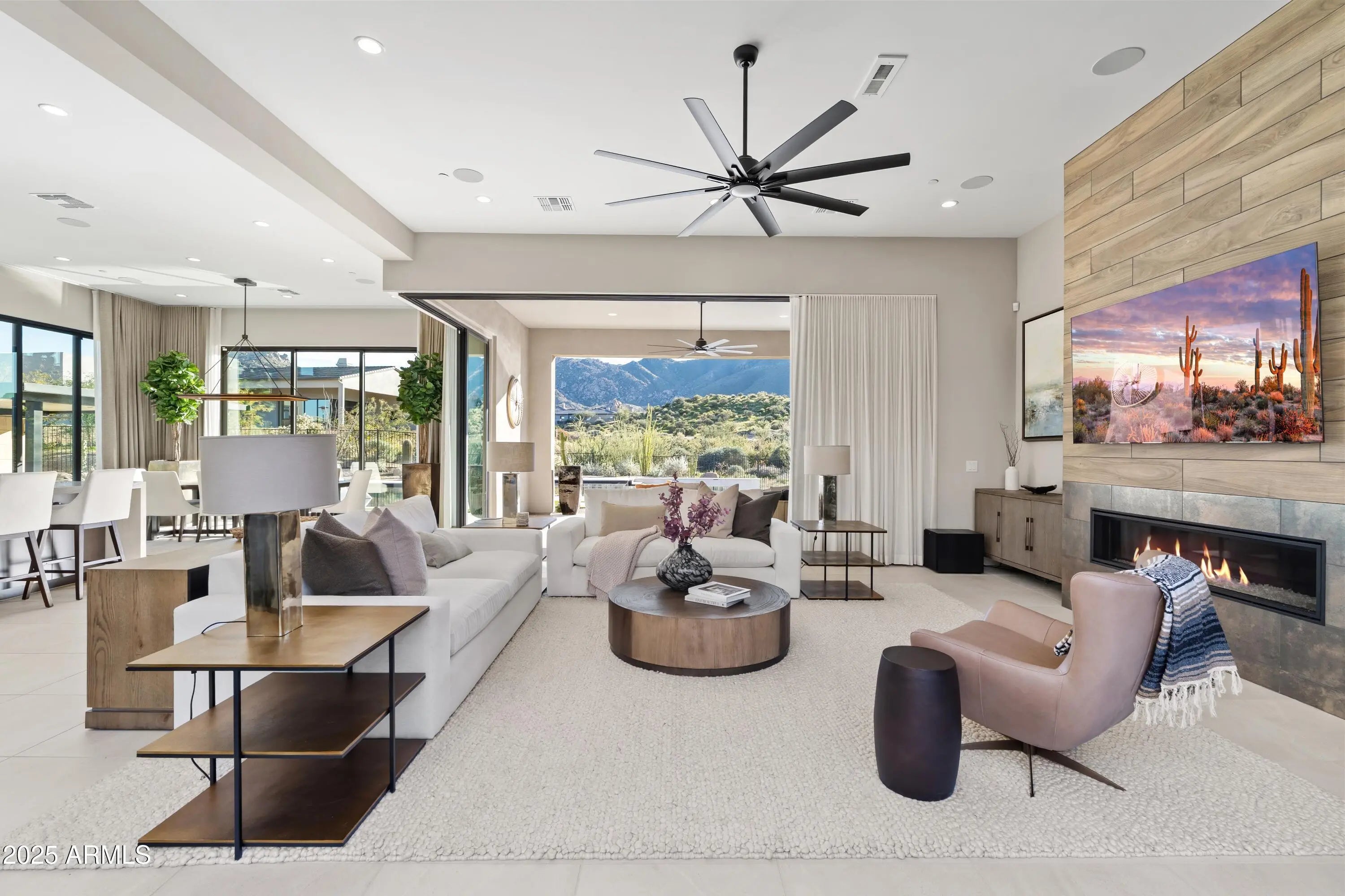 Welcome to your very own desert-resort sanctuary at 23962 N. 123rd Place, a nearly new 2024 estate in the guard-gated community of Sereno Canyon -- where breathtaking mountain vistas meet cutting-edge contemporary design for a lifestyle unlike any other in North Scottsdale. Set on a south-facing cul-de-sac, this 4,603-square-foot home offers four sumptuous ensuite bedrooms, a game room/office, a full guest home, and an expansive four-car garage -- ideal for the car enthusiast or multi-generational living. Enter through a dramatic courtyard into a residence defined by sun-soaked open spaces, 12' high ceilings, and floor to ceiling windows framing sweeping views of McDowell Mountains, Tom's Thumb, and the glittering cityscape beyond. Seamless indoor-outdoor flow is delivered via six, 10' pocketing doors between the great room and master suite, perfect for Arizona living and desert sunsets. Inside, refined finishes abound: quartzite countertops, top-of-the-line Wolf and Sub-Zero appliances, premium tile and stonework, and tasteful modern touches throughout ensure form meets function with elegance. The primary suite has been fully upgraded with limestone tile throughout, a separate sitting area w/access to a second spa, built-in cabinetry, & gorgeous tub/shower area w/multiple shower heads. But the soul of this home lies in the resort-style backyard that is a $1 million private oasis. Imagine mornings in the above-ground spa, afternoons cooling off in a zero-edge/negative-edge pool, and evenings entertaining friends at the swim-up bar. That OR you can cook with the built-in BBQ under a shaded pergola while watching the beautiful Arizona sunset, your choice! Water features, jacuzzi-style spa, firepits, outdoor shower, and sleek landscaping create a serene retreat that rivals the finest resorts. Whether you're hosting lavish gatherings, enjoying quiet family time, or simply absorbing the desert panorama with a glass of wine in hand, this home delivers a lifestyle of effortless luxury, privacy, and natural beauty. And as a resident of Sereno Canyon, you'll have access to the acclaimed Mountain House Lodge with fitness center, resort-style pools, spa services, dining and lounge facilities, and membership-style amenities that elevate everyday living into something extraordinary. This is not just a home, it's your private resort.(Furnishings are also available on separate bill of sale if you want a true turn-key property).