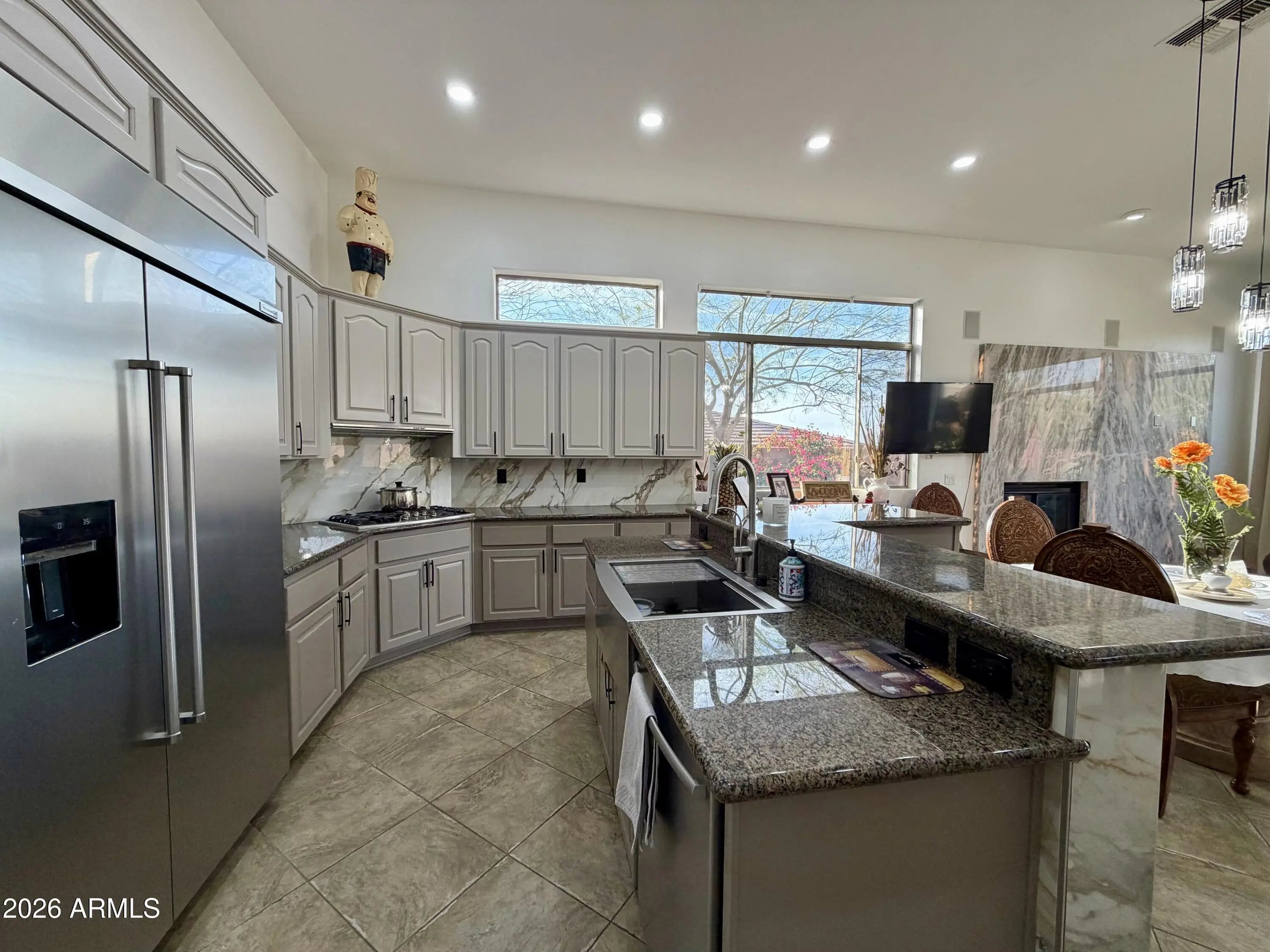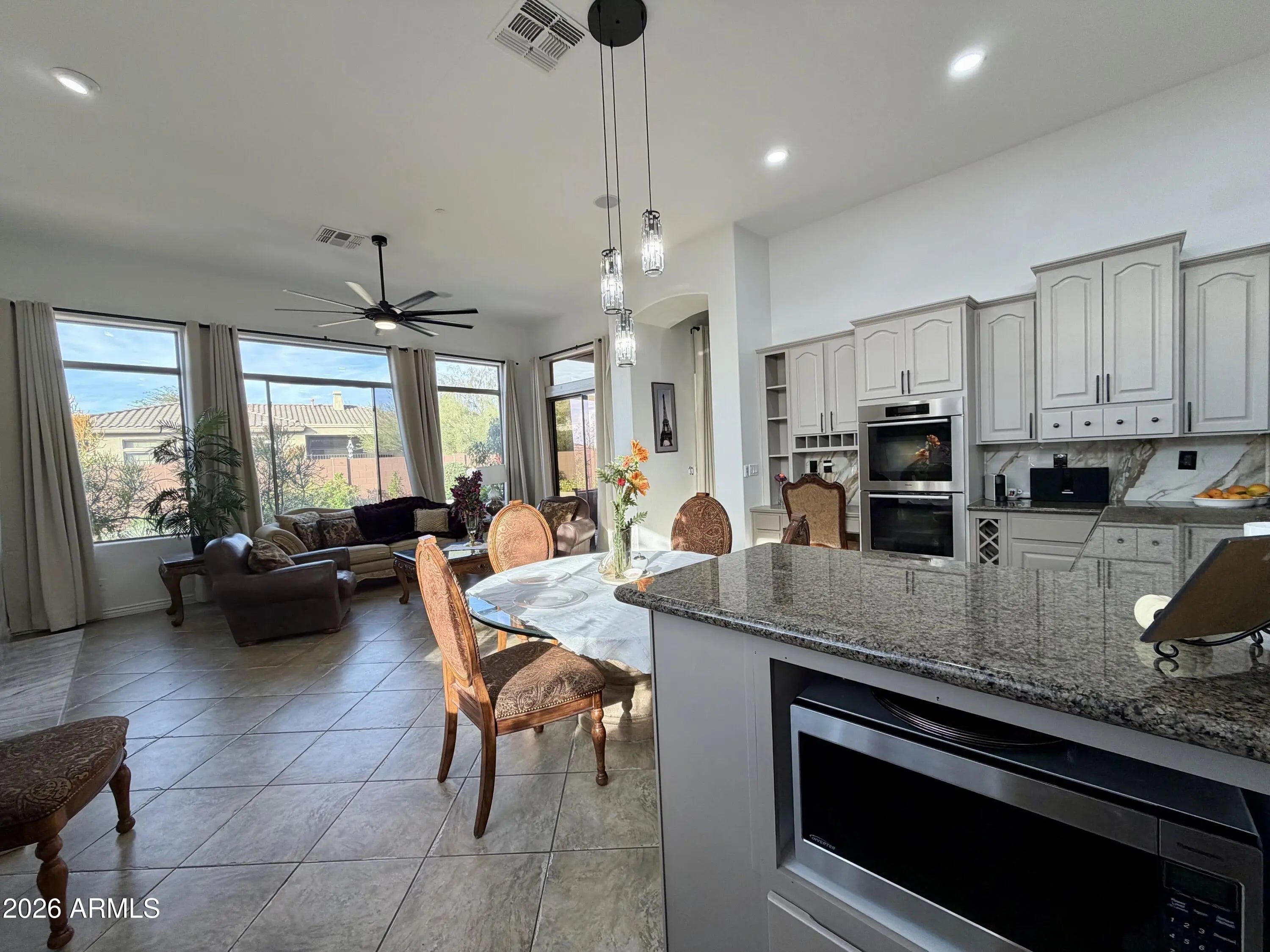 Nestled within Anthem Country Club, this stunning home offers elegance and comfort throughout. Granite shines in every space, including a dramatic lighted granite accent wall. Beautiful hardwood and ceramic flooring pair perfectly with elegant chandeliers that elevate the home's style. The split floor plan provides privacy, featuring a luxurious primary suite with a granite-enclosed shower. A huge second bedroom includes an en-suite bath, while additional bedrooms are generously sized. The kitchen boasts granite countertops and beautiful appliances, ideal for entertaining. Step into a true backyard oasis with a sparkling pool and spa, built-in BBQ, fireplace, and travertine in all the right places. Complete with a 3-car garage and an large laundry room, Owned Solar Panels!