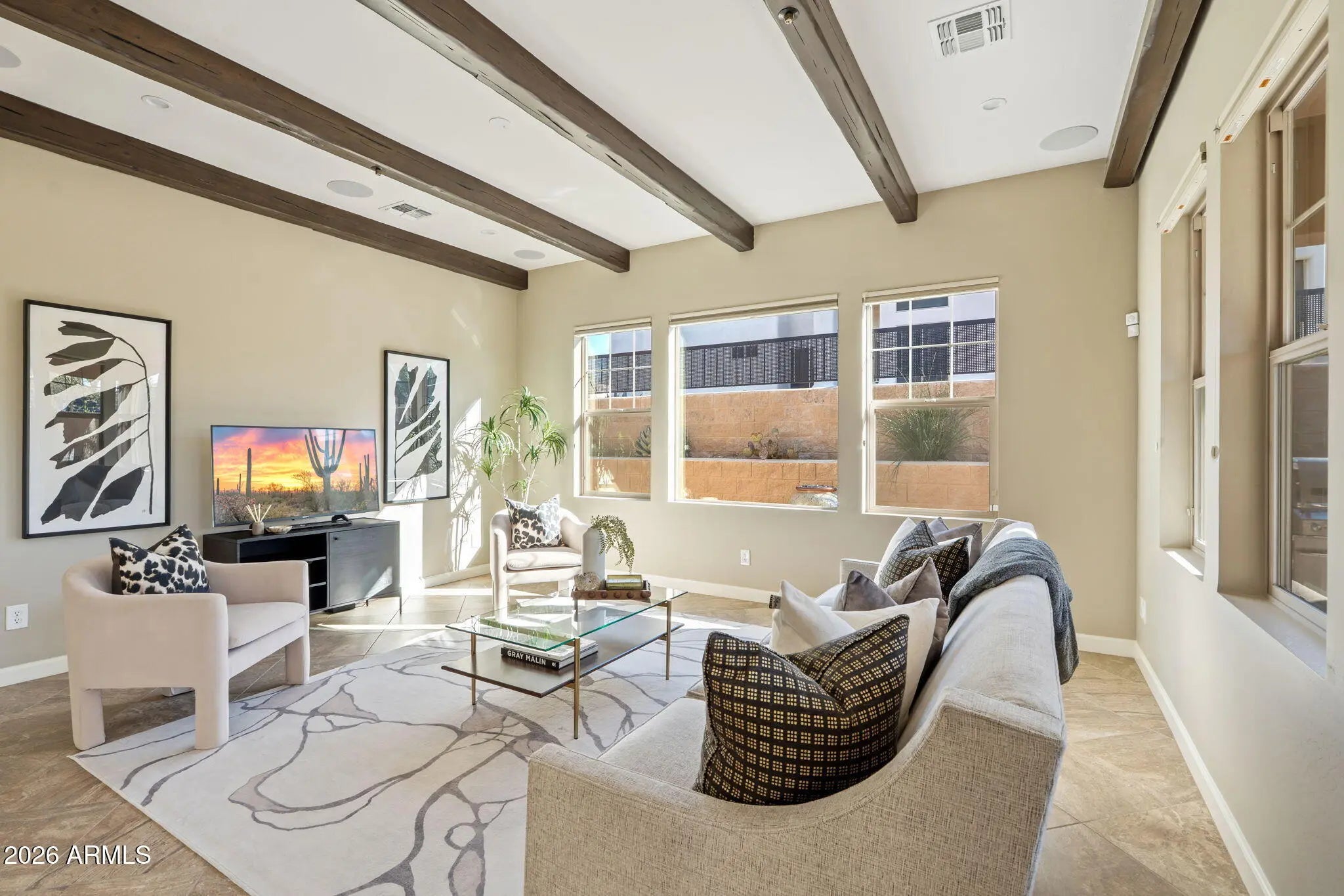 Immaculate and nearly new in feel, this beautifully maintained home is one of just 24 in the boutique Almarte community. The open, split 2 bedroom + den floorplan features exposed beams, coffered ceilings, LED lighting, and a living room outfitted with five in-ceiling speakers for true home-theater audio. The kitchen offers like-new luxury appliances including a SubZero fridge, JennAir range with gas stub-out, two built-in microwaves (one convection), and a 2024 reverse osmosis system. Both bathrooms feature floor-to-ceiling marble tile. The private backyard is designed for year-round enjoyment with cool-to-the-touch travertine, a water feature, and a twice used built-in Weber grill. High-value upgrades include premium foam insulation, Navien tankless water heater and 2024 Halo 5 Whole House Water Filtration unit with up to 10 years of no maintenance.