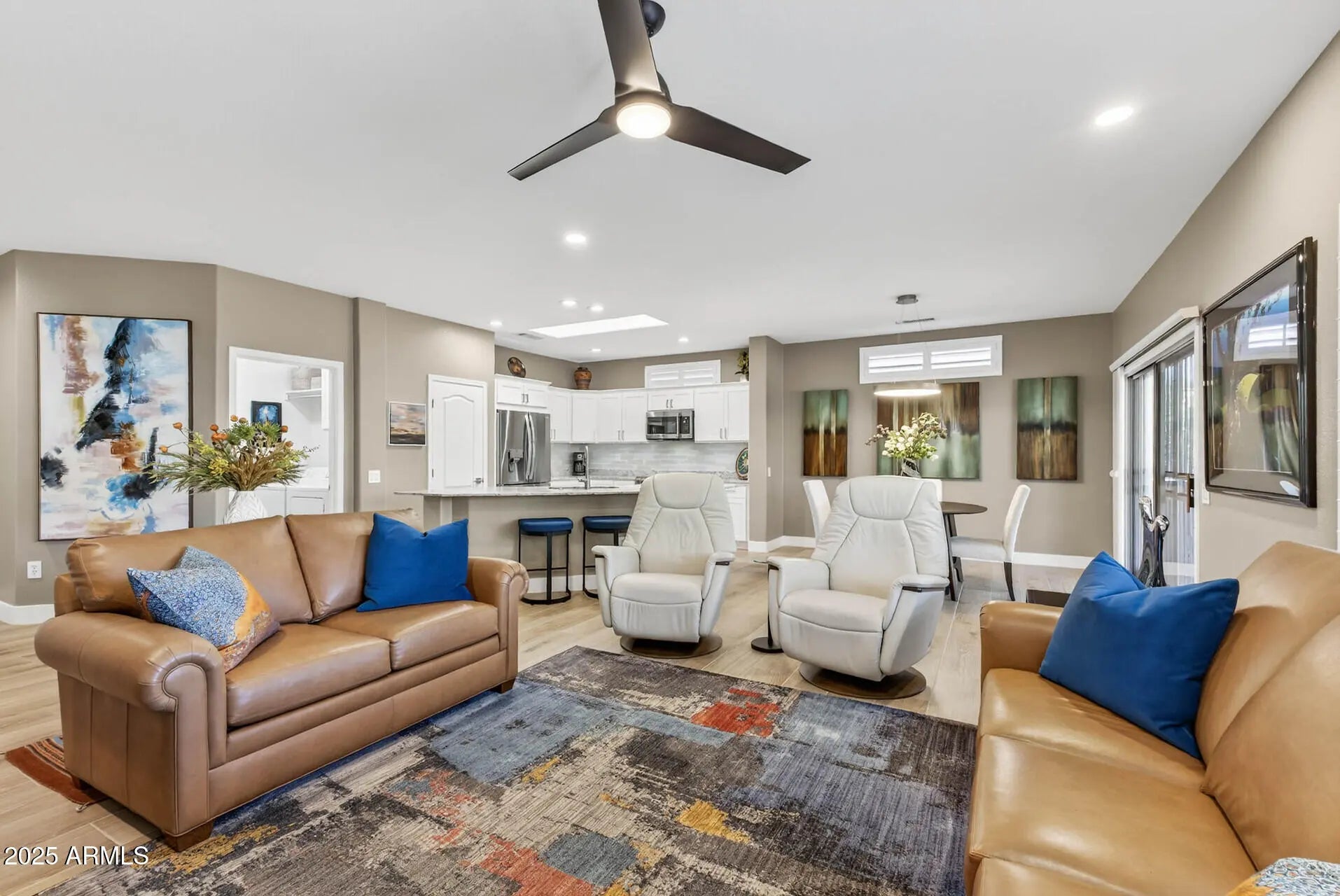 Step into this SPECTACULAR REMODEL on cul-de-sac. Open floor plan with NEWER wood-look tile floors, high baseboards, plantation shutters, upgraded cabinets/vanities, & SS appliances. Stunning satin leather granite counters run throughout. The kitchen offers an induction stove, skylight, lg sink, tile backsplash & opens to the Great Room and Dining Area—perfect for entertaining. Owner's Suite includes a bay window & upgraded bath w/NEWER shower, lights, mirrors & raised vanity w/satin leather granite counters & 2 inlaid sinks. Hall bath with tub/shower also updated with same features. Enjoy an inviting outdoor oasis w/extended patio, pony wall, Kool Deck, LED lights & NEW fans. Garage includes epoxy floor, cabinets & golf cart space. Security screen doors, Ext paint 2024 + NEW ROOF 2020!