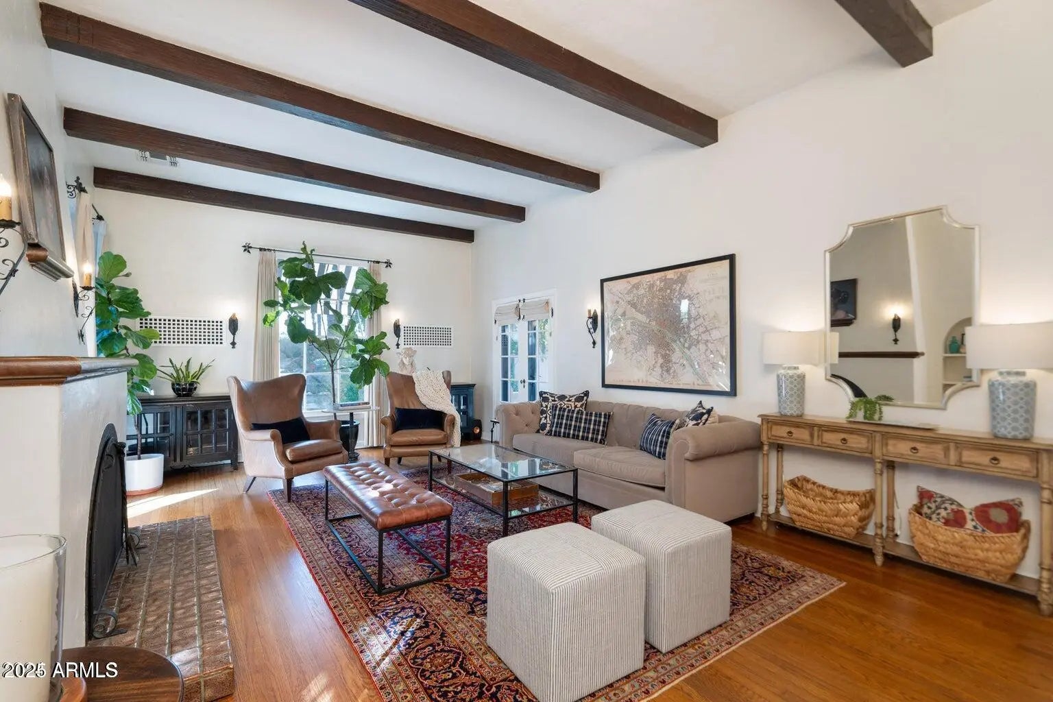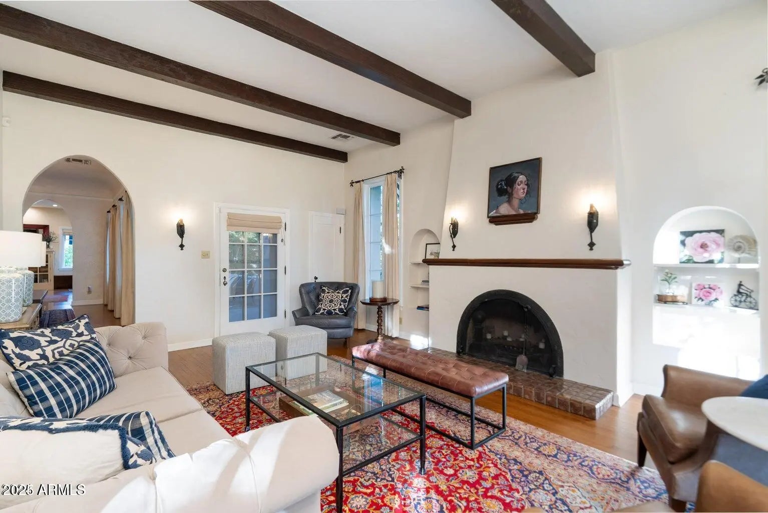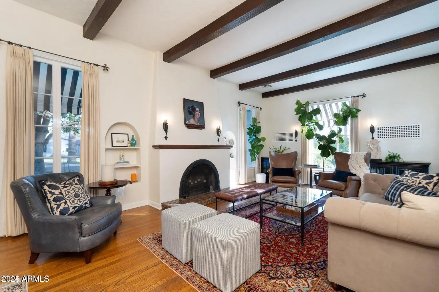 Stunning 1928 Spanish Colonial located in the historic Encanto/Palmcroft district. Originally built as one of the Palmcroft model homes by Heard Development, this beautifully preserved residence showcases classic architectural details and exceptional craftsmanship. The grand formal living room features high ceilings, hand-stenciled beams, original wood floors, 9-ft picture windows, French doors, and wrought-iron fixtures. Adjacent formal dining and breakfast rooms include original built-in china cabinets. The spacious primary suite offers a wall of custom bookcases, a generous walk-in closet, and two sets of French doors opening to the private yard. The backyard is a lush retreat with mature landscaping, multiple patio areas, and a sparkling pool — ideal for year-round entertaining.