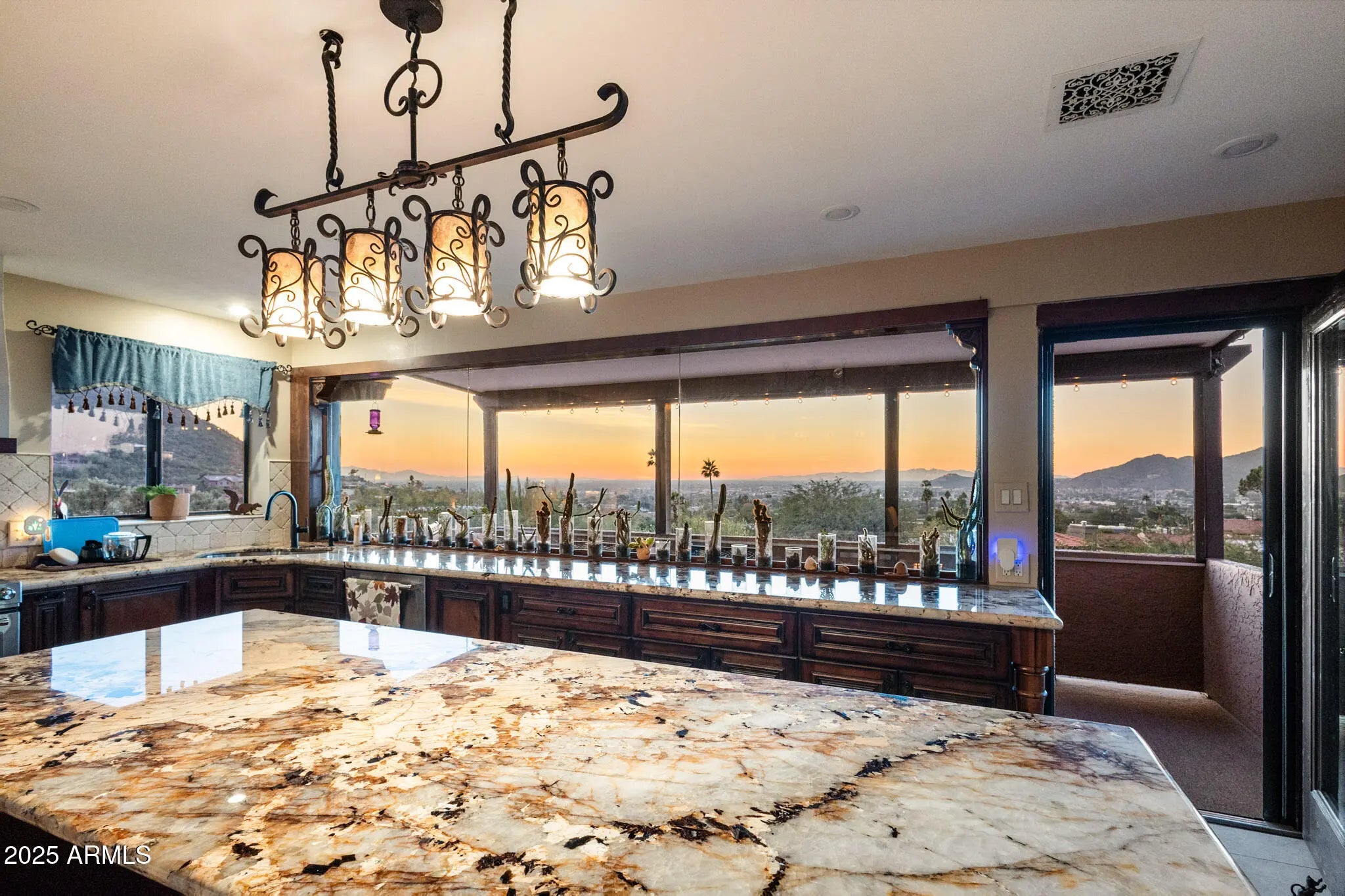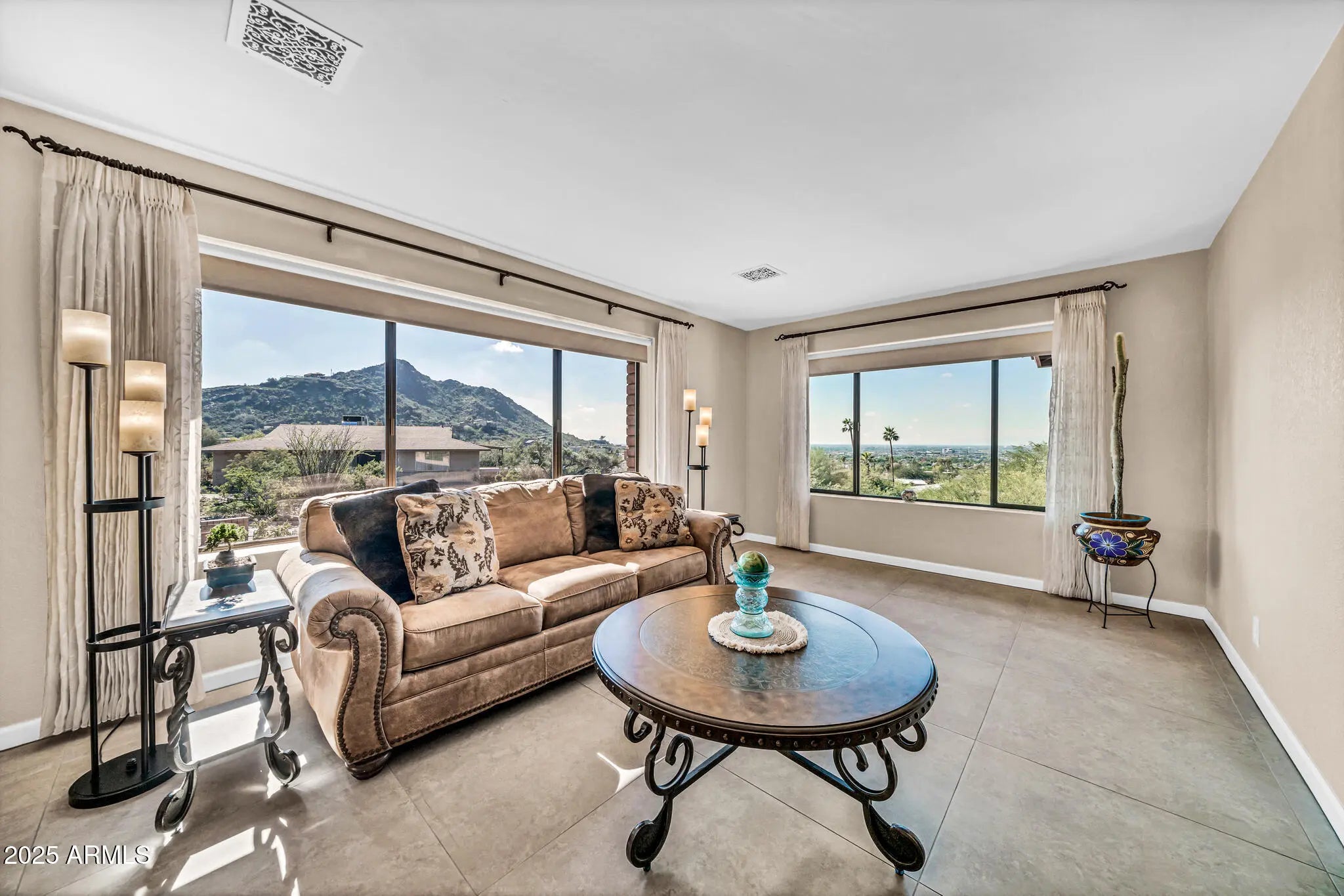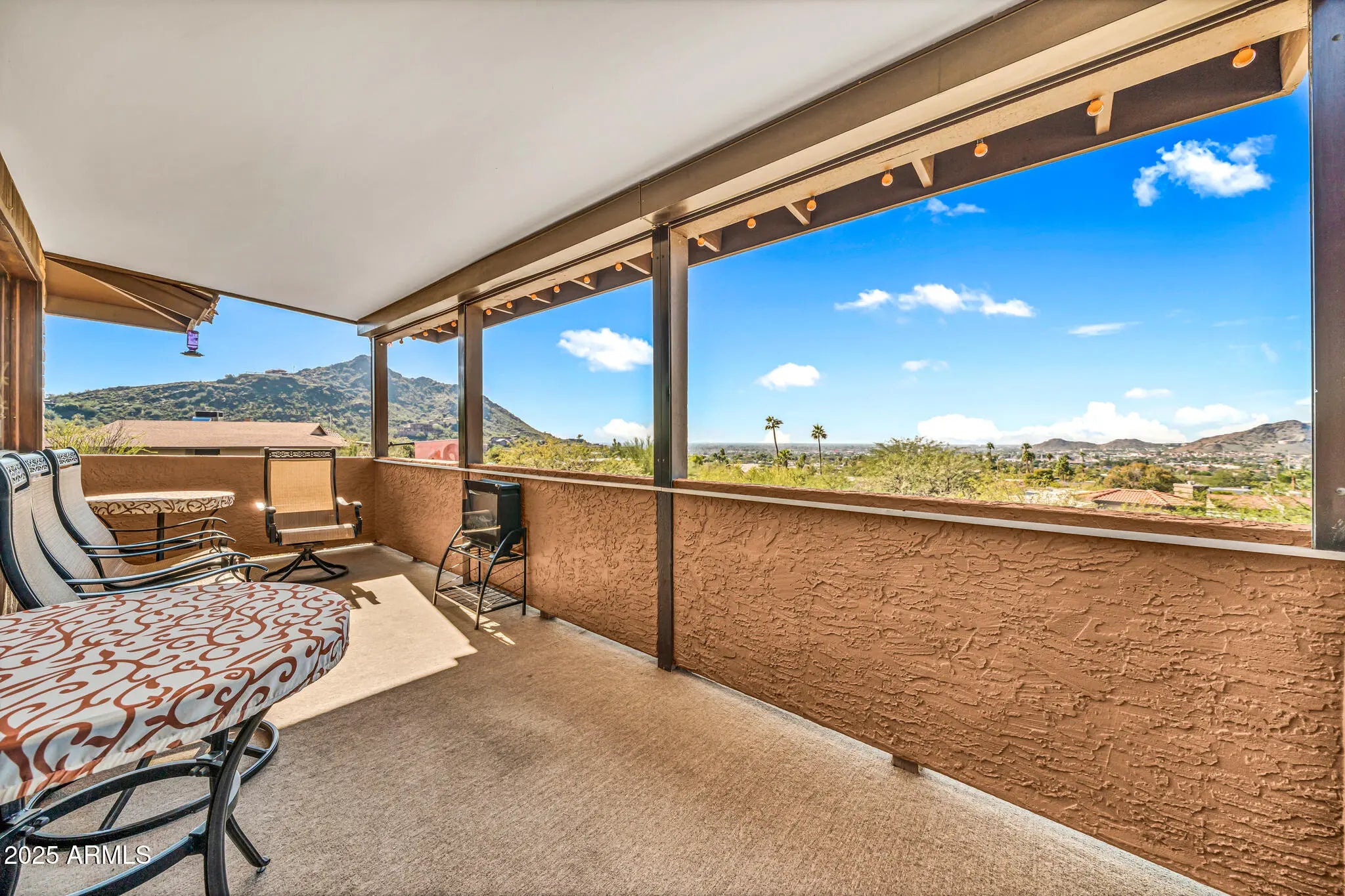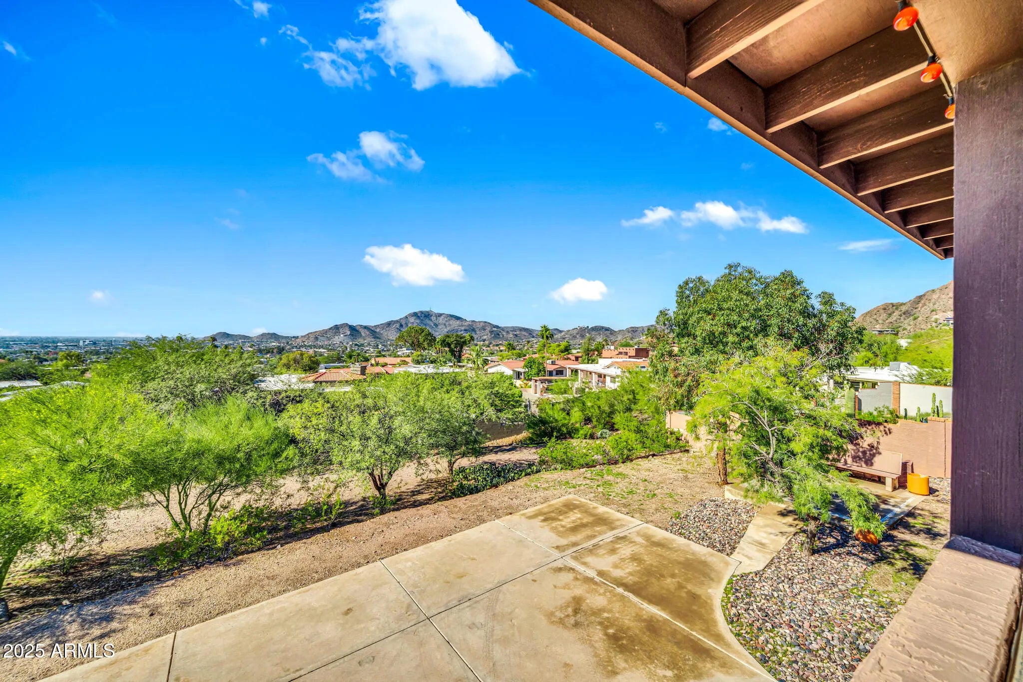 Spectacular panoramic mountain and city light views surround this custom hillside home in a quiet North Phoenix enclave with no HOA. Sitting on an oversized and elevated lot with mature desert landscaping, this property offers rare privacy and unobstructed scenery in every direction. The elevated setting creates a quiet, park-like setting never to be obstructed as the land below is yours as well. The kitchen is the true centerpiece of the home. The picture window spans the entire wall and creates a one-of-a-kind cooking and dining experience with uninterrupted city views. The layout offers extensive counter space, abundant cabinetry, and a wide island that functions as both a workspace and a gathering place. The custom quartz adds depth and character with rich veining and warm tones that complement the wood cabinetry. The kitchen flows into both the dining area and the living room, making it ideal for everyday use and for entertaining. Large windows capture the dramatic views from the living room, filling the home with natural light. The luxurious primary bedroom is connected to a private bath, a large walk-in closet, and direct access to an outdoor space that overlooks the surrounding mountains. The en-suite bathroom includes upscale elements like dual vanities, bidet, and a custom dual shower. The private patio provides a personal outdoor space directly connected to the bedroom thru sliding glass doors that span the entire wall, ideal for morning yoga or evening relaxation. The garage has a level 2 EV charger and a storage area with enough space to be used as a workshop. This is an exceptional opportunity to own a true view property with timeless character. Perfect for a buyer seeking privacy and some of the best mountain scenery in North Phoenix. Just minutes from hiking trails, dining, and freeway access. 2015 roof replacement 2017 AC replacement