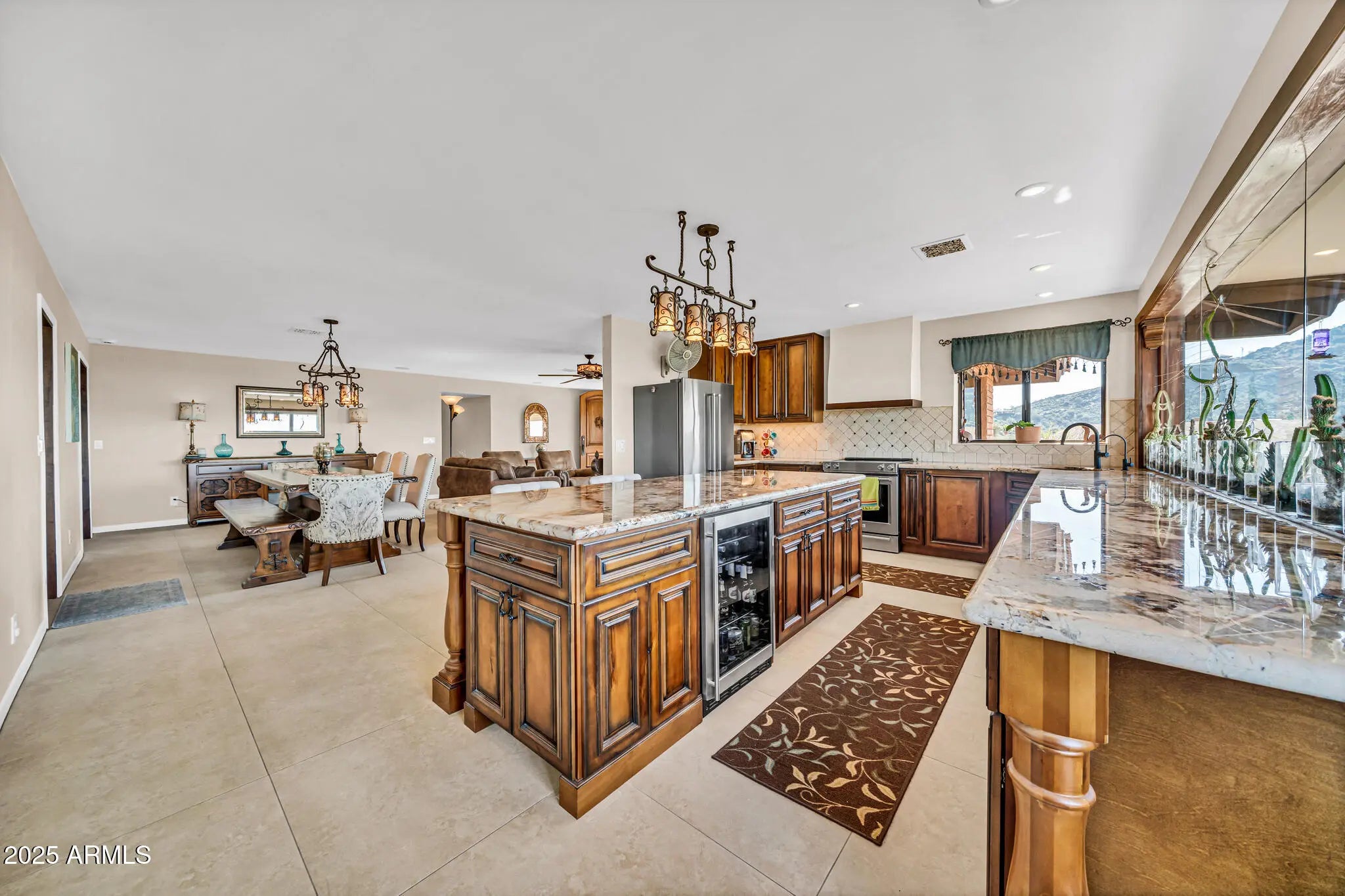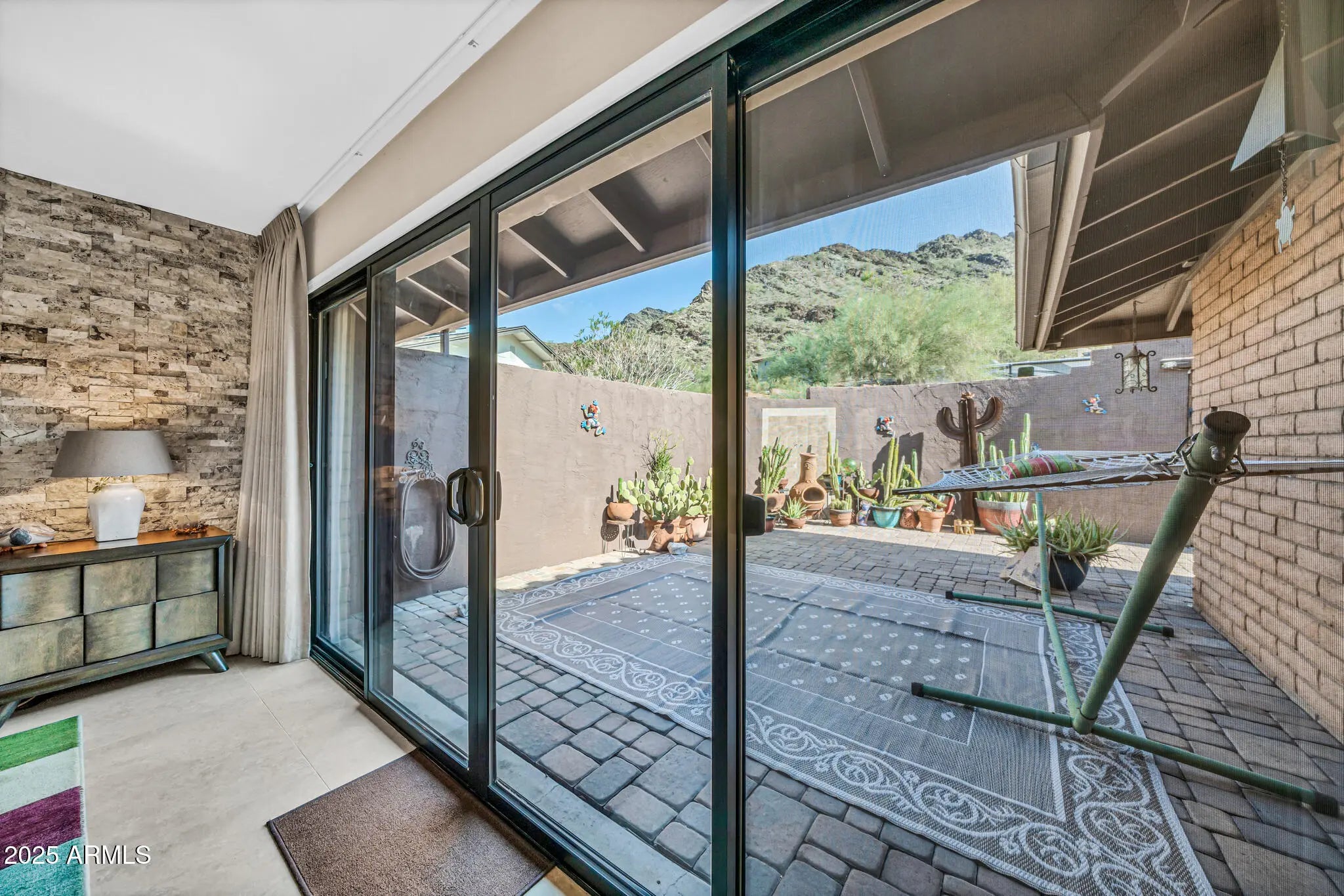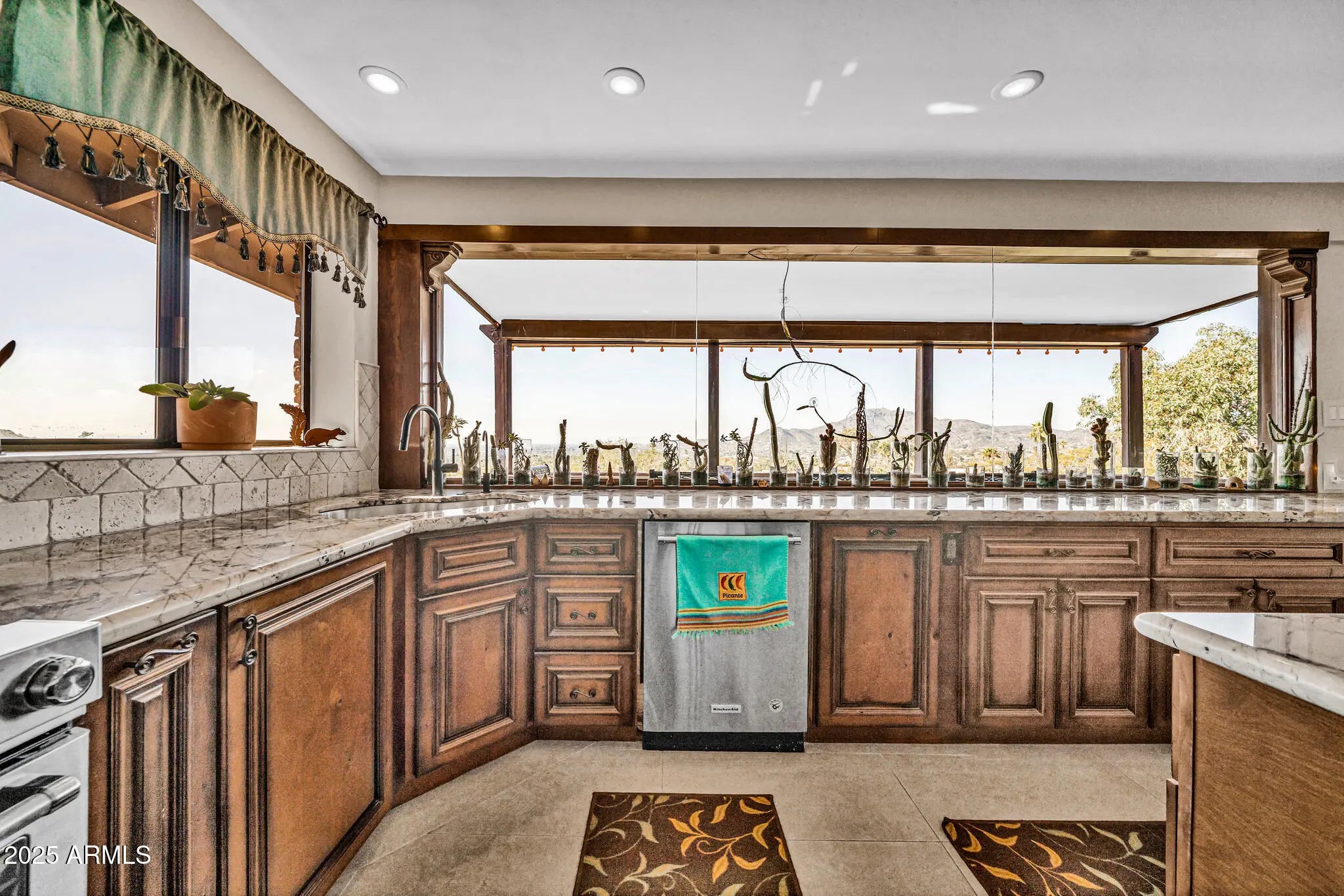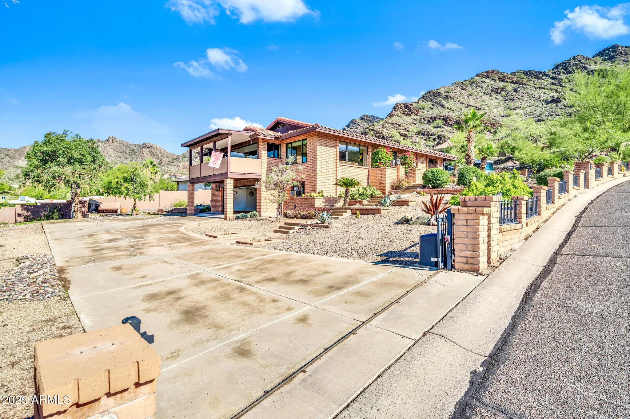 Spectacular panoramic mountain and city light views surround this custom hillside home in a quiet North Phoenix enclave with no HOA. Sitting on an oversized and elevated lot with mature desert landscaping, this property offers rare privacy and unobstructed scenery in every direction. The elevated setting creates a quiet, park-like setting never to be obstructed as the land below is yours as well. The kitchen is the true centerpiece of the home. The picture window spans the entire wall and creates a one-of-a-kind cooking and dining experience with uninterrupted city views. The layout offers extensive counter space, abundant cabinetry, and a wide island that functions as both a workspace and a gathering place. The custom quartz adds depth and character with rich veining and warm tones that complement the wood cabinetry. The kitchen flows into both the dining area and the living room, making it ideal for everyday use and for entertaining. Large windows capture the dramatic views from the living room, filling the home with natural light. The luxurious primary bedroom is connected to a private bath, a large walk-in closet, and direct access to an outdoor space that overlooks the surrounding mountains. The en-suite bathroom includes upscale elements like dual vanities, bidet, and a custom dual shower. The private patio provides a personal outdoor space directly connected to the bedroom thru sliding glass doors that span the entire wall, ideal for morning yoga or evening relaxation. The garage has a level 2 EV charger and a storage area with enough space to be used as a workshop. This is an exceptional opportunity to own a true view property with timeless character. Perfect for a buyer seeking privacy and some of the best mountain scenery in North Phoenix. Just minutes from hiking trails, dining, and freeway access. 2015 roof replacement 2017 AC replacement