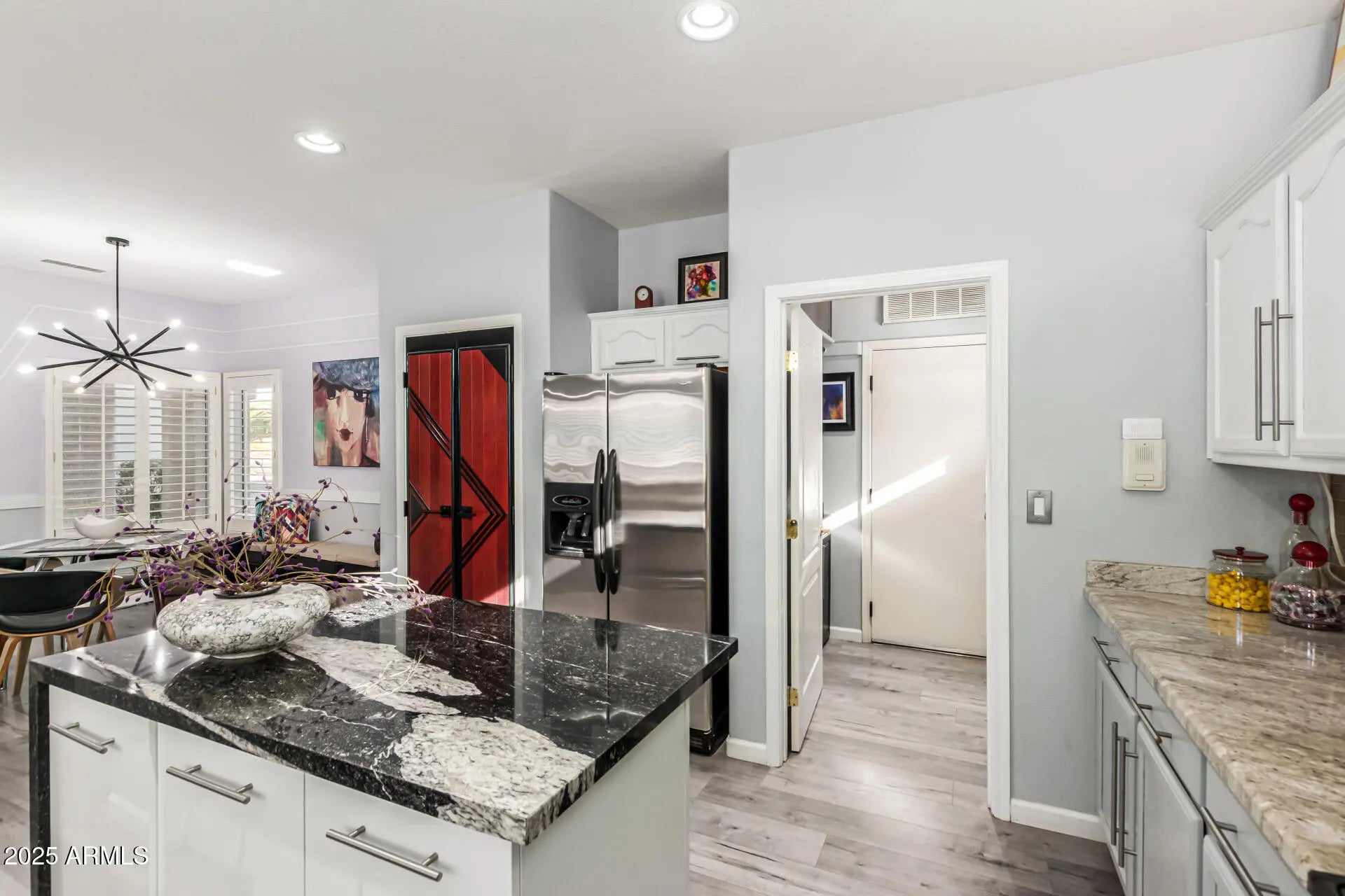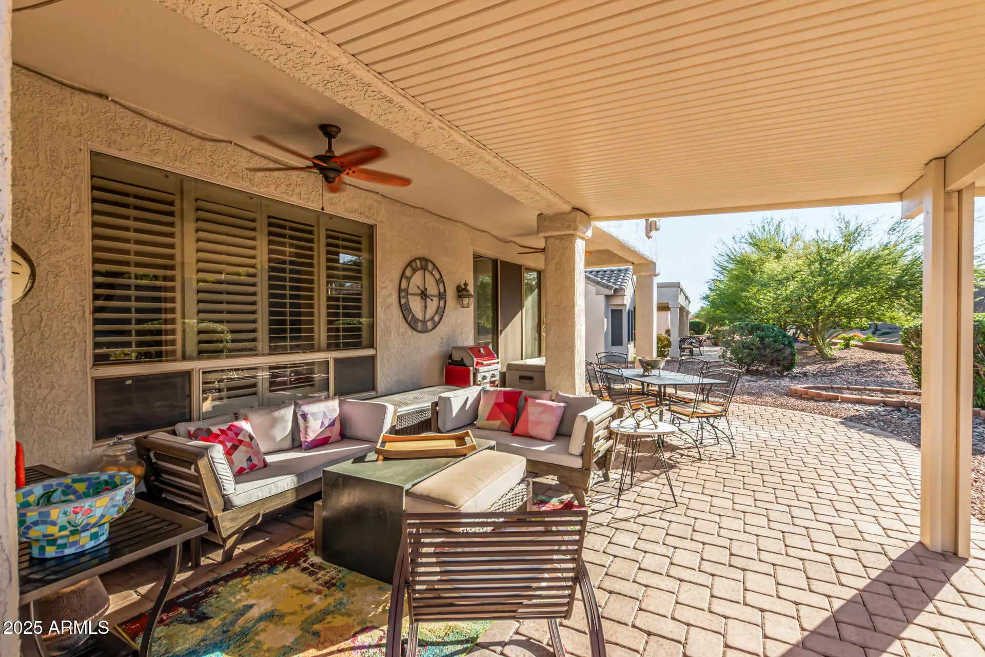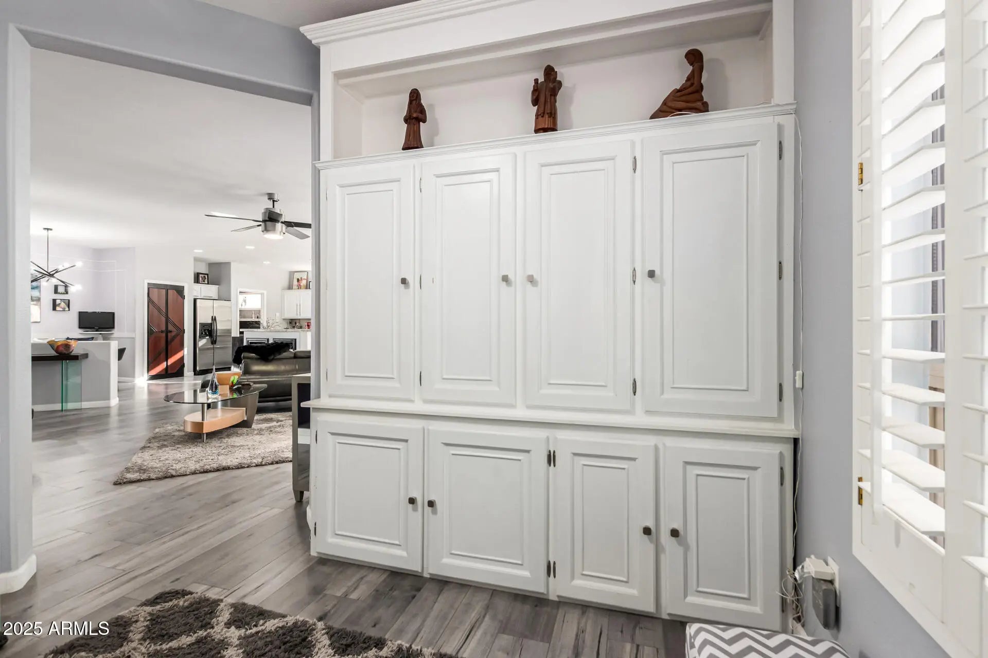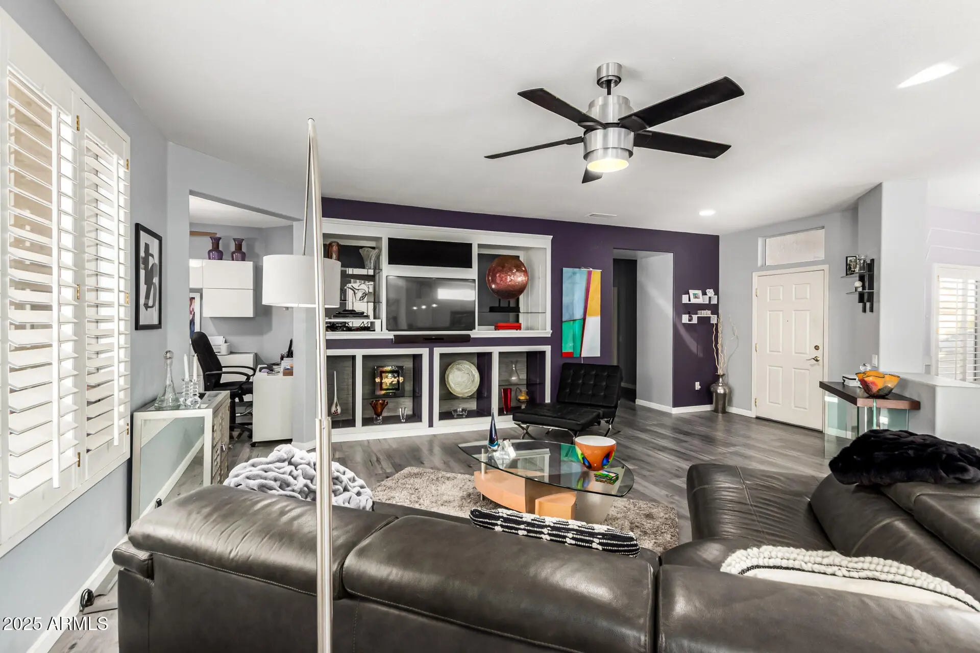 This home offers a spacious, modern interior with thoughtful details throughout. Highlights include a custom media wall, unique finishes, a butler's pantry off the generously sized kitchen, and an extended second bedroom. Enjoy privacy with no rear neighbors and a walking path situated below the home. The extended rear patio with pavers, along with both front and rear courtyards, create great outdoor spaces, while shutters adorn most windows. The garage is also extended to fit all your toys. A must-see for its distinctive attention to detail.
