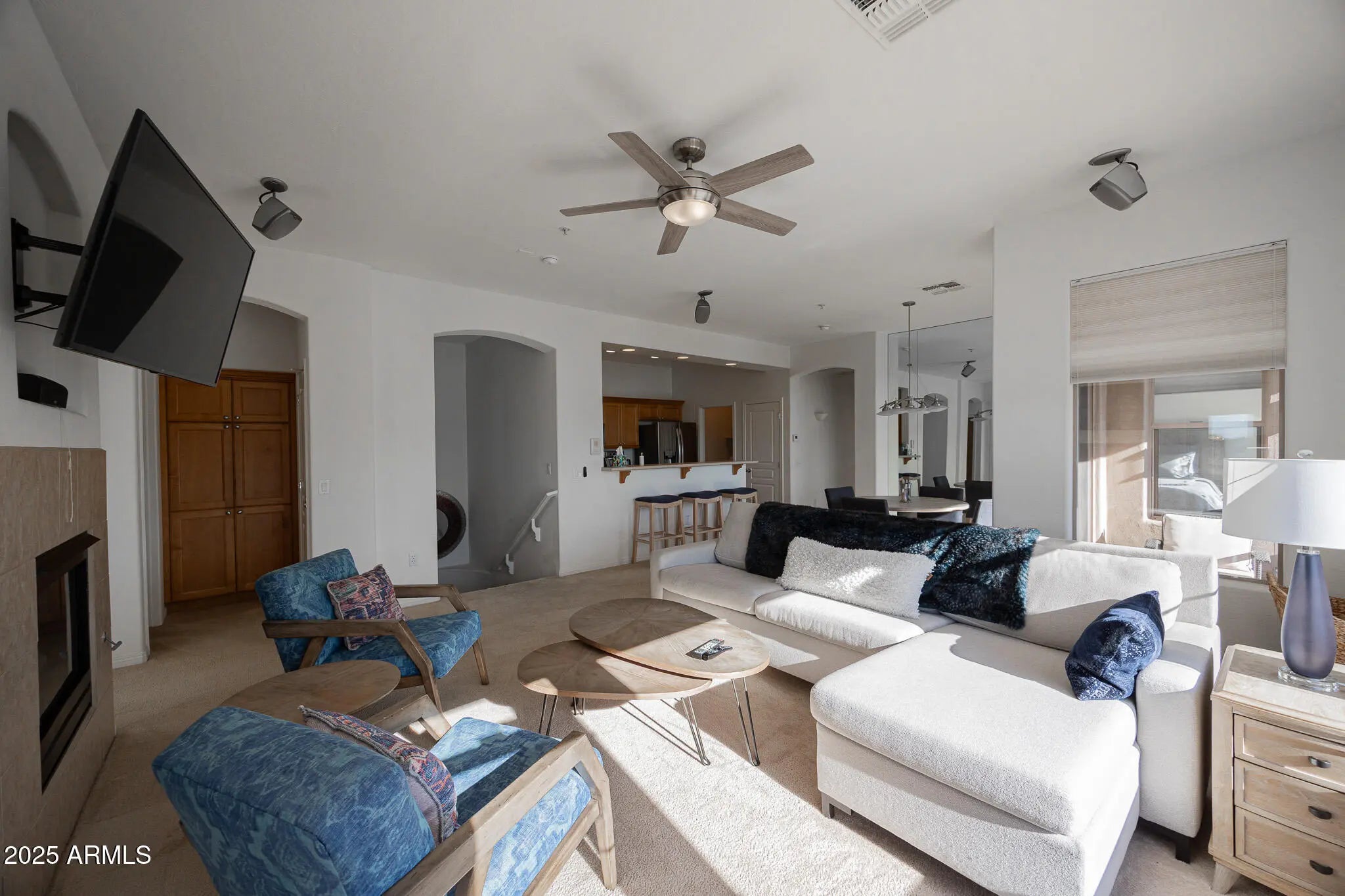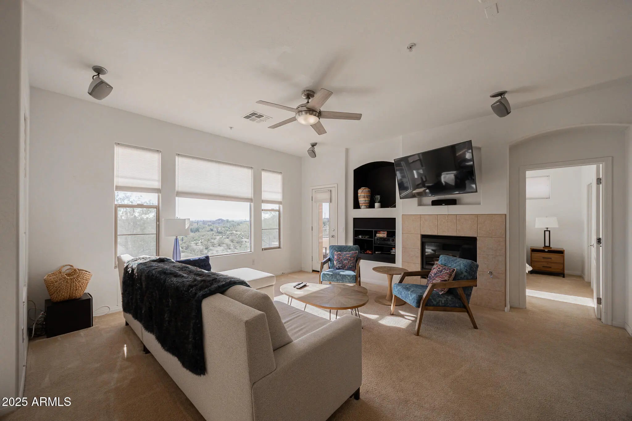 ndulge in upscale Scottsdale living with this exquisitely furnished 2/2 corner condo at Tesoro at Grayhawk. This luxurious home invites you in with vaulted ceilings, new plush carpet, fresh paint, and a modern kitchen with breakfast bar that opens to a warm, inviting living room complete with a cozy fireplace and balcony perfect for sunset views. The serene master suite offers a dual-sink bath and oversized closet, while the split layout ensures privacy for guests. Enjoy the convenience of a 2-car garage and in-unit washer/dryer. Set within a gated community featuring a resort-style pool and breathtaking mountain views, this condo delivers both comfort and sophistication in an unbeatable North Scottsdale location. Don't miss your chance to call this highly sought-after community home.