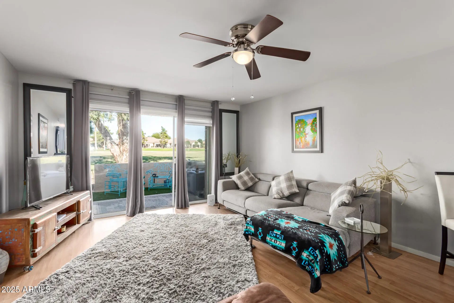 Wonderful opportunity to winter in this beautiful Fountain of the Sun community! This bright, single-level unit sits on the golf course with peaceful views and plenty of privacy. Enjoy an open layout with sliding doors, no carpet (laminate & tile throughout), lots of storage, and included kitchen appliances. Fountain of the Sun offers resort-style amenities-a pool & jacuzzi, billiards room, batting cage, fishing lake, bocce ball, dog park, and access to the semi-private 18-hole golf course and driving range. Just minutes from the Riparian Preserve, Costco, dining, and easy freeway access. Perfect for low-maintenance living!
