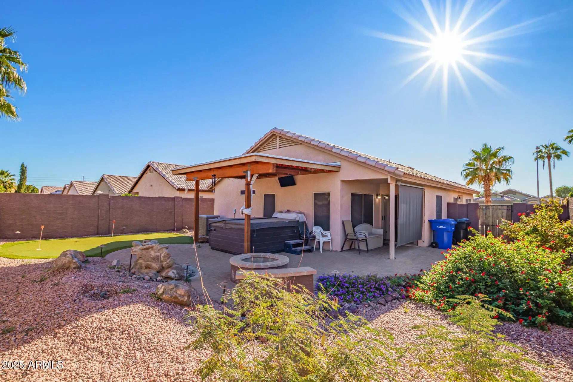 Cute 3 bedroom, 2 bath, 2 car garage home with backyard featuring pavers, fire pit and a putting green. Warm and inviting living spaces with wood-look flooring, vaulted ceilings, arched passageways, and a soothing palette that makes you want to stay. Whip up your signature dishes in the well-appointed kitchen, equipped with oak cabinetry, ample counter space, built-in appliances, and a pass-through window. The primary bedroom overlooks the back yard and features a remodeled tiled walk in shower and a walk-in closet. Out back, you'll have plenty of space for outdoor fun, including a cozy covered patio, a nice seating space with pavers and a putting green. Hard to find price point in Surprise!