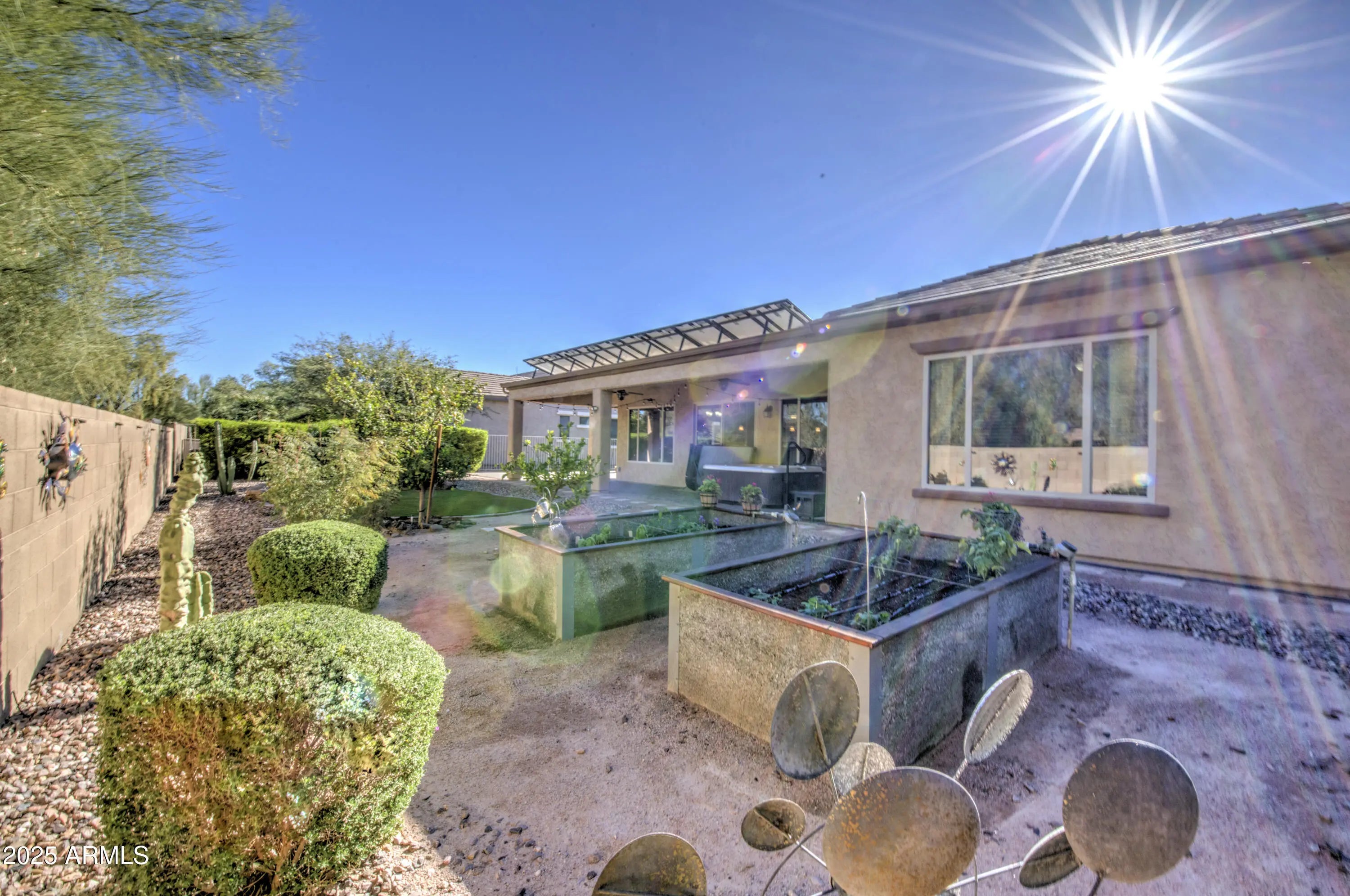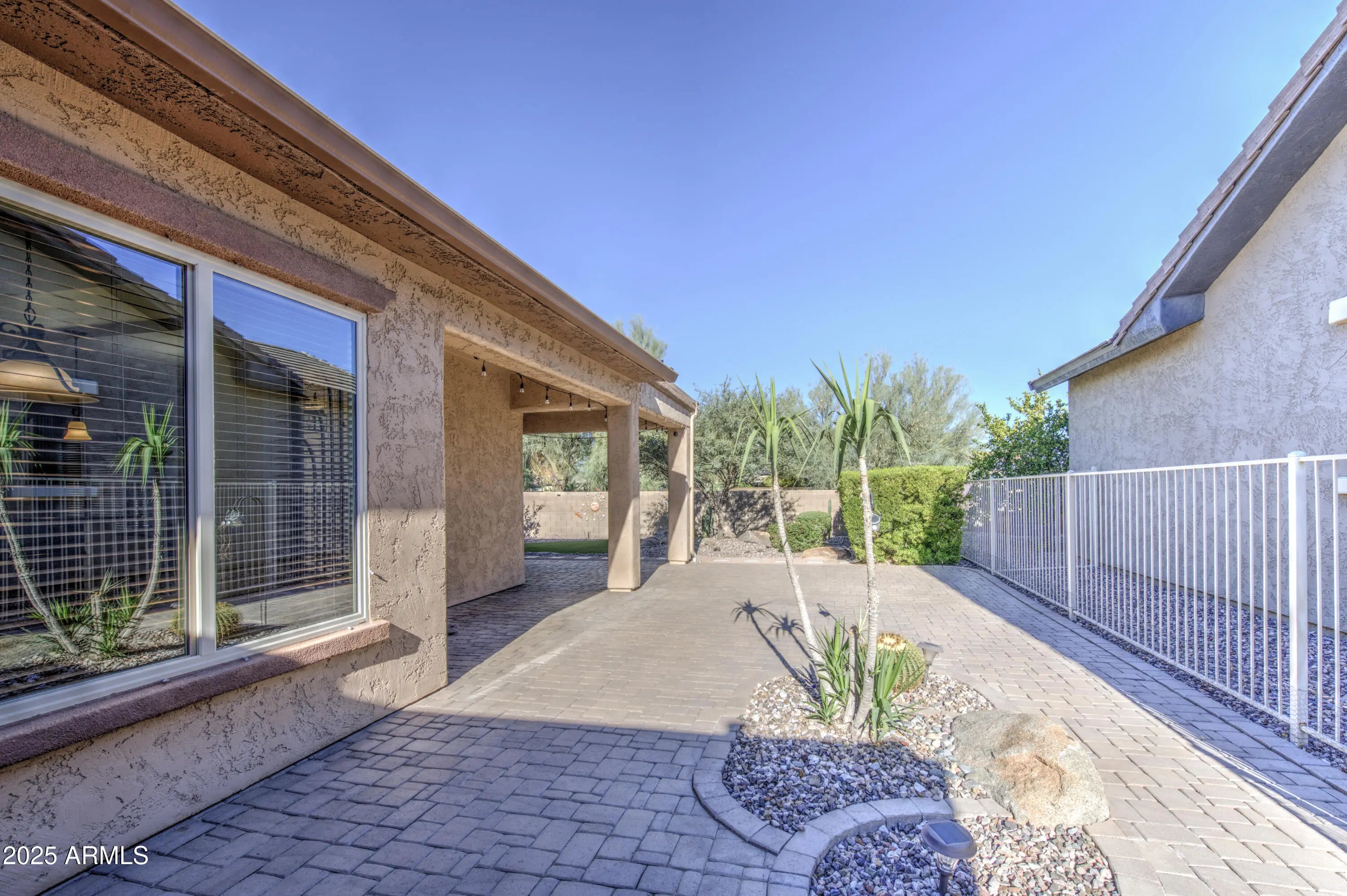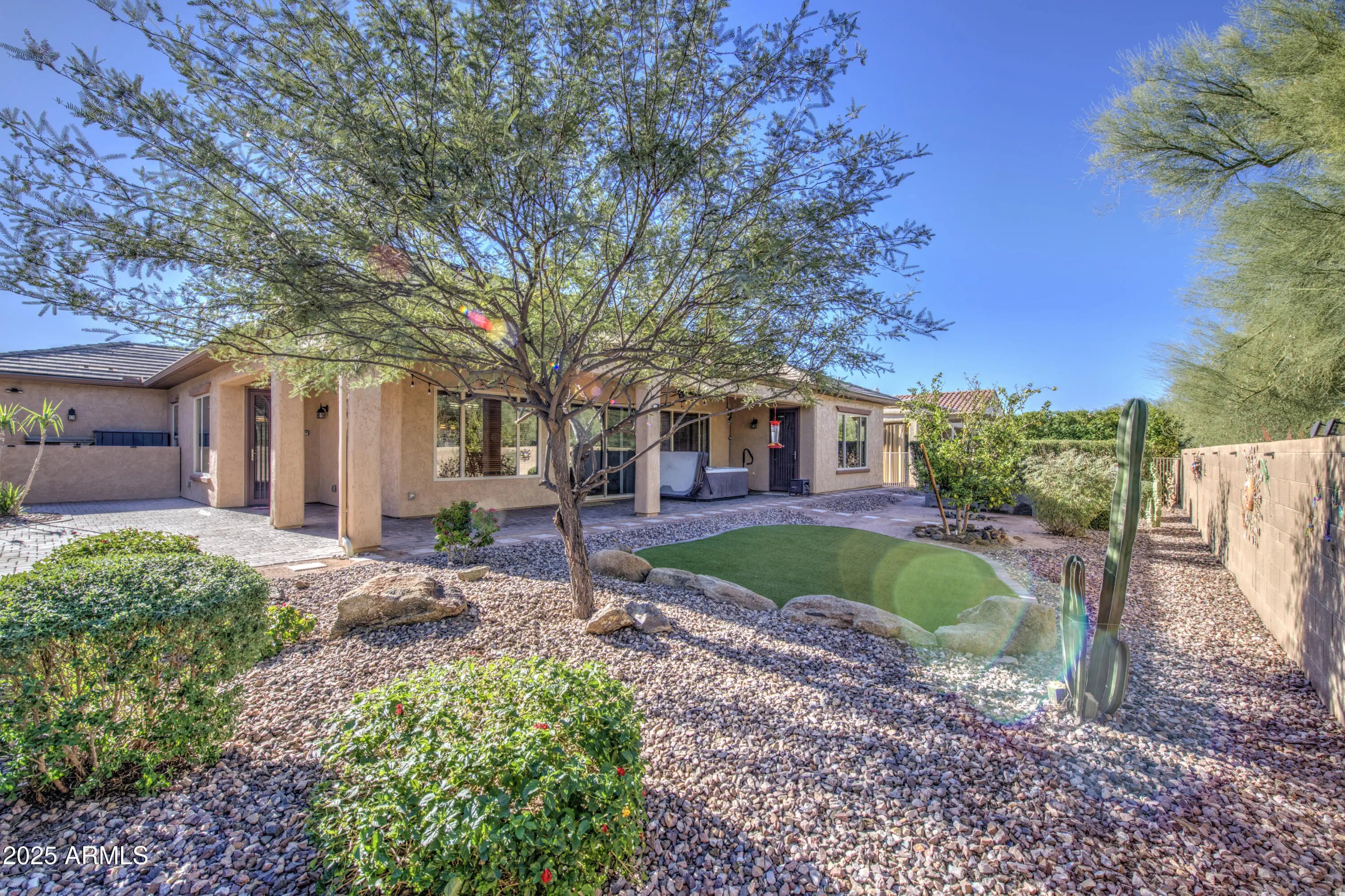 Stunning Lexington Model loaded with upgrades, located on a quiet, oversized cul-de-sac in the highly sought-after 55+ community of Anthem at Merrill Ranch. This beautiful 3-bedroom, 2.5-bath home offers exceptional indoor-outdoor living with thoughtfully designed, low-maintenance landscaping. The fully fenced and gated backyard with block wall provides privacy and space to relax or entertain. Outdoor features include paver patios in both the gated front courtyard and backyard, artificial turf, citrus trees, raised planter beds with irrigation, and patio lighting—creating a true desert oasis.Residents enjoy resort-style living with access to the Union Center amenities, including golf, pools, fitness center, pickleball and tennis courts & more. Shopping and hospital are within 2.5 miles. ,UV solar sun shades, and a Hot Spring Highlife Prodigy spa. Entertain with ease under the covered patio with misters, surrounded by multiple seating and entertaining areas. Step inside to 10 ft ceilings, solid-surface flooring with no carpet, ceiling fans in every room, and a true chef's kitchen featuring a Wolf 5-burner cooktop, double ovens, built-in microwave, staggered maple cabinets, soft-close doors with roll-outs, granite counters, and upper/lower cabinet lighting in both the kitchen and the wet bar/coffee bar area. Bosch refrigerator & Maytag Maxima washer & dryer. And so much more. Owned Solar, paid Florence bond, The 700 sq ft three-car garage features full-size doors, storage cabinets, epoxy flooring, a swamp cooler, ideal for hobbyists or storage enthusiasts. Charming Historic Florence, Arizona The Perfect Blend of History, Recreation, and Convenience. Located between Phoenix and Tucson, Florence is a picturesque town with a rich history dating back to 1866. Its quaint downtown and Main Street offer a variety of authentic dining options, boutique shopping, and local attractions, including the Windmill Winery, award-winning BBQ, and the famous Country Thunder festival. Outdoor enthusiasts will love Florence's easy access to desert landscapes for hiking, biking, off-road adventures, and horseback riding, as well as nearby lakes for fishing and water sports. Conveniently situated about an hour from Phoenix Sky Harbor Airport, Florence combines small-town charm with accessibility, making it ideal for weekend getaways, recreational living, or a serene place to call home.