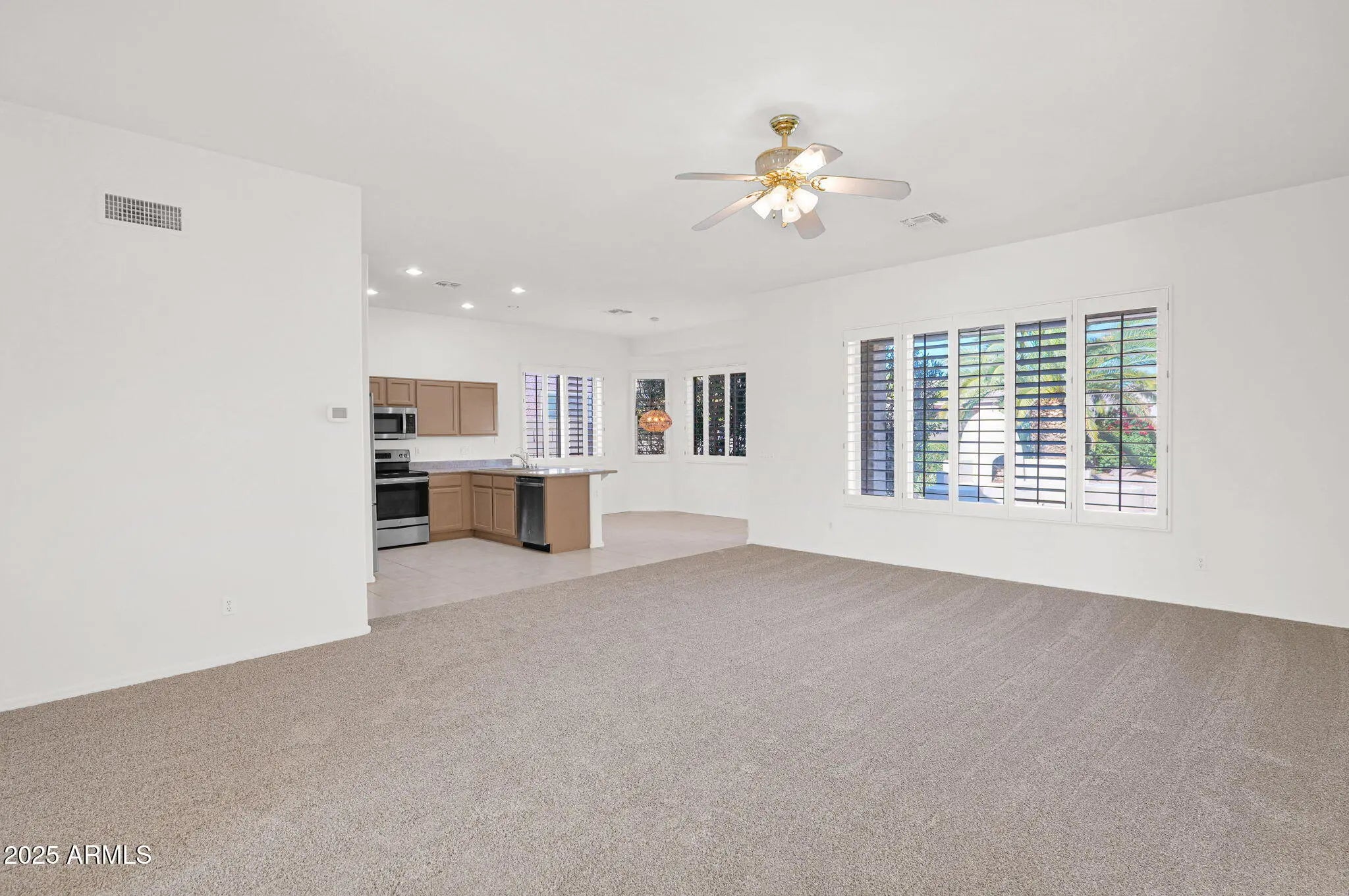 MOTIVATED SELLER! Beautifully updated 2 bed, 2 bath home in the gated 55+ Springfield Golf Community with an on-site guard. Fully repainted interior including cabinets and garage, plus new carpet, neutral tile, and plantation shutters throughout. Open-concept living offers a spacious great room, eat-in kitchen w/ stainless steel appliances, RO and inside laundry. Flex room is perfect for an office, hobby room, reading nook, or extra dining area. Large primary suite features a walk-in closet and a bath with separate shower and tub. plus a comfortable guest room and full bath. Situated on an oversized lot with a covered patio, fire pit, mature landscaping, and wide side gate. Community amenities include golf, 2 pools, spa, fitness, tennis, volleyball, clubhouse, restaurant, and activities.