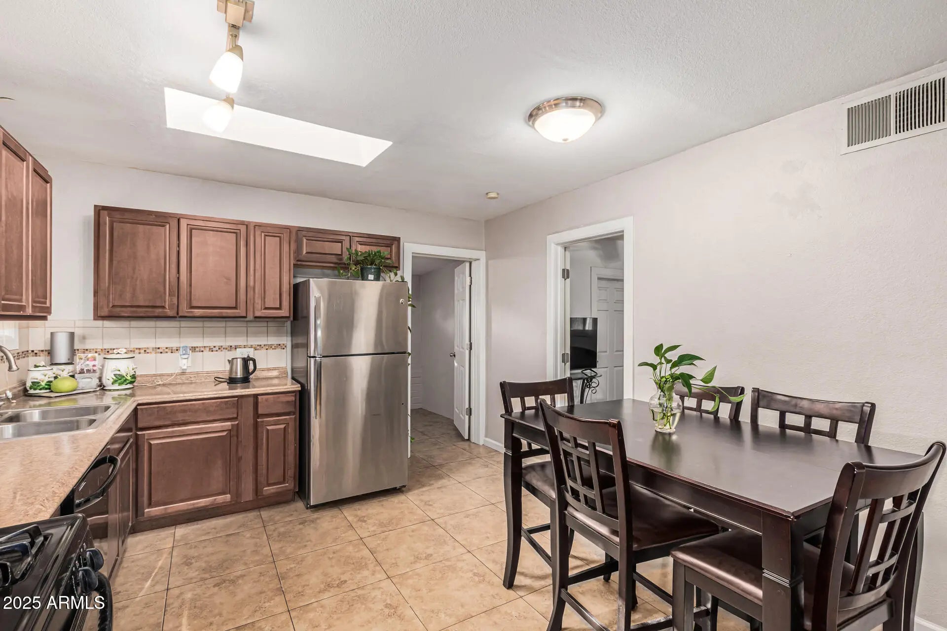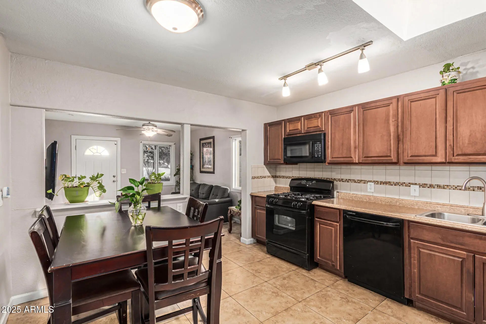 Seize the chance to own this charming 2-bedroom home in a fantastic location! You're greeted by a low-maintenance desert landscape, an RV gate, and a front patio that sets an inviting tone. Discover a serene living room with high ceilings, a soothing palette, and durable tile flooring. The eat-in kitchen features skylights for ample natural light, warm wood cabinetry, a tile backsplash, contemporary track lighting, and essential built-in appliances. Both bedrooms are cozy and well-sized, offering plush carpeting and a private retreat for a good night's sleep. Spend enchanting evenings in the backyard, which includes a spacious covered patio for dining al fresco and lush natural turf. Conveniently located close to bus stops, parks, restaurants, and shopping options. Make this yours today!