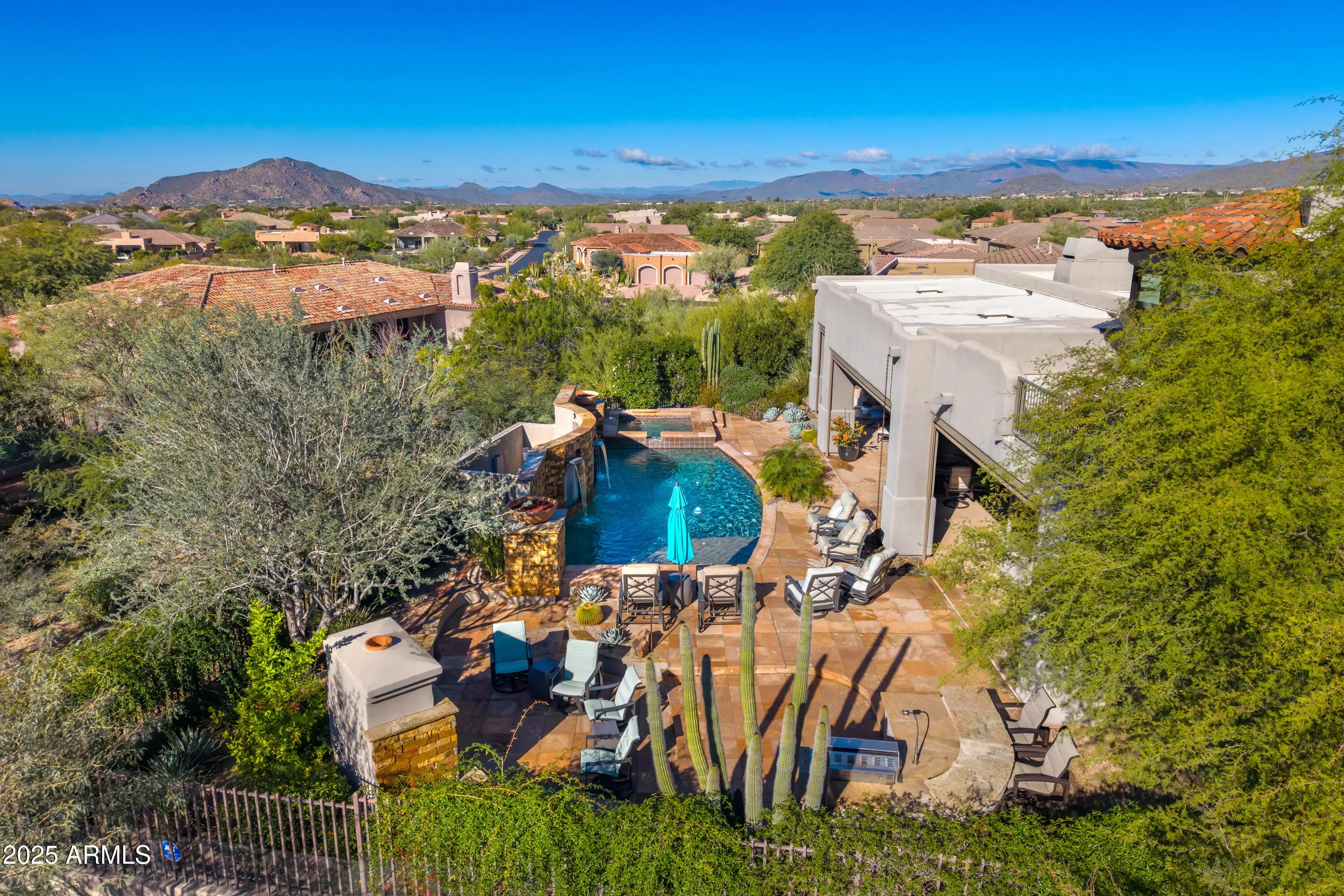 This exceptional custom-built residence located in Legend Trail, a prestigious master-planned golf community in North Scottsdale, specifically within the esteemed Legend Vista Estates. The home's elevated position offers breathtaking mountain views and city lights. Upon entering, you are immediately drawn to the expansive windows in the kitchen, dining room, and great room, all featuring remote-controlled window treatments. The property includes four bedrooms, three and a half bathrooms, a separate office, and a spacious three-car garage with a paver driveway and ample overhead storage. The gourmet kitchen is outfitted with top-of-the-line appliances, including a Sub-Zero refrigerator, double Dacor wall ovens, a Bosch dishwasher, a built-in Miele coffee station, a Wolf five-burner gas cooktop and microwave, and a built-in Monogram beverage cooler. The kitchen is further enhanced by a large copper vented hood, a copper salad sink, and an expansive central island, complemented by ample cabinetry and exquisite granite countertops. The great room features a floor-to-ceiling stone gas fireplace, while the master bedroom boasts its own fireplace with a mantel that matches the beamed ceiling. An additional large fireplace is available for enjoyment in the backyard. Outdoors, a large heated swimming pool and spa await, accompanied by a stunning water feature created by a large rock wall with scuppers. The expansive patio is equipped with electronic ceiling-to-floor shade screens, providing an ideal setting for relaxation and entertainment. The numerous upgrades and high-quality finishes make this property a must-see.