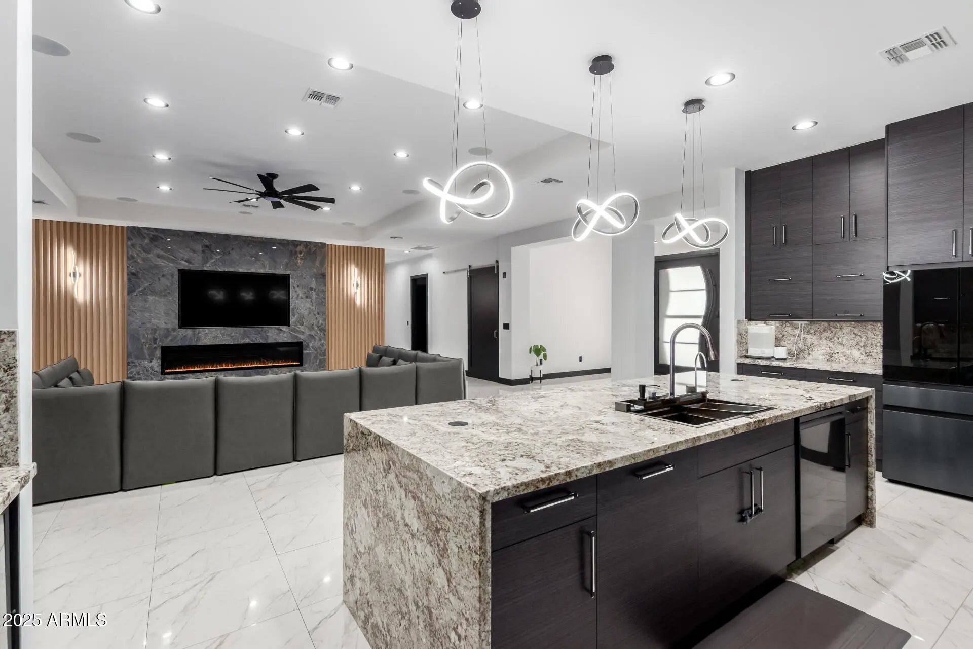 Beautifully built in 2023, this stunning home offers a modern open layout with a spacious kitchen featuring granite countertops, an oversized island, walk-in pantry, and a full laundry room. The primary suite includes a spa-style bathroom with a relaxing jacuzzi tub. The living room features an electric fireplace with a custom granite back wall, complete with built-in cinema audio and an integrated sound system for the perfect entertainment space. Enjoy plenty of parking with a 3-car garage plus additional space ideal for a RZR or Can-Am. The office includes a stylish barn door for added privacy. The backyard is ready to design with irrigation already installed, and the garage includes an electric car charging hookup. Truly move-in ready.