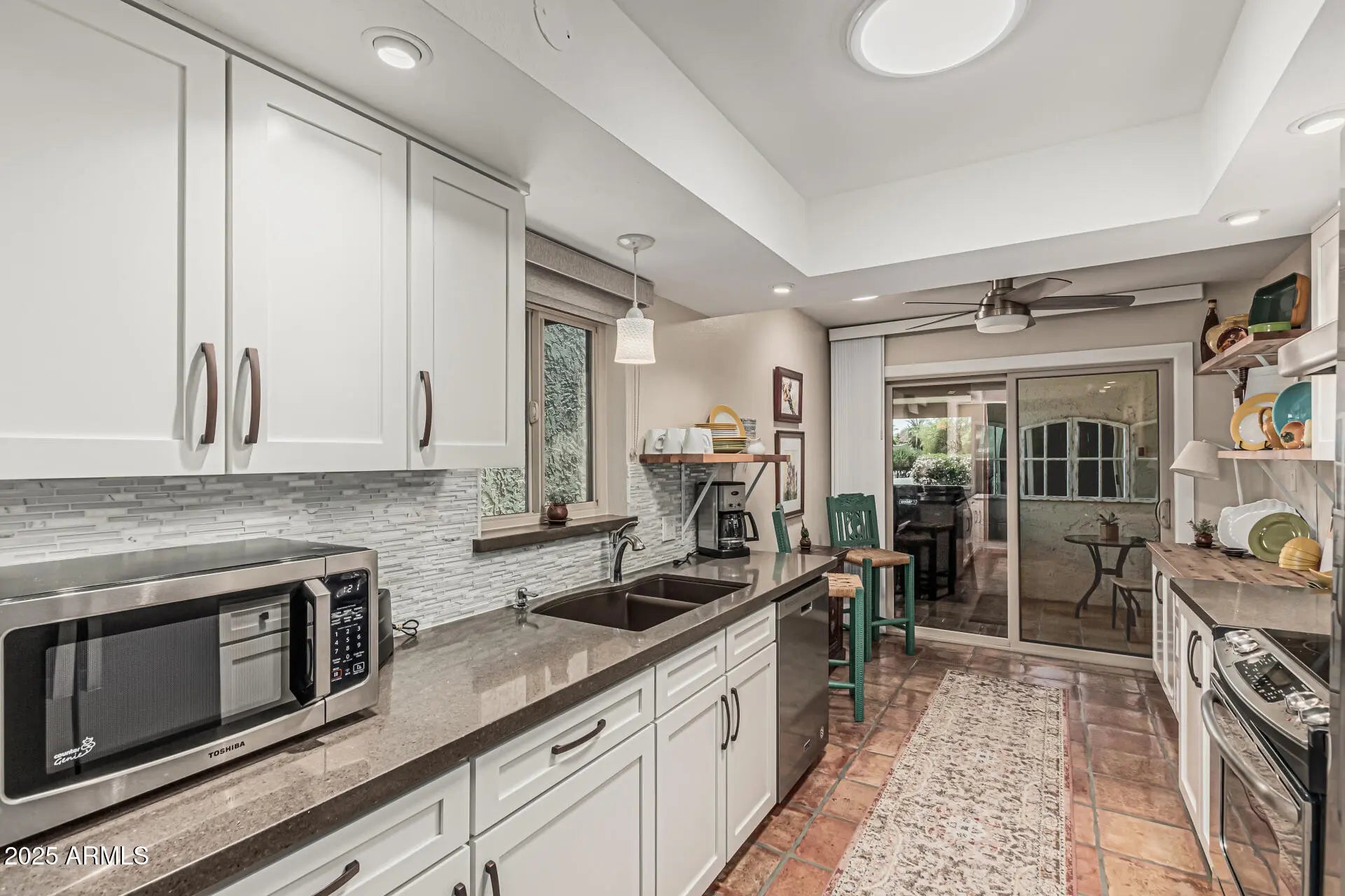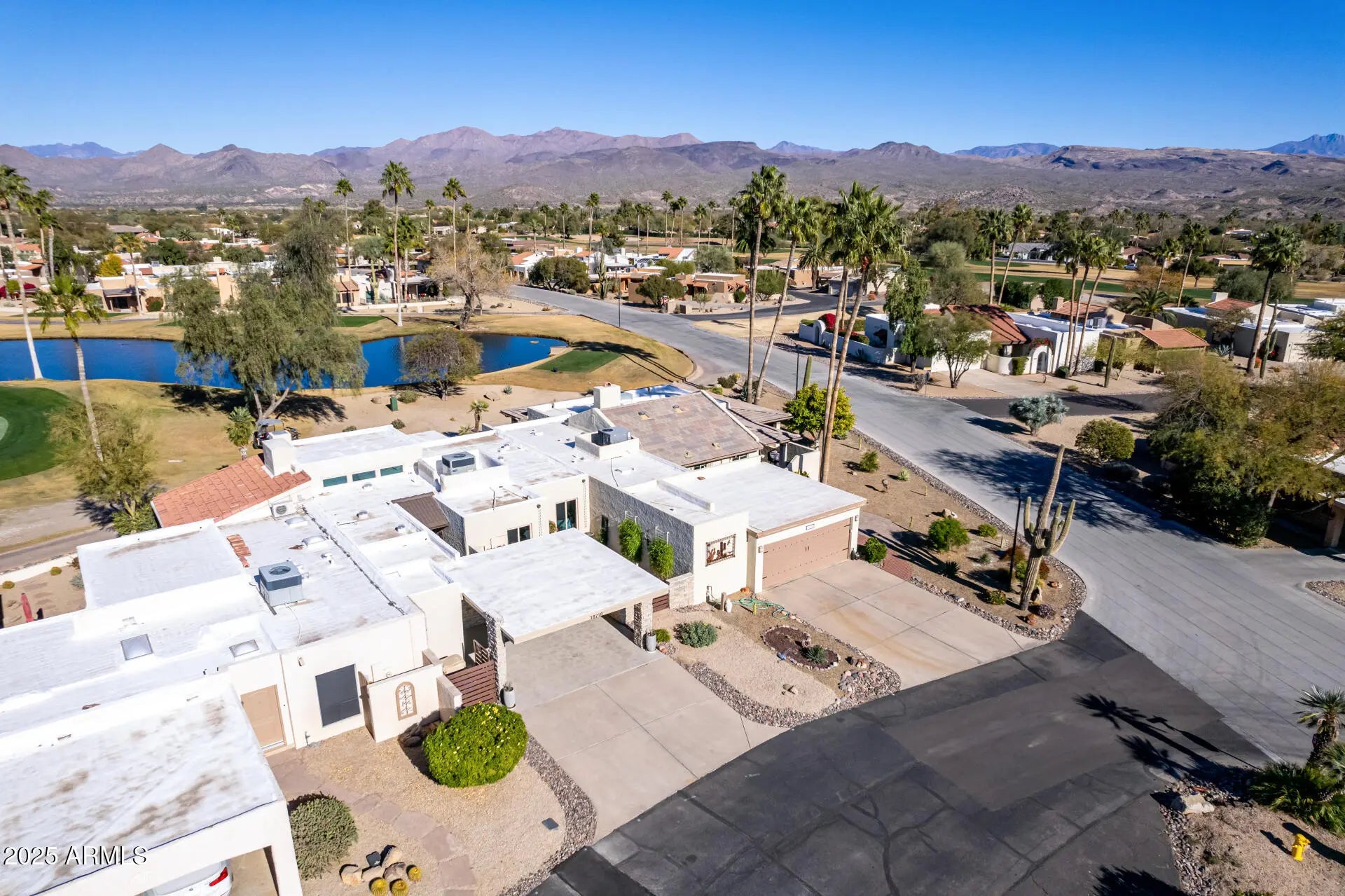 WOW! Discover the charm of this exquisite 3-bedroom gem located in the sought-after 55+ community of Rio Verde! A welcoming courtyard invites you in, setting the stage for the elegance within. Chic interior features vaulted ceilings, skylights, and tile flooring. Spacious living area is anchored by a stunning stone-accented fireplace. Delightful kitchen is a chef's dream, equipped with stainless steel appliances, granite counters, a mosaic tile backsplash, and crisp white cabinetry. Enjoy gourmet meals in the inviting dining area. The relaxing primary retreat offers direct backyard access and an ensuite, creating a serene escape. Unwind in the tranquil backyard and take in breathtaking views of the golf course, lake, and mountains, an ideal spot for peaceful afternoons. Just became availa