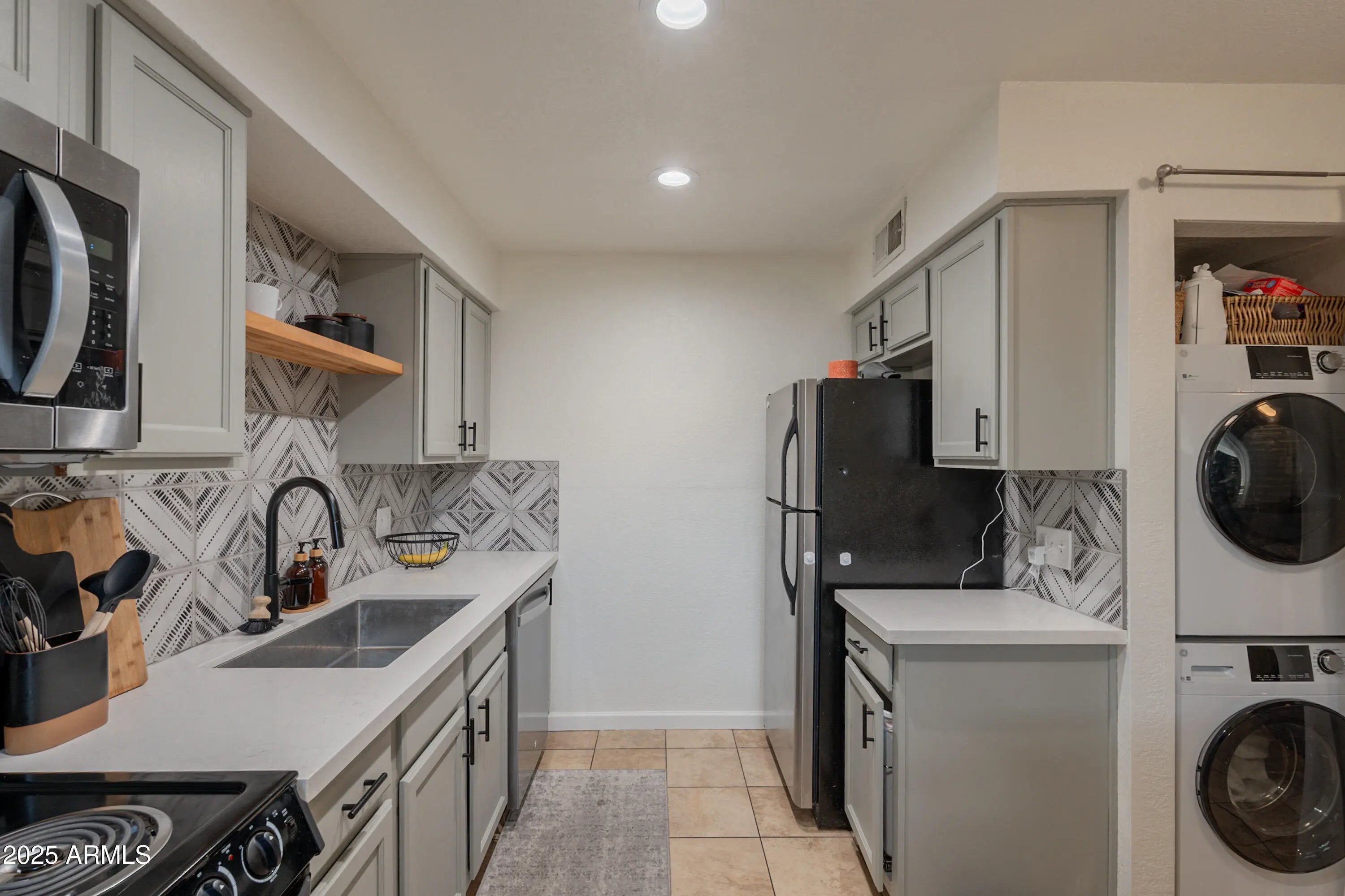 Stacked Washer/Dryer, Refrigerator, Built-in Microwave, Dishwasher, Disposal