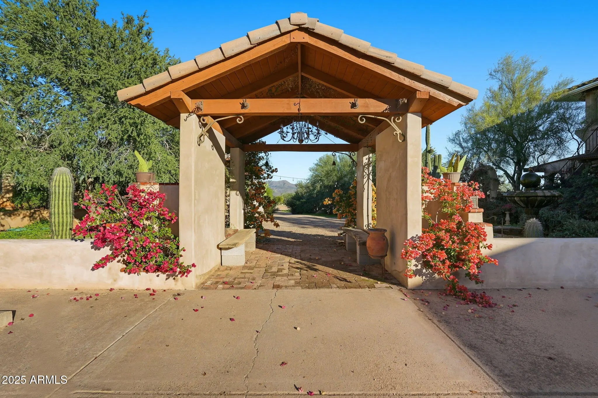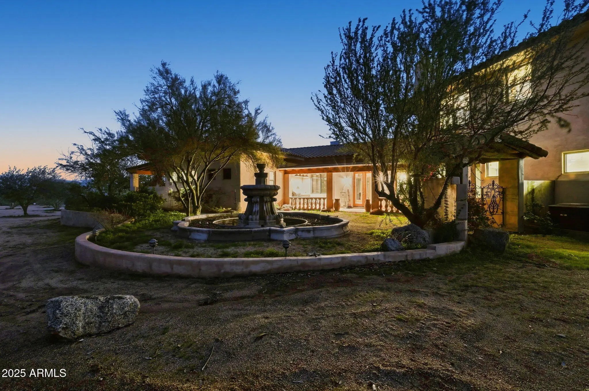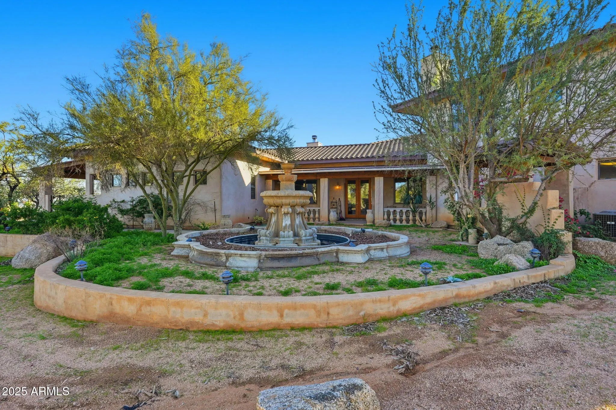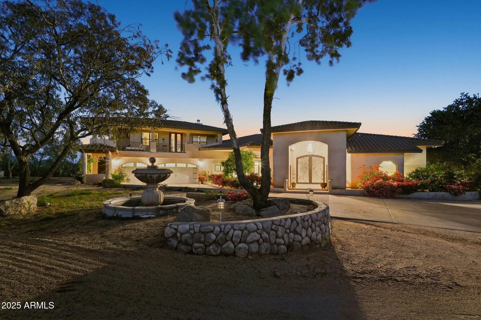 Remarkable property on a 4.6-acre lot! This gem is surrounded by desert trees galore & breathtaking mountain views. Discover a collection of garages, including a 3-car garage, a 2-car garage, & a dedicated RV garage for all your vehicles. A double iron work door introduces an interior rich with character, highlighted by stone floors, beamed ceilings, multiple fireplaces, built-in bookcases, recessed lighting, surround sound speakers, & sophisticated architectural details. The welcoming living room & formal dining area create an inviting ambiance for entertaining! Gourmet kitchen showcases SS appliances, granite counters, a two-tier island with breakfast bar, & a generous walk-in pantry. Split main bedroom provides a restful escape, complete with a walk-in closet & a spa-like bathroom. Outdoor living is elevated with adorable fountains, multiple seating areas, enchanting balconies, covered patios, & built-in BBQs for enjoying alfresco gatherings. Perfect for multi-generational living or guests, the property features both detached & attached casitas, each equipped with its own kitchen, bedrooms, & bathrooms. For the equestrian enthusiast, the grounds include horse corrals & stalls, as well as a dedicated garden area that further enhances this estate's unique charm. This extraordinary property won't last long!