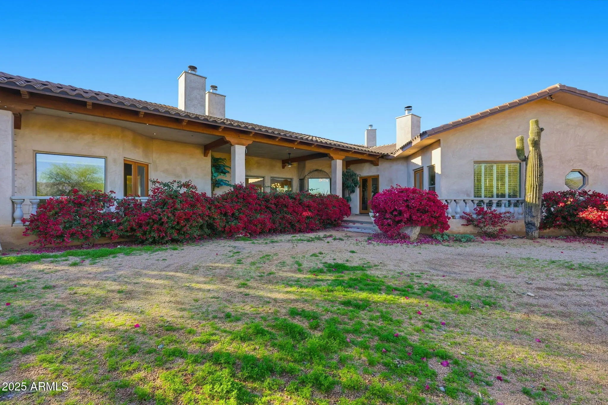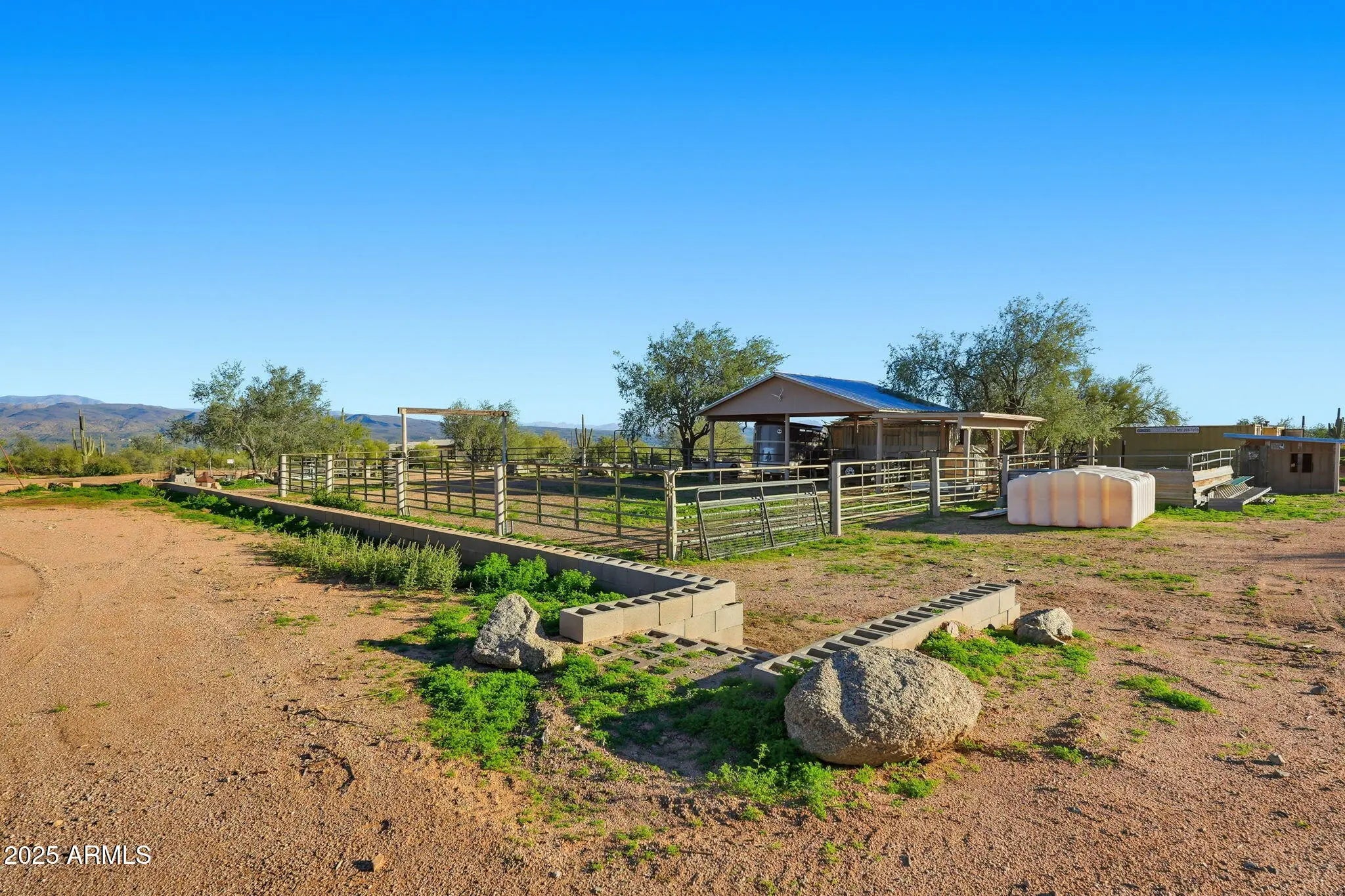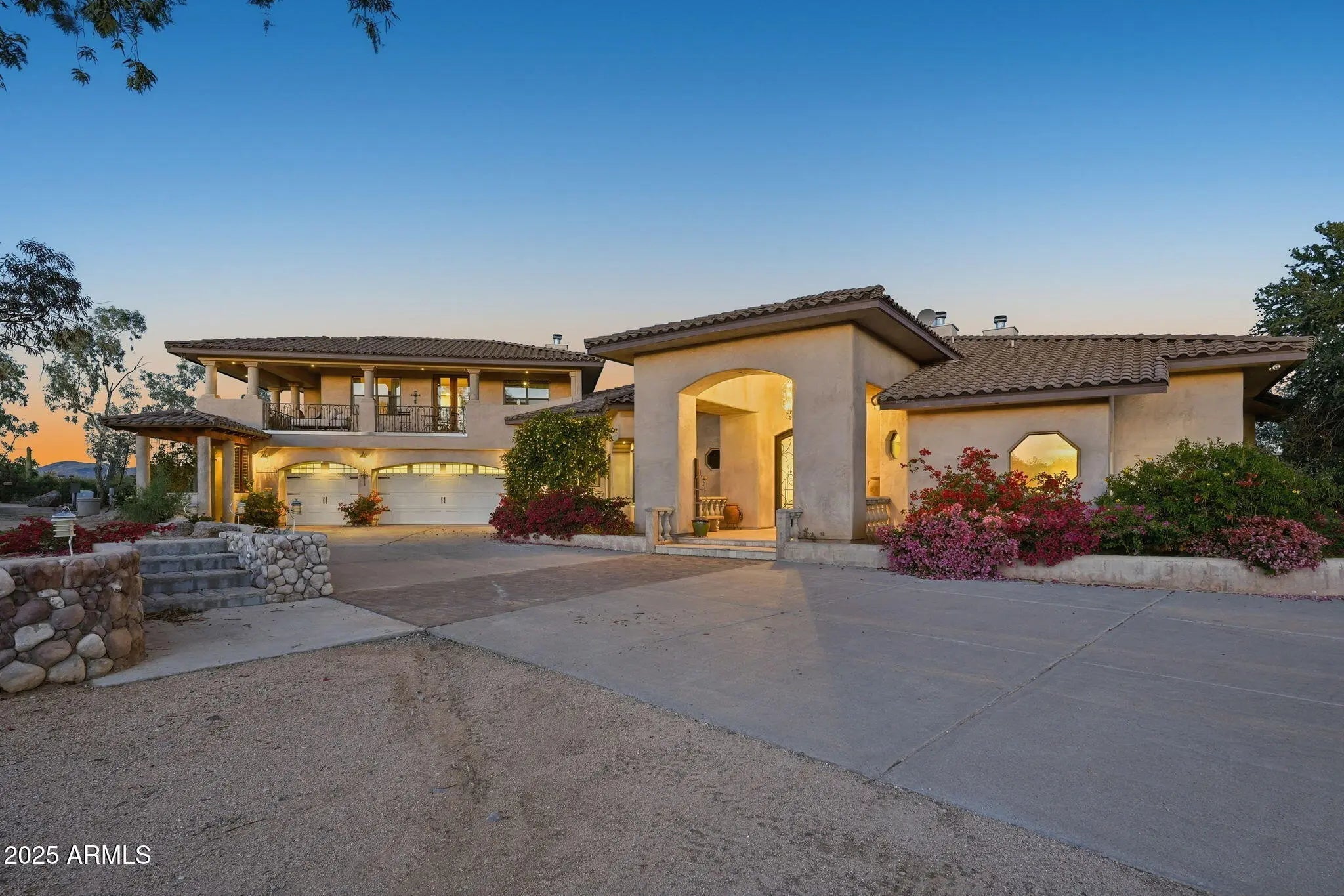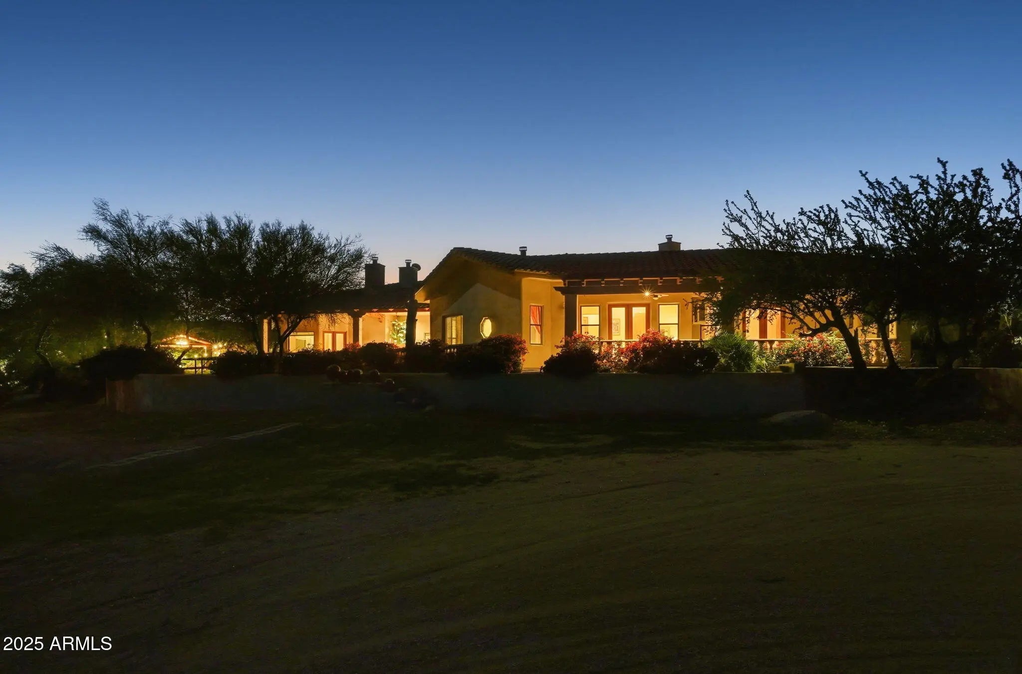 Remarkable property on a 4.6-acre lot! This gem is surrounded by desert trees galore & breathtaking mountain views. Discover a collection of garages, including a 3-car garage, a 2-car garage, & a dedicated RV garage for all your vehicles. A double iron work door introduces an interior rich with character, highlighted by stone floors, beamed ceilings, multiple fireplaces, built-in bookcases, recessed lighting, surround sound speakers, & sophisticated architectural details. The welcoming living room & formal dining area create an inviting ambiance for entertaining! Gourmet kitchen showcases SS appliances, granite counters, a two-tier island with breakfast bar, & a generous walk-in pantry. Split main bedroom provides a restful escape, complete with a walk-in closet & a spa-like bathroom. Outdoor living is elevated with adorable fountains, multiple seating areas, enchanting balconies, covered patios, & built-in BBQs for enjoying alfresco gatherings. Perfect for multi-generational living or guests, the property features both detached & attached casitas, each equipped with its own kitchen, bedrooms, & bathrooms. For the equestrian enthusiast, the grounds include horse corrals & stalls, as well as a dedicated garden area that further enhances this estate's unique charm. This extraordinary property won't last long!