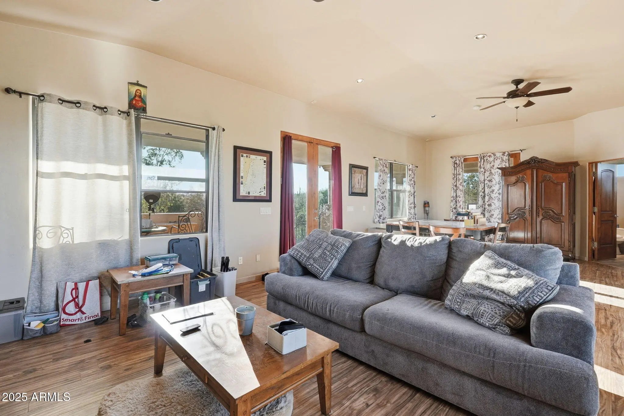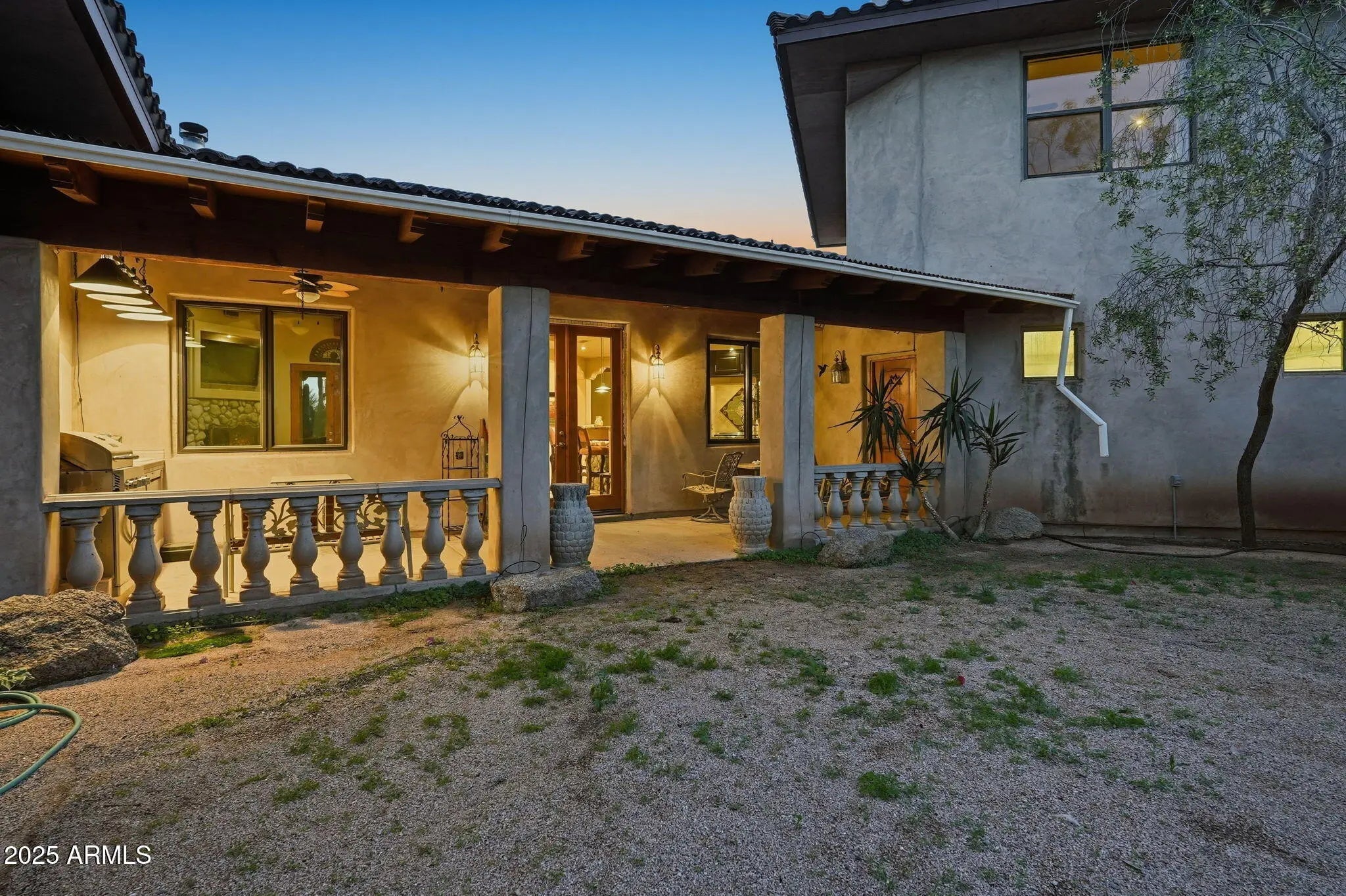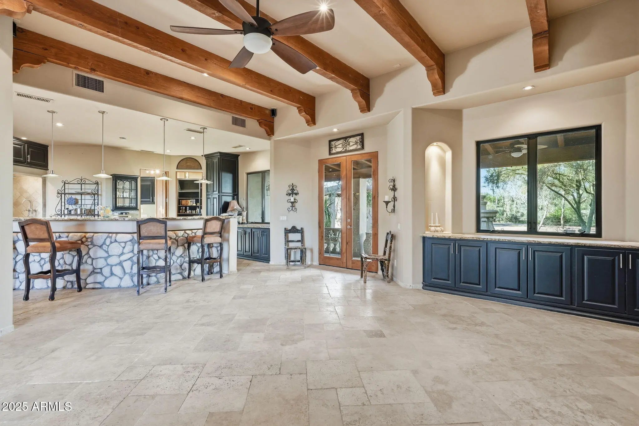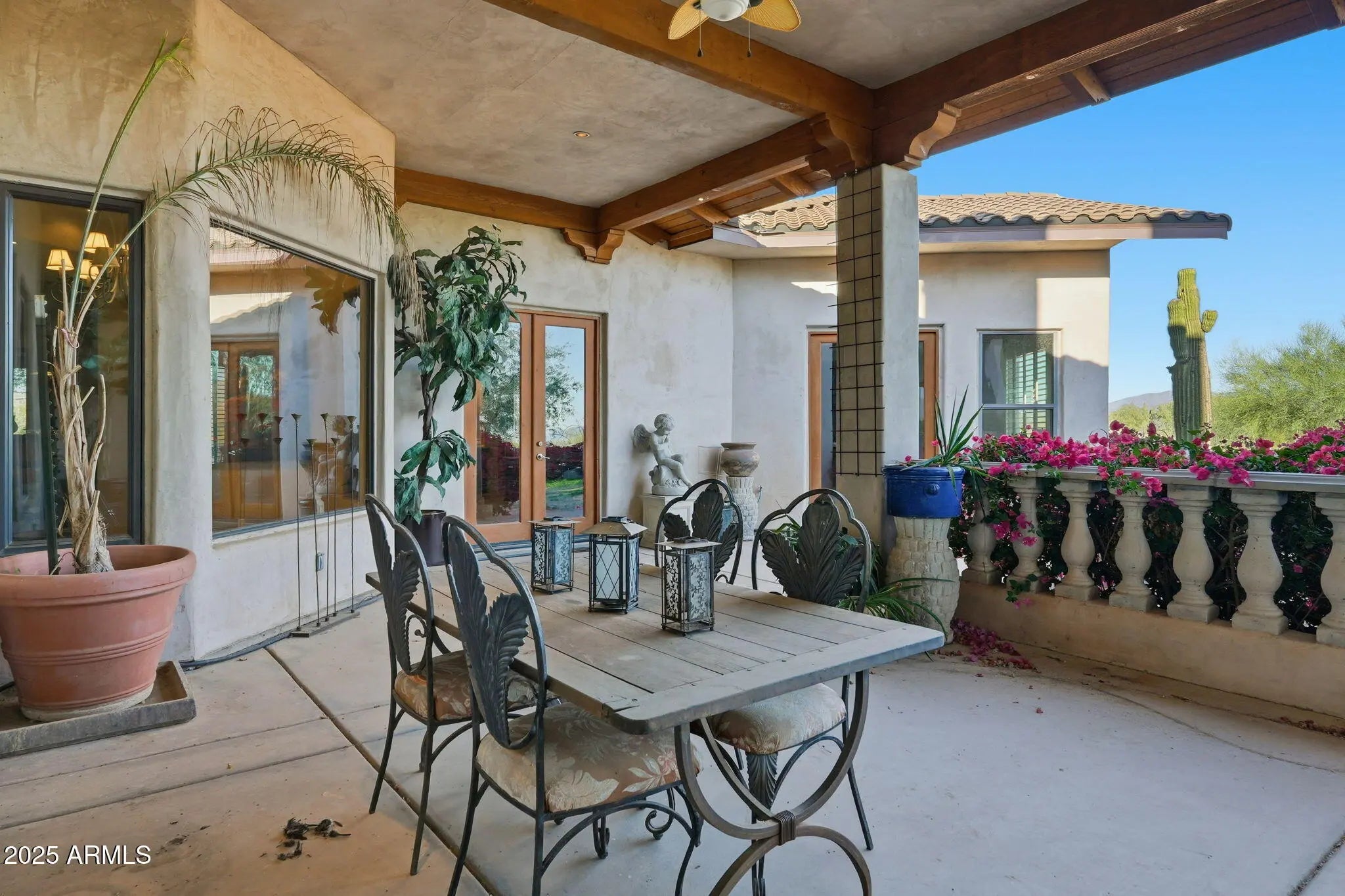 Remarkable property on a 4.6-acre lot! This gem is surrounded by desert trees galore & breathtaking mountain views. Discover a collection of garages, including a 3-car garage, a 2-car garage, & a dedicated RV garage for all your vehicles. A double iron work door introduces an interior rich with character, highlighted by stone floors, beamed ceilings, multiple fireplaces, built-in bookcases, recessed lighting, surround sound speakers, & sophisticated architectural details. The welcoming living room & formal dining area create an inviting ambiance for entertaining! Gourmet kitchen showcases SS appliances, granite counters, a two-tier island with breakfast bar, & a generous walk-in pantry. Split main bedroom provides a restful escape, complete with a walk-in closet & a spa-like bathroom. Outdoor living is elevated with adorable fountains, multiple seating areas, enchanting balconies, covered patios, & built-in BBQs for enjoying alfresco gatherings. Perfect for multi-generational living or guests, the property features both detached & attached casitas, each equipped with its own kitchen, bedrooms, & bathrooms. For the equestrian enthusiast, the grounds include horse corrals & stalls, as well as a dedicated garden area that further enhances this estate's unique charm. This extraordinary property won't last long!
