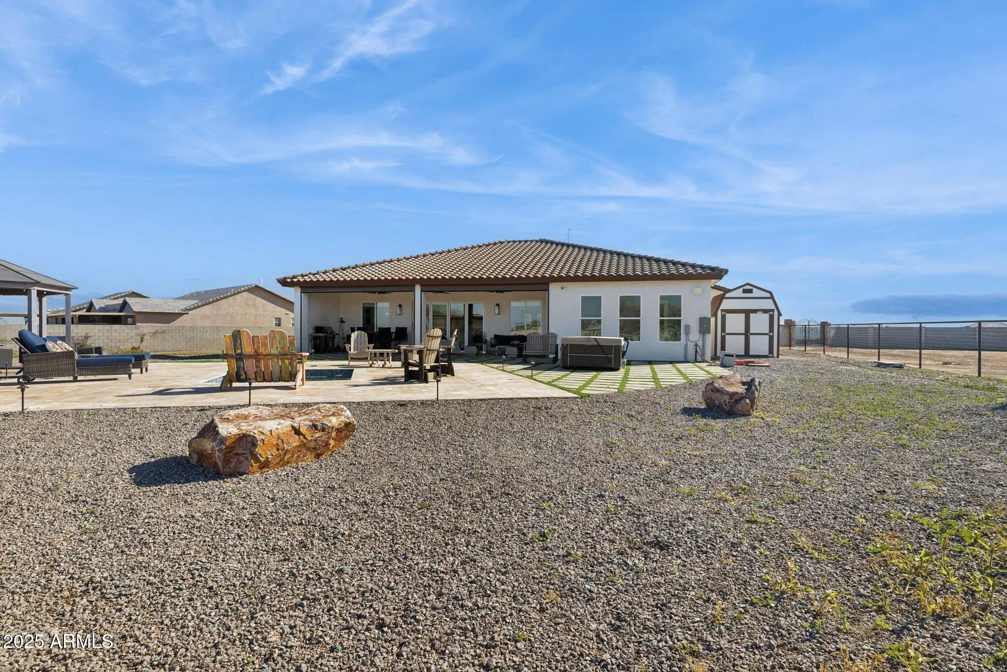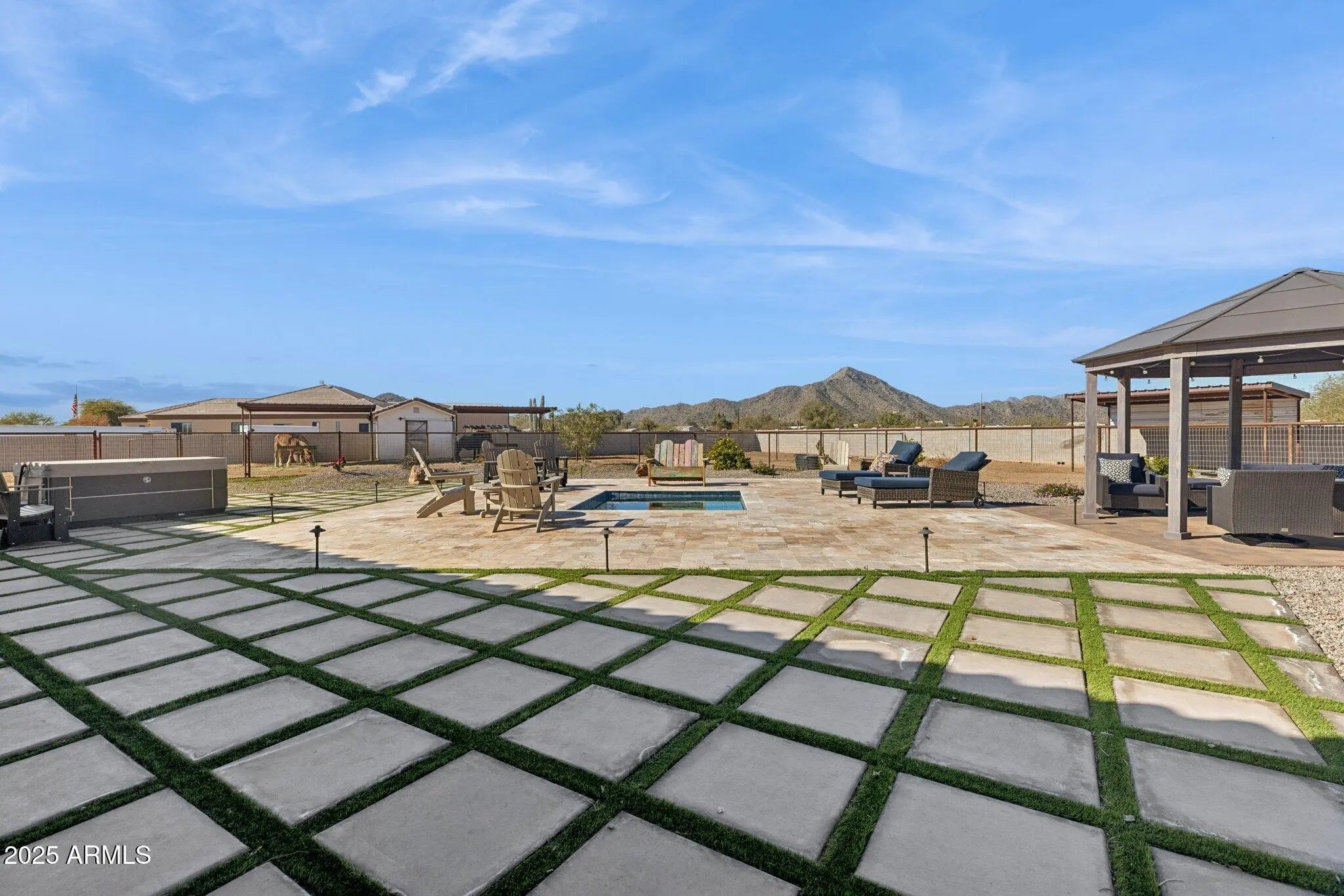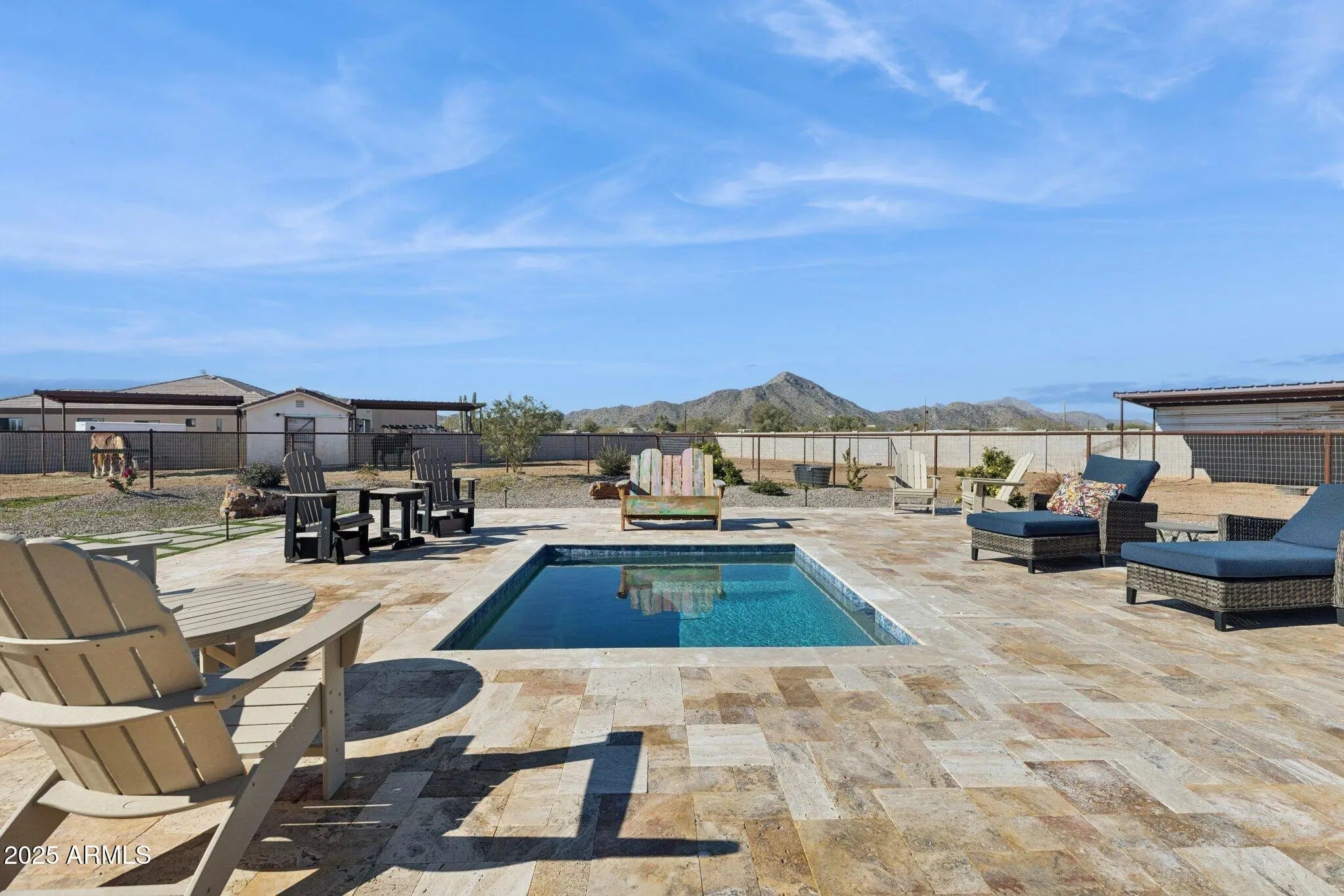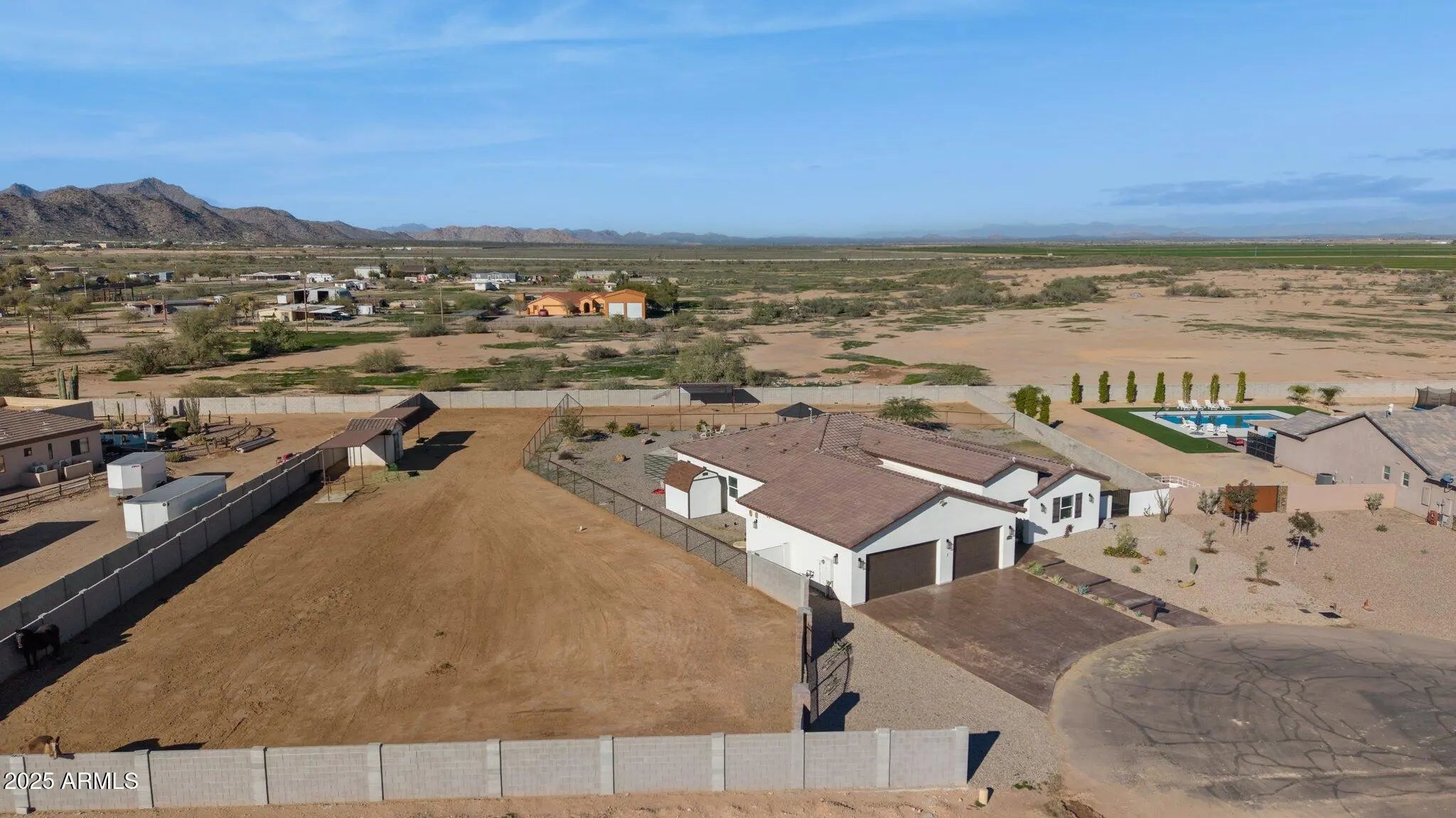 NO HOA! MOUNTAIN VIEWS! Welcome to this custom built 3 bedroom, 3.5 bath home situated on a full acre. Thoughtfully designed with superior craftsmanship and attention to detail, this unique property offers the perfect blend of luxury, space, and functionality. Upon arrival, decorative iron doors welcome you into a grand living room filled with natural light and highlighted by elegant marble tile flooring. The open layout flows seamlessly into a chef-inspired kitchen featuring rich granite countertops, stainless steel appliances, a high-end gas range with custom hood, stylish backsplash, and a spacious island made for gathering and entertaining. The primary suite is a private retreat with upgraded lighting, custom blinds, and an oversized walk-in shower. Two additional guest bedrooms each include their own private bathrooms offering exceptional comfort and privacy while a convenient half bath adds to the home's thoughtful design. Step outside to a fully fenced backyard designed with versatility in mind. The expansive area offers ample space for RV parking and all your outdoor toys. It also includes shelters, a tack room, and wash rack should you prefer horses. And custom iron gates provide easy access. Whether you're storing, riding, or exploring this property is built to support an active lifestyle. A covered patio overlooks the open landscape and provides the perfect place to relax, along with a plunge pool and above-ground spa for year- round enjoyment. With plenty of room to enjoy wide-open spaces and scenery along with the freedom of NO HOA, this property is a rare find in Coolidge.