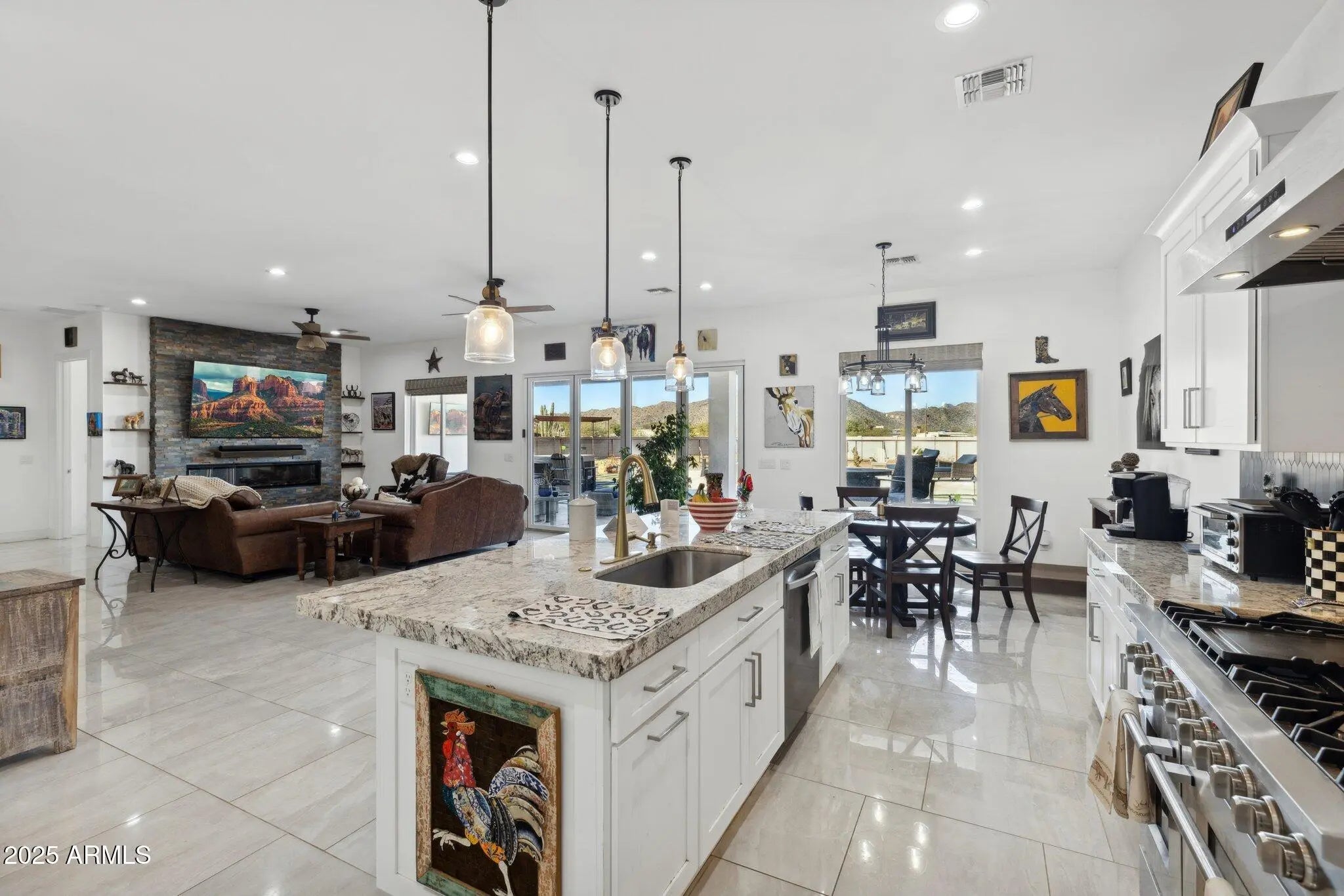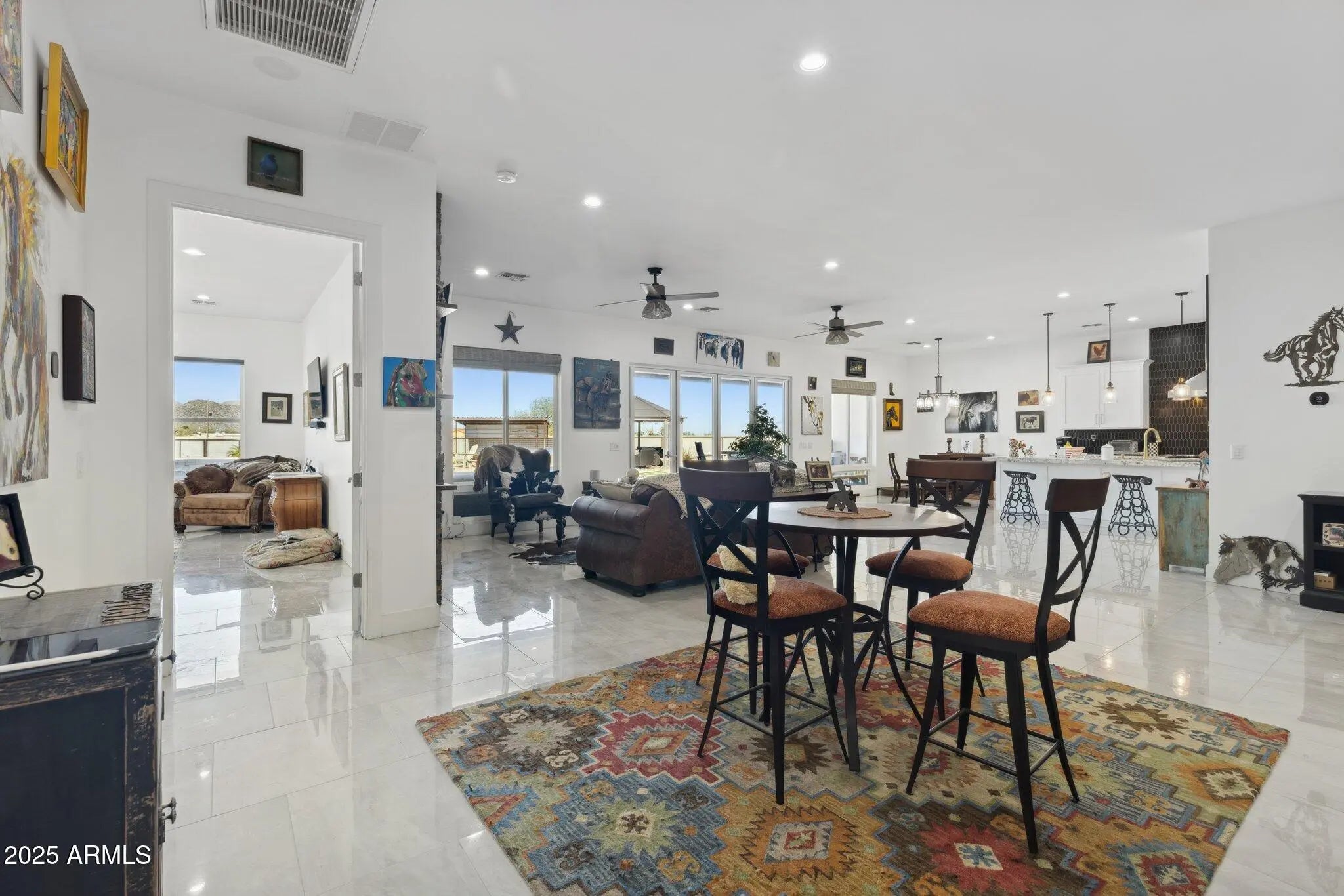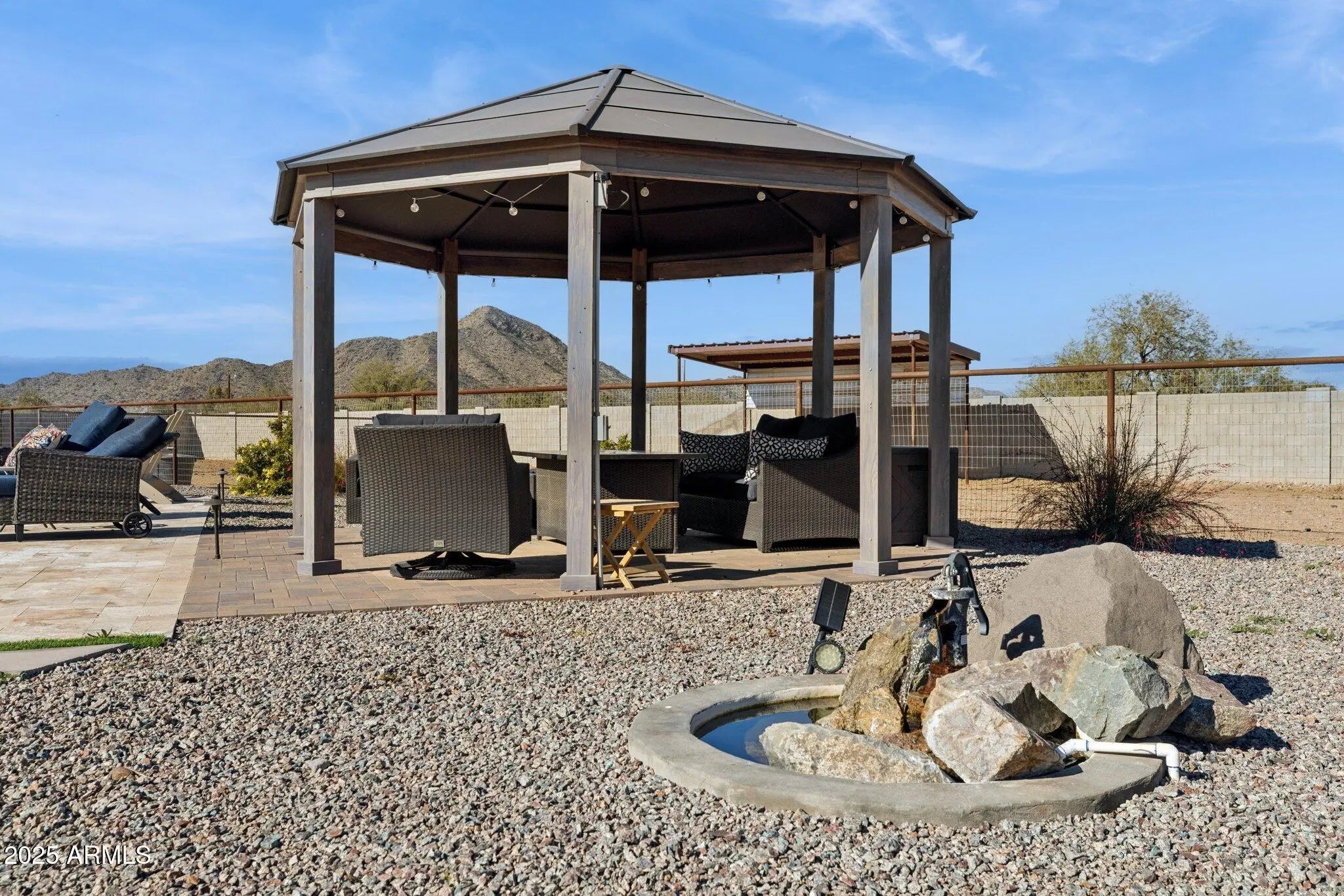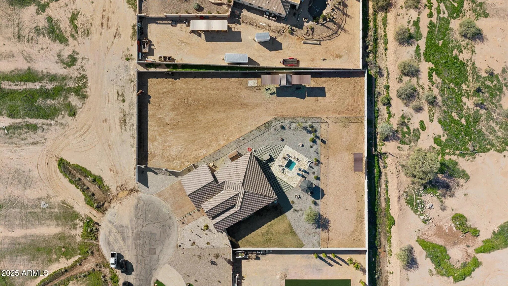 NO HOA! MOUNTAIN VIEWS! Welcome to this custom built 3 bedroom, 3.5 bath home situated on a full acre. Thoughtfully designed with superior craftsmanship and attention to detail, this unique property offers the perfect blend of luxury, space, and functionality. Upon arrival, decorative iron doors welcome you into a grand living room filled with natural light and highlighted by elegant marble tile flooring. The open layout flows seamlessly into a chef-inspired kitchen featuring rich granite countertops, stainless steel appliances, a high-end gas range with custom hood, stylish backsplash, and a spacious island made for gathering and entertaining. The primary suite is a private retreat with upgraded lighting, custom blinds, and an oversized walk-in shower. Two additional guest bedrooms each include their own private bathrooms offering exceptional comfort and privacy while a convenient half bath adds to the home's thoughtful design. Step outside to a fully fenced backyard designed with versatility in mind. The expansive area offers ample space for RV parking and all your outdoor toys. It also includes shelters, a tack room, and wash rack should you prefer horses. And custom iron gates provide easy access. Whether you're storing, riding, or exploring this property is built to support an active lifestyle. A covered patio overlooks the open landscape and provides the perfect place to relax, along with a plunge pool and above-ground spa for year- round enjoyment. With plenty of room to enjoy wide-open spaces and scenery along with the freedom of NO HOA, this property is a rare find in Coolidge.