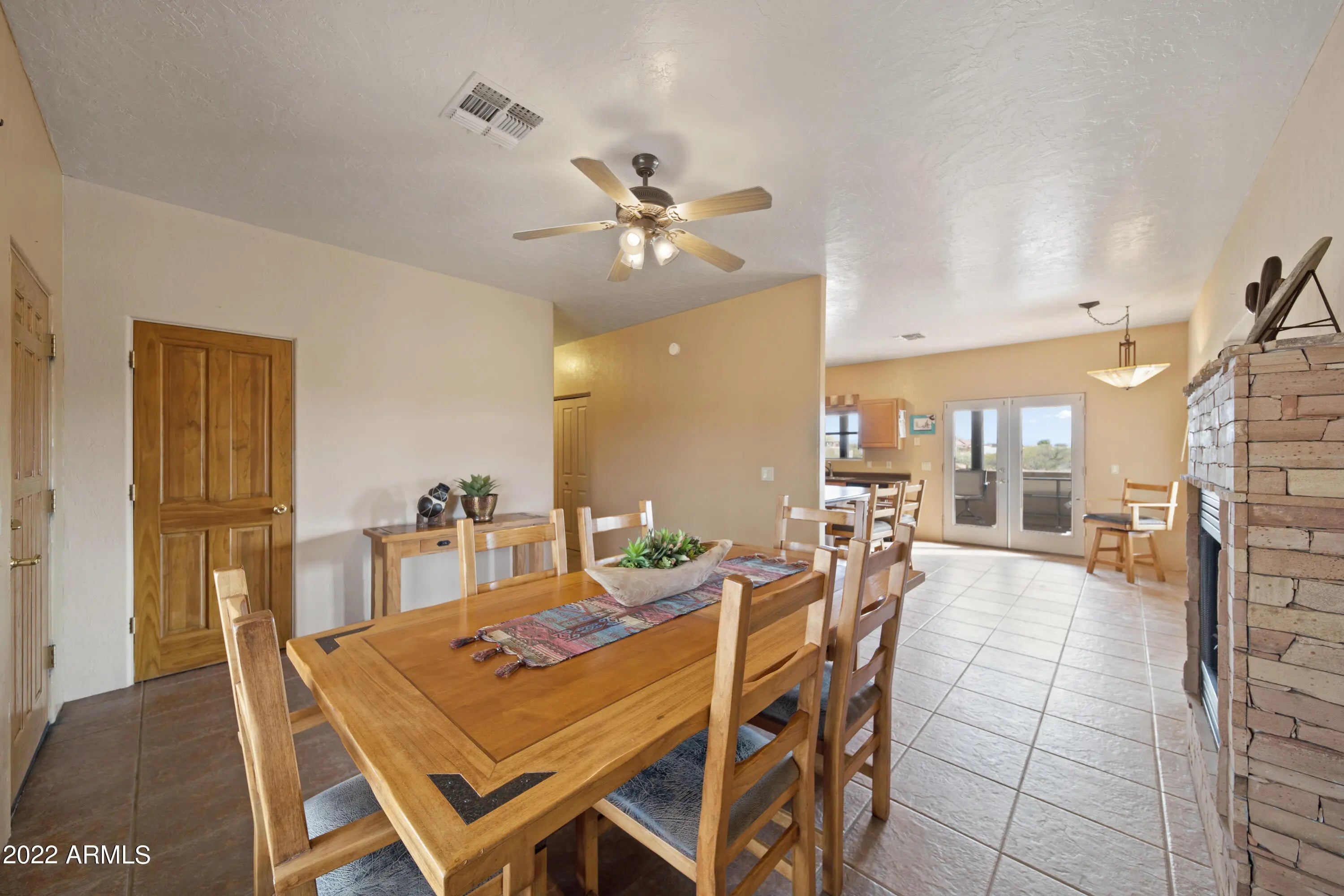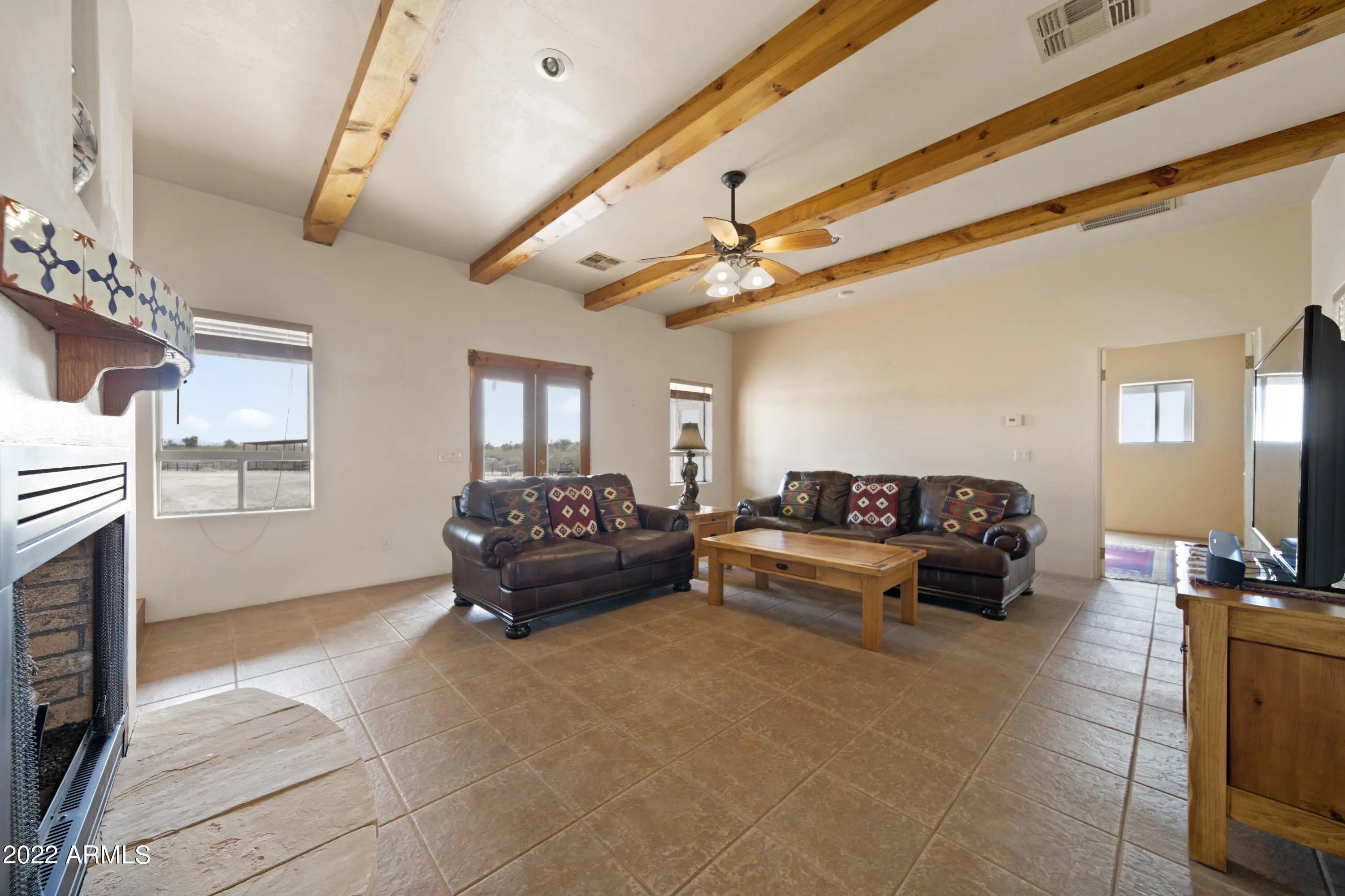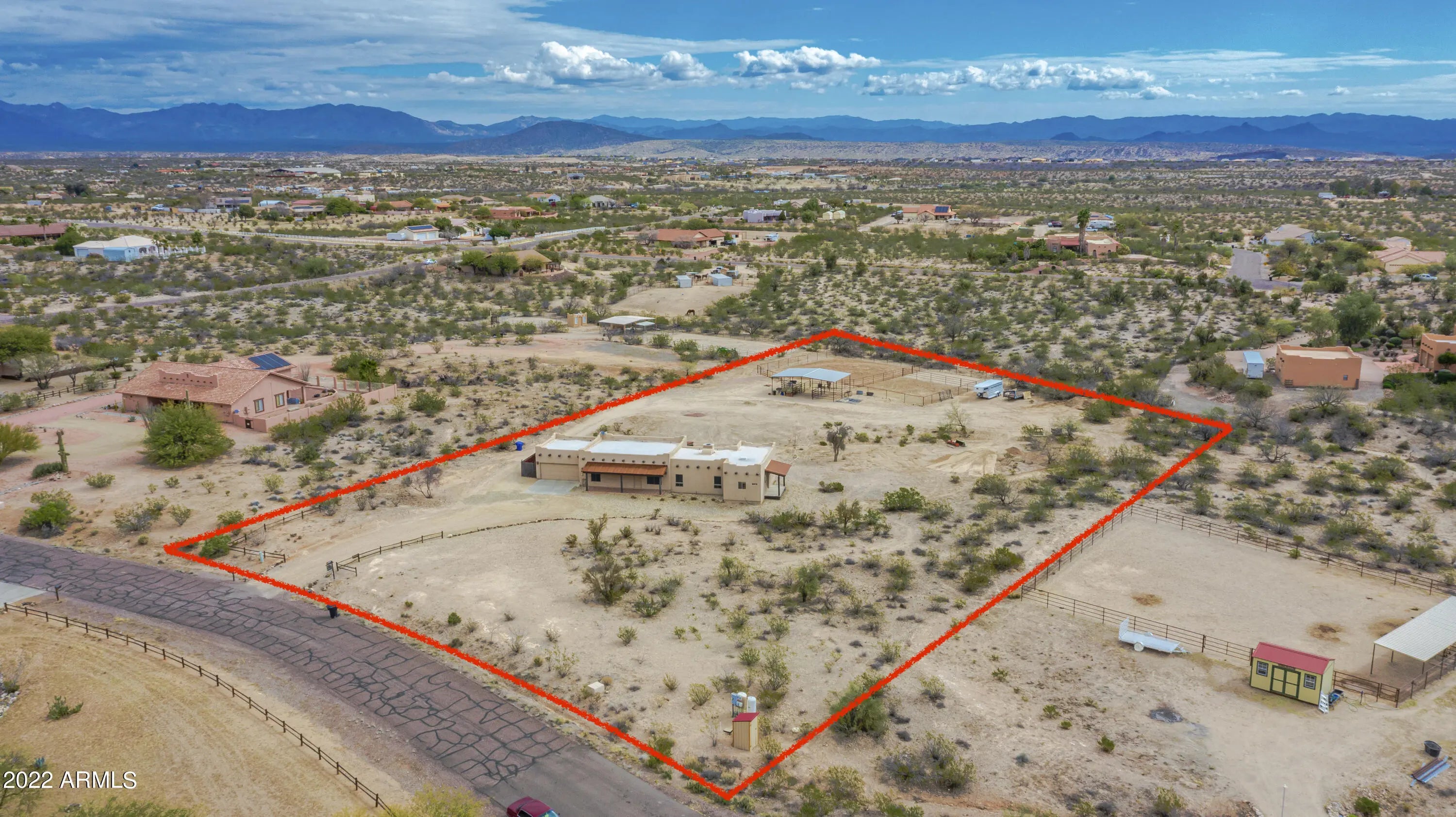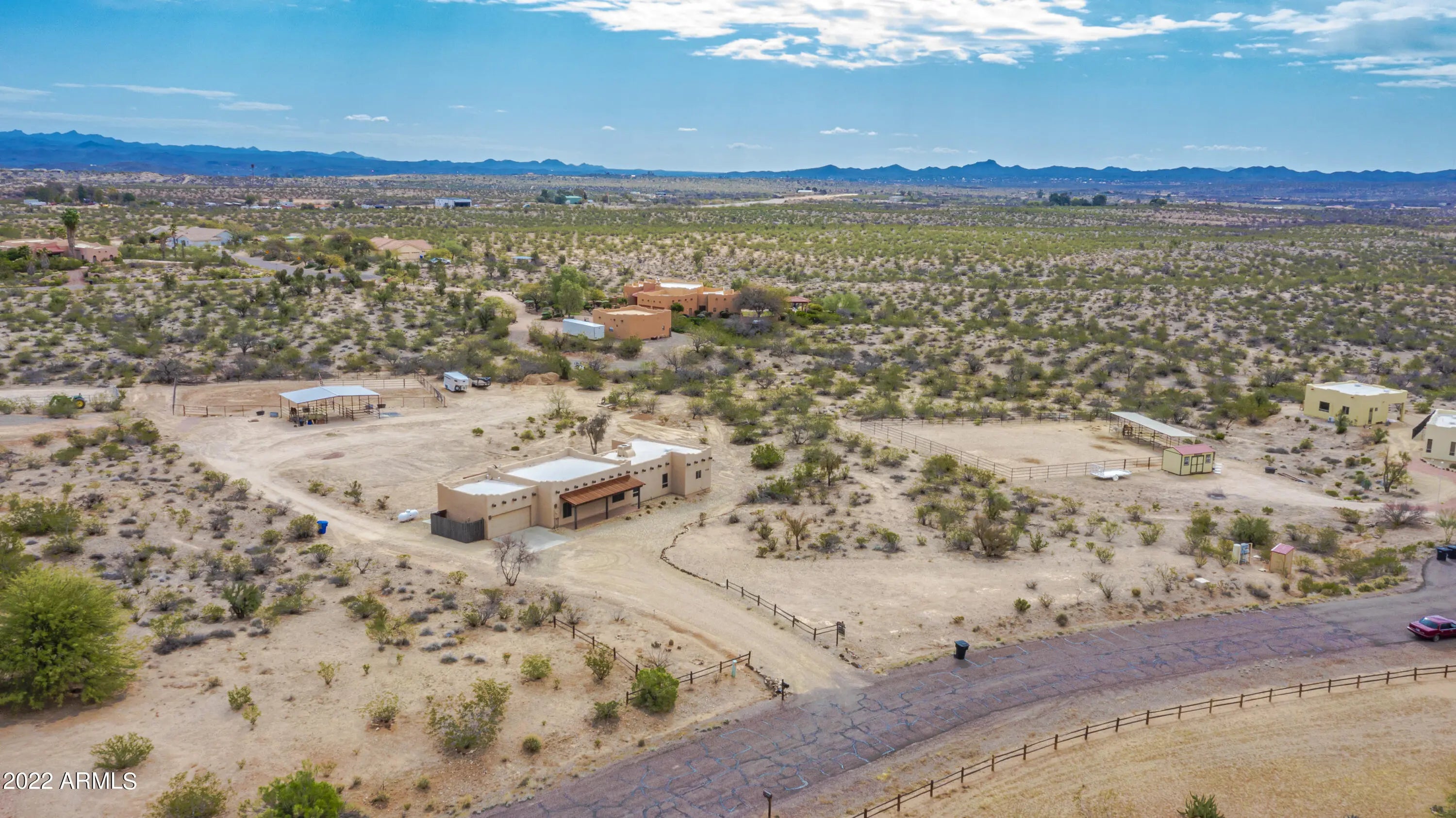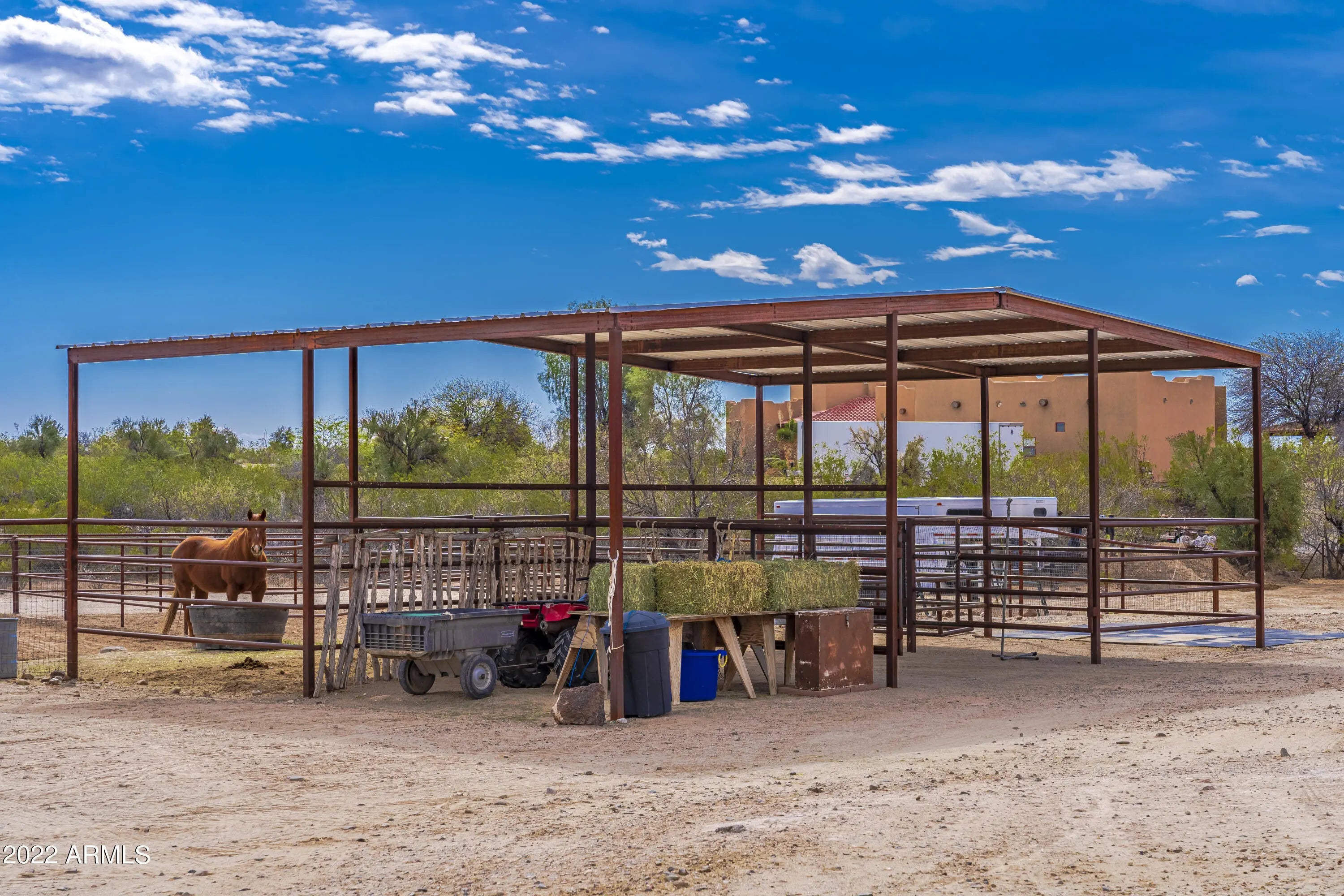 Are you looking for the perfect winter getaway?This easy care, low maintenance horse property may be for you! This is a custom territorial style, 3BD, 3 BA home located in Vista Royale cul-de-sac. Interior features both a living & cozy family room, each with a gas fireplace. Master suite is at one end w/ separate exit onto a slightly elevated covered patio. 2 additional guest bedrooms one w/ their own bath. Covered back patio perfect for enjoying the perfect winter weather, wild life and mountain views. All 3 covered patios feature metal roofs. Nice, simple horse set up that can easily be expanded on this 2.4 ac parcel. No climb fencing, covered stalls , water to horse facility, and plenty of room for horse trailers. Ride from the property through the beautiful Arizona desert!