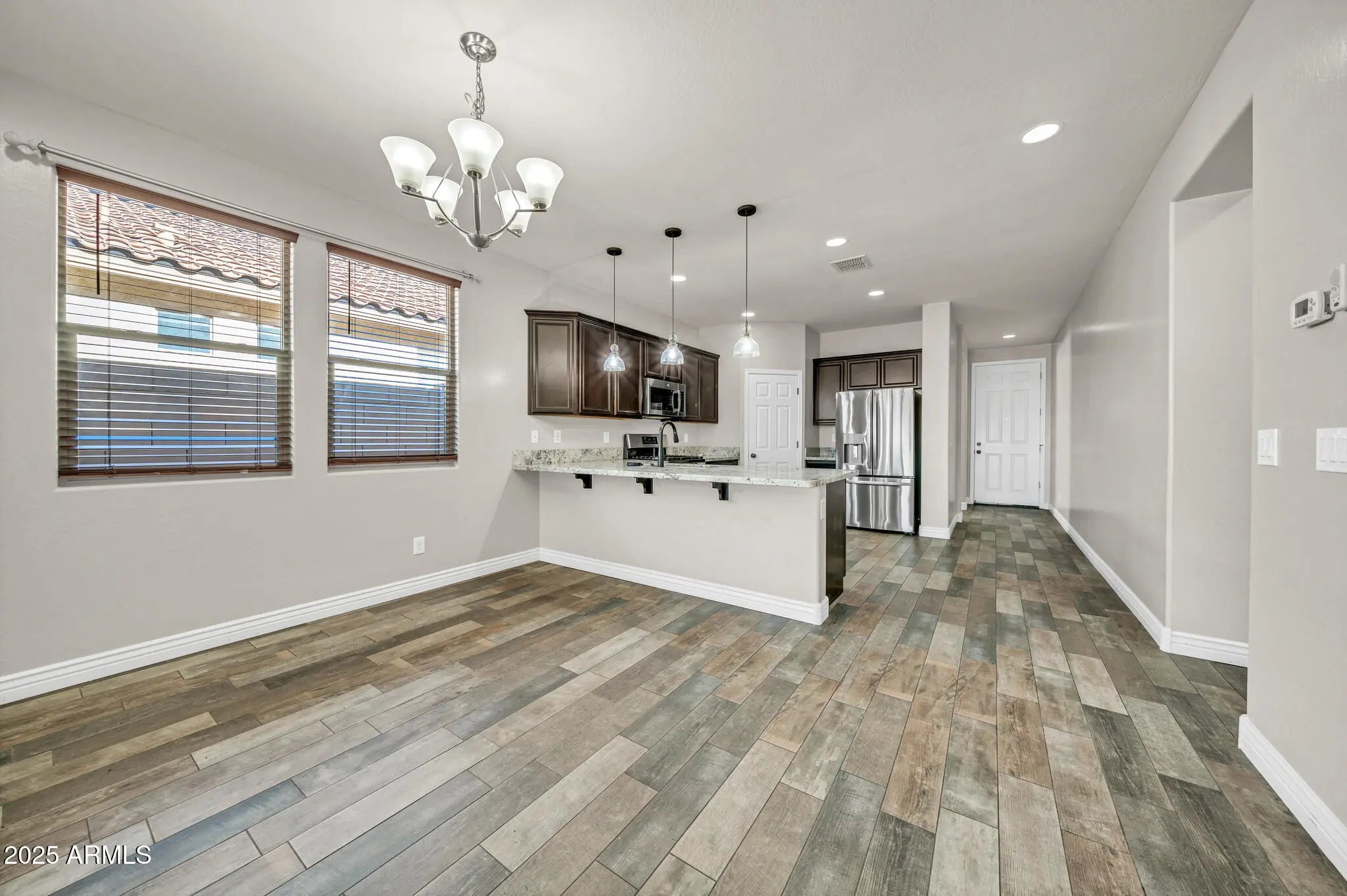 Welcome to this beautifully updated home in the highly sought after Rancho Cabrillo community. This move in ready 3 bedroom, 2 bathroom home with a bonus room offers 1,820 sq ft of bright, open concept living. The front bonus room can easily be converted into a 4th bedroom, making this a great fit for a first time home buyer or anyone looking for a wonderful family neighborhood. Inside, you'll find fresh interior paint, updated flooring, and all new stainless steel appliances. The kitchen features granite countertops, ample cabinetry, and a walk in pantry. The primary suite includes a walk in shower, dual sinks, and a generous walk in closet. The garage features brand new epoxy flooring. Step outside and enjoy the low maintenance backyard with new turf, pavers, covered patio, and no direct neighbors behind. The home borders the community wash and park, offering extra privacy and open views. The front of the home also includes a paver driveway for added curb appeal. Rancho Cabrillo offers a welcoming atmosphere with a community playground, walking paths, and convenient access to shopping, dining, and top Peoria schools. Less than 20 minutes to TSMC. This home is truly move in ready and packed with upgrades. Don't miss your chance to make it yours!