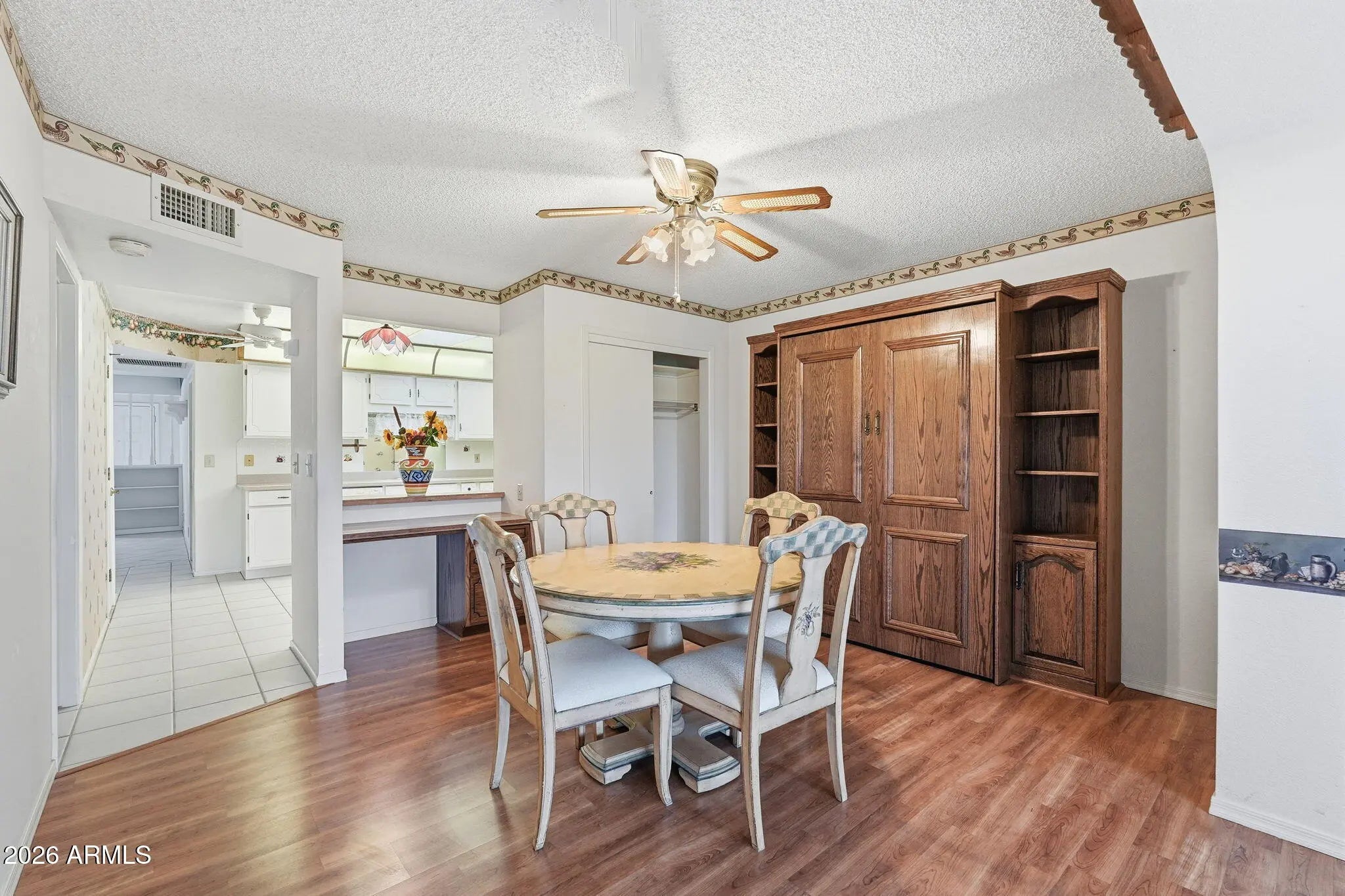 This 1-bedroom golf condo with flexible guest space and priced to allow for updates, offers an opportunity for buyers who see the potential in making this condo their own, all while enjoying the highlight of the condo with beautiful golf course and lake views. The south-facing living room and front patio provide abundant natural light. A centrally located kitchen offers ample cabinetry and an eat-in area, ready for your personal touch. An adjacent multi-purpose room works well currently as a dining area but could be utilized as a den, or guest space as it has a Murphy bed. The spacious primary bedroom with north-golf course facing window features a private bath and closet. The enclosed patio adds extra space ideal for family room, office, sewing or craft room. In this 55+ amenity-rich community, the saying 'there's something for everyone' rings true. In addition to a public golf course and restaurant, you'll find pickleball and tennis courts, a state-of-the-art gym, a beautiful woodshop, a library, a stitcher's room, pools, and a variety of clubs for every interest.