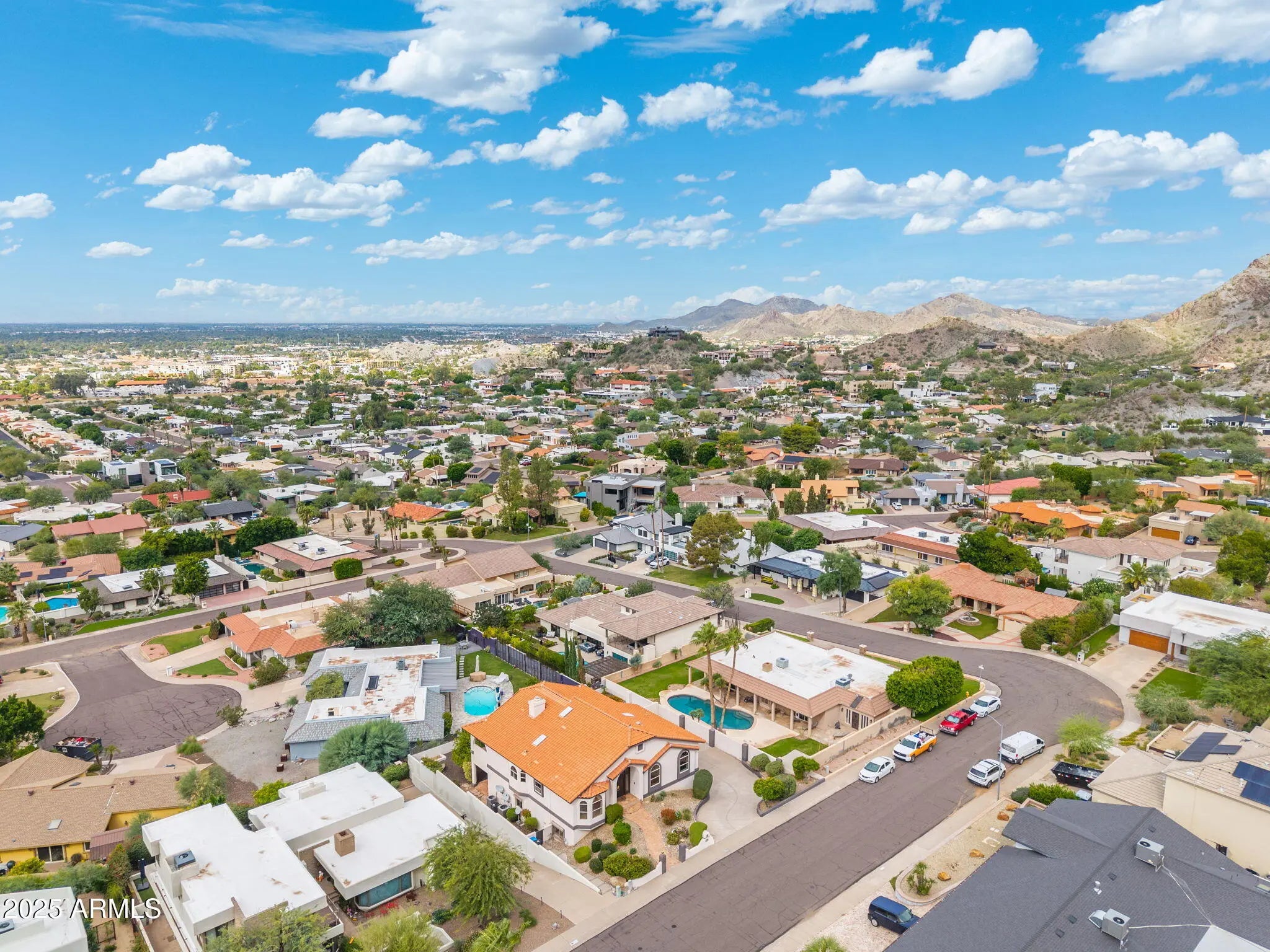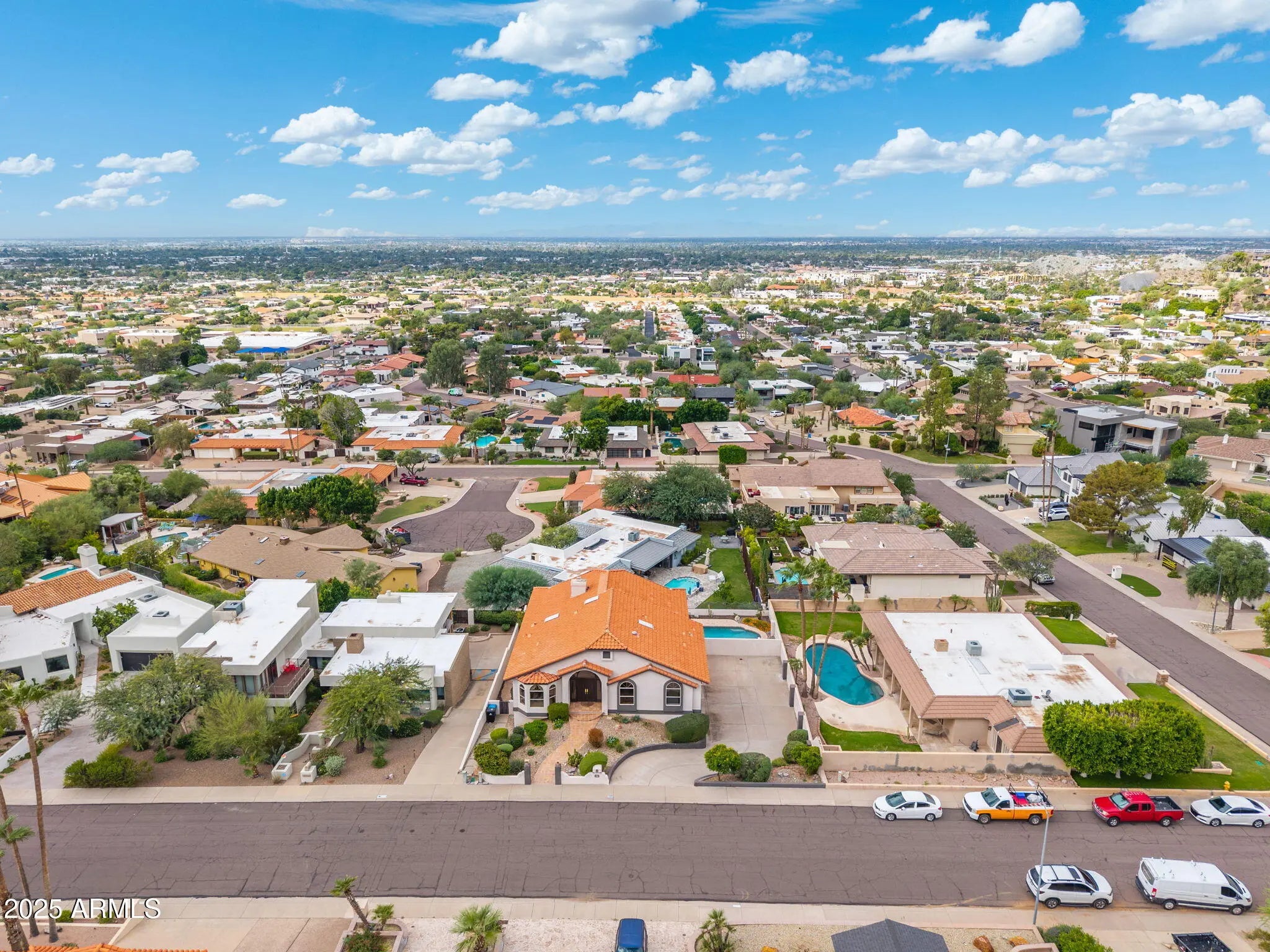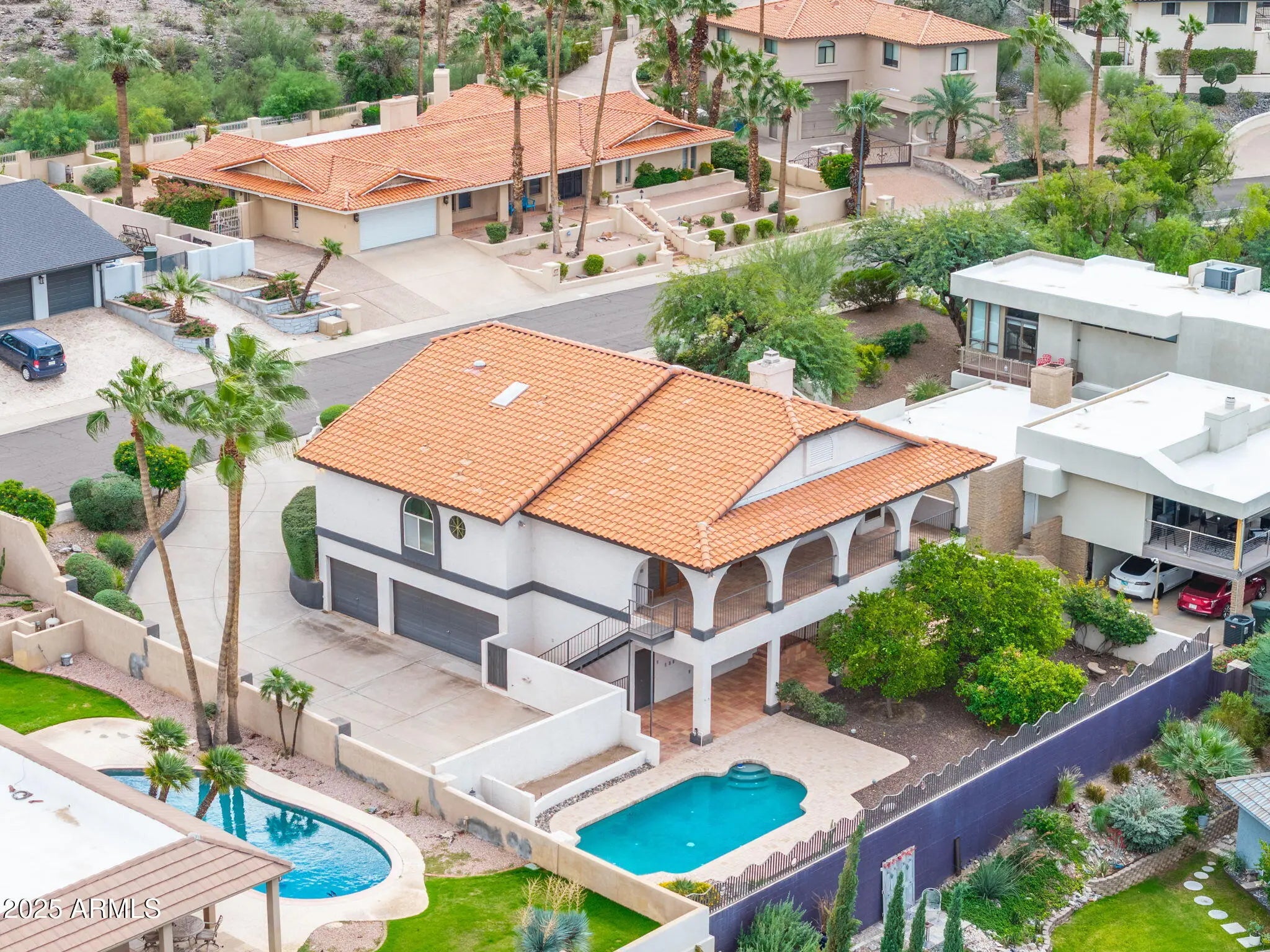 Captivating city and mountain preserve views from every direction in this stylish hillside home. Thoughtfully designed with special architectural details throughout and a fantastic layout. The main floor includes all the living areas, kitchen, primary bedroom and an office/study. The lower level has two large bedrooms and a mechanical room that is spacious enough to use as a hobby room or home gym space. Many updates have been done over the almost 30 years the seller has owned this home, including the kitchen, primary bath, roof and three HVAC units. For the car enthusiast there is a 5-car garage, 3 front bays with 2 tandem spaces, and room for 2 more cars to be parked in the back of the extended driveway. Enjoy the outdoors with a balcony and covered patio that both run the entire length of the back of the home. The backyard includes a lovely refinished pool and mature grapefruit, orange and tangelo trees. The location at the base of Piestewa Peak is phenomenal, just minutes to the Camelback Corridor, Downtown Phoenix and Phoenix Sky Harbor Airport. Also positioned within the sought-after Madison School District. The expansive views this home offers in such a desirable area are hard to come by, grab your chance quickly!